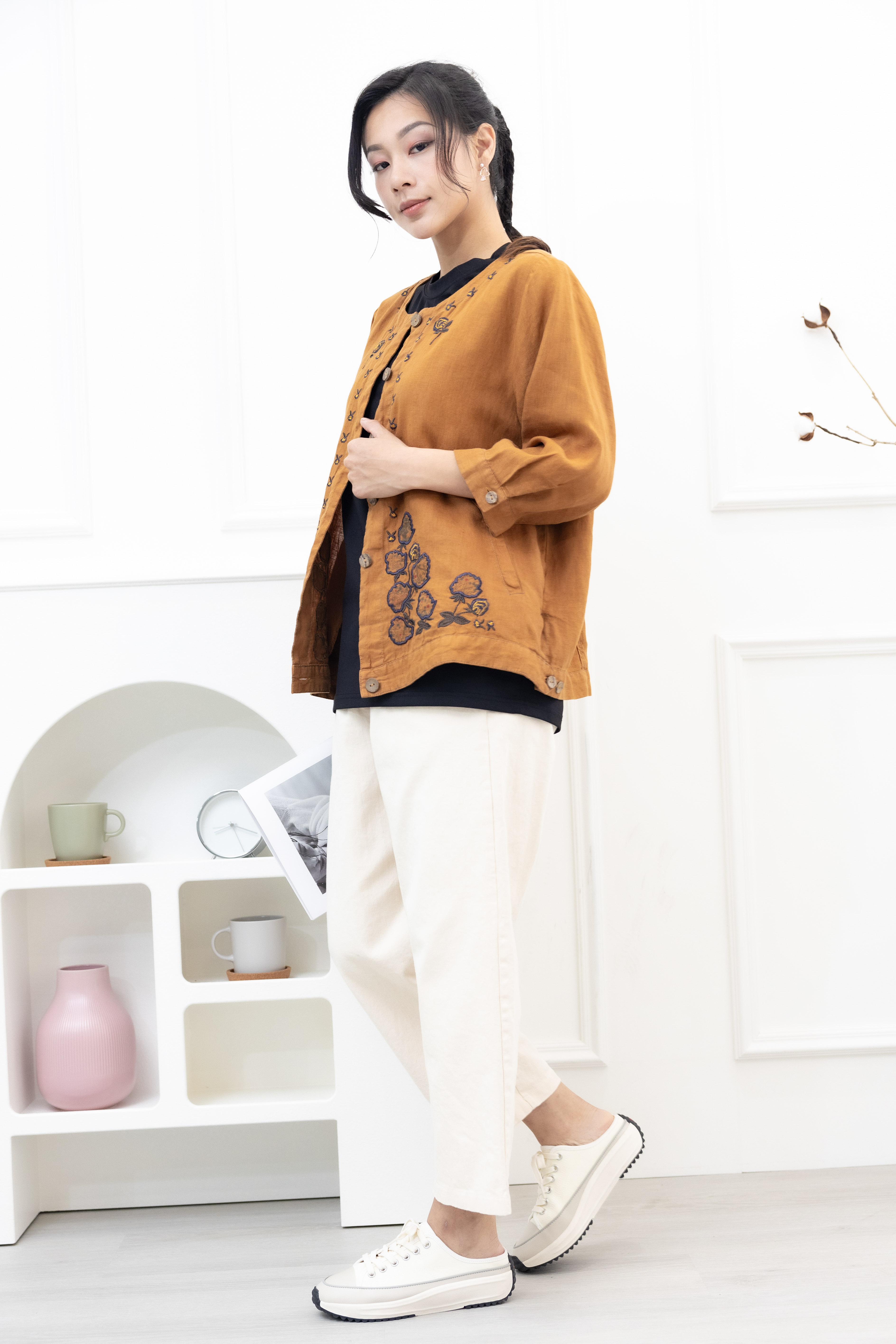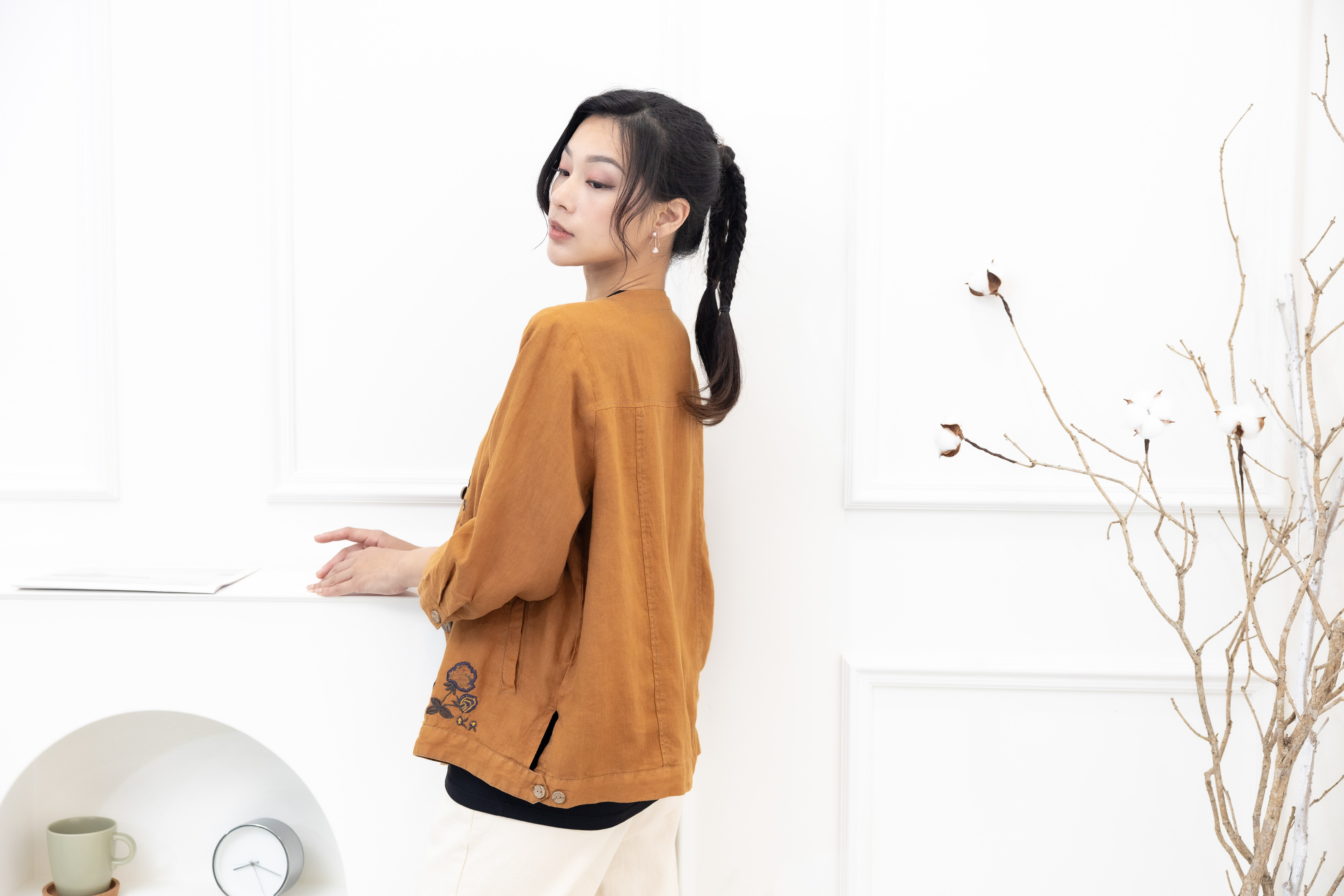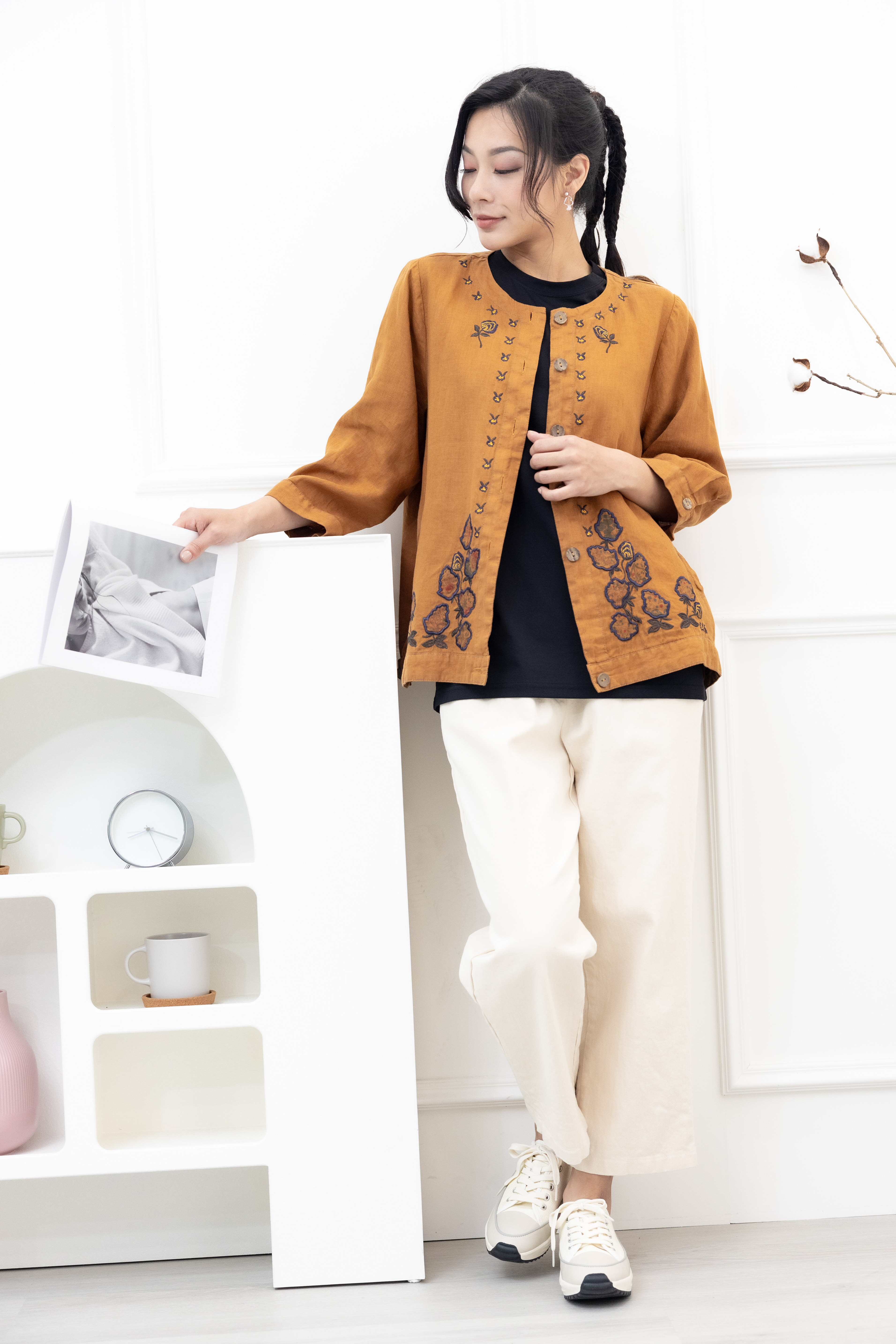 셔츠 衣襟刺繡棉麻襯衫 / 土黃色