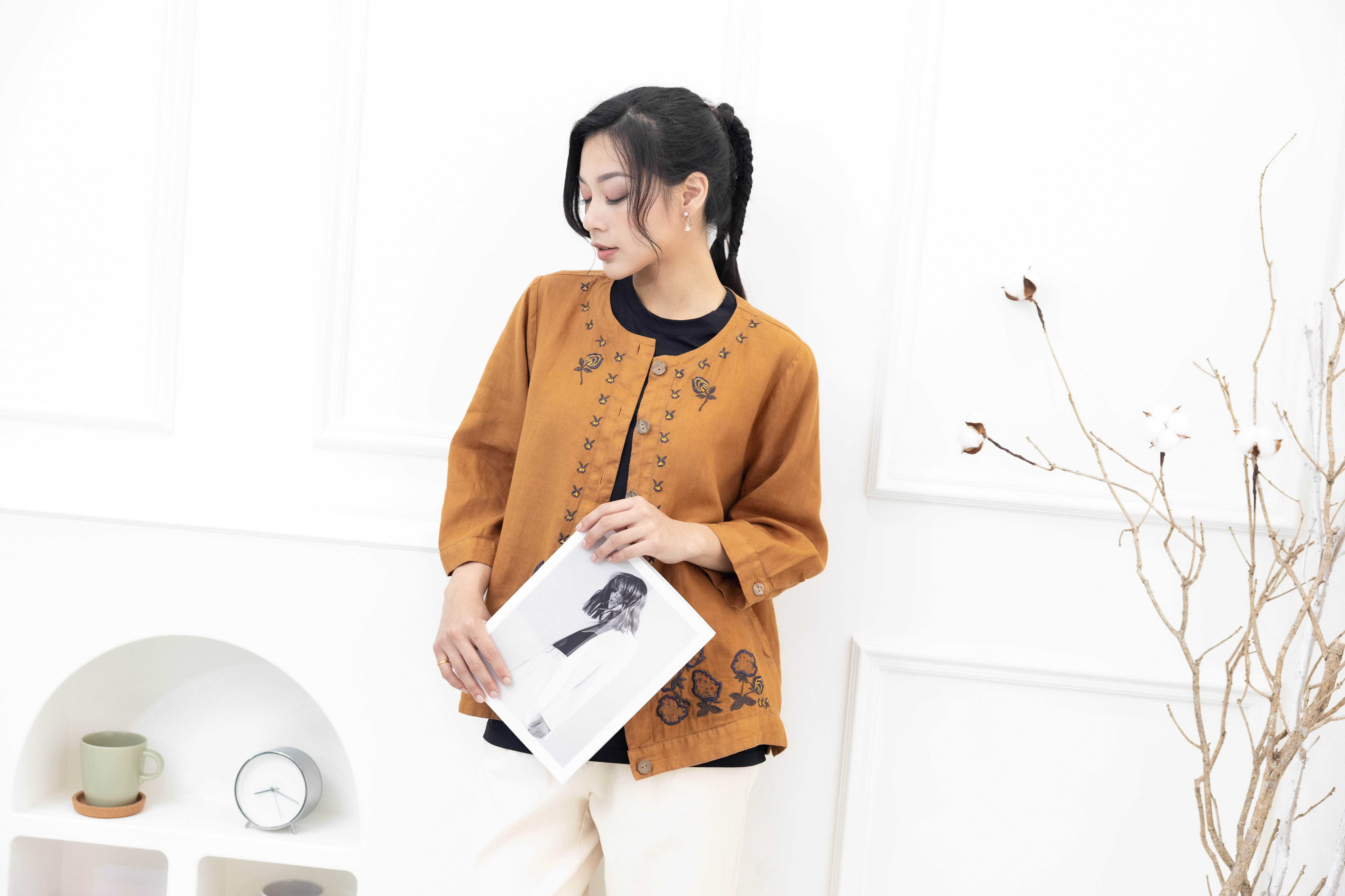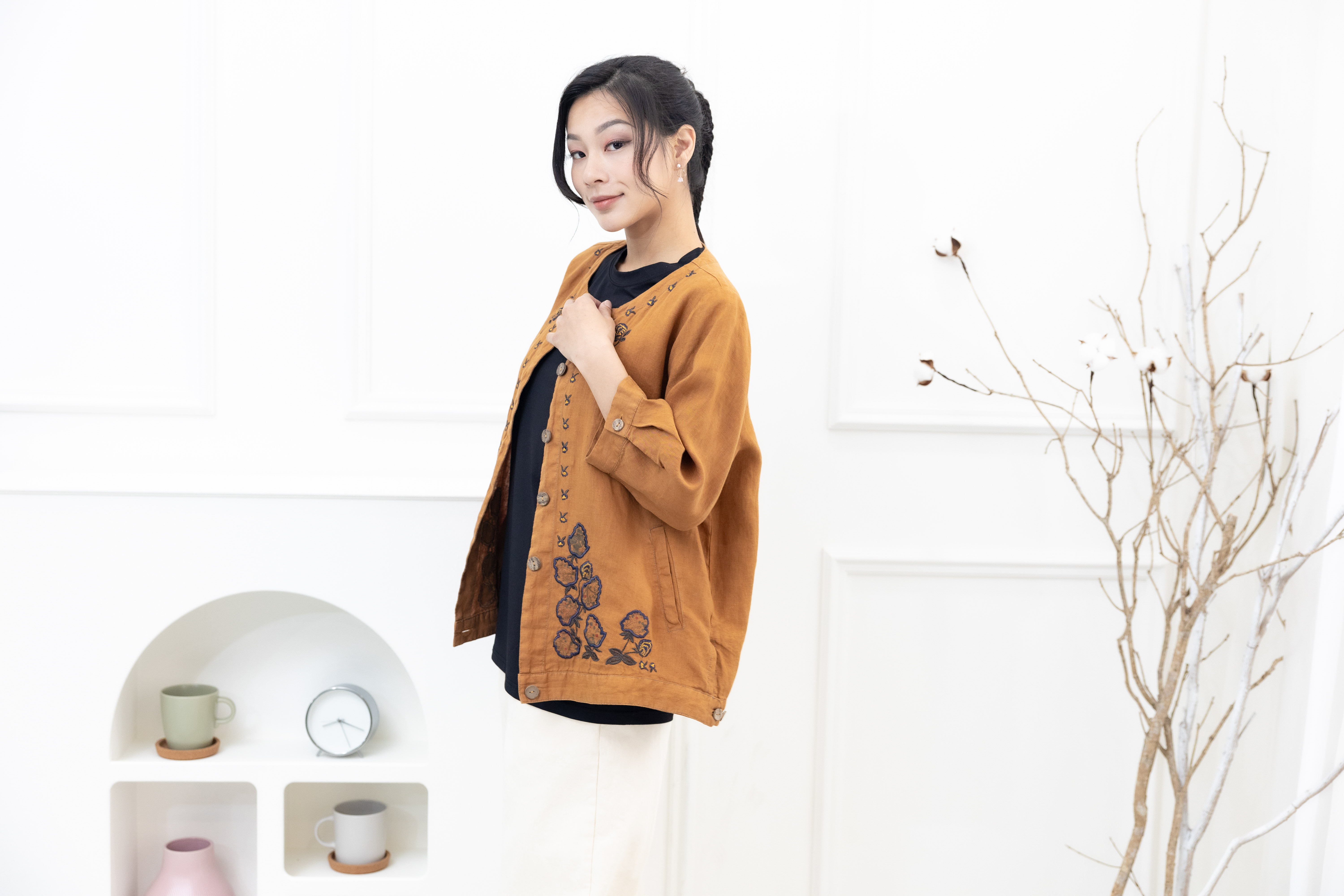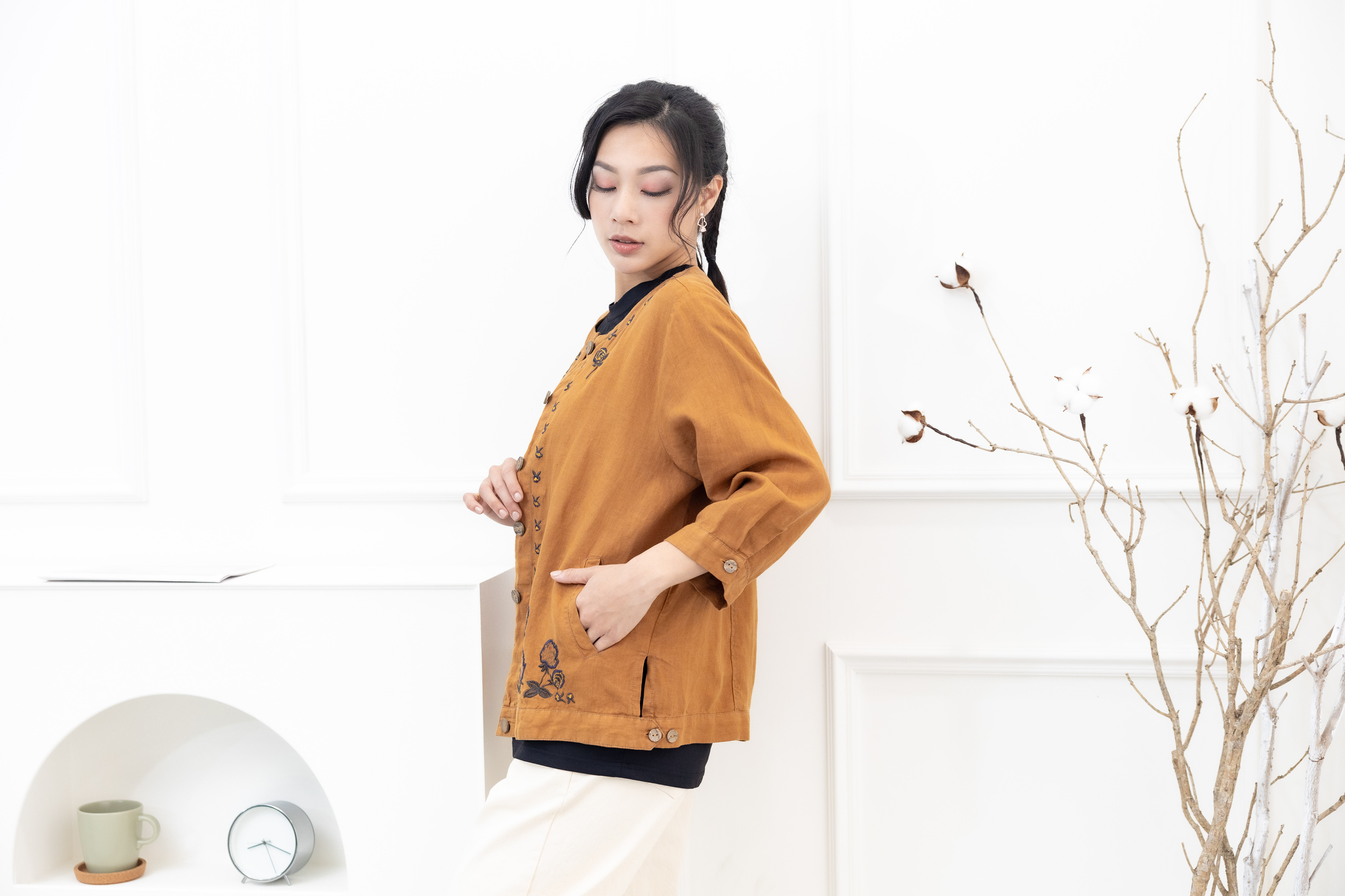 셔츠 衣襟刺繡棉麻襯衫 / 土黃色
