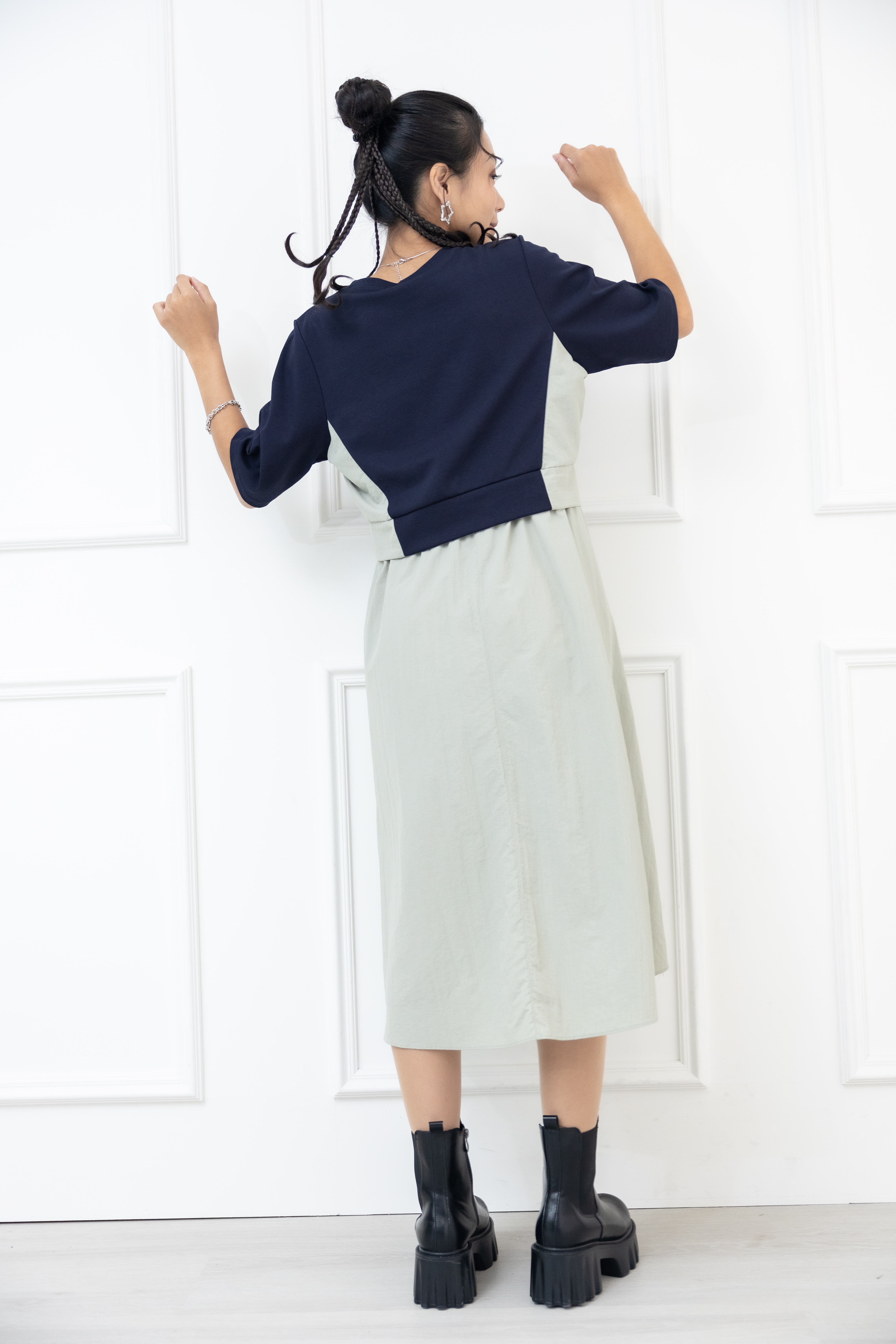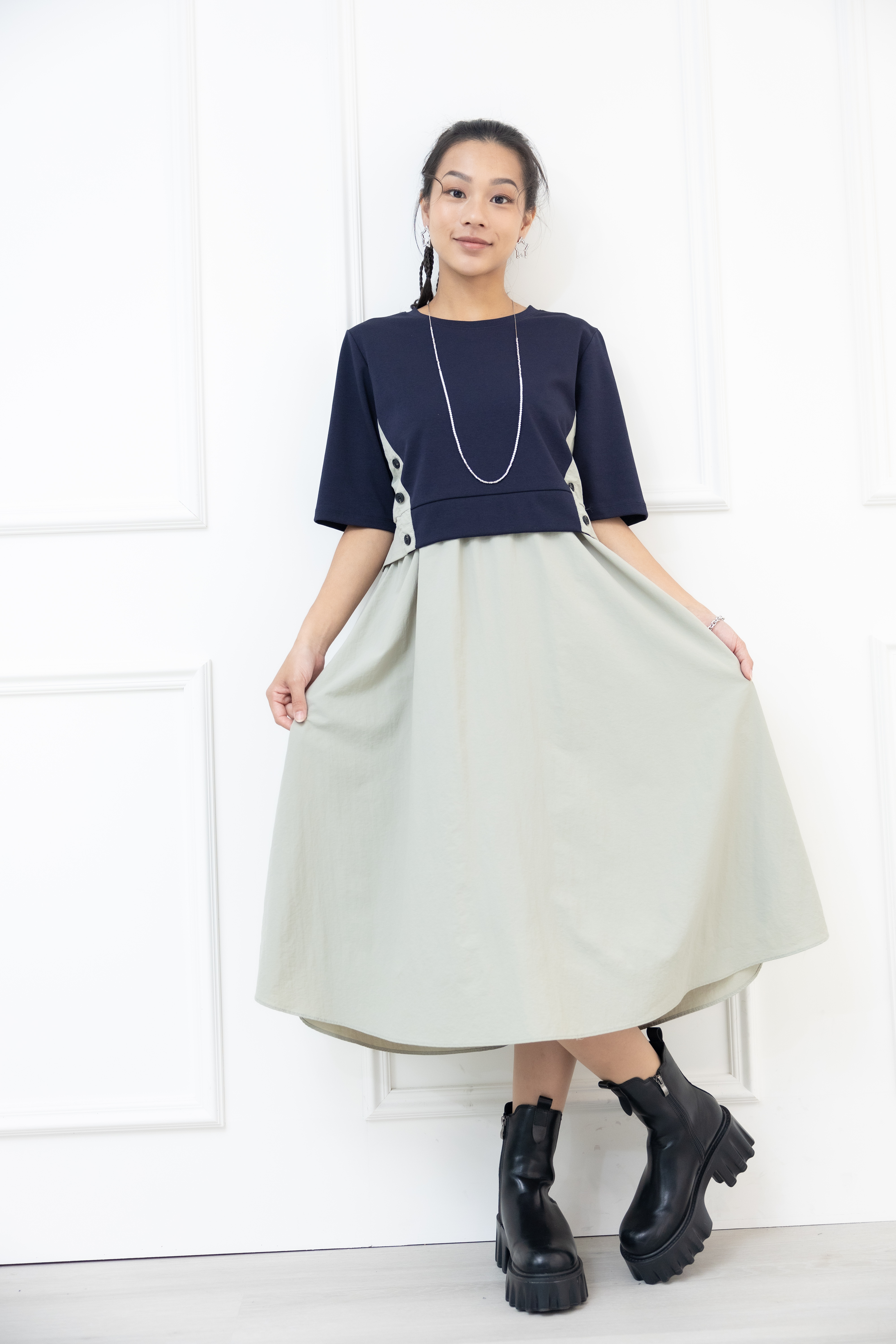 원피스 側腰鈕扣假兩件短袖洋裝 / 淺綠色拼深藍色