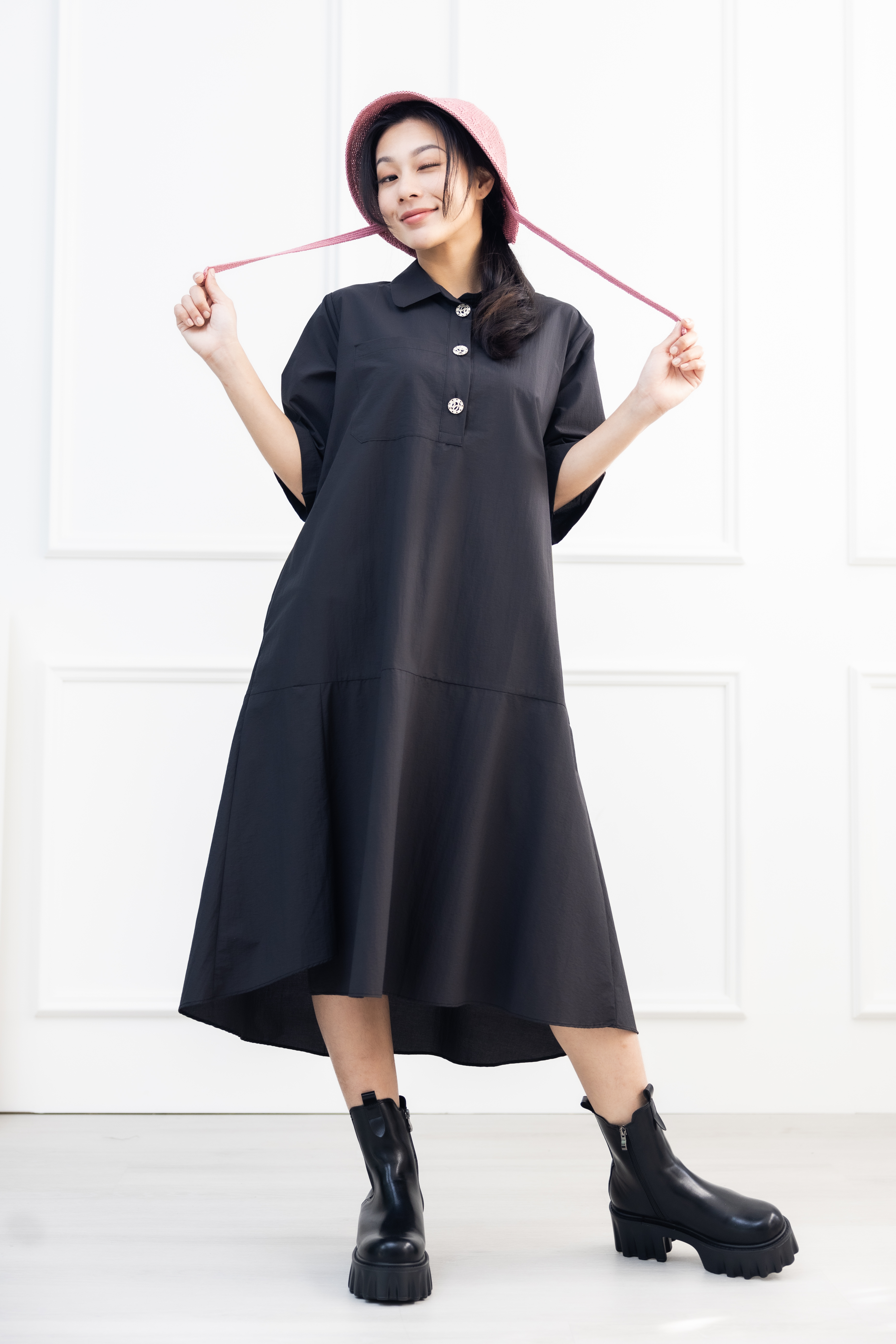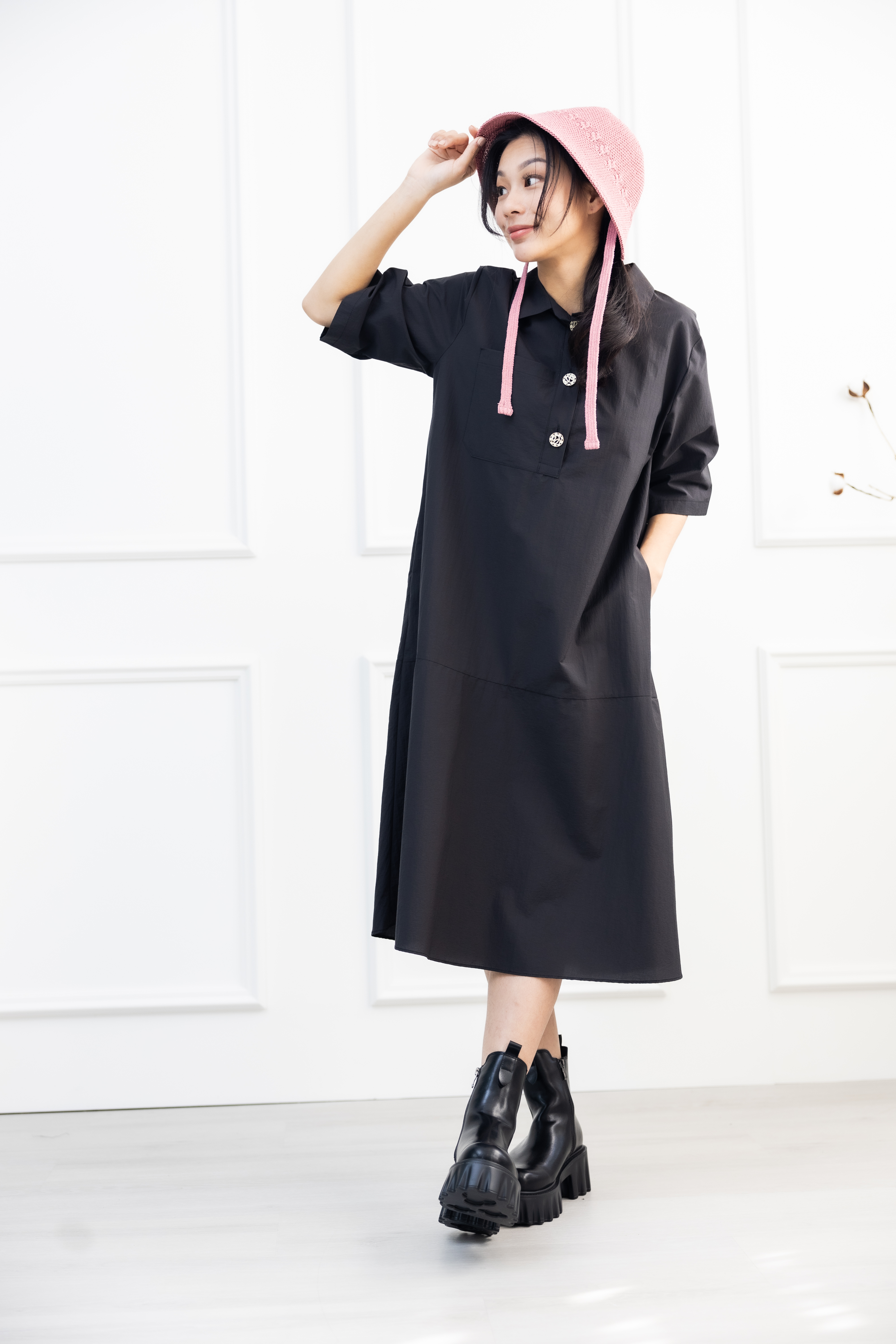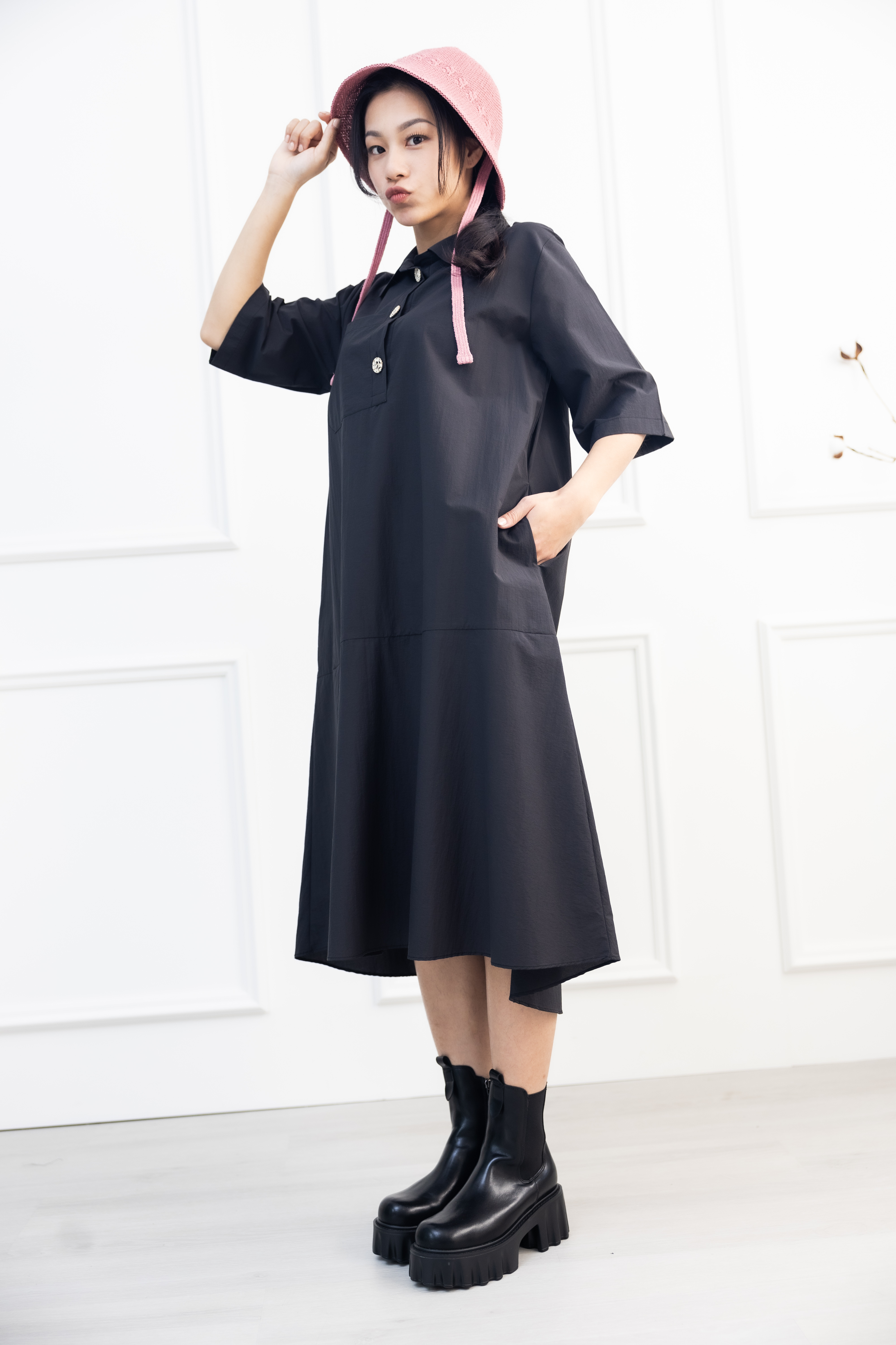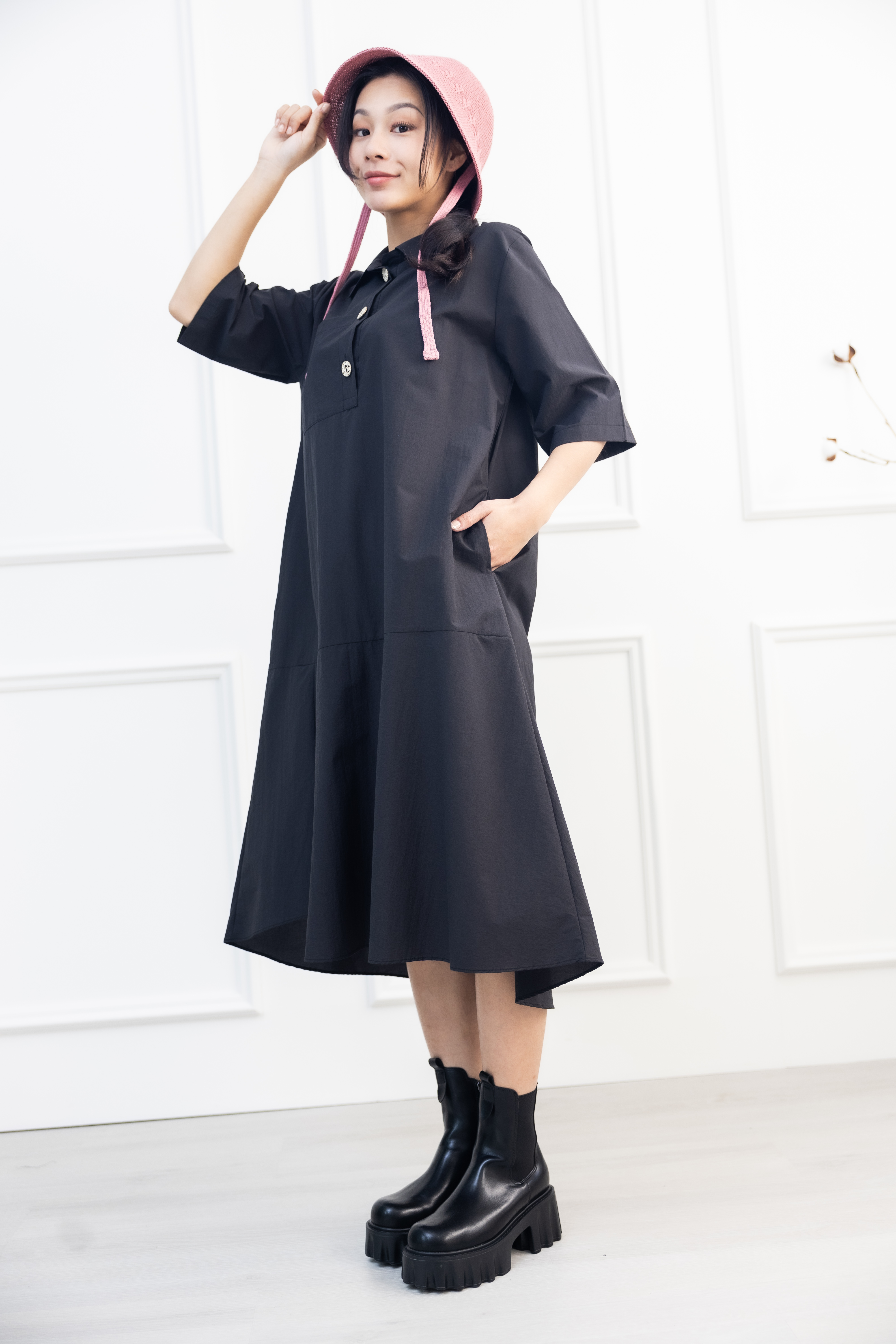 원피스 單邊下擺壓褶開叉短袖洋裝 / 黑色