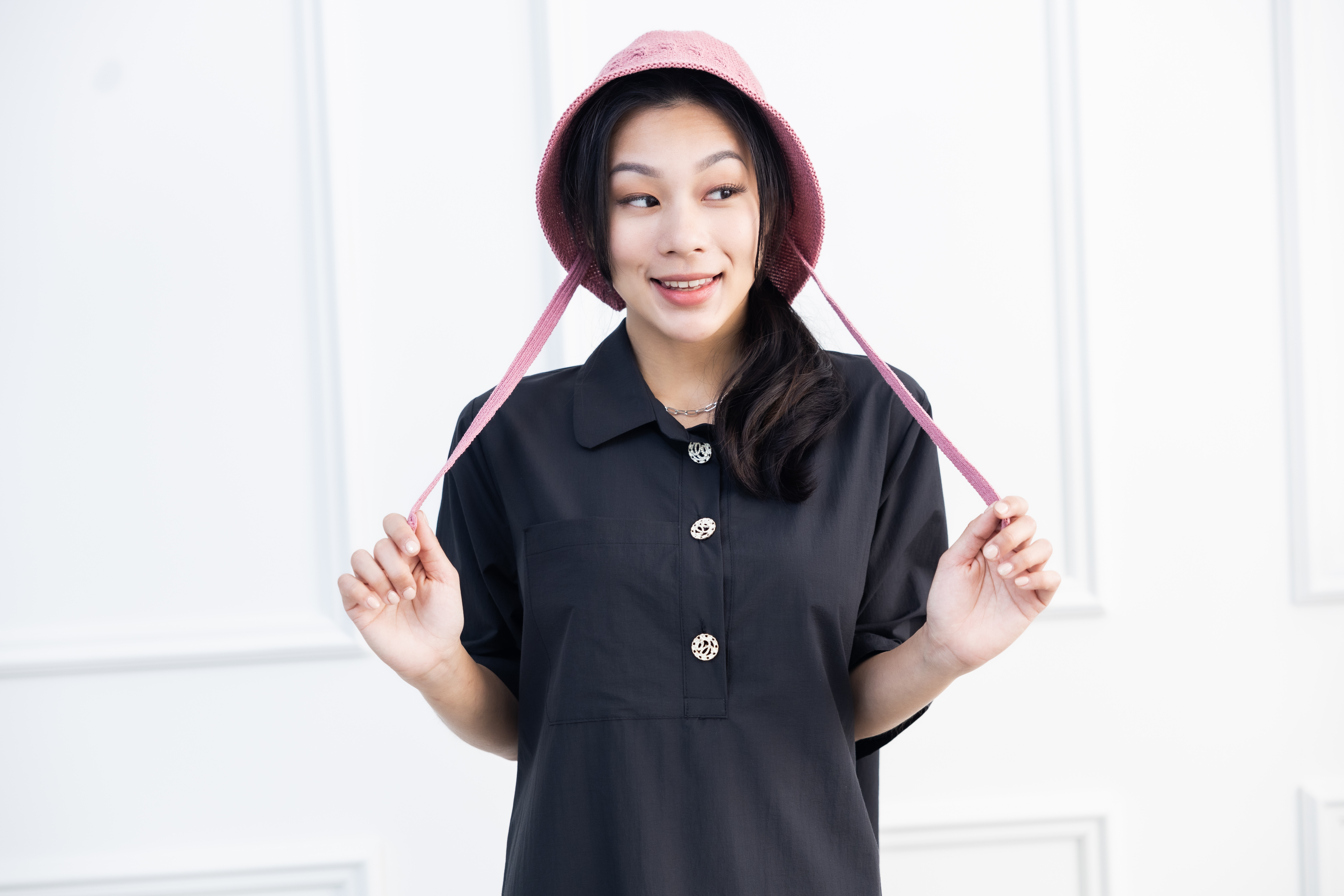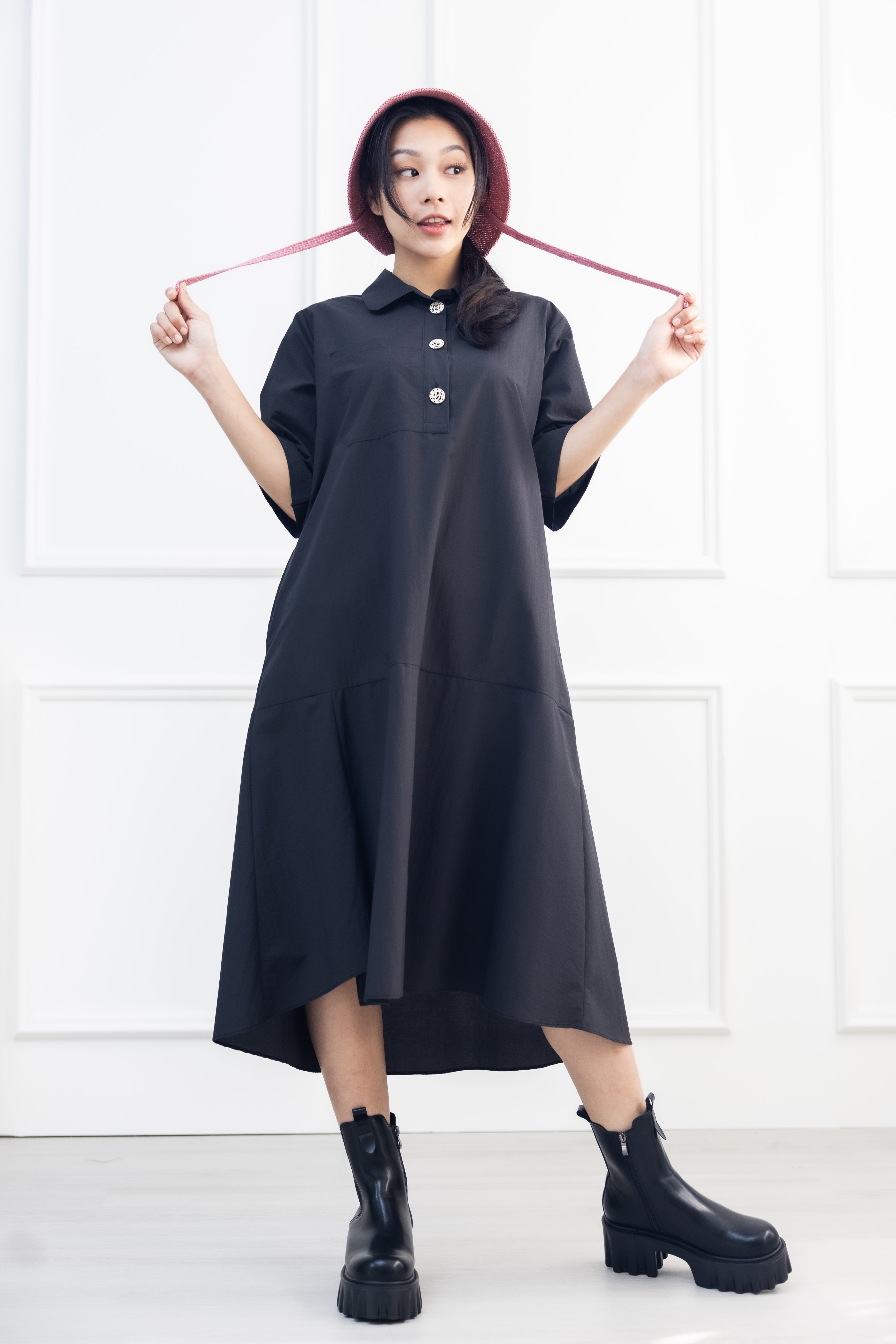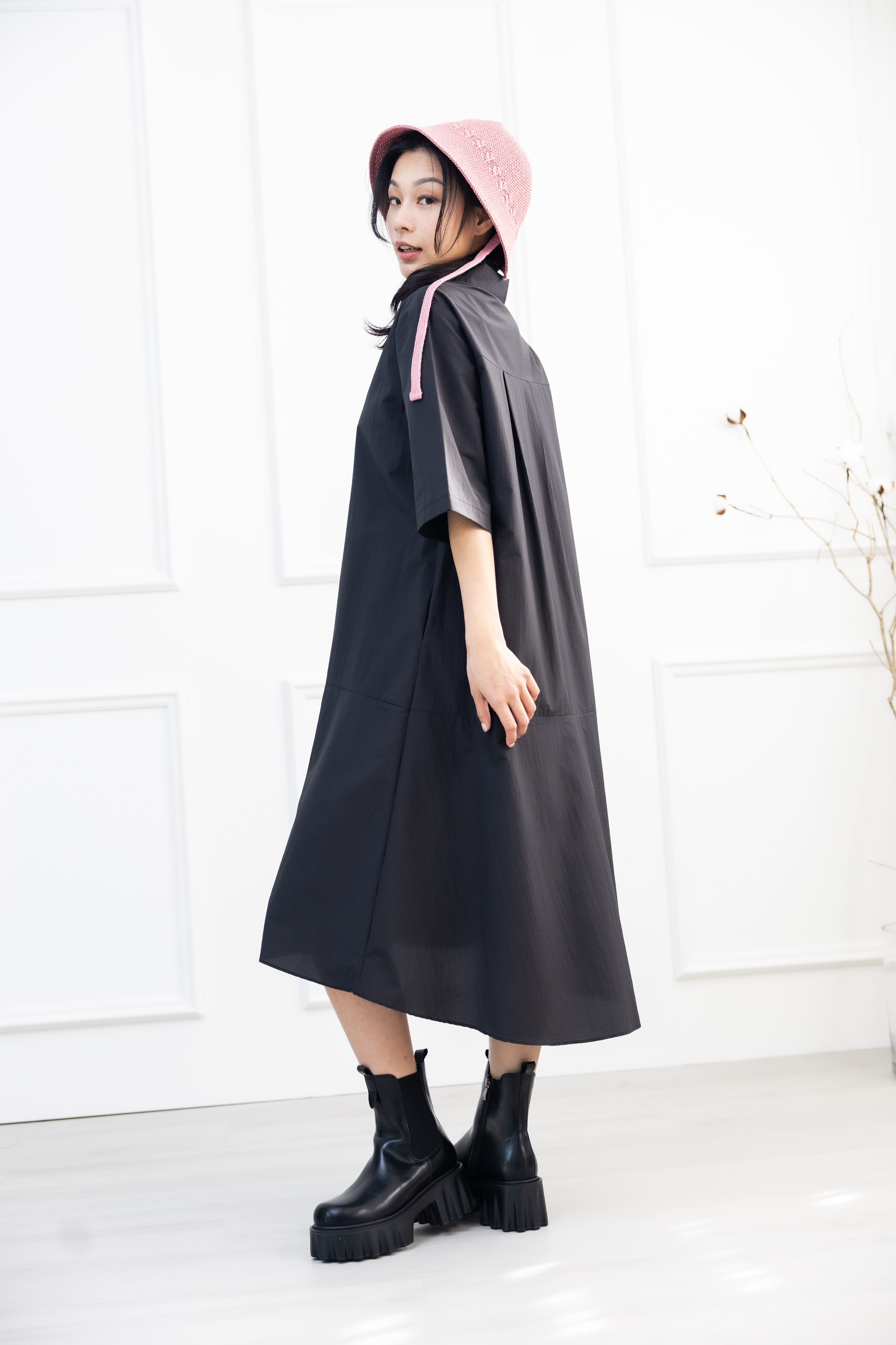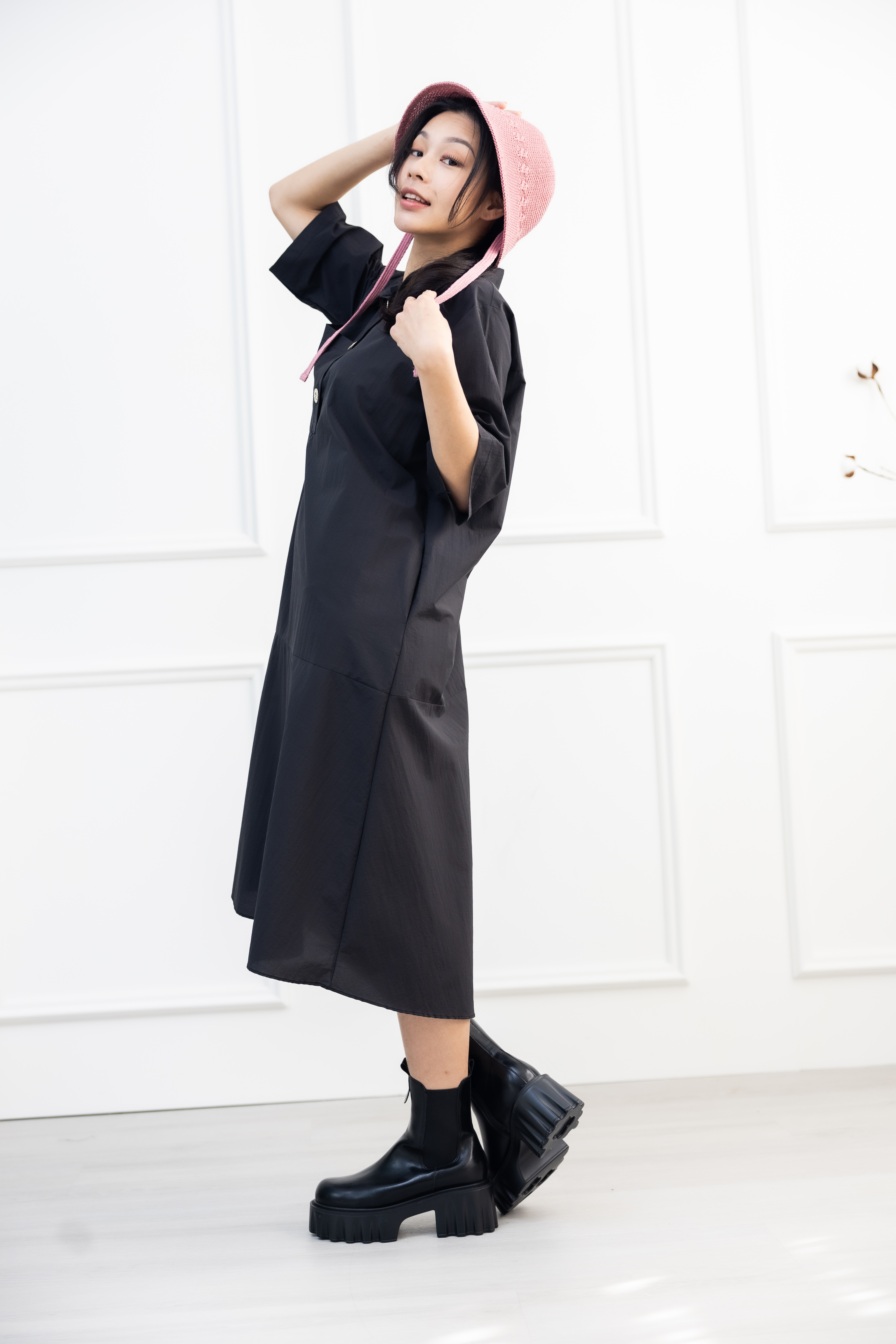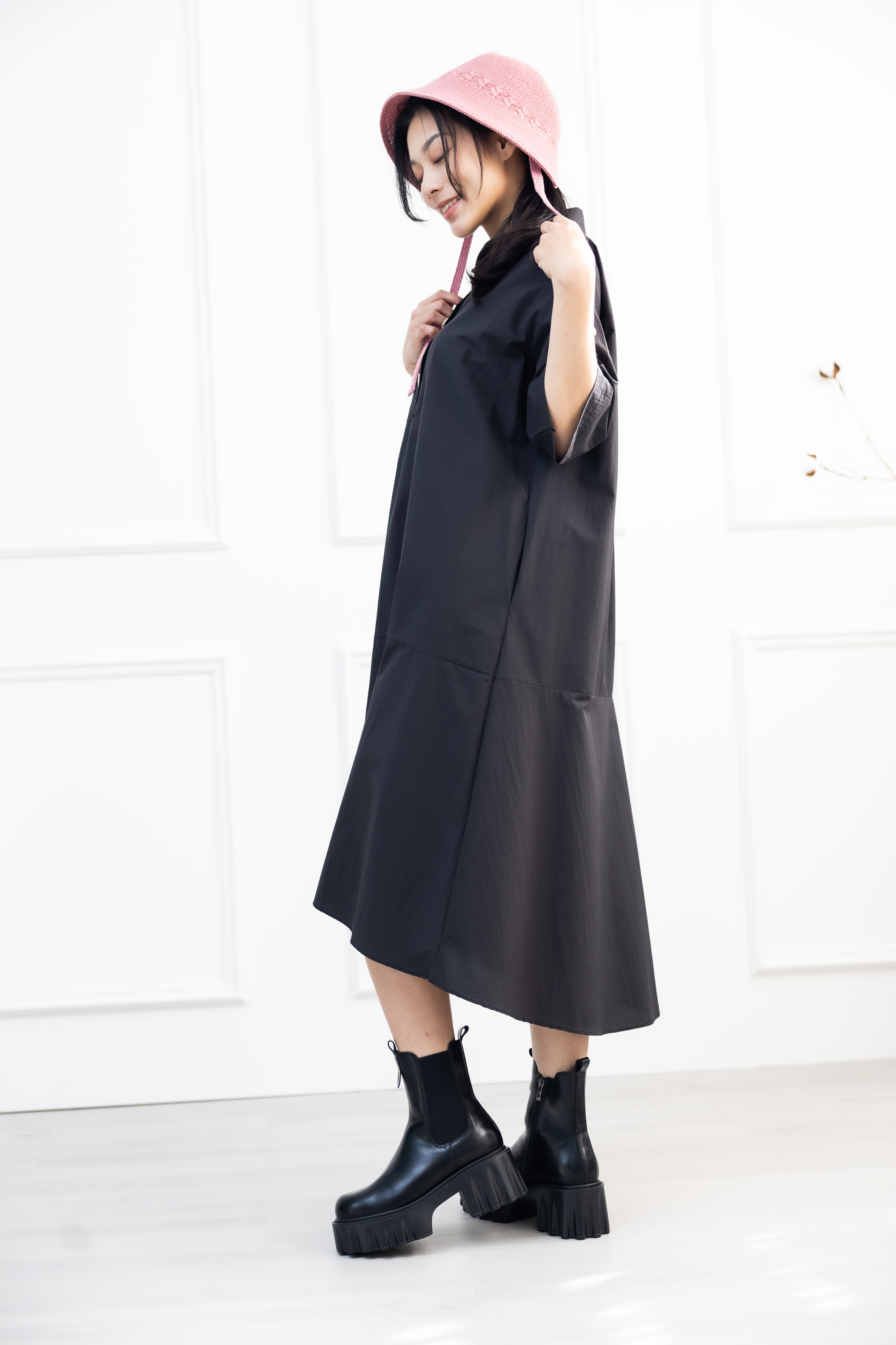 원피스 單邊下擺壓褶開叉短袖洋裝 / 黑色