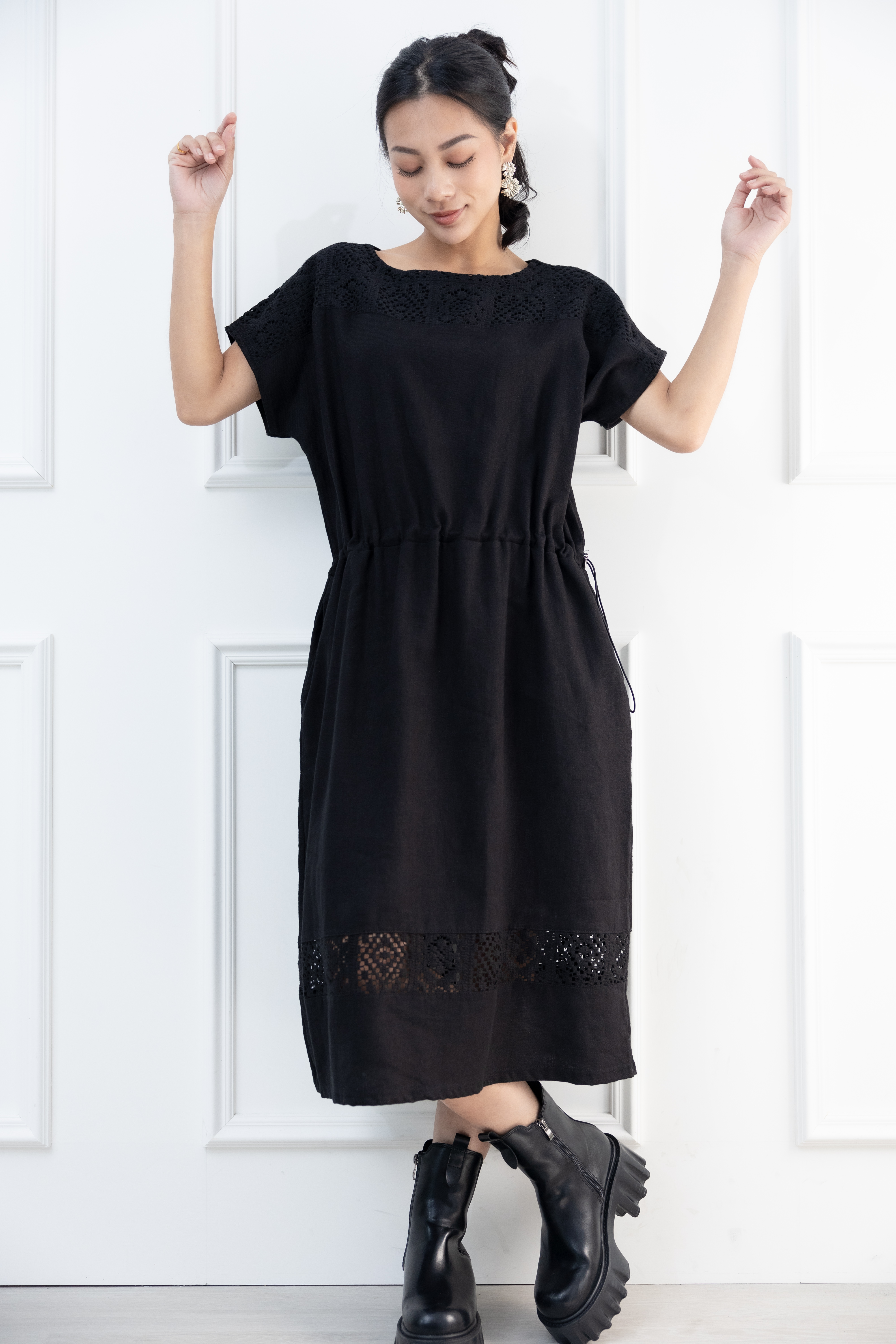 원피스 拼接裸空蕾絲洋裝 / 黑色