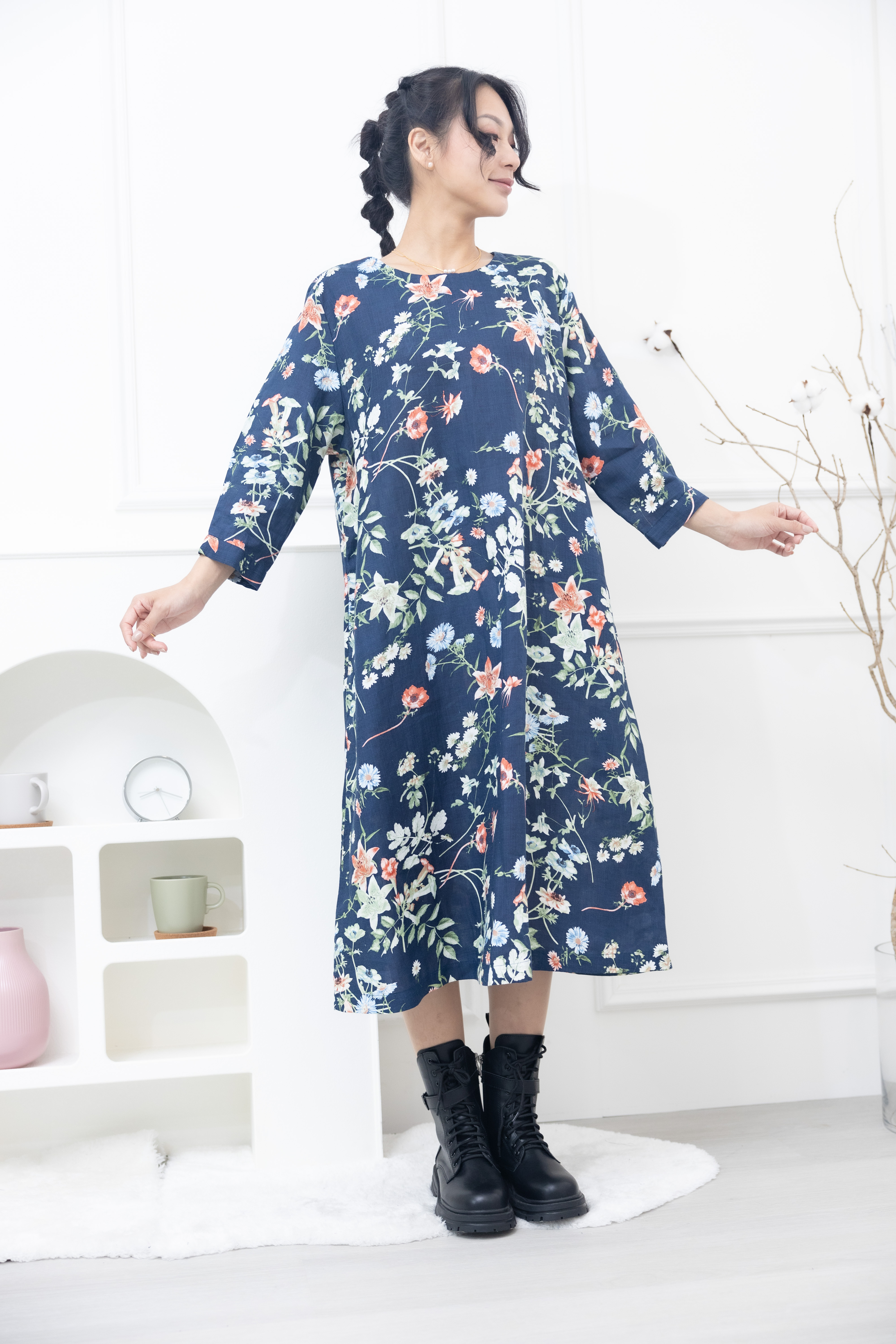 원피스 百合.雛菊印花七分袖洋裝 / 深藍色