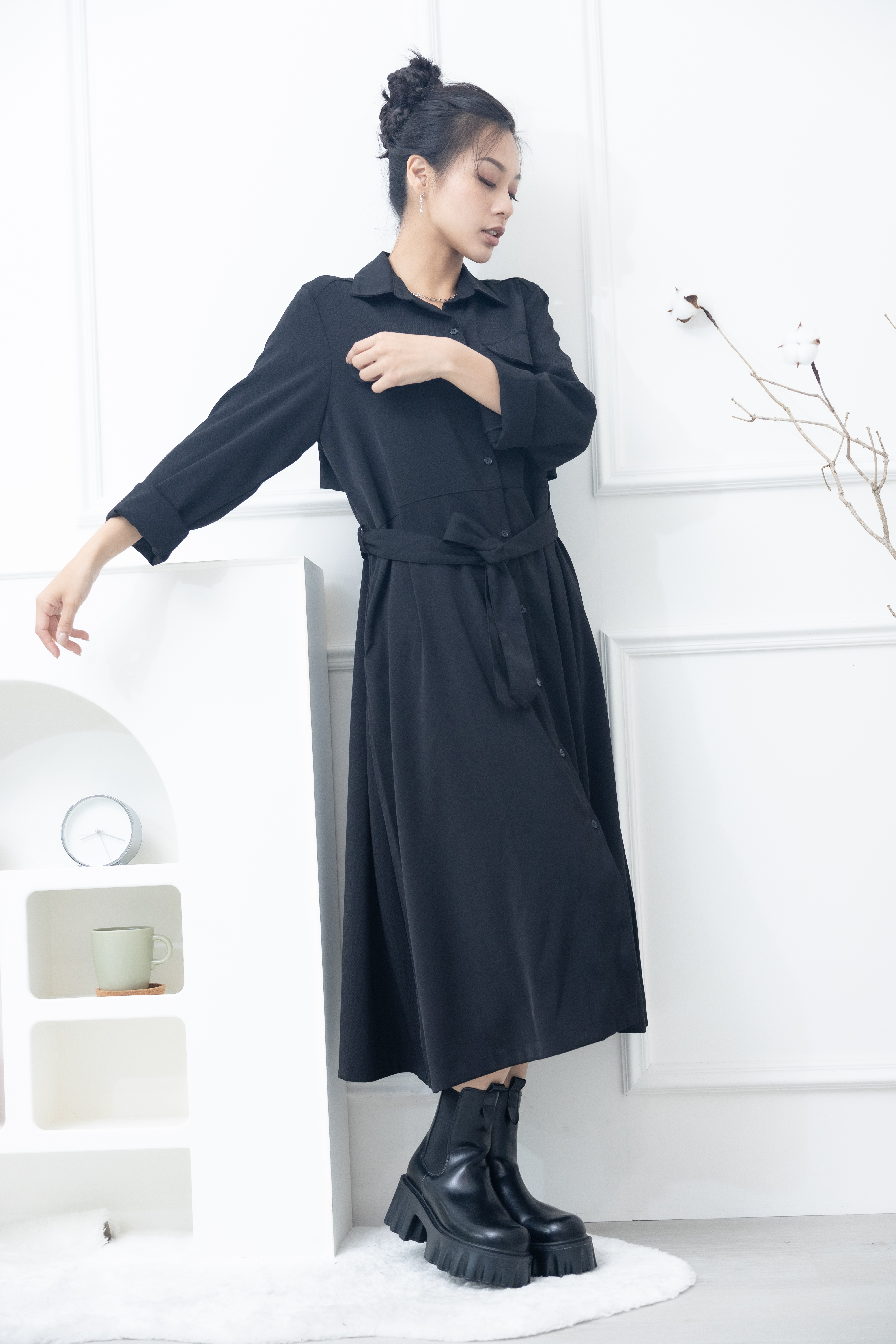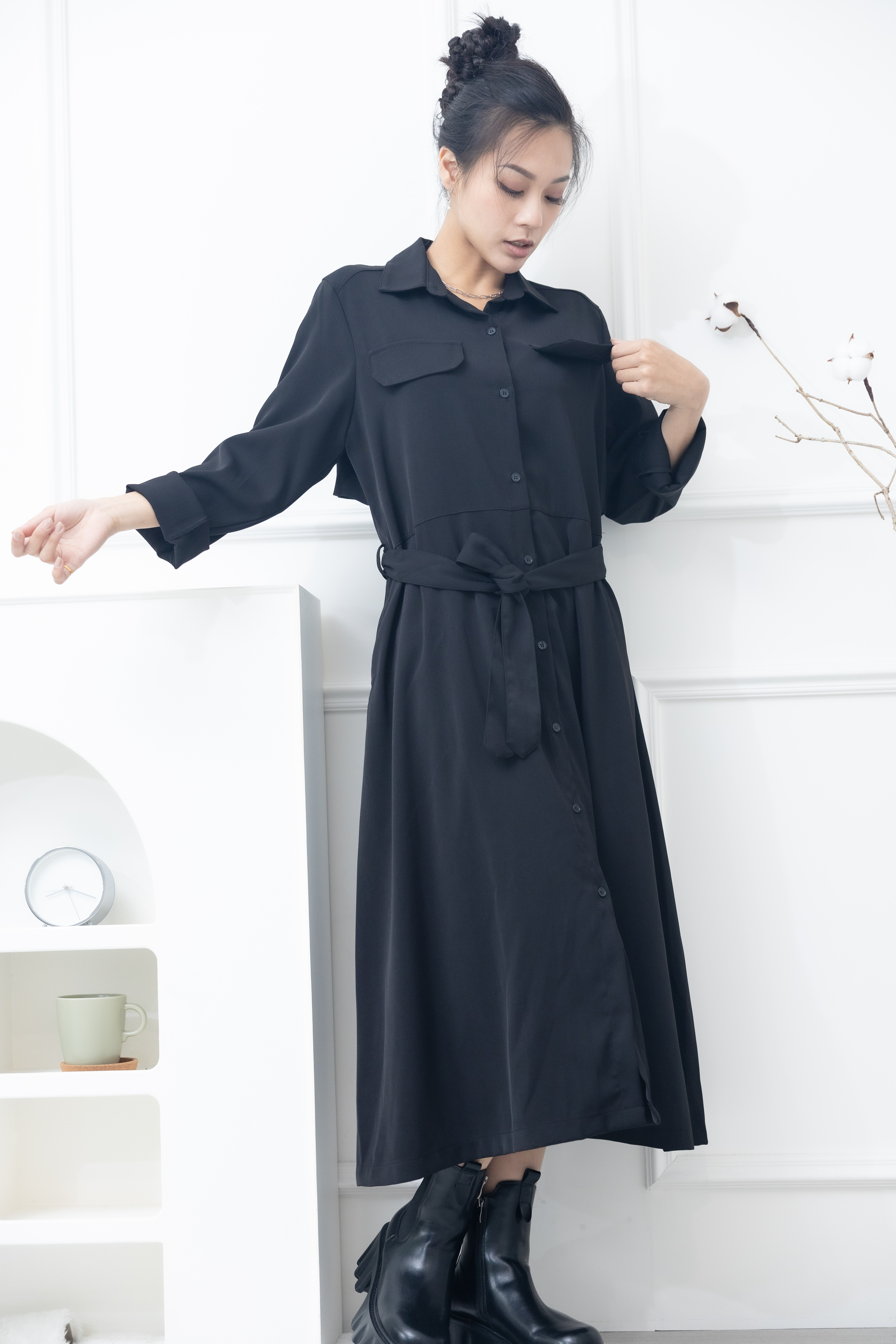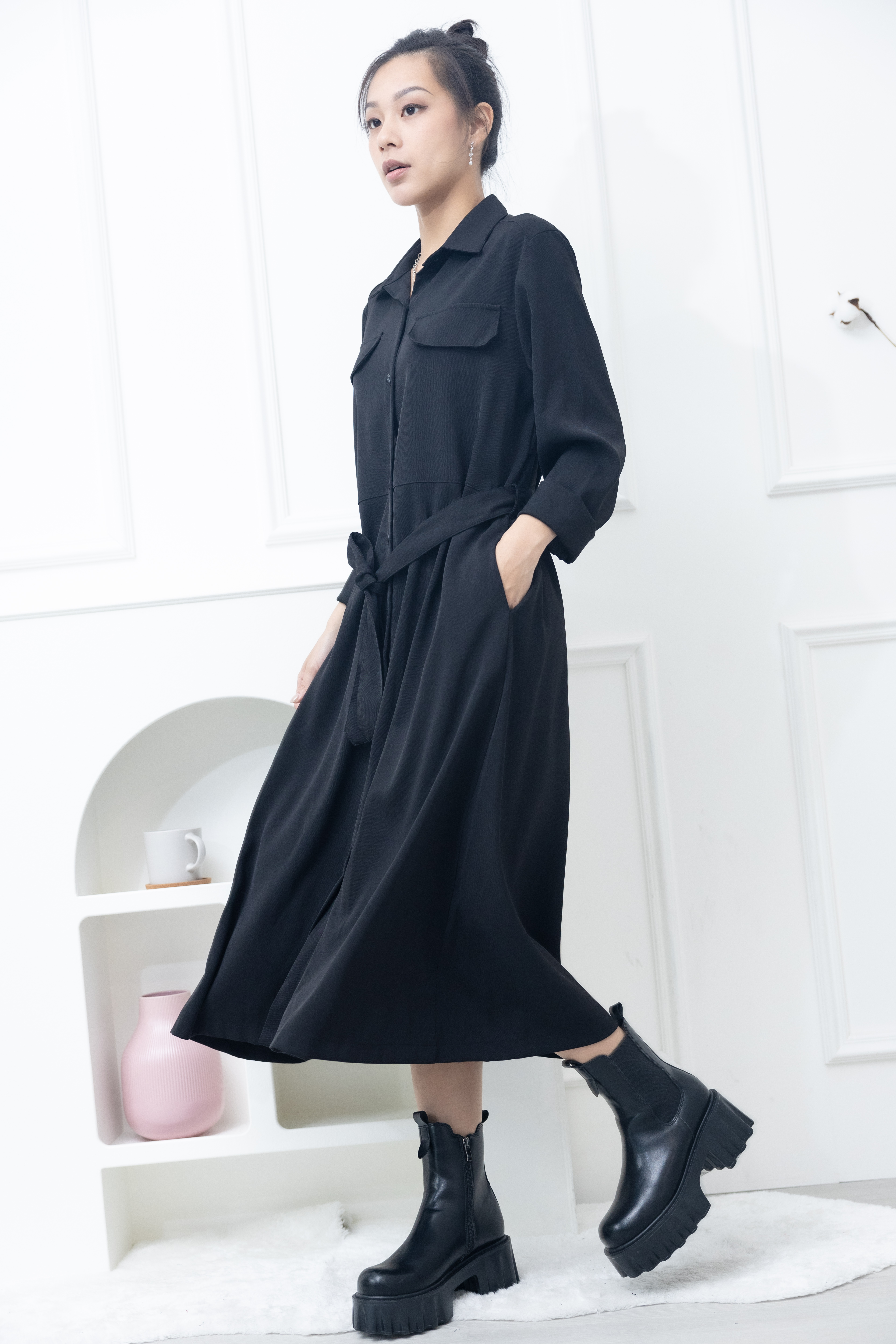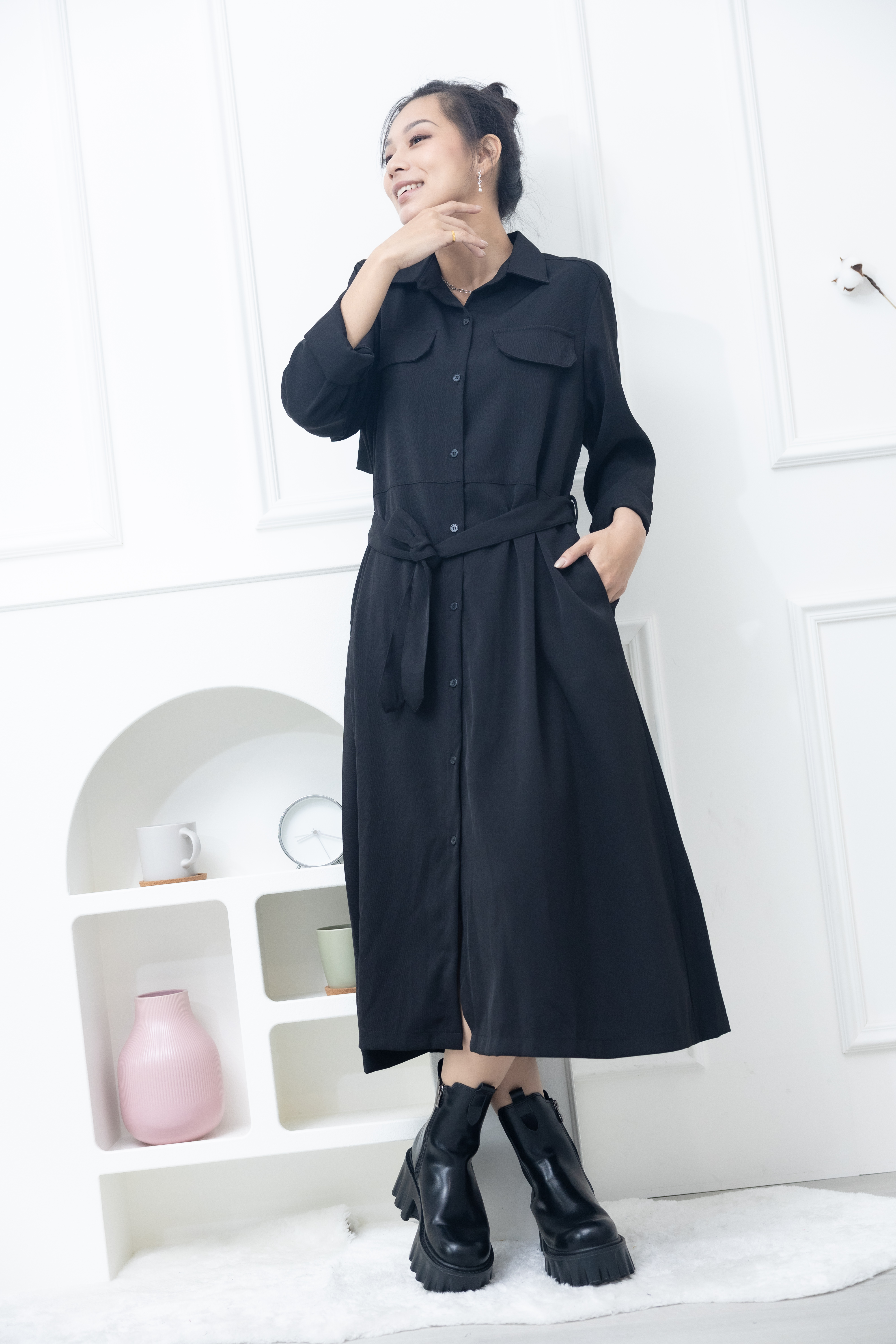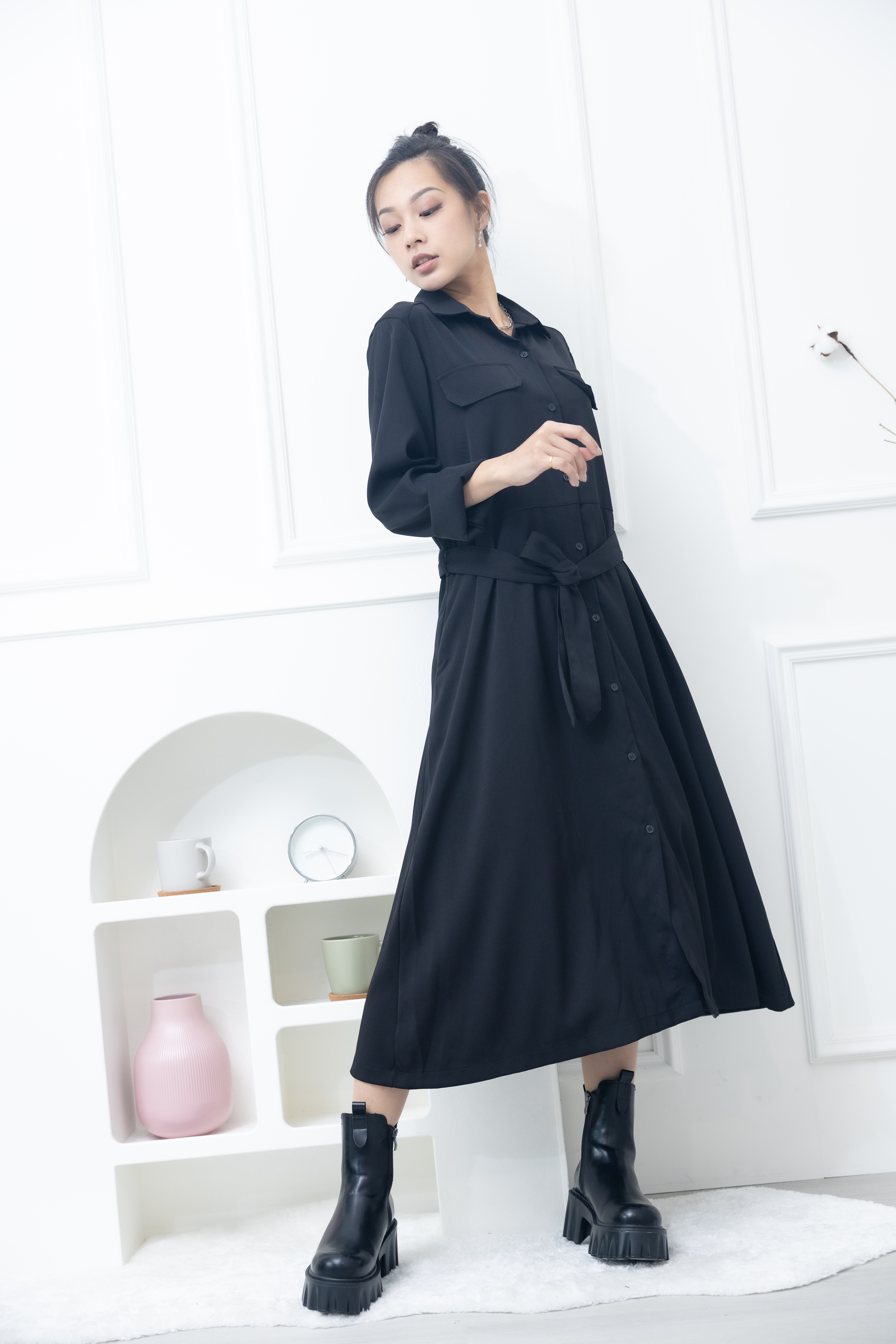 원피스 立領小A字假口袋洋裝 / 黑色