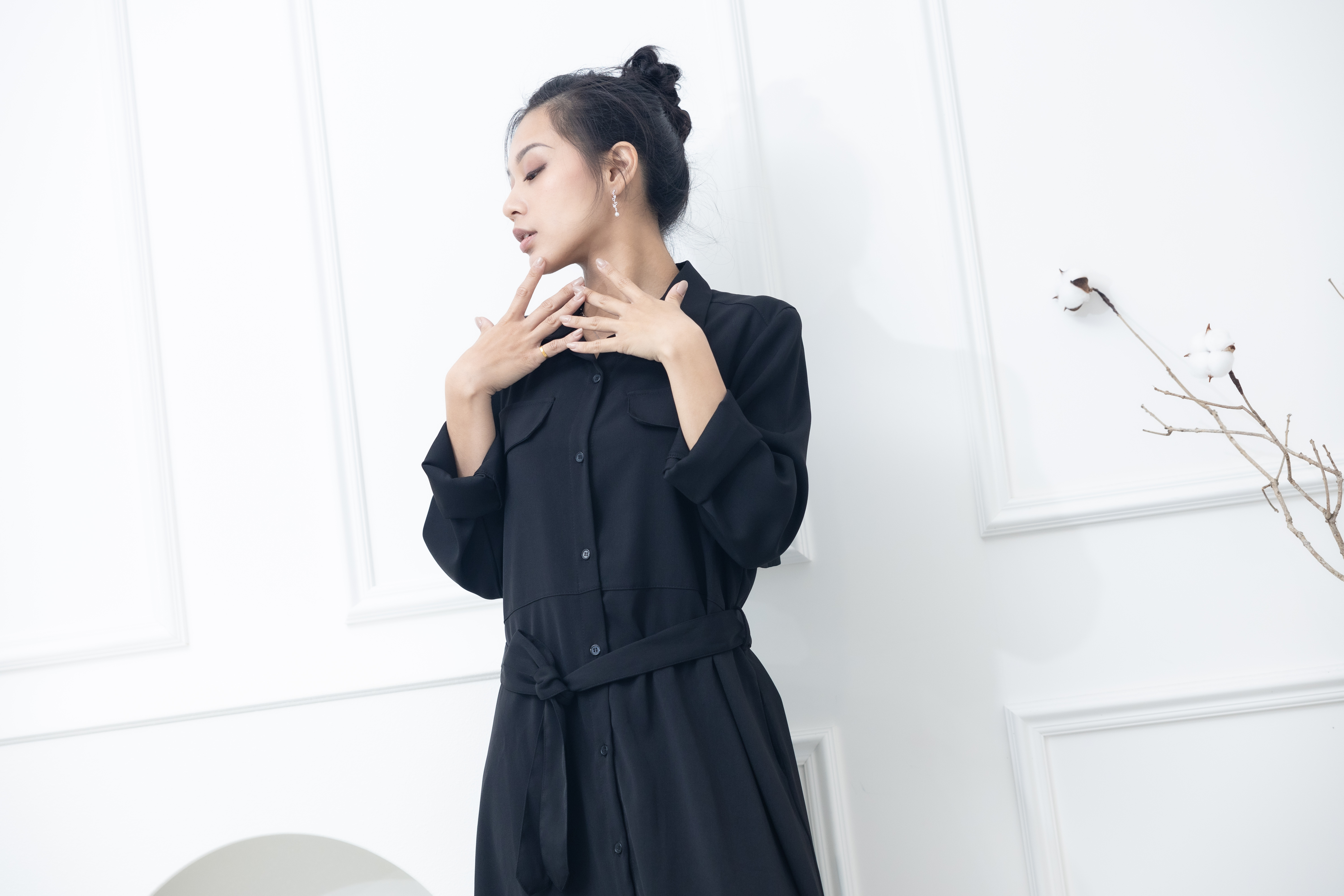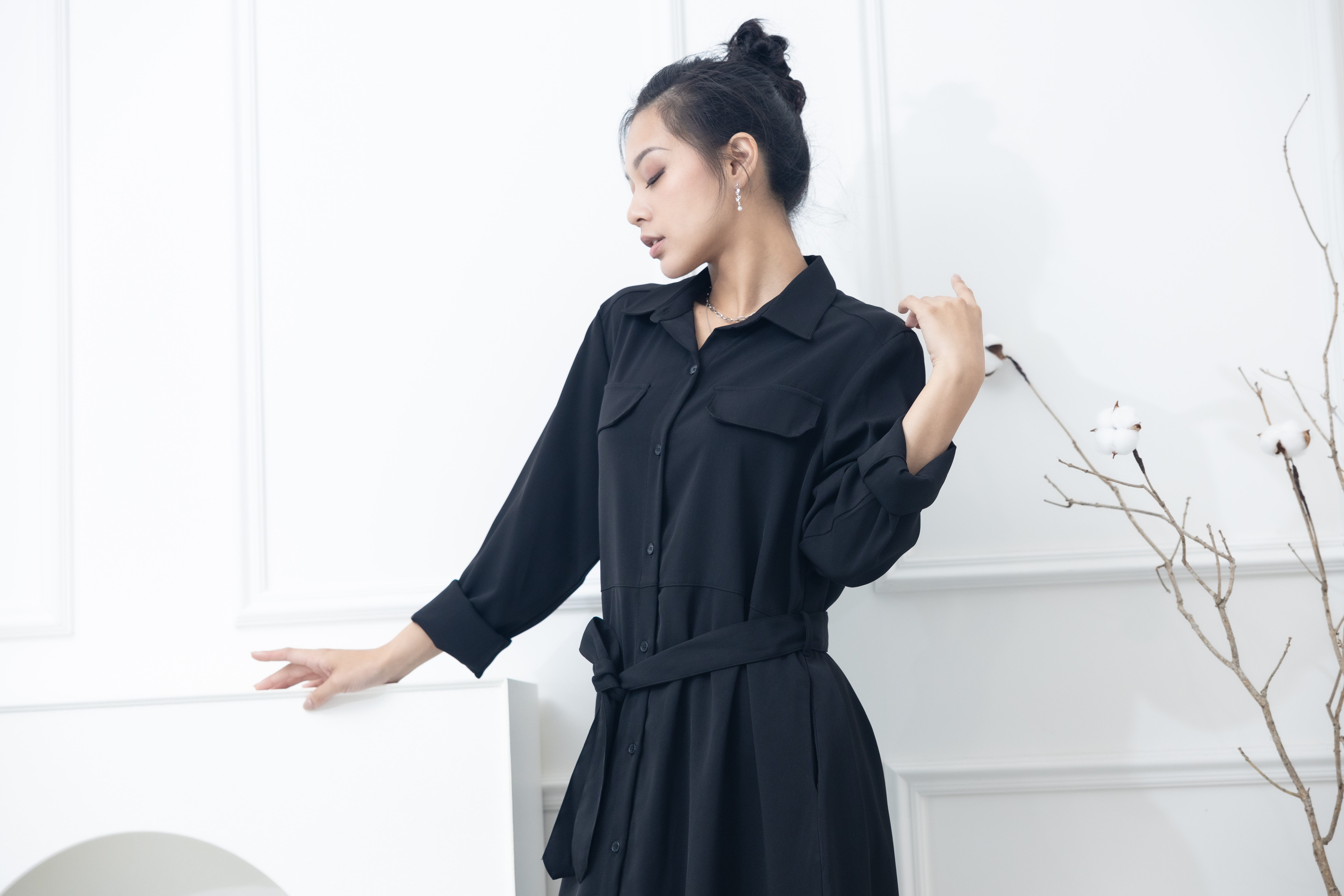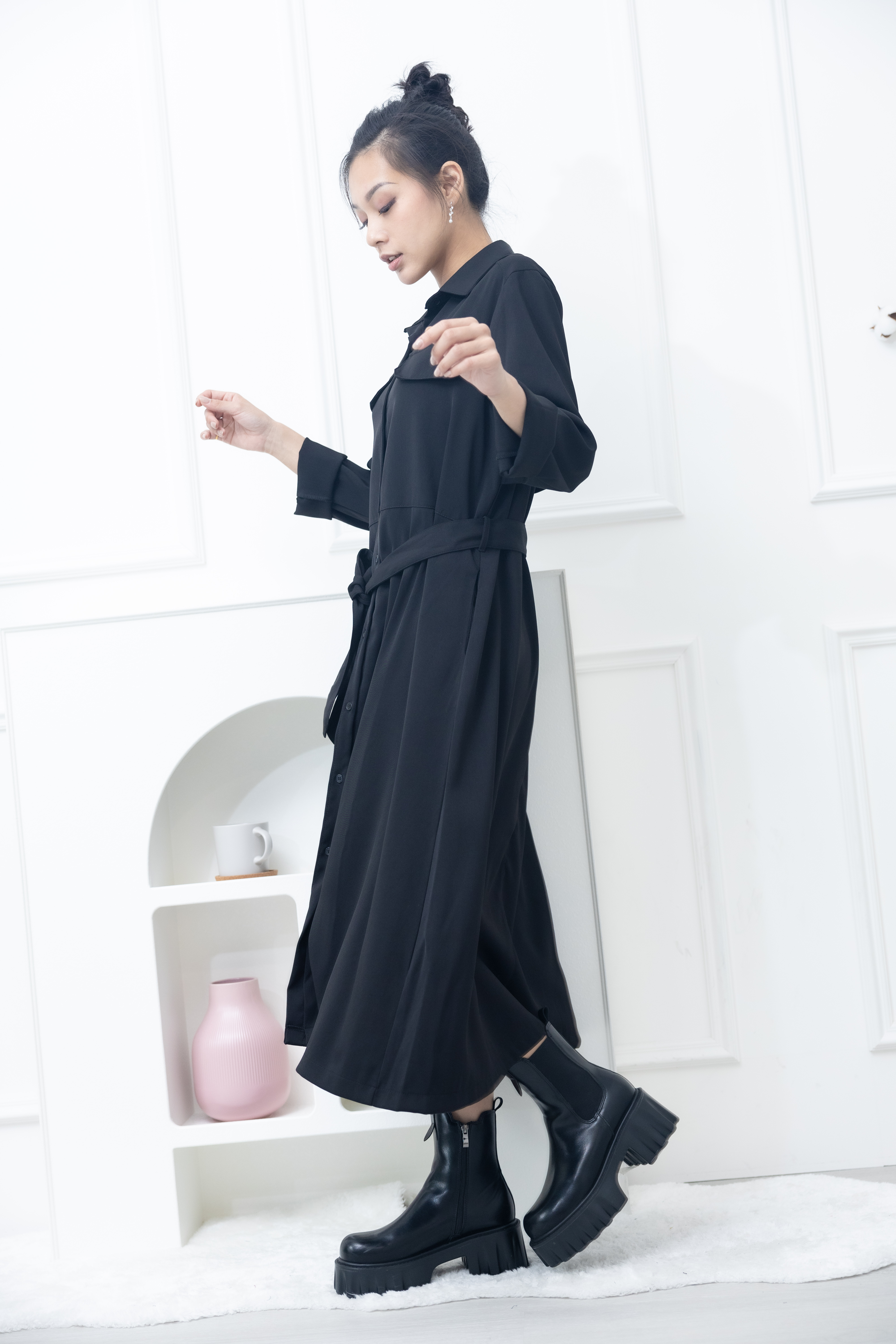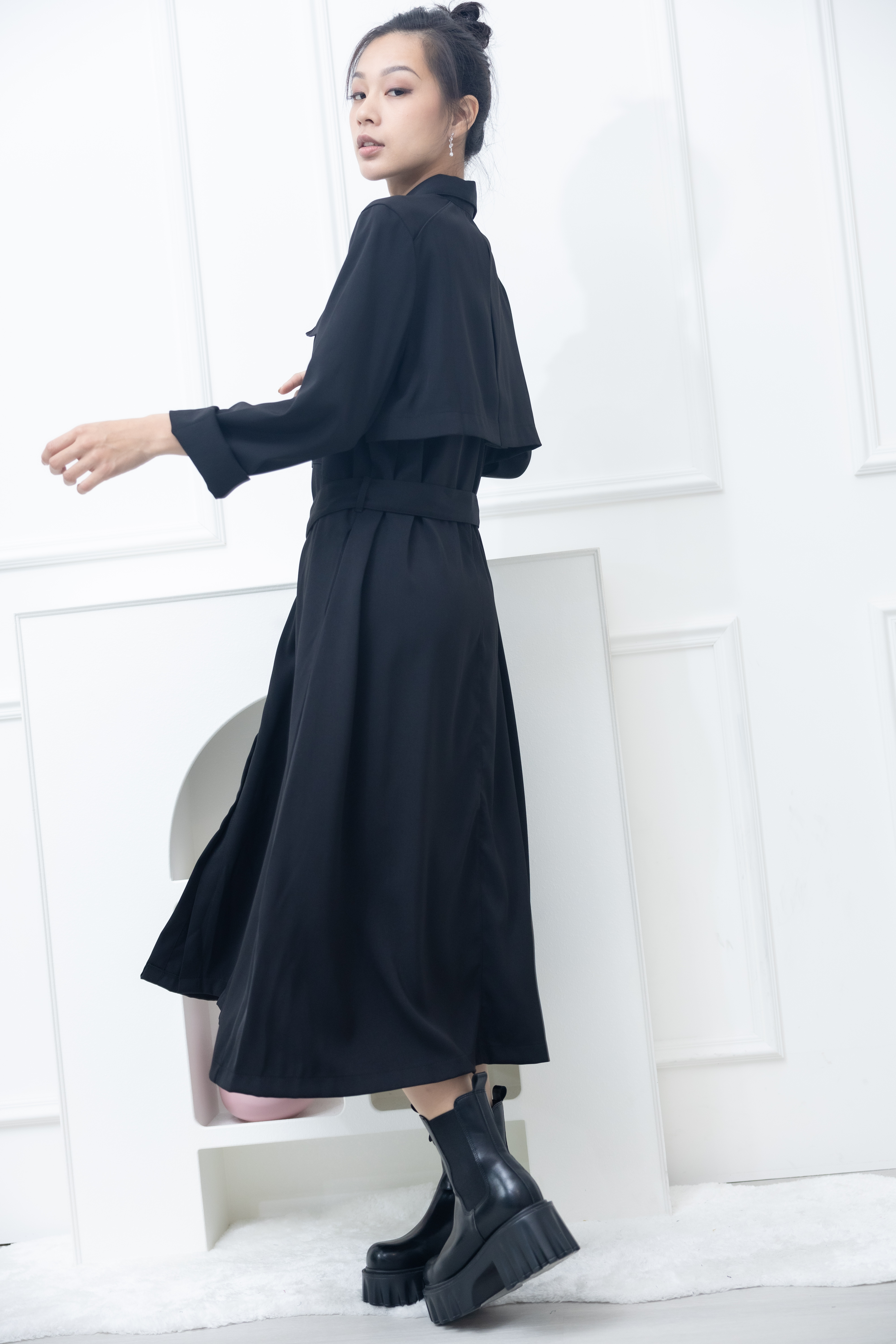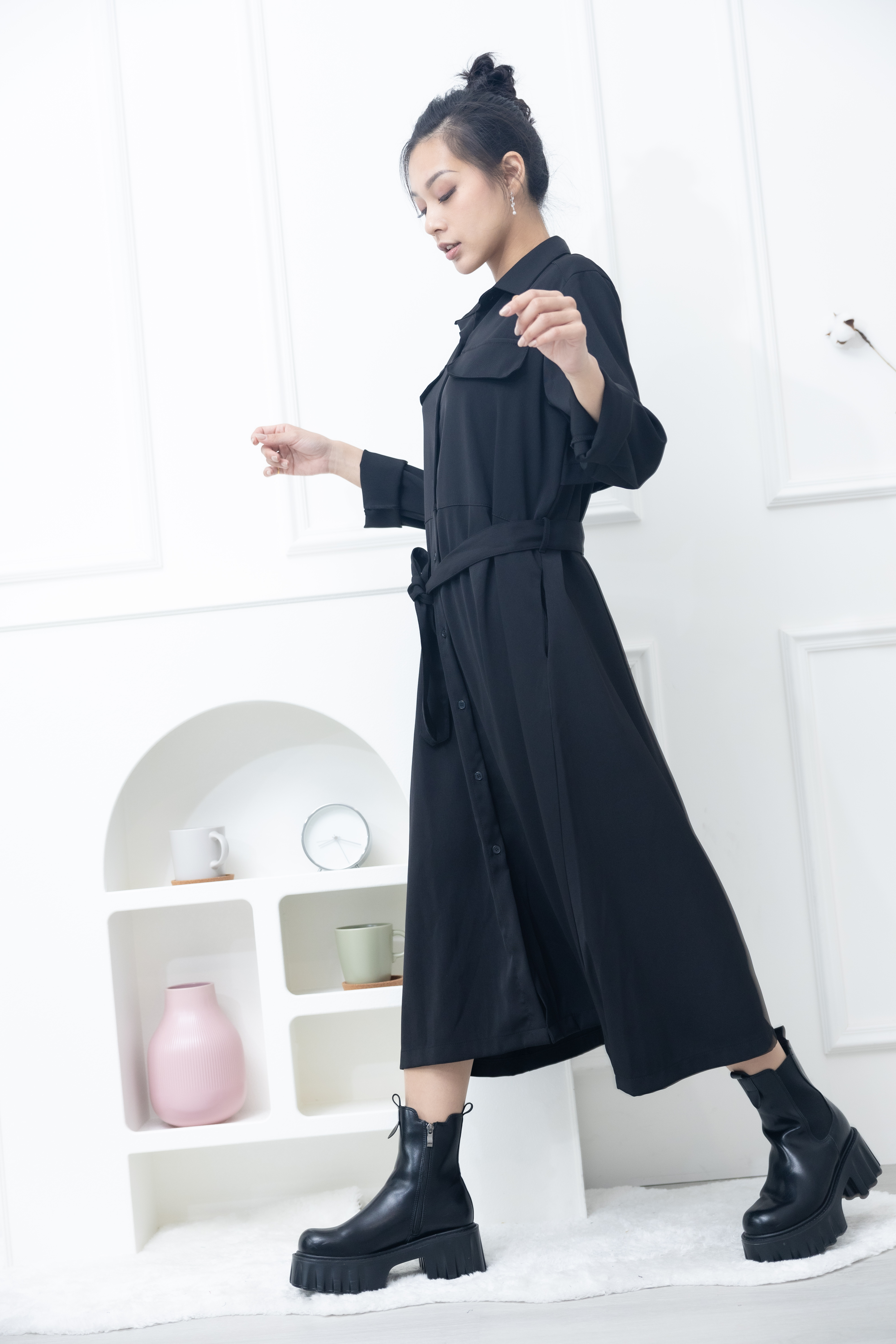 원피스 立領小A字假口袋洋裝 / 黑色
