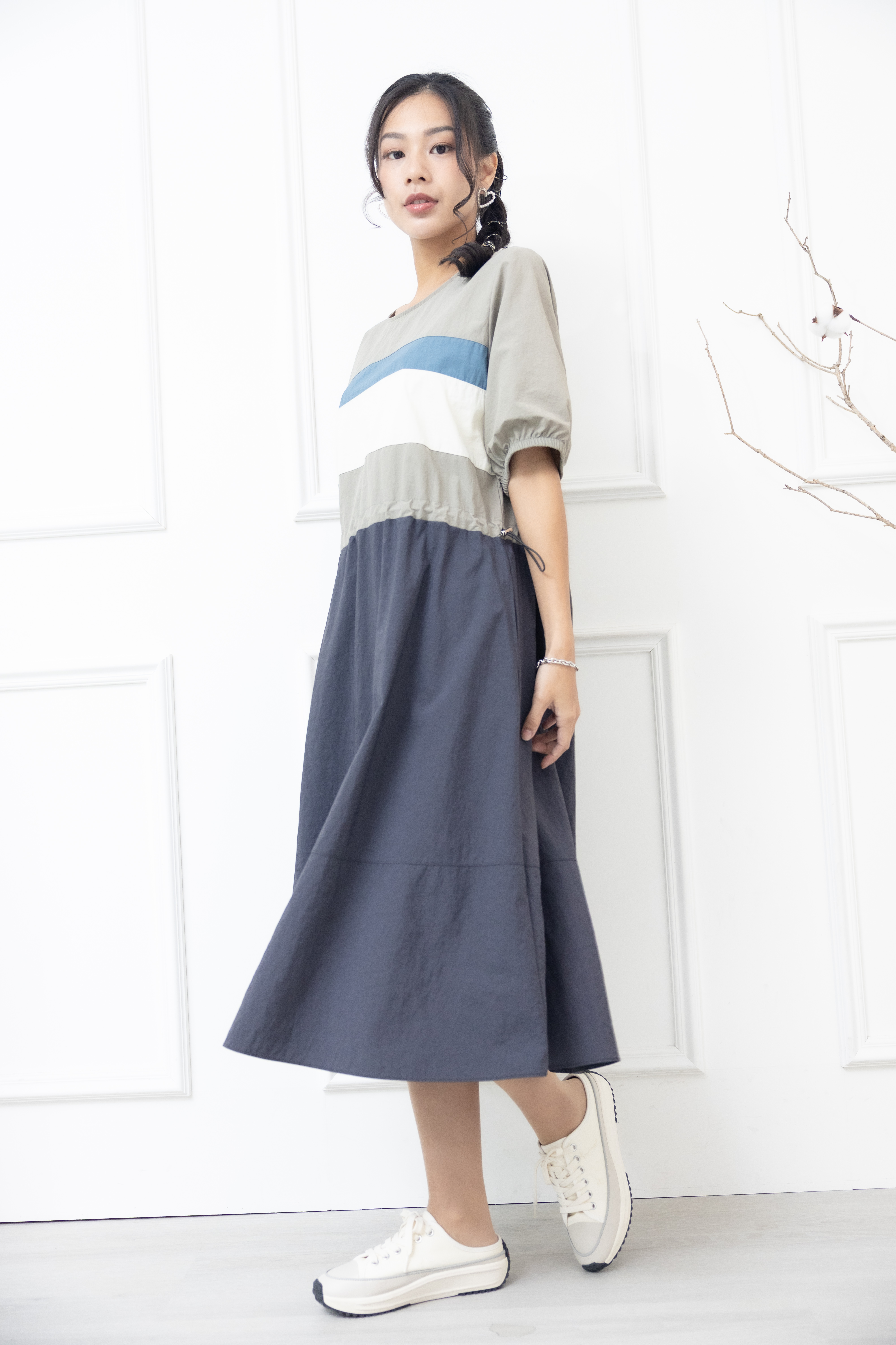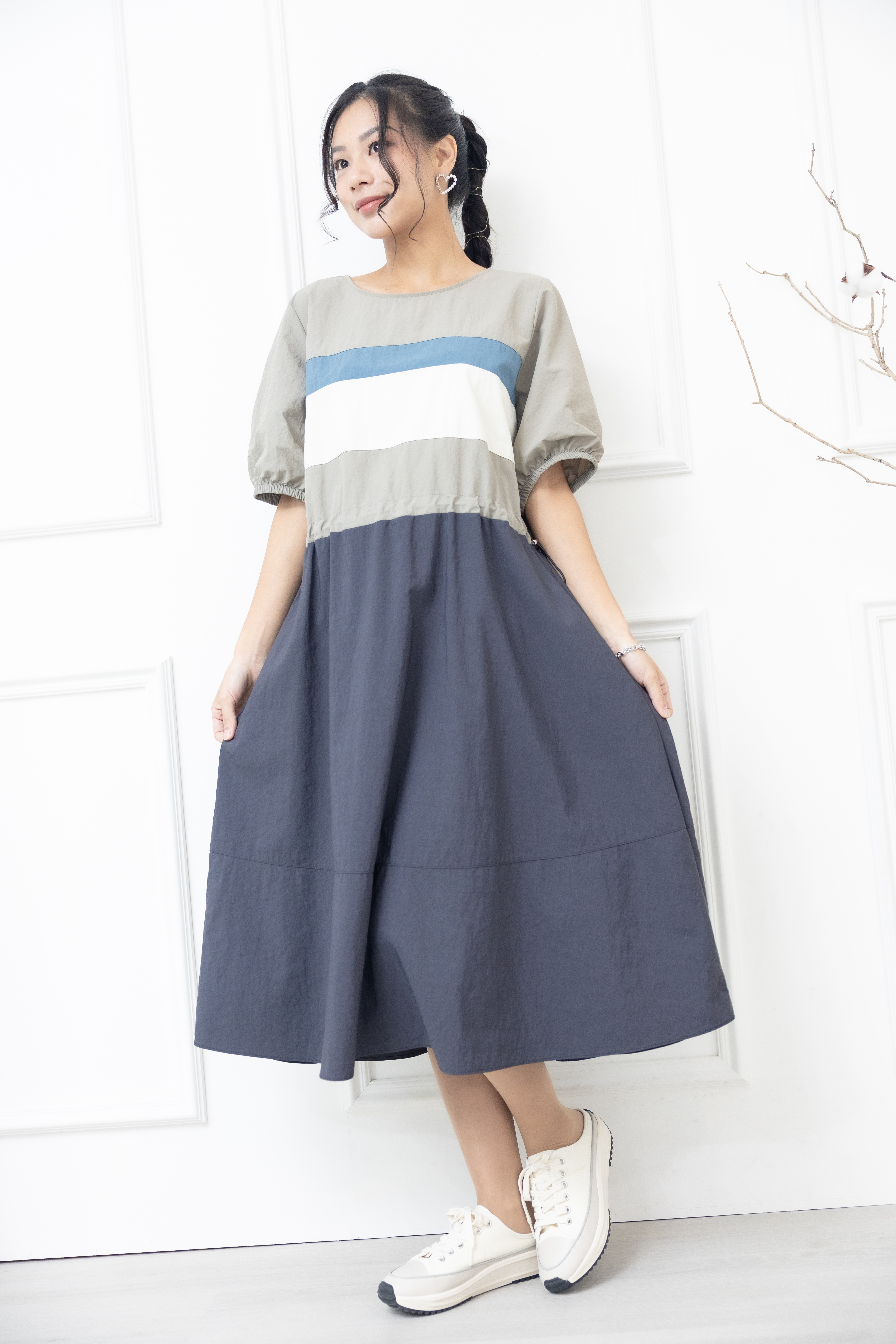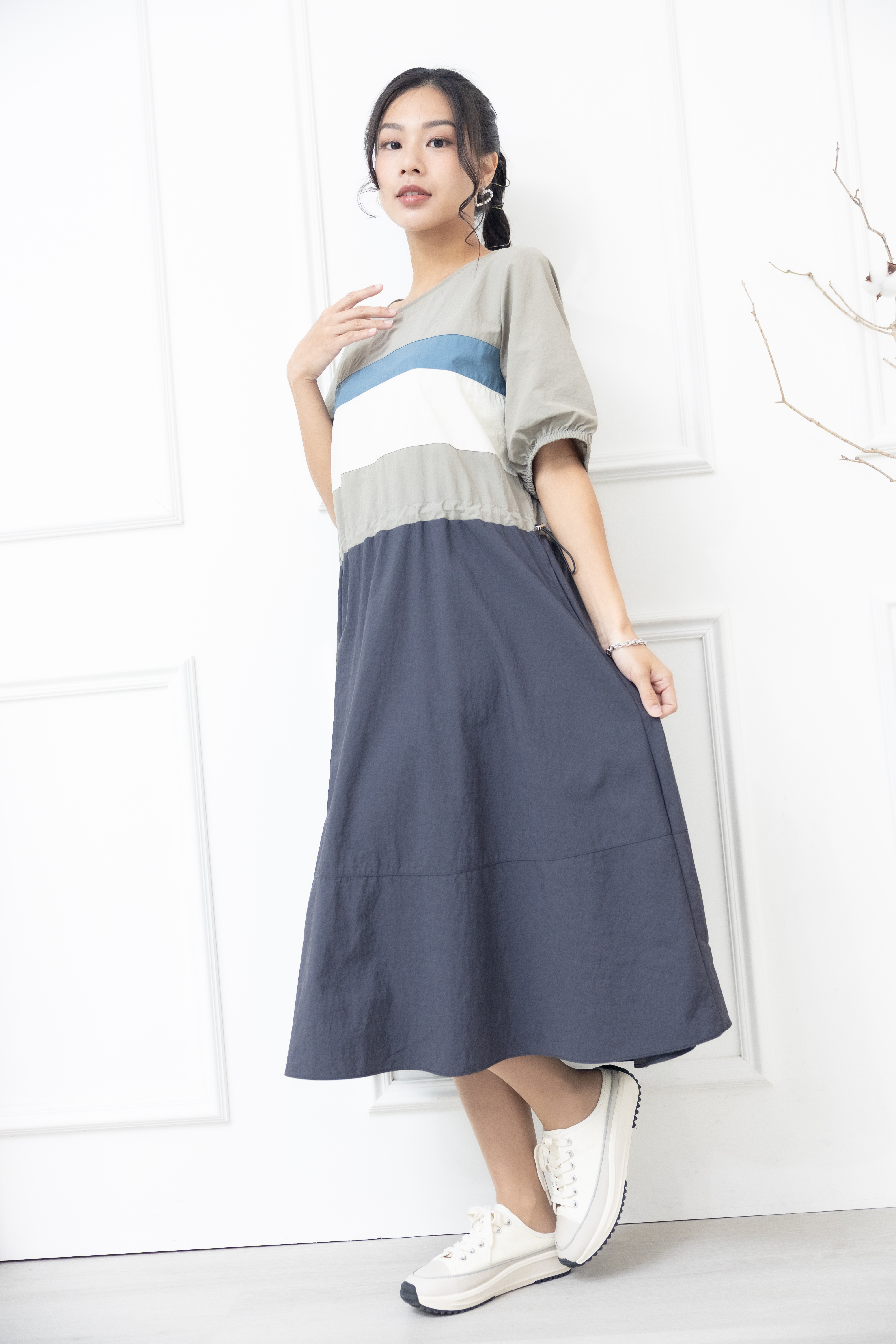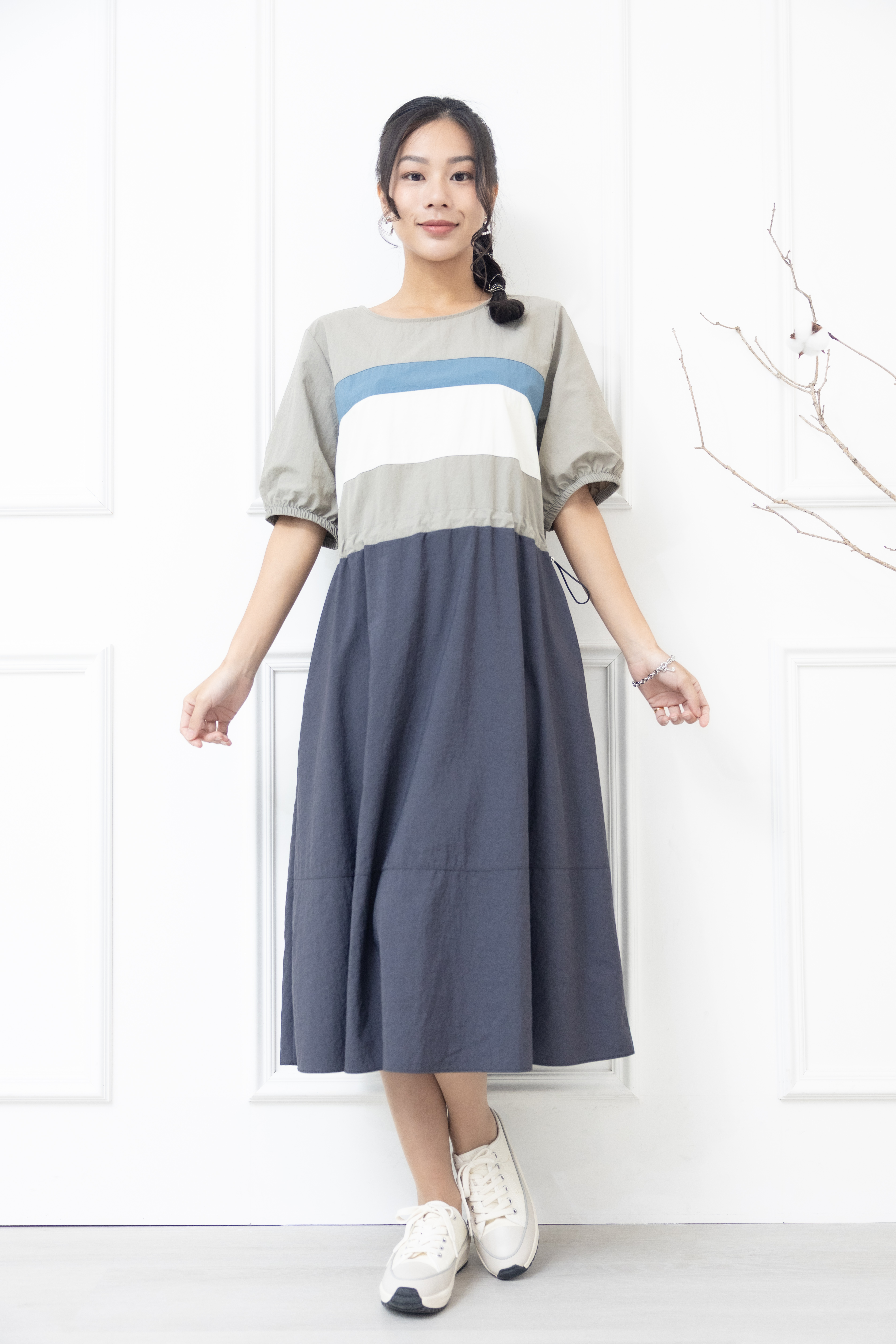 원피스 米.藍色橫條紋腰部抽繩五分袖洋裝 / 灰色