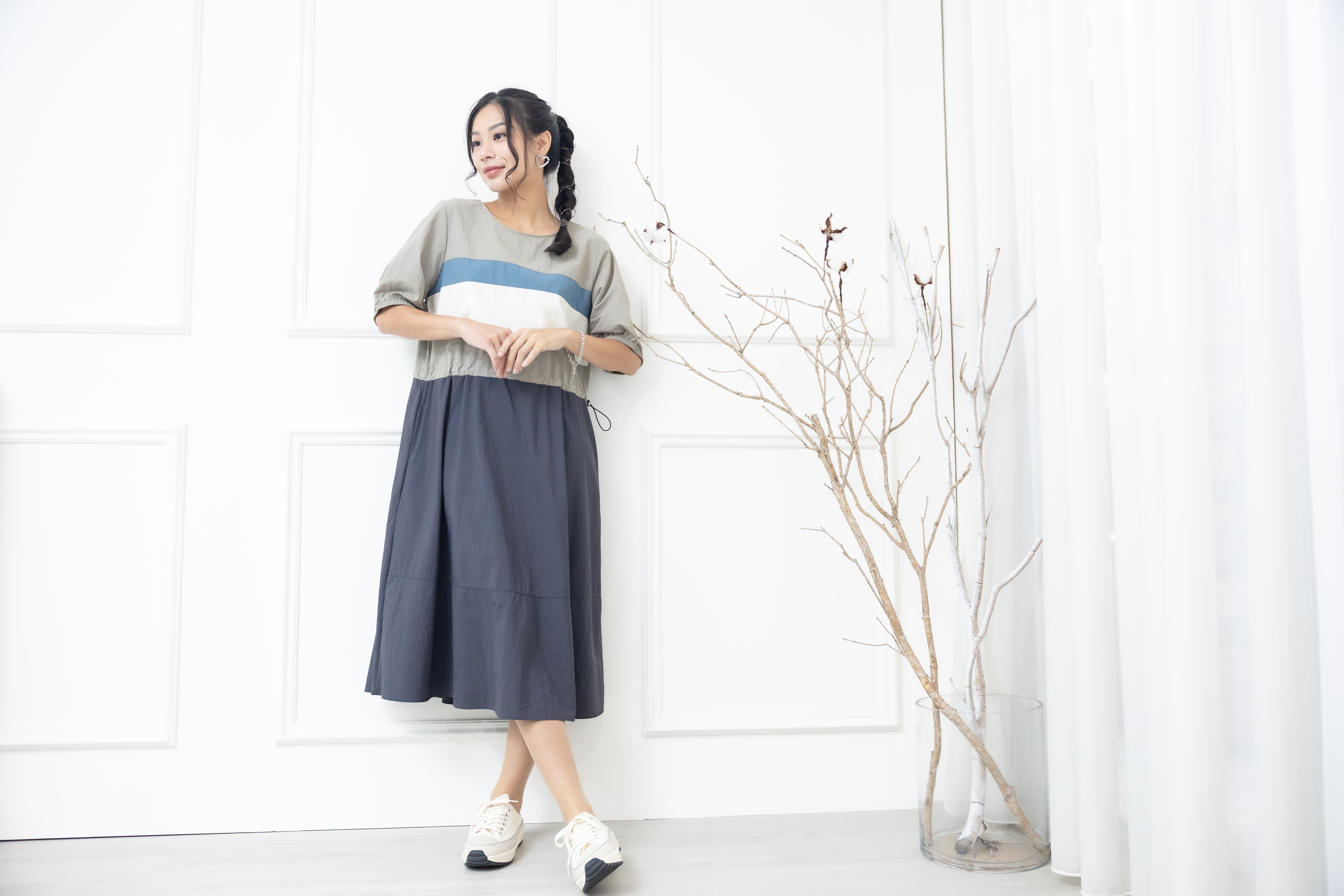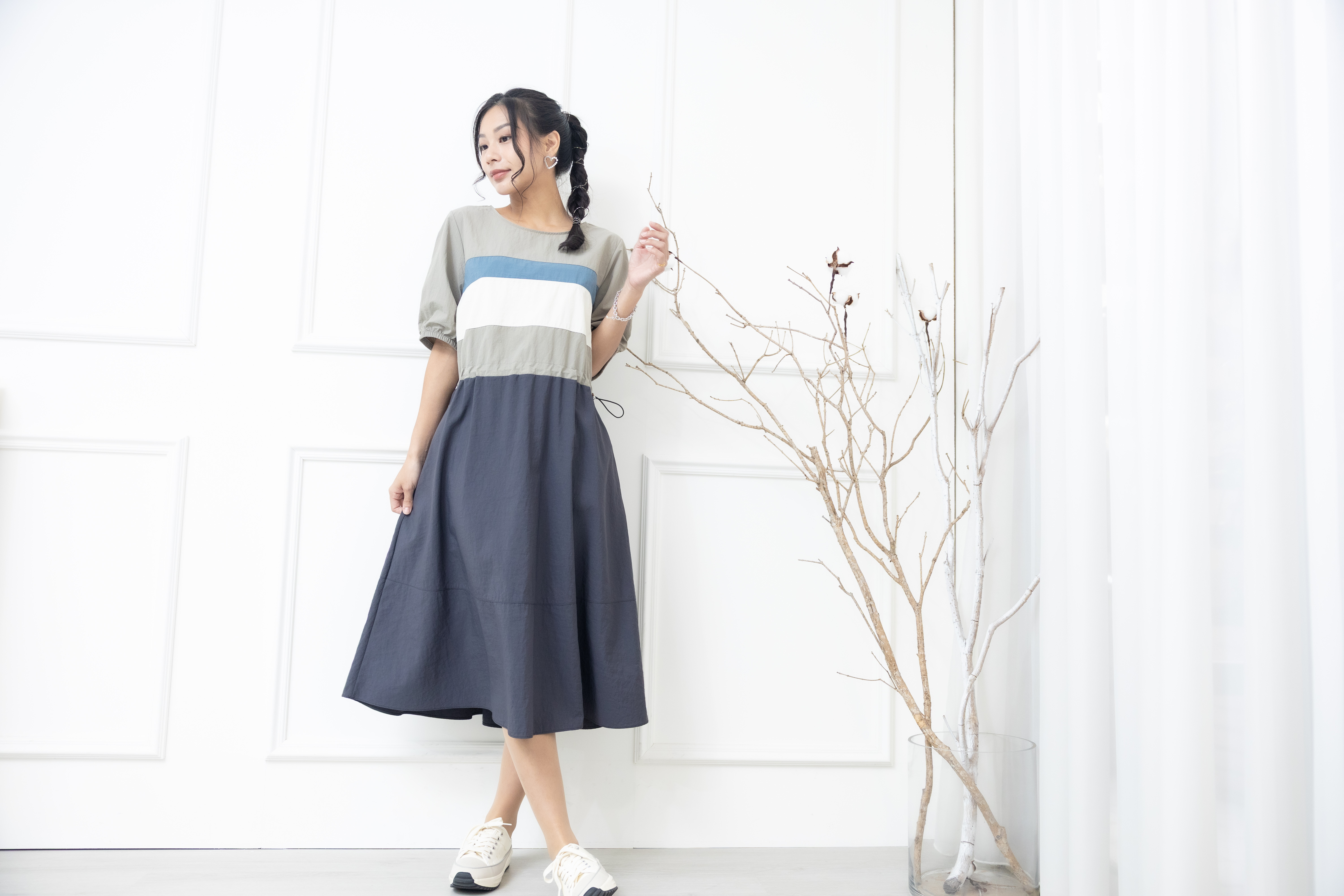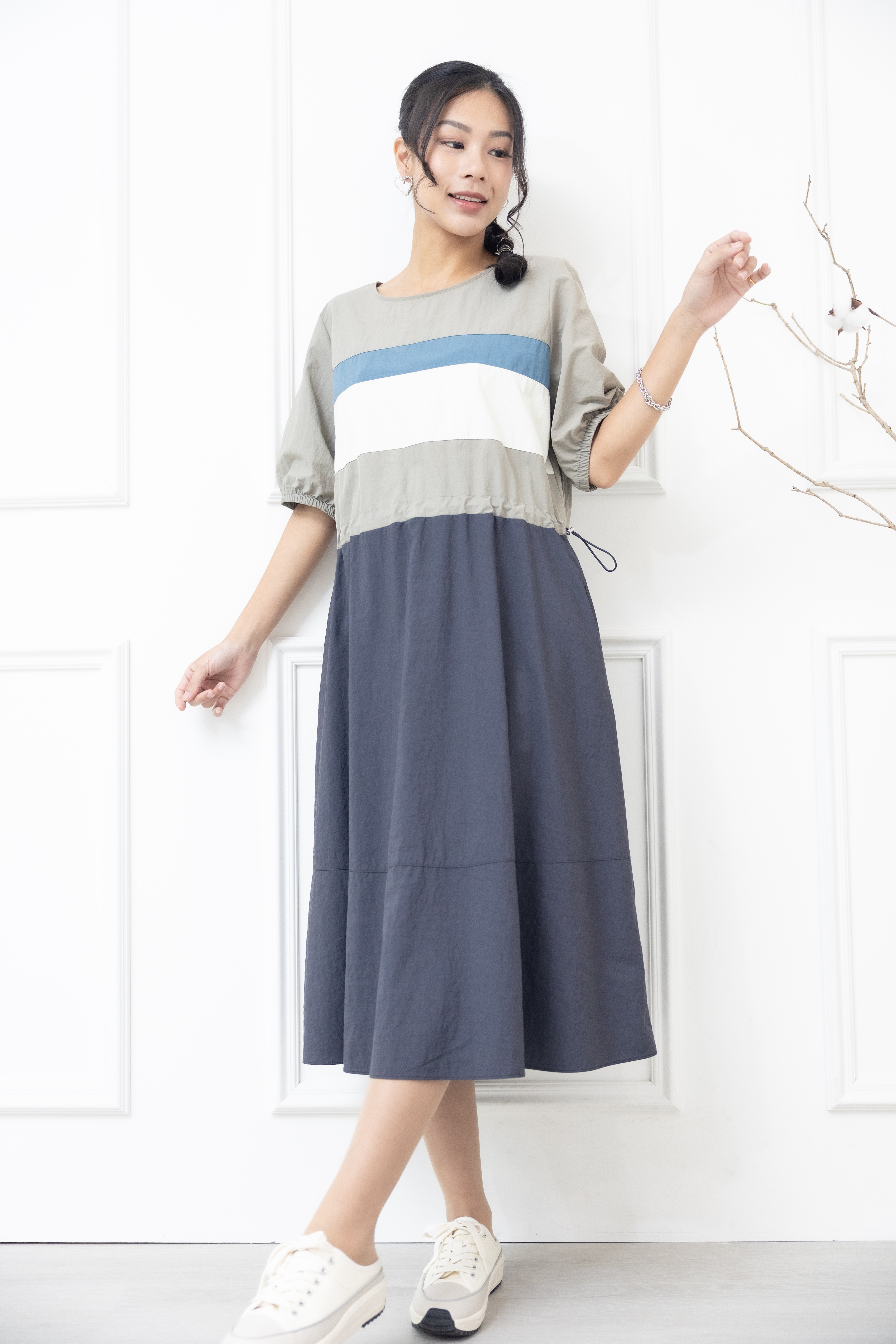 원피스 米.藍色橫條紋腰部抽繩五分袖洋裝 / 灰色