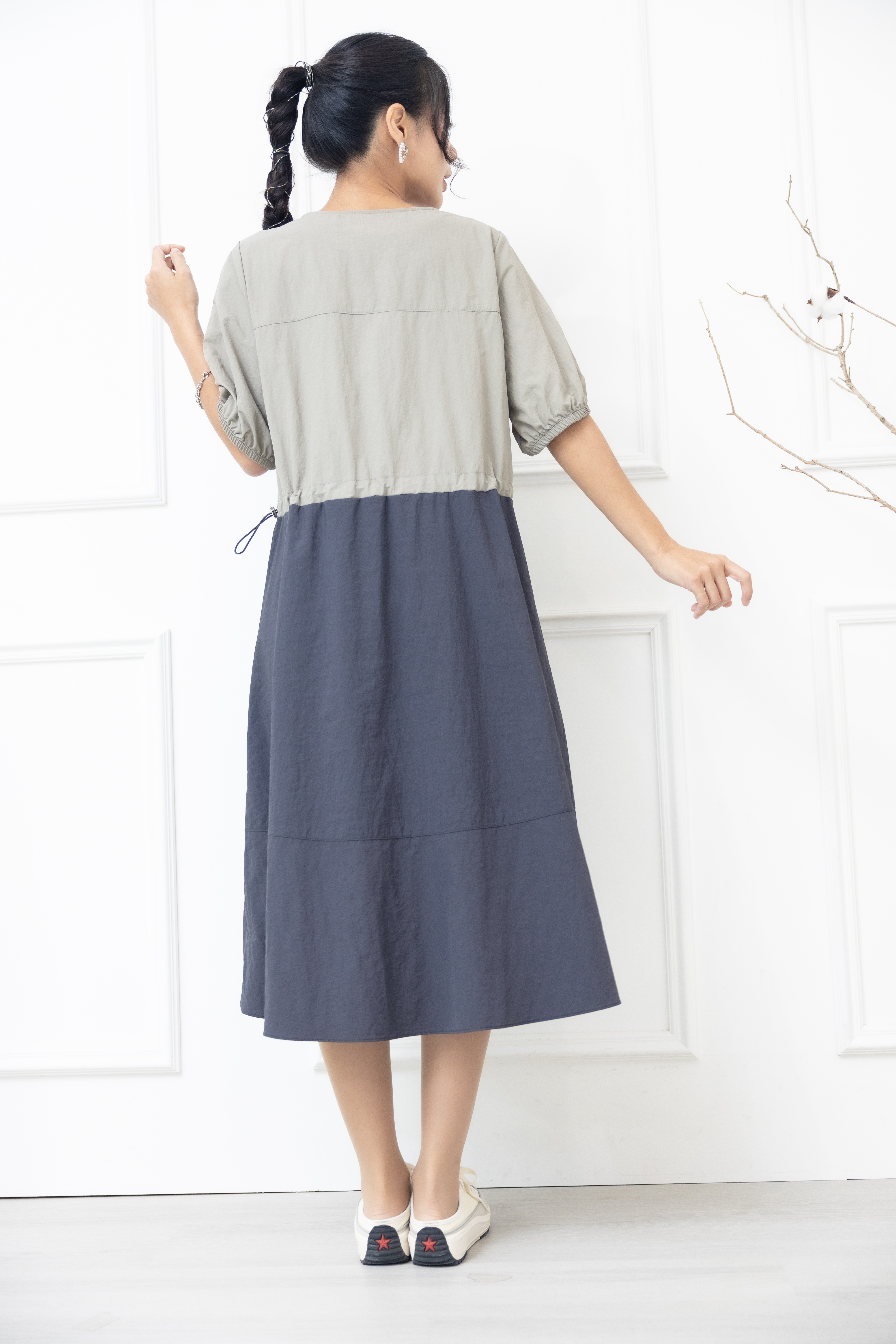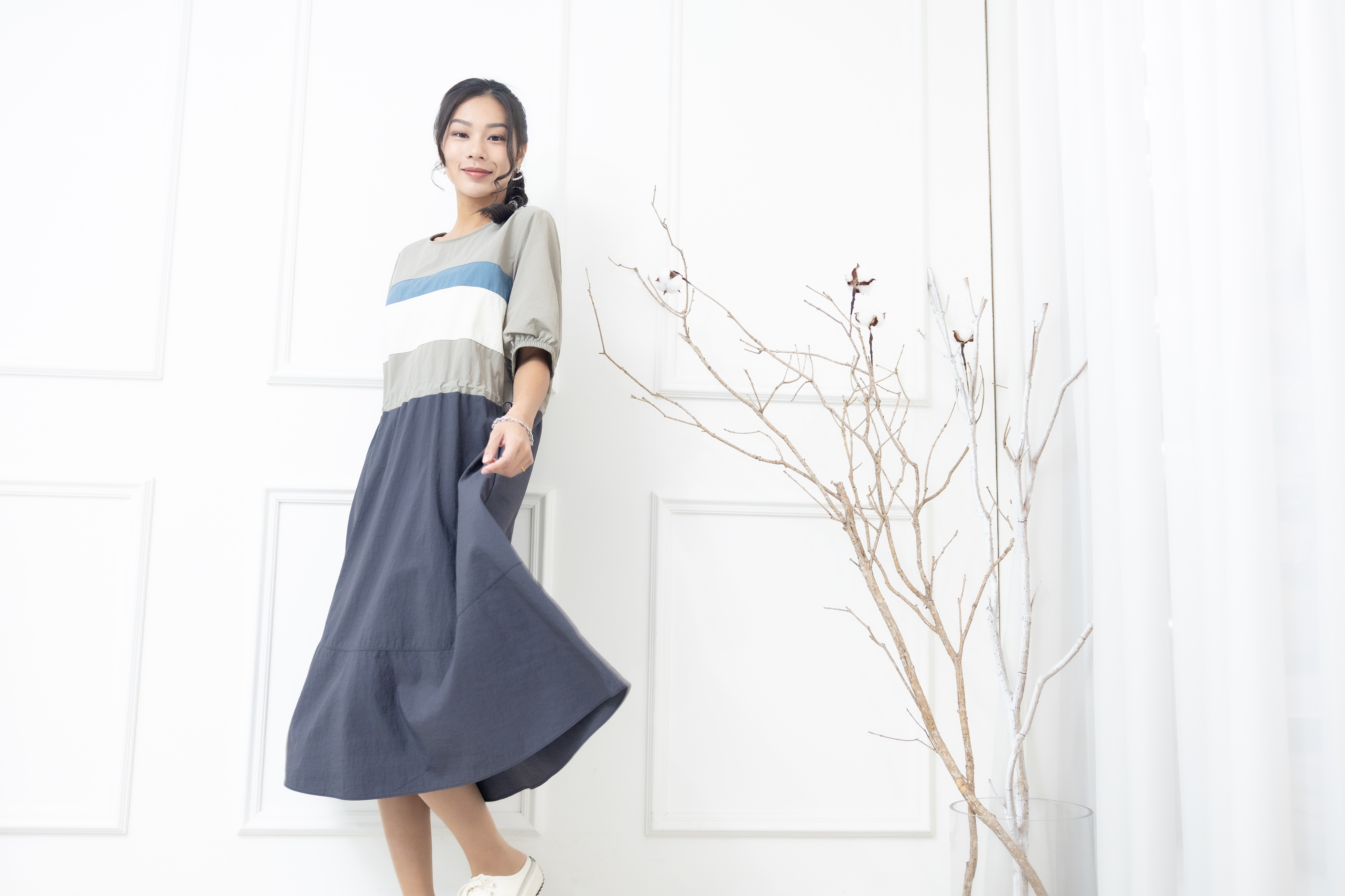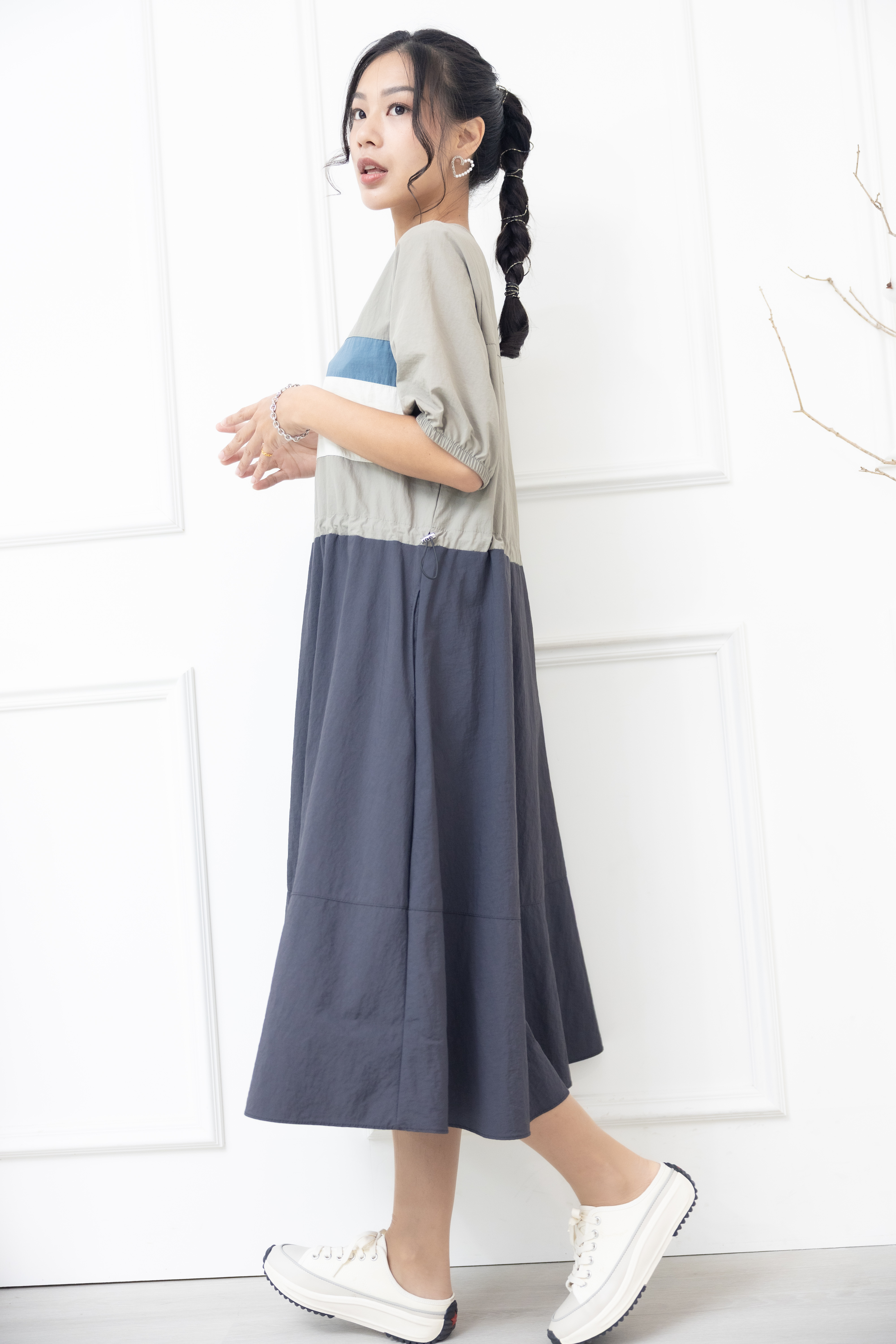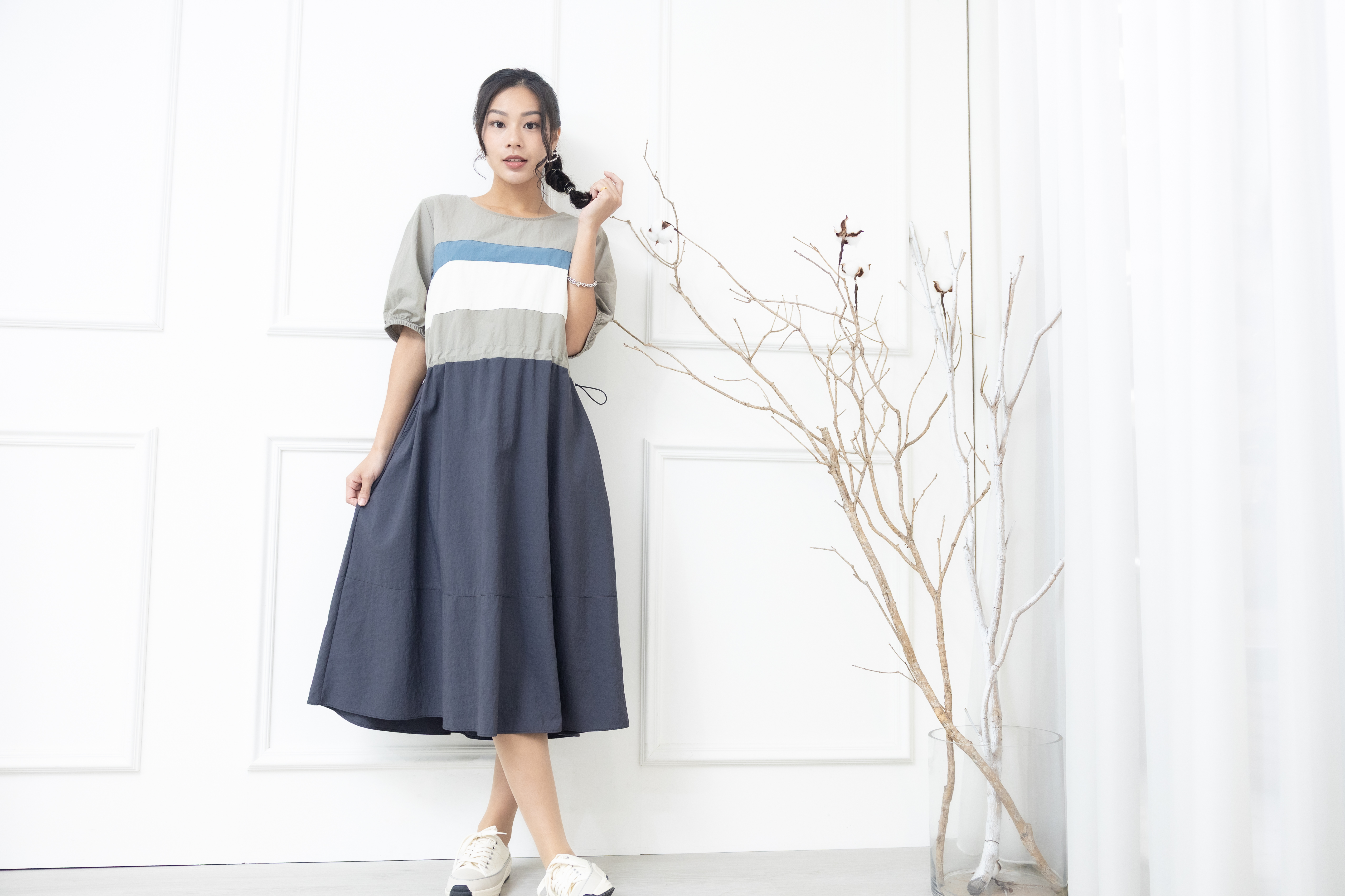 원피스 米.藍色橫條紋腰部抽繩五分袖洋裝 / 灰色