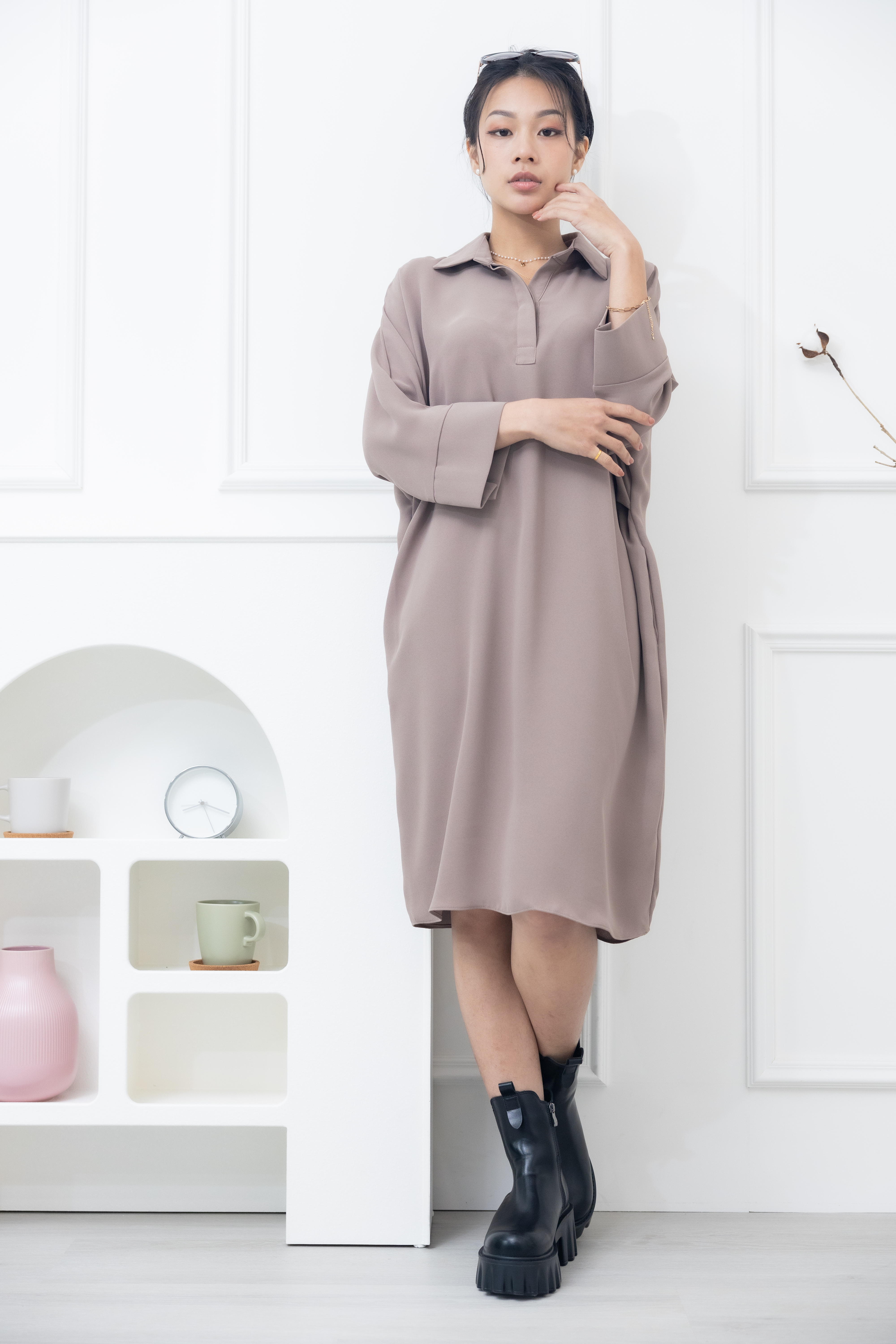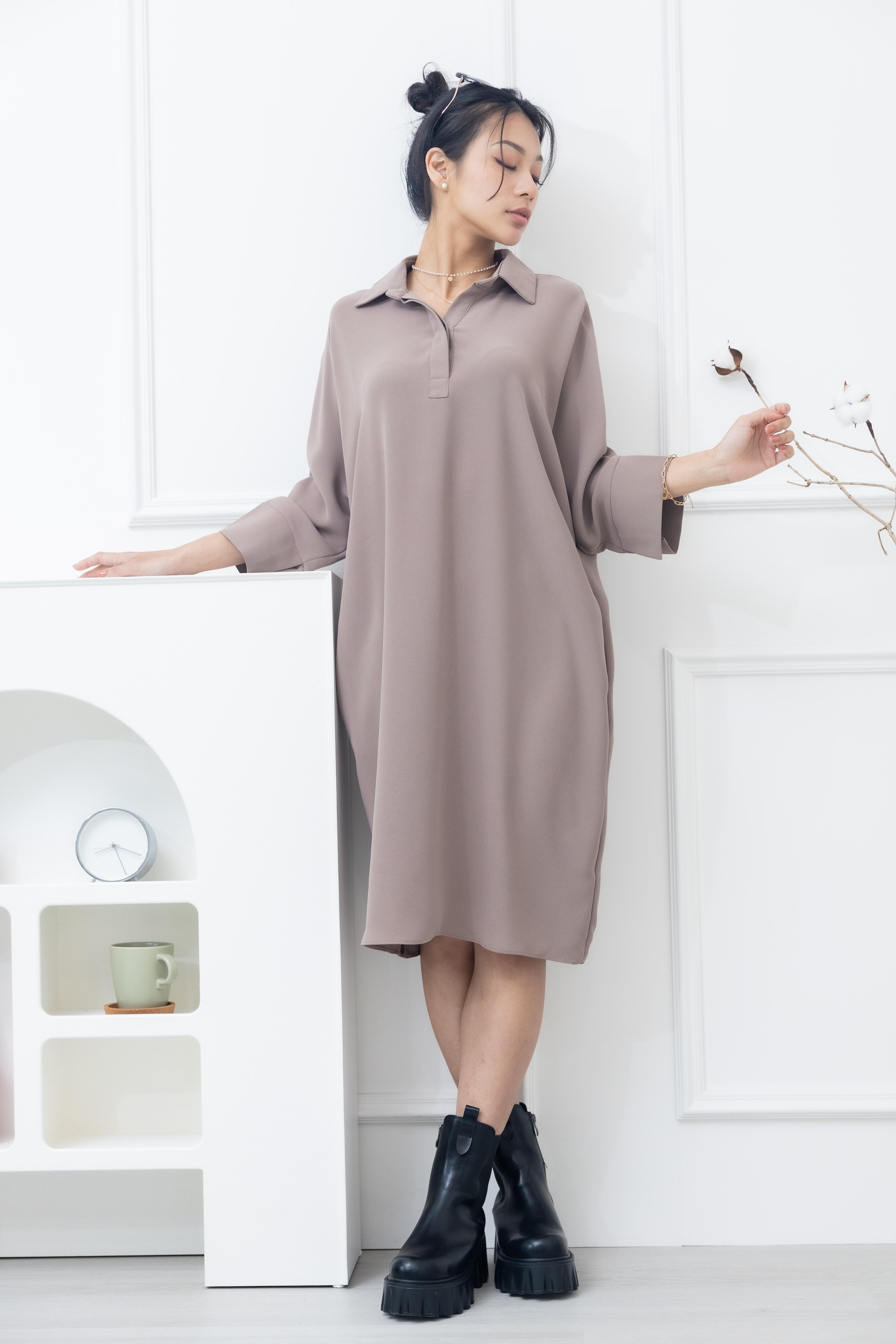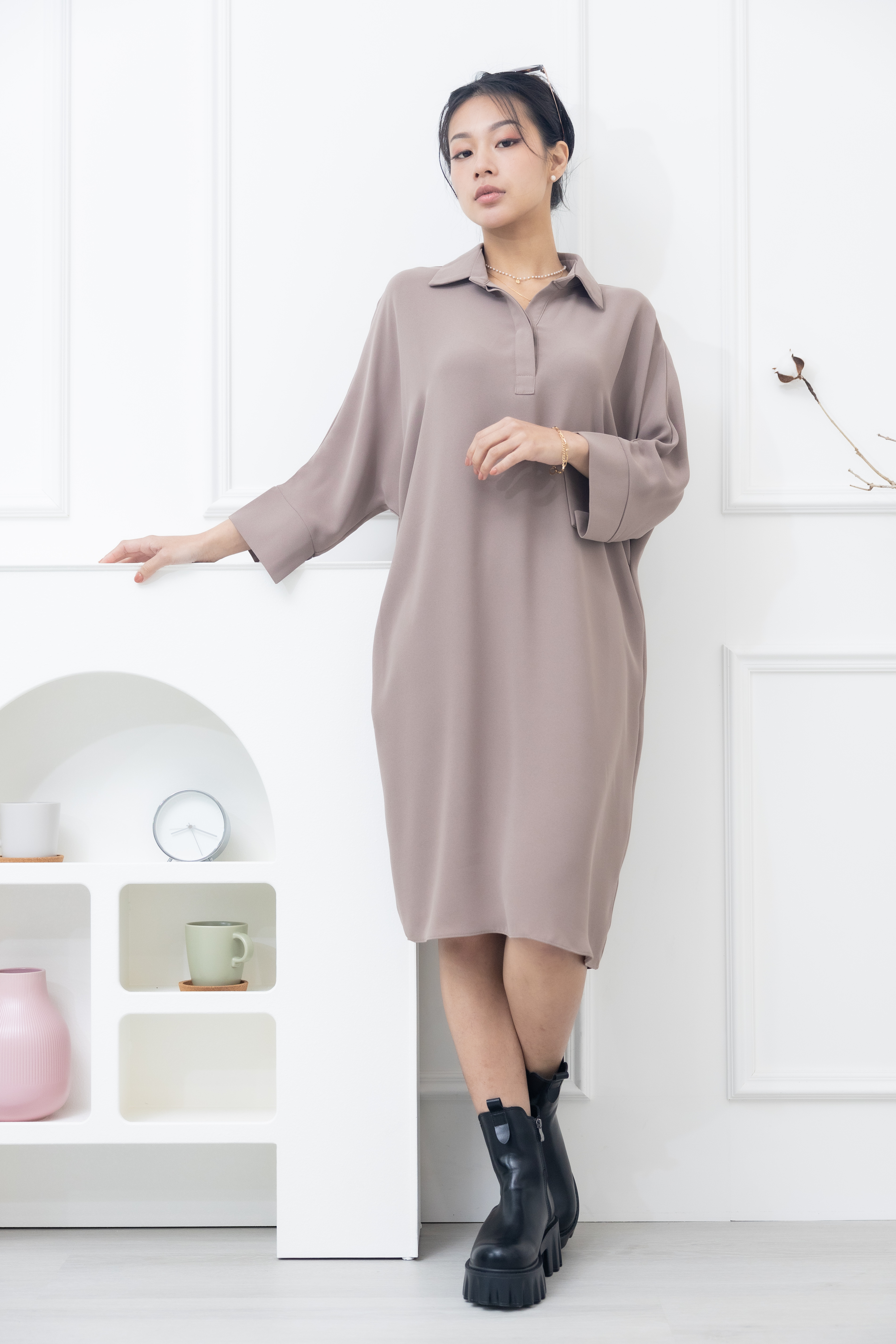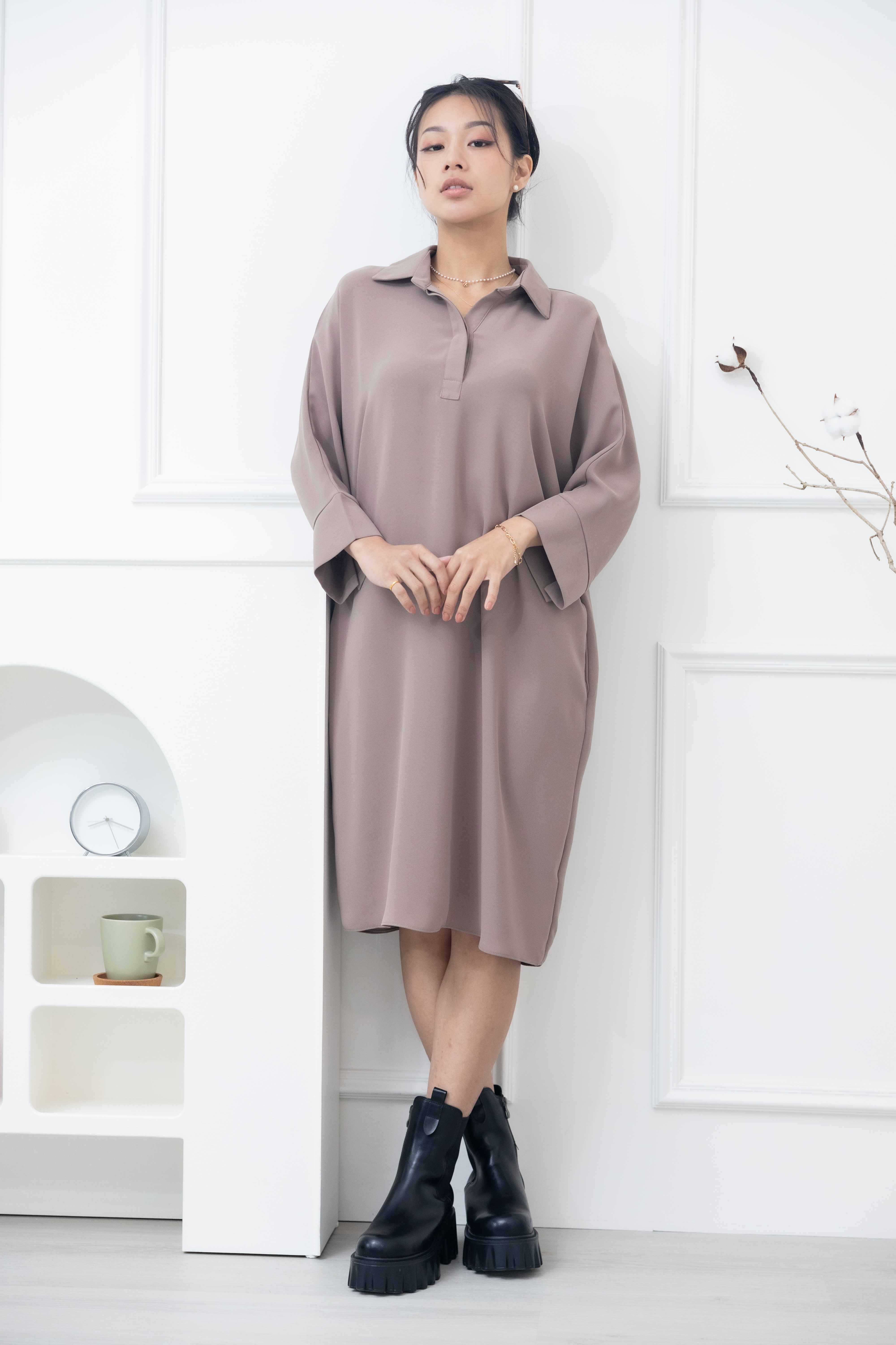 원피스 素面無肩線口袋洋裝 / 卡其色