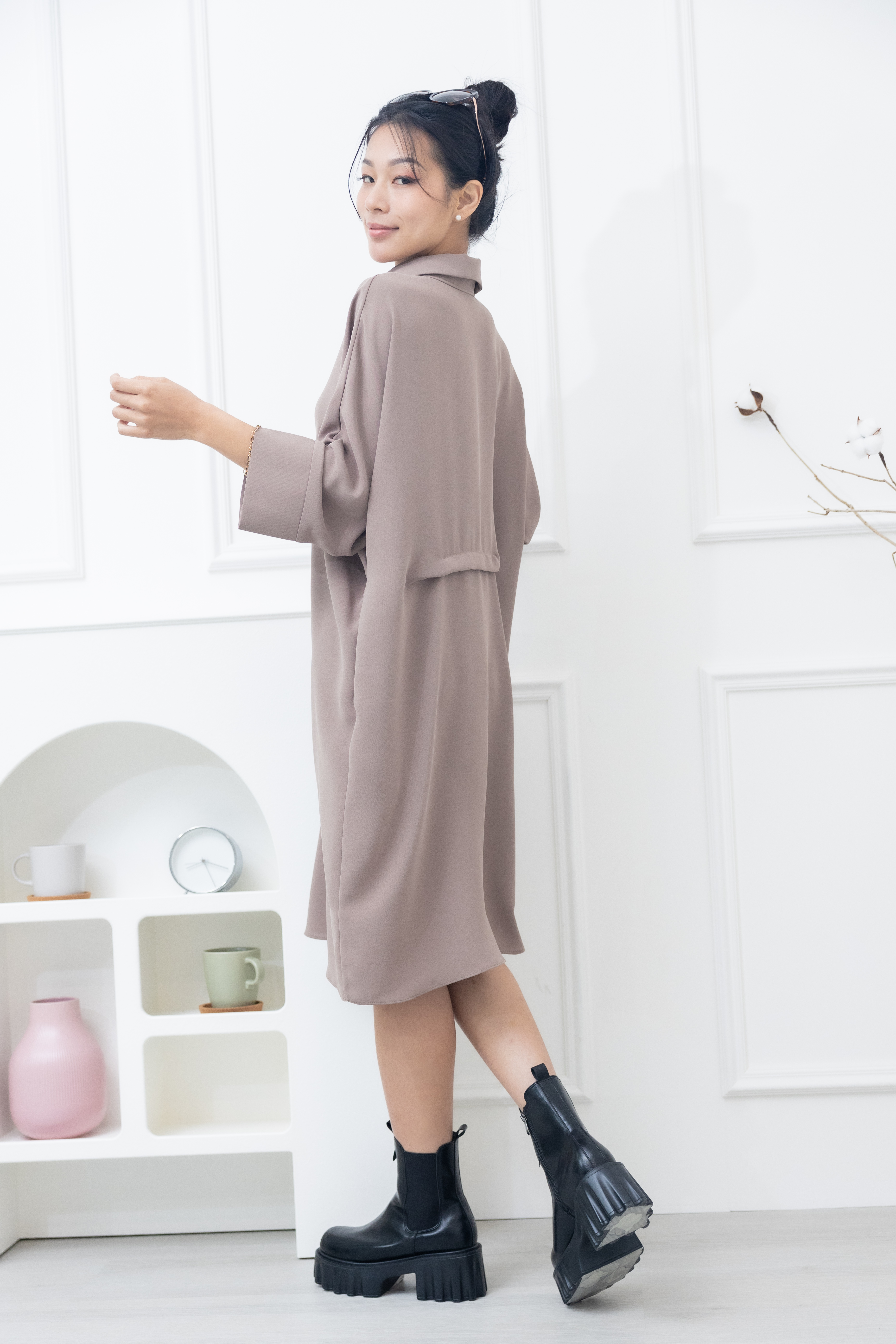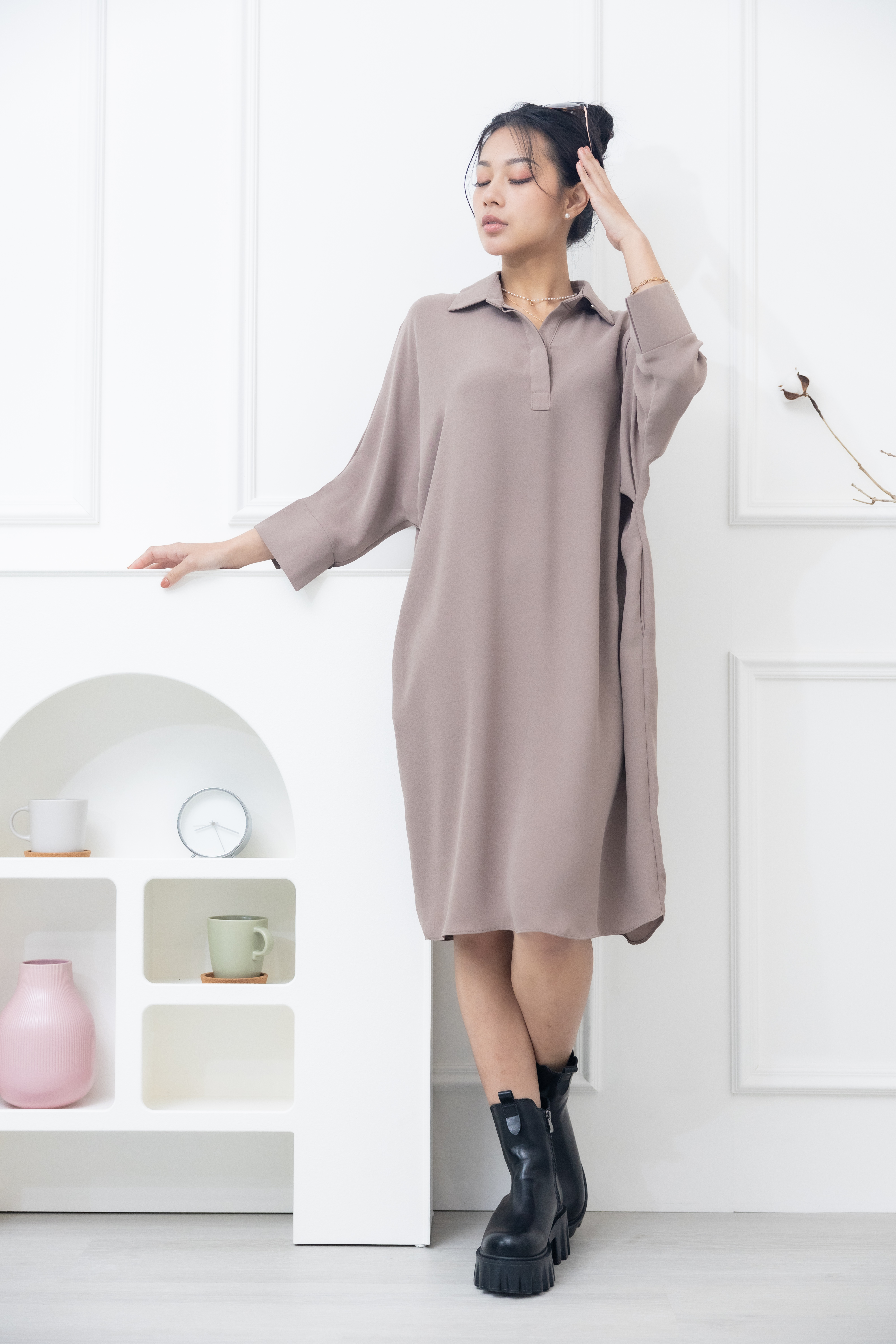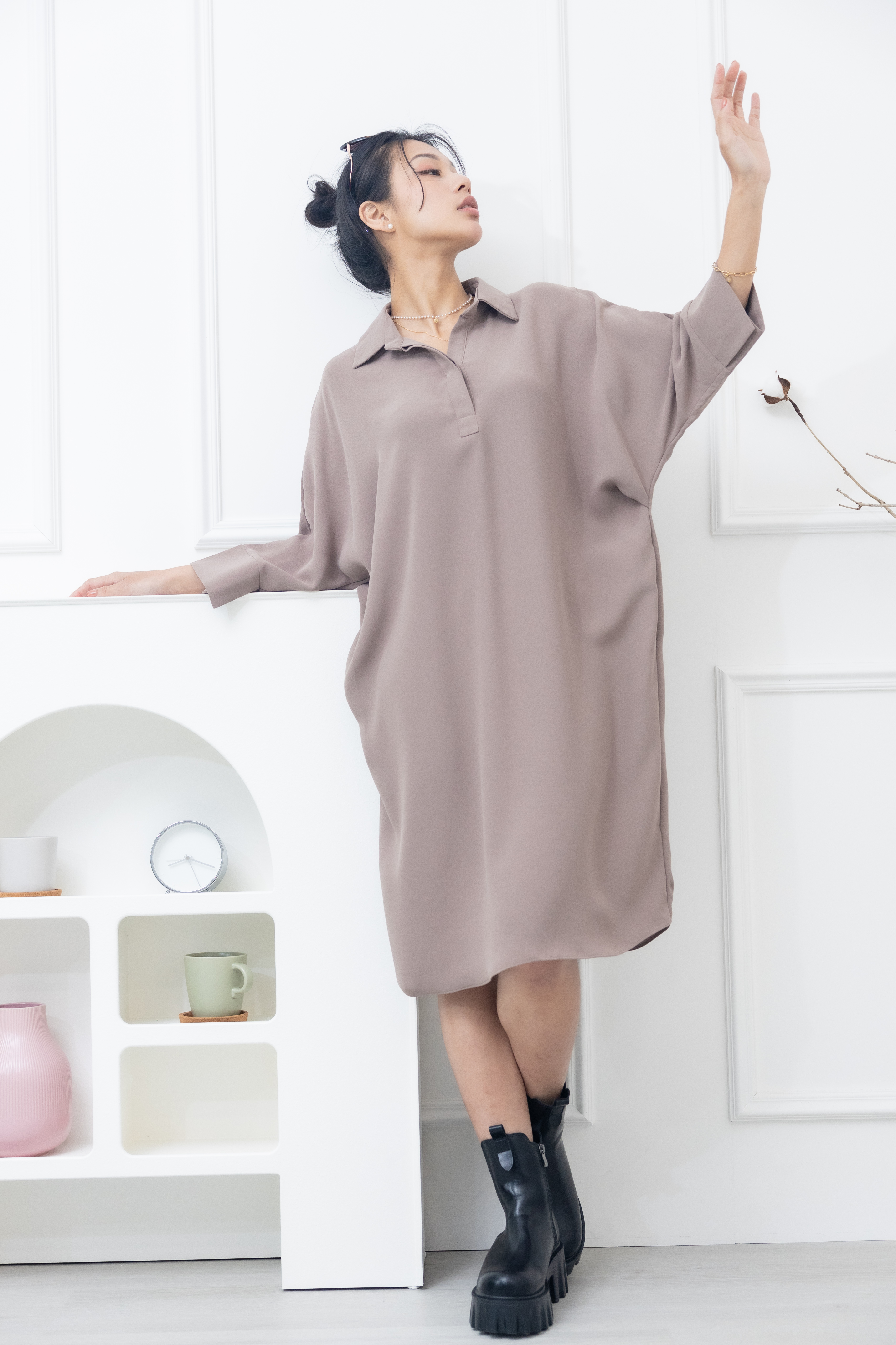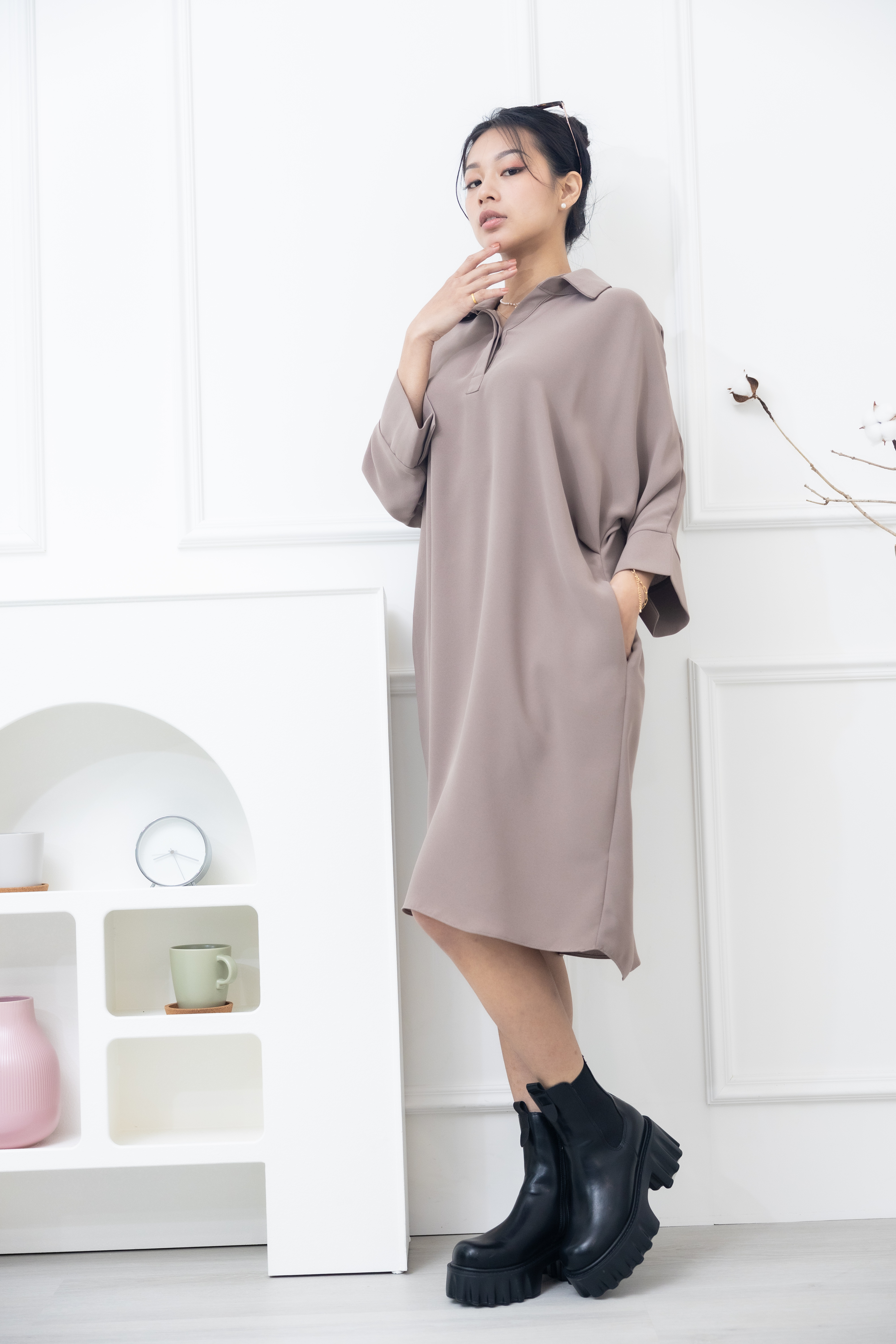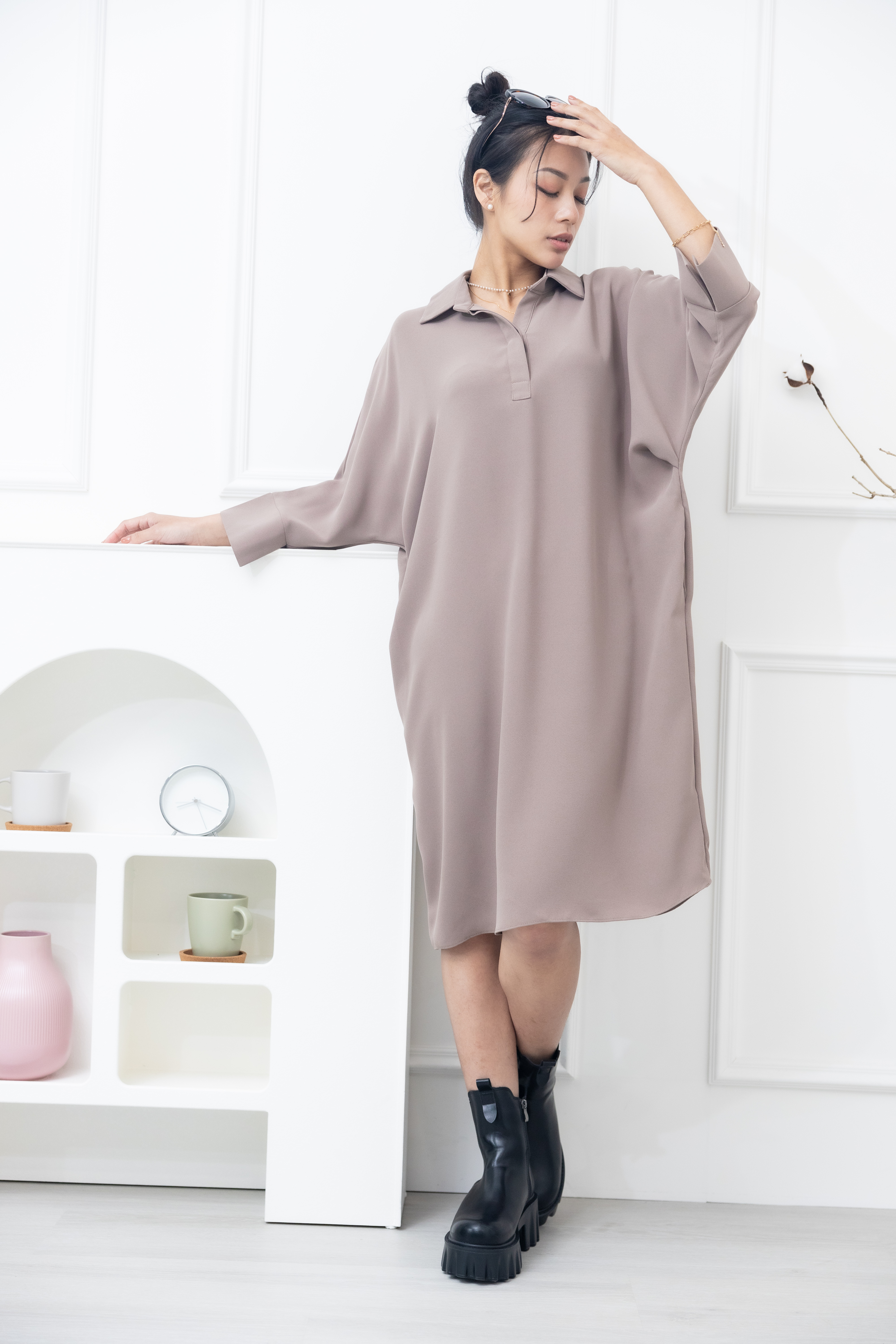 원피스 素面無肩線口袋洋裝 / 卡其色