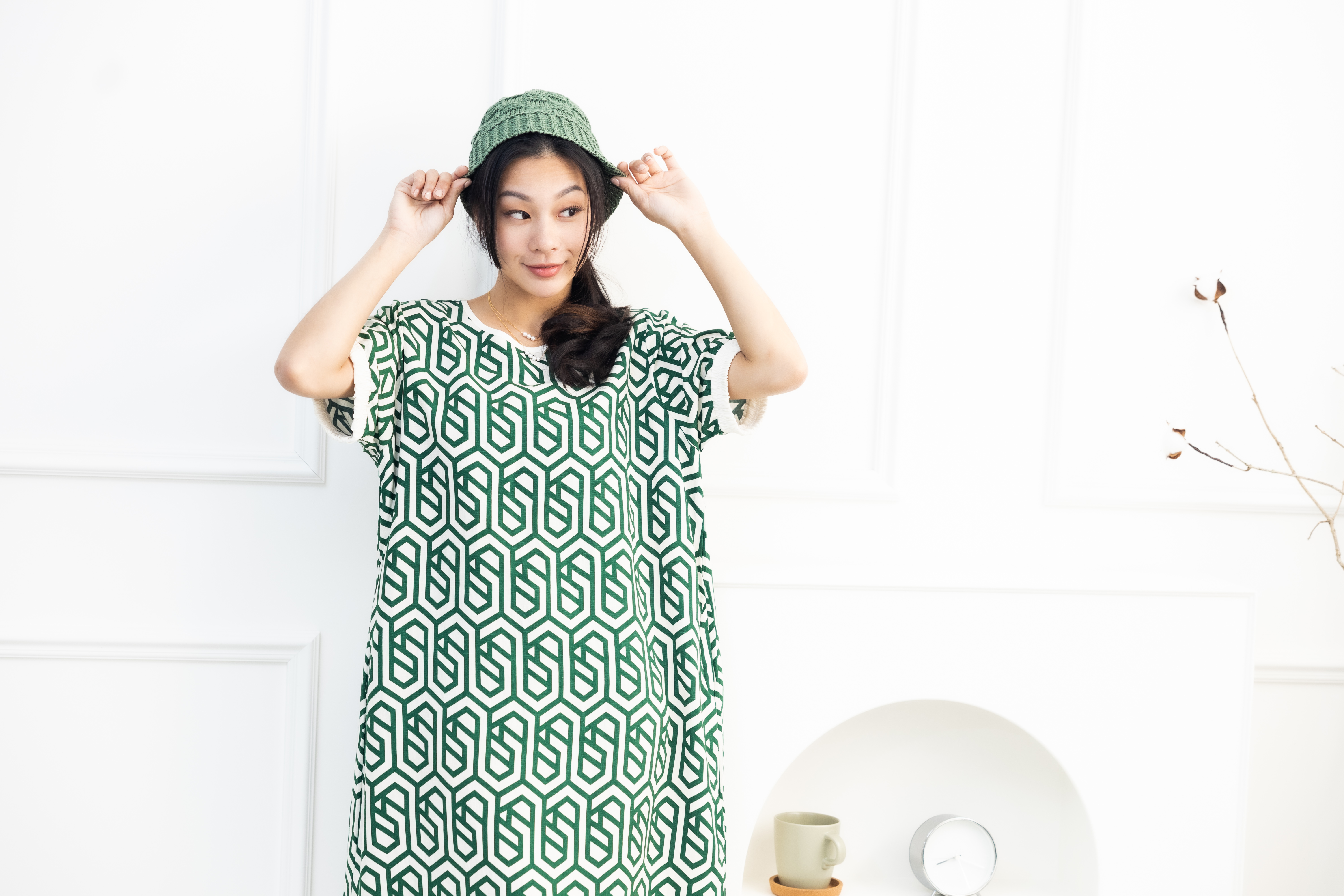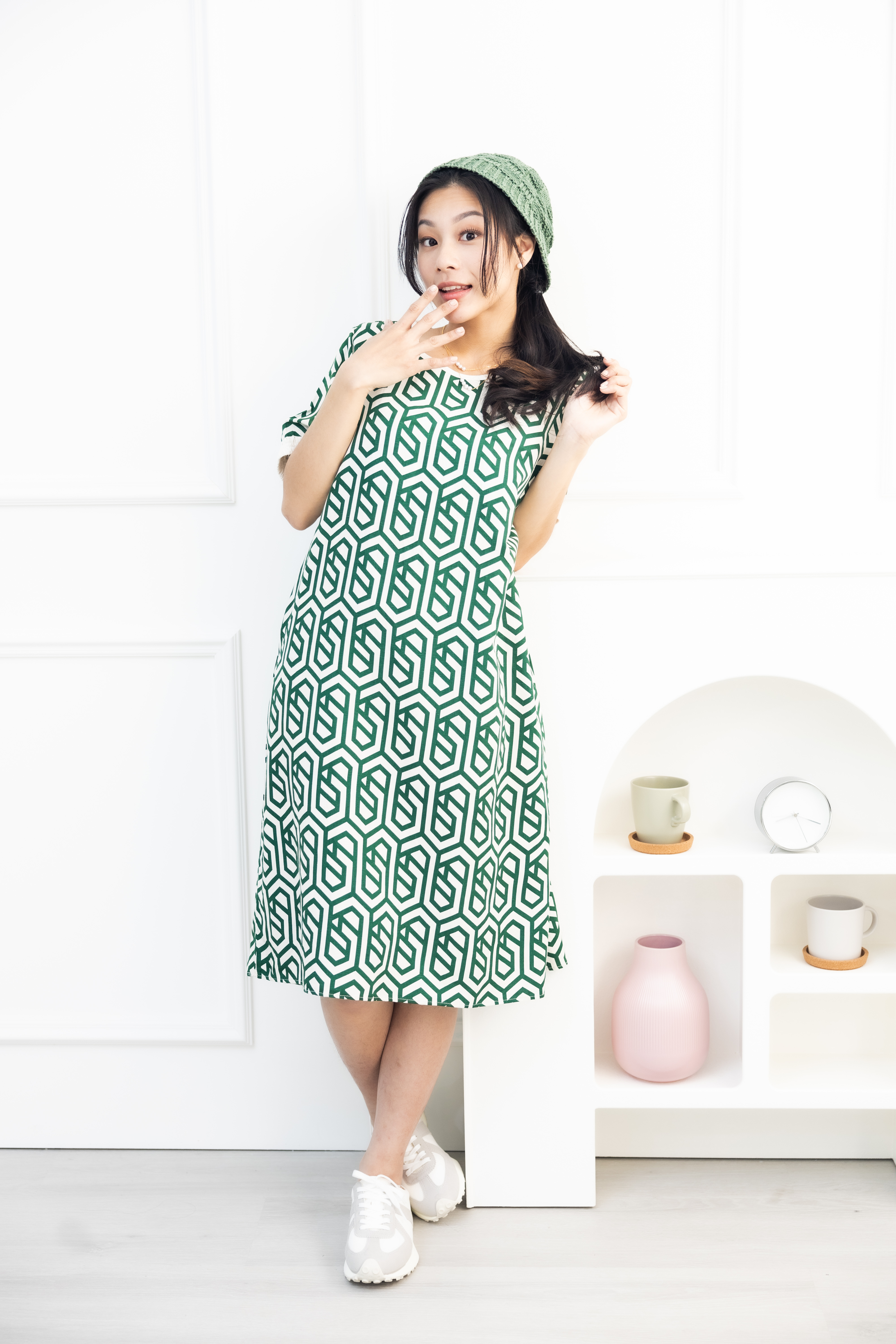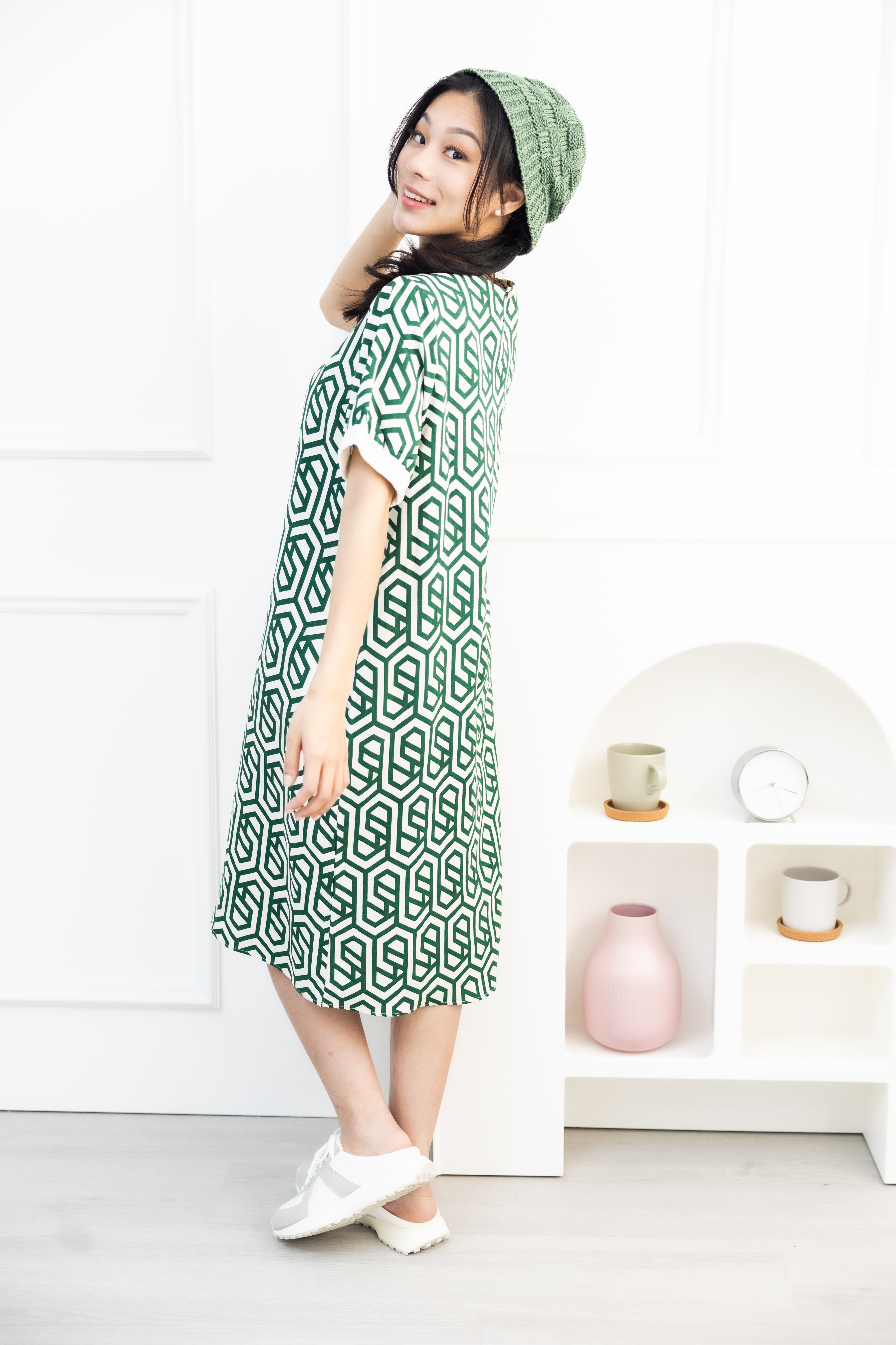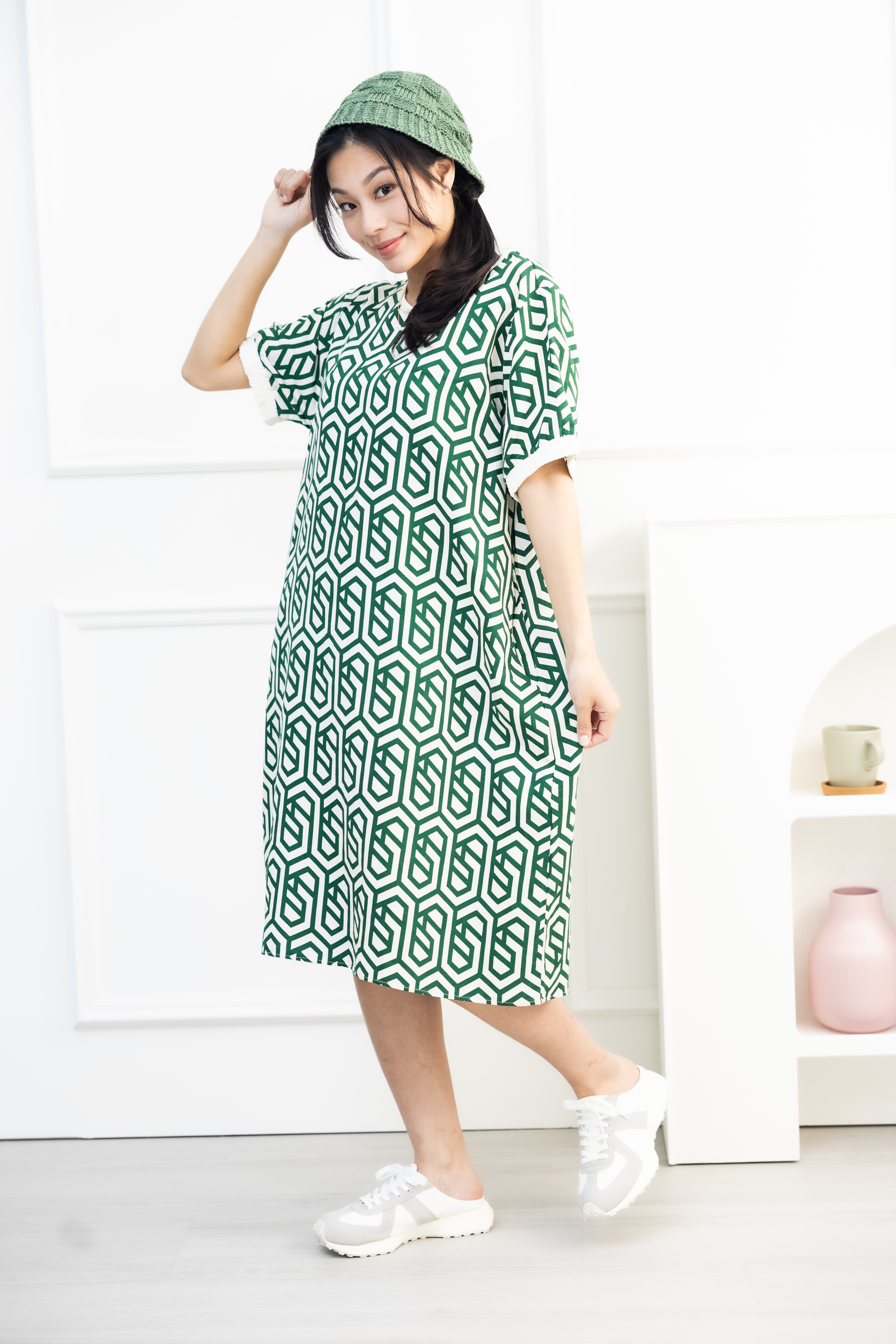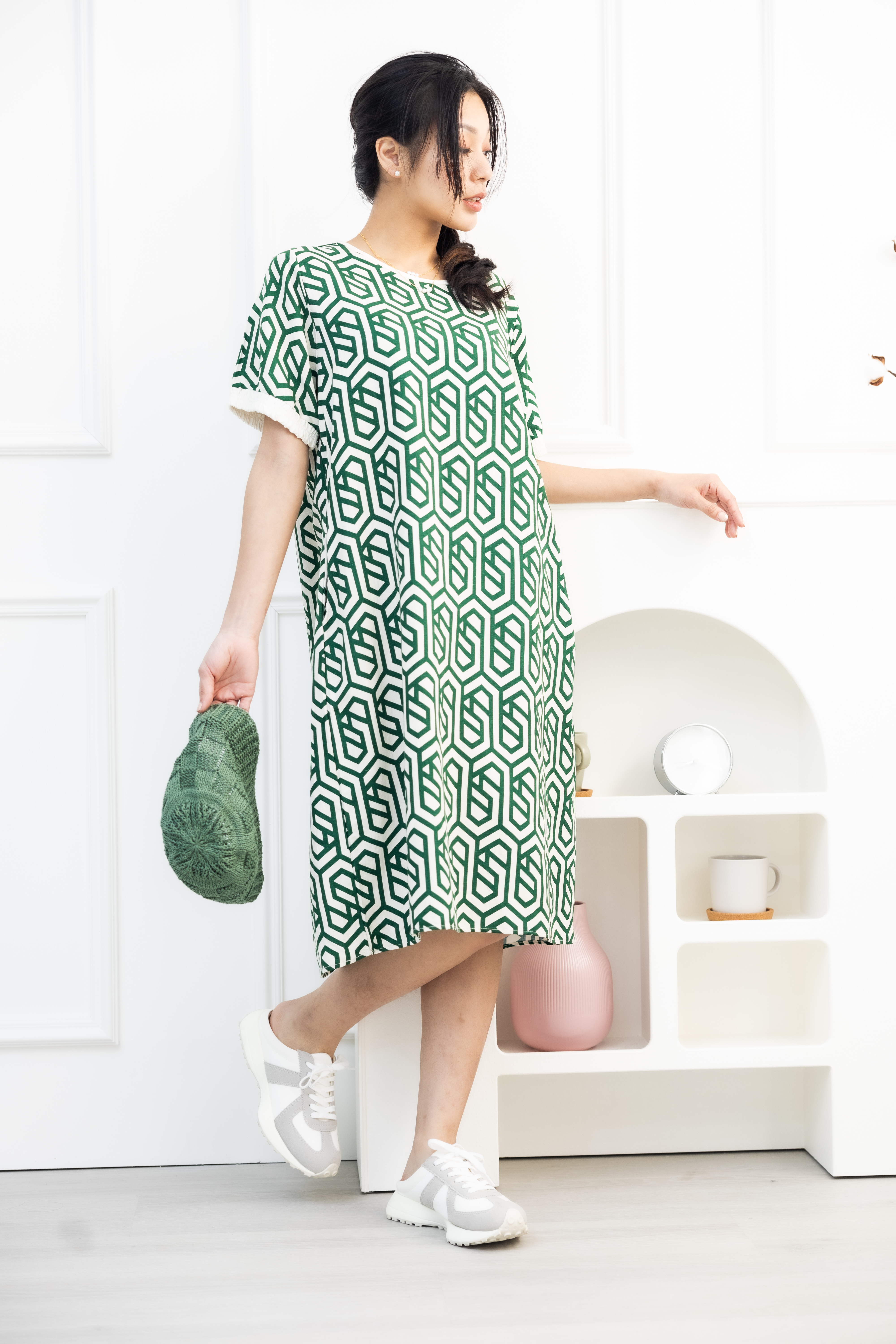 원피스 綠色盾牌線紋短袖洋裝 / 米色底