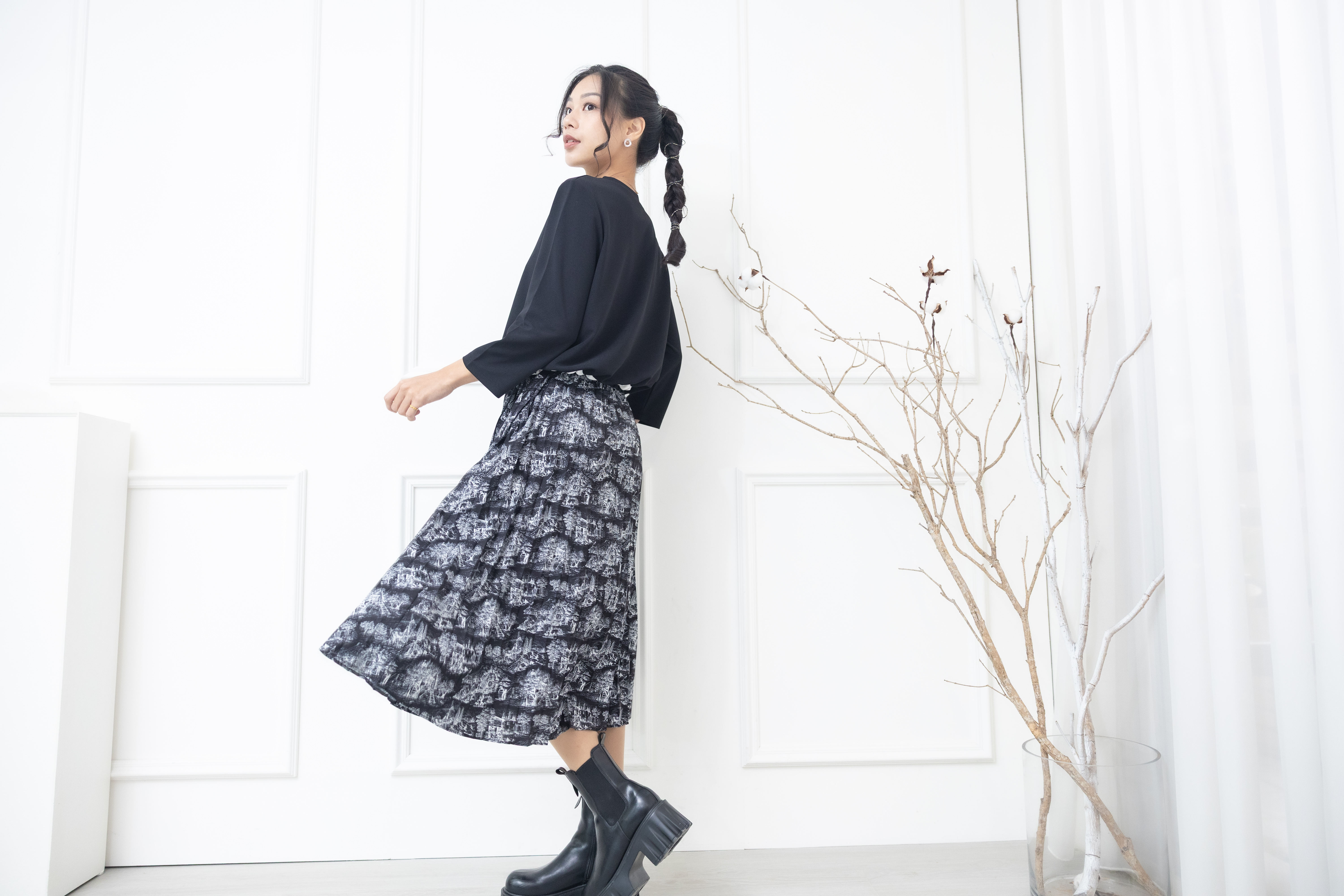 원피스 花布百褶裙擺假兩件七分袖洋裝 / 黑色
