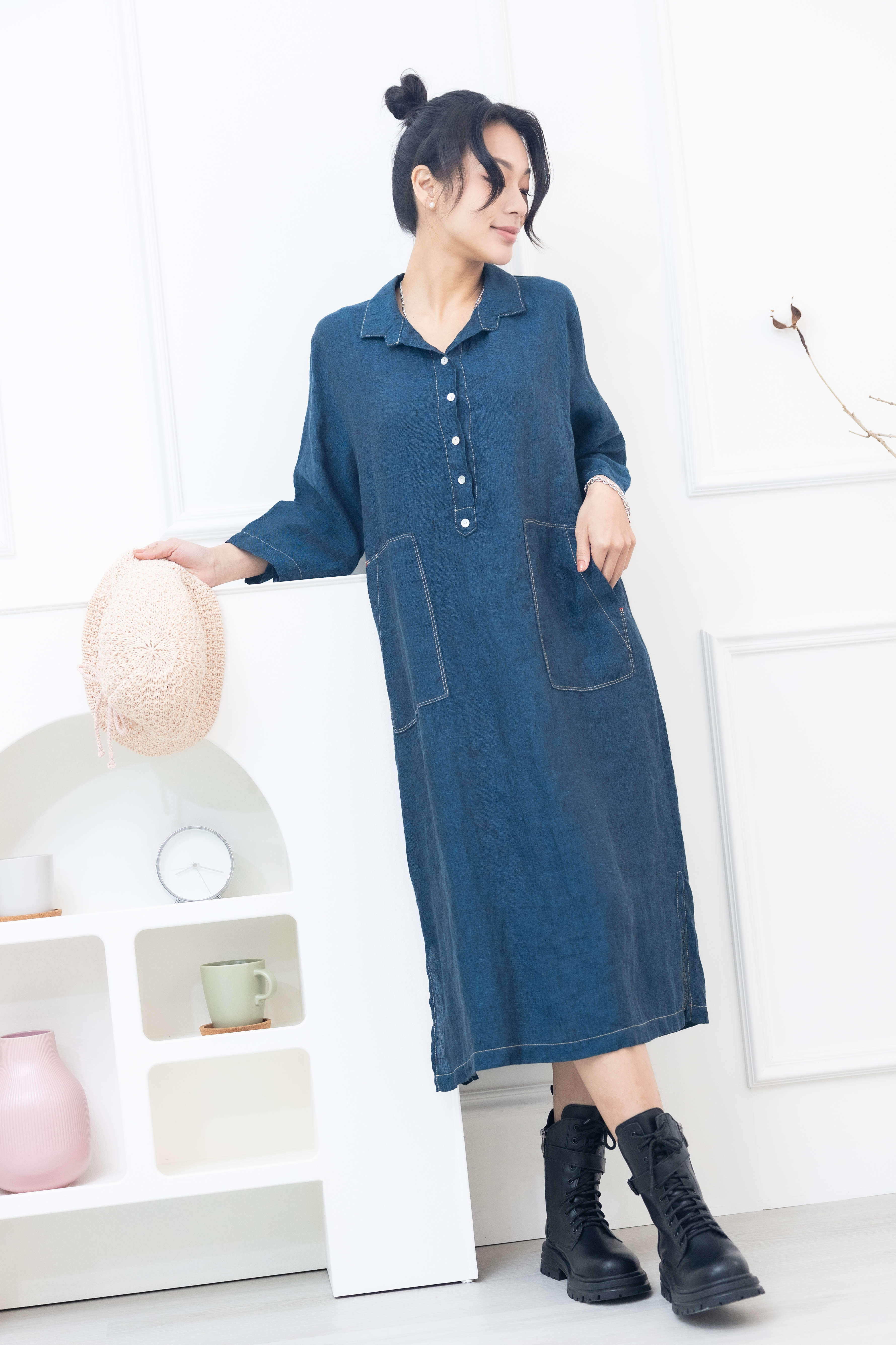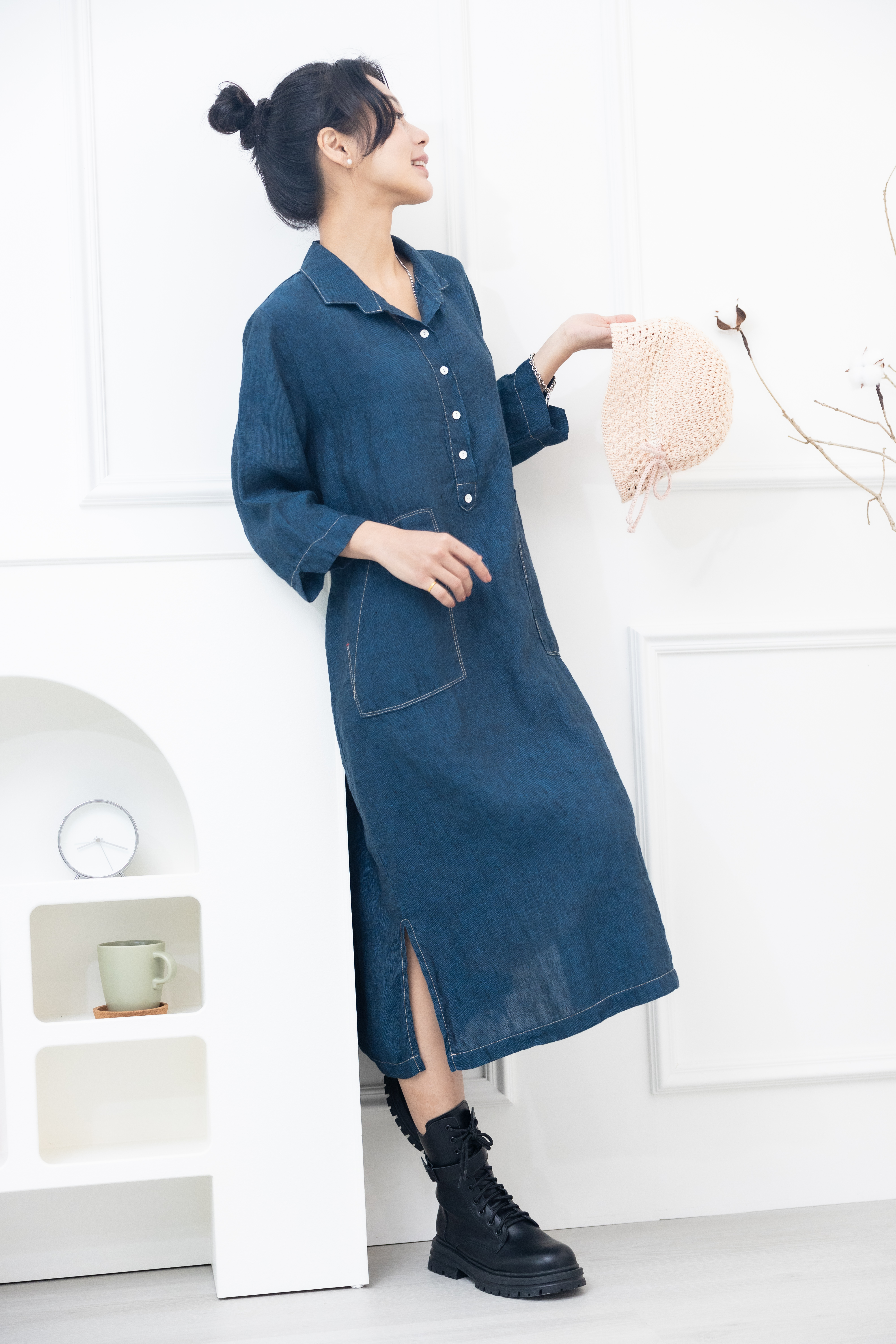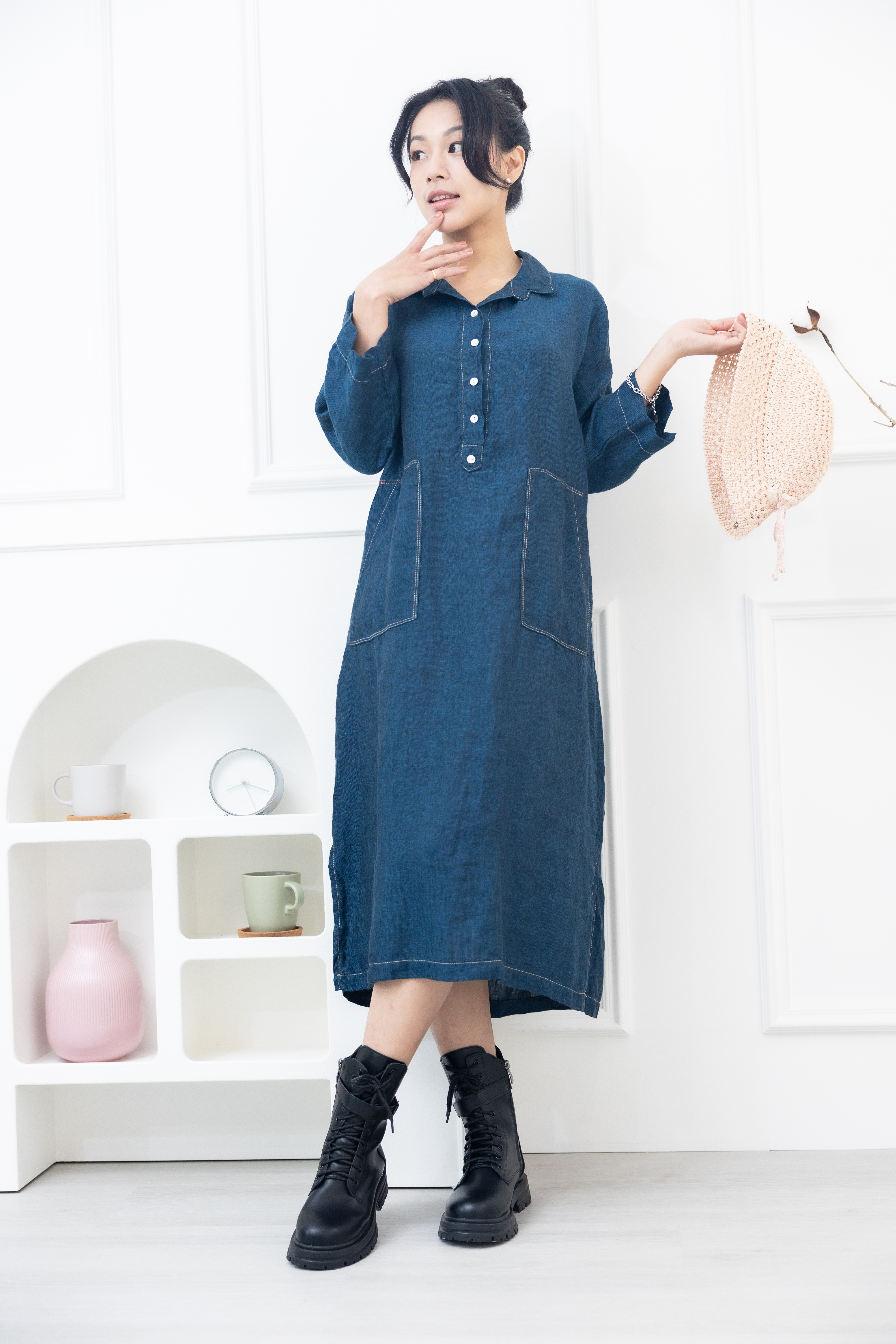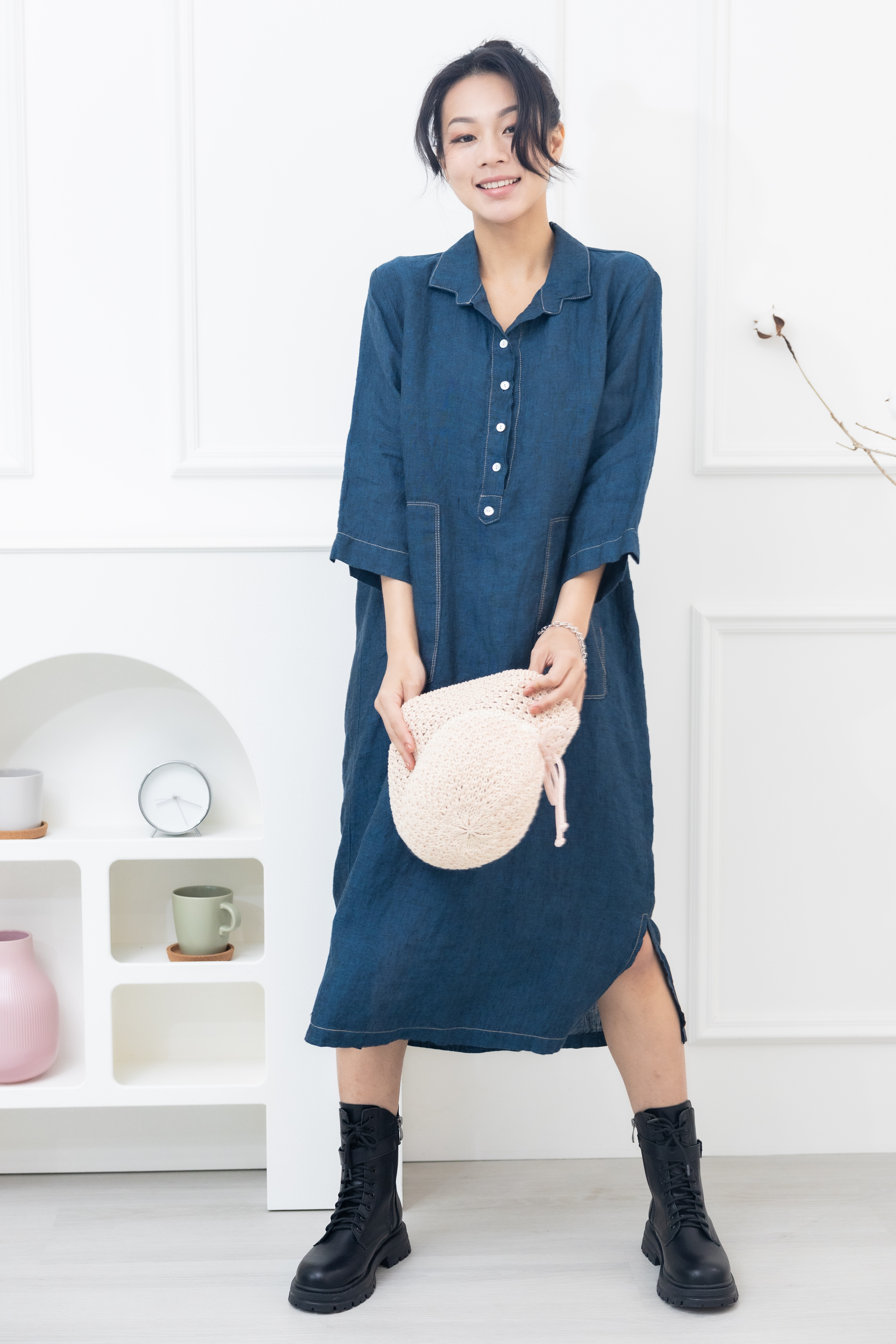 원피스 襯衫領大口袋棉麻洋裝 / 深藍色