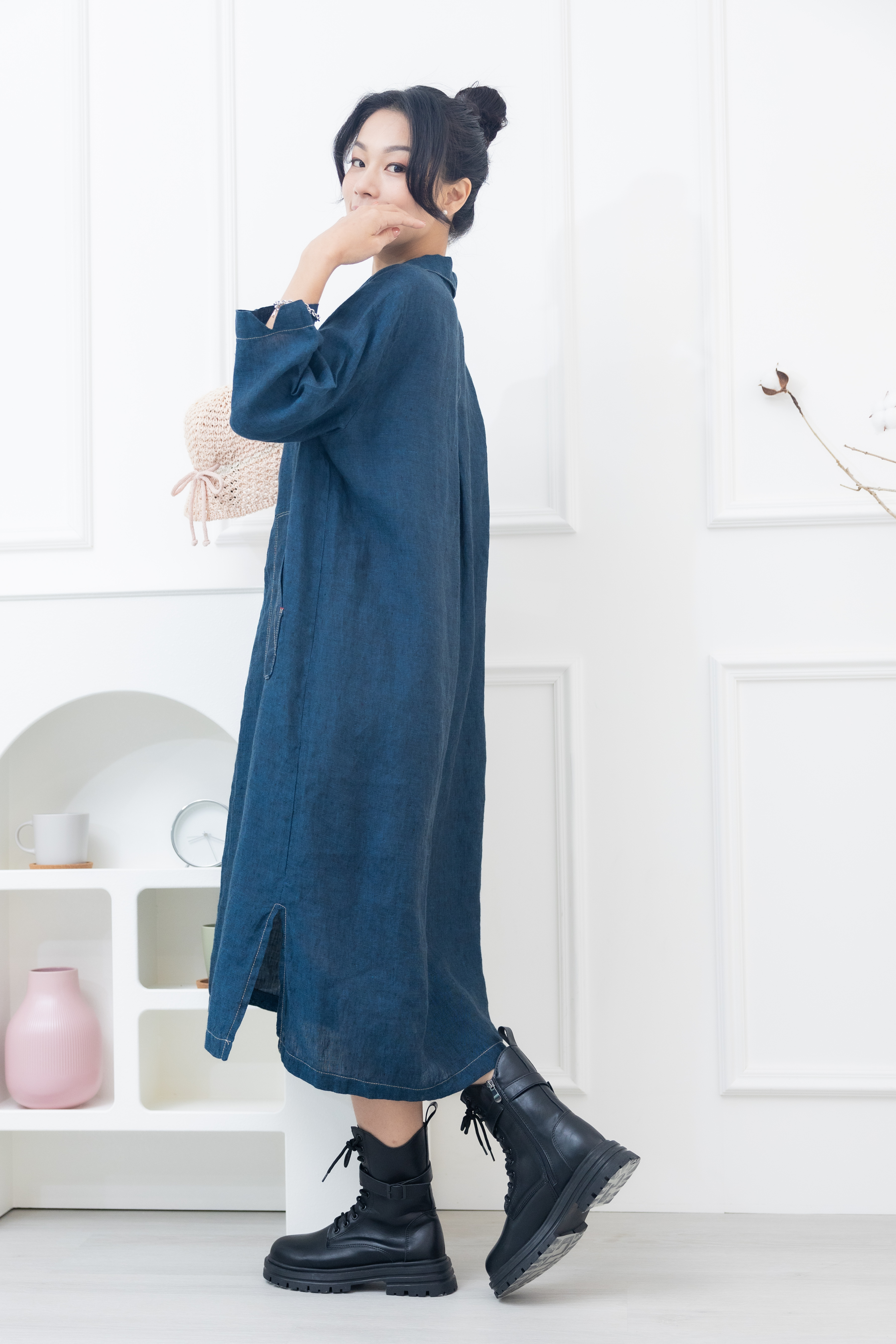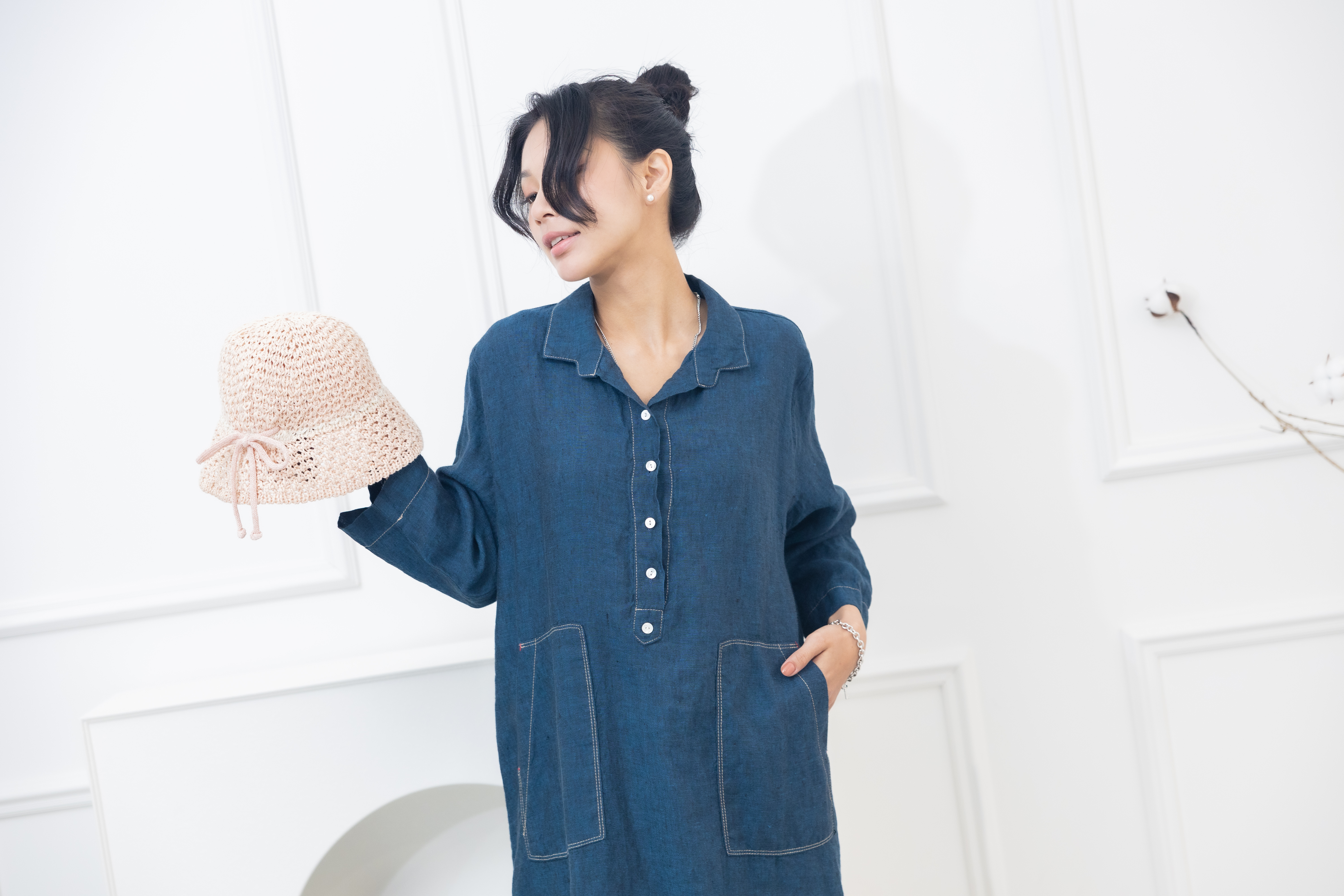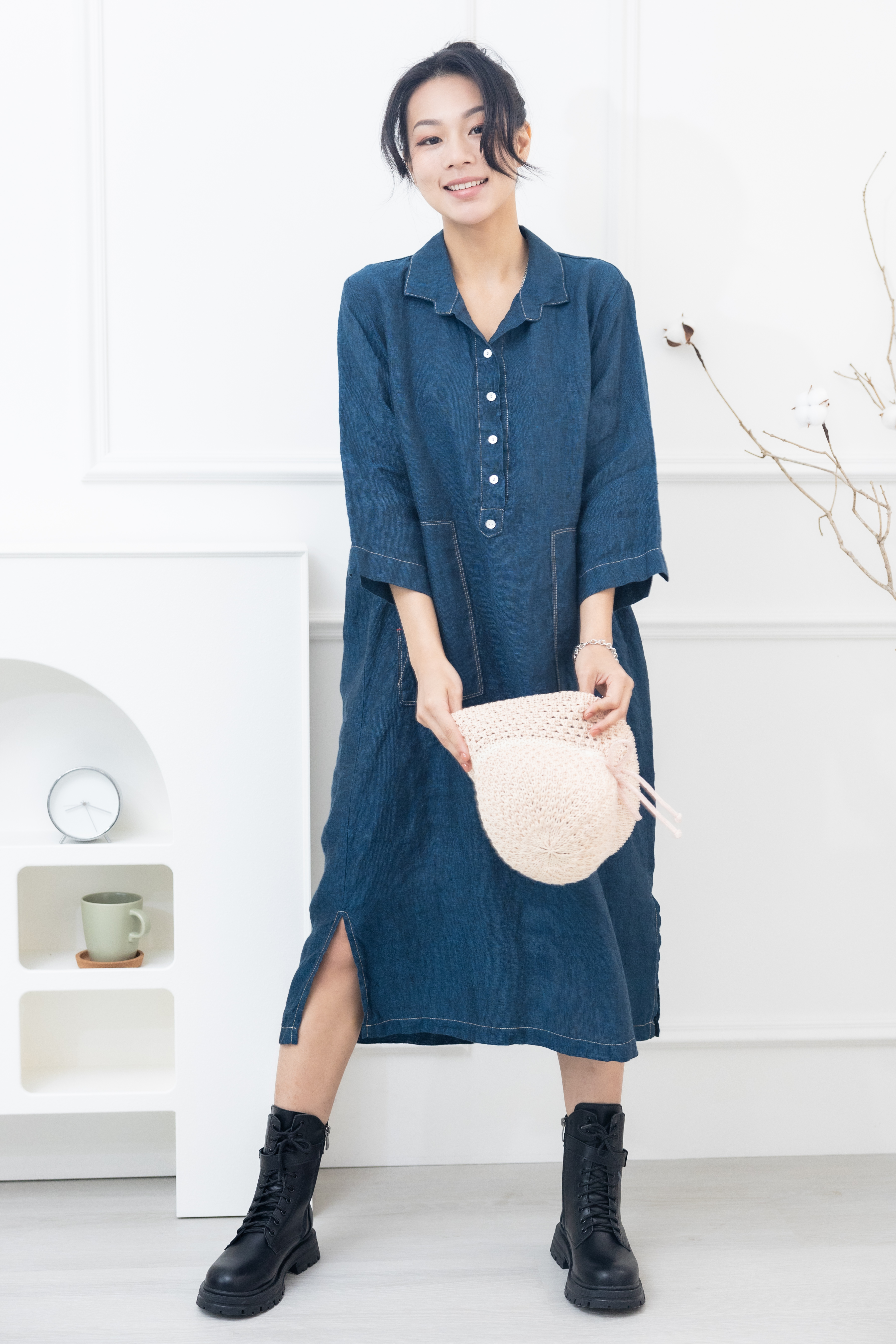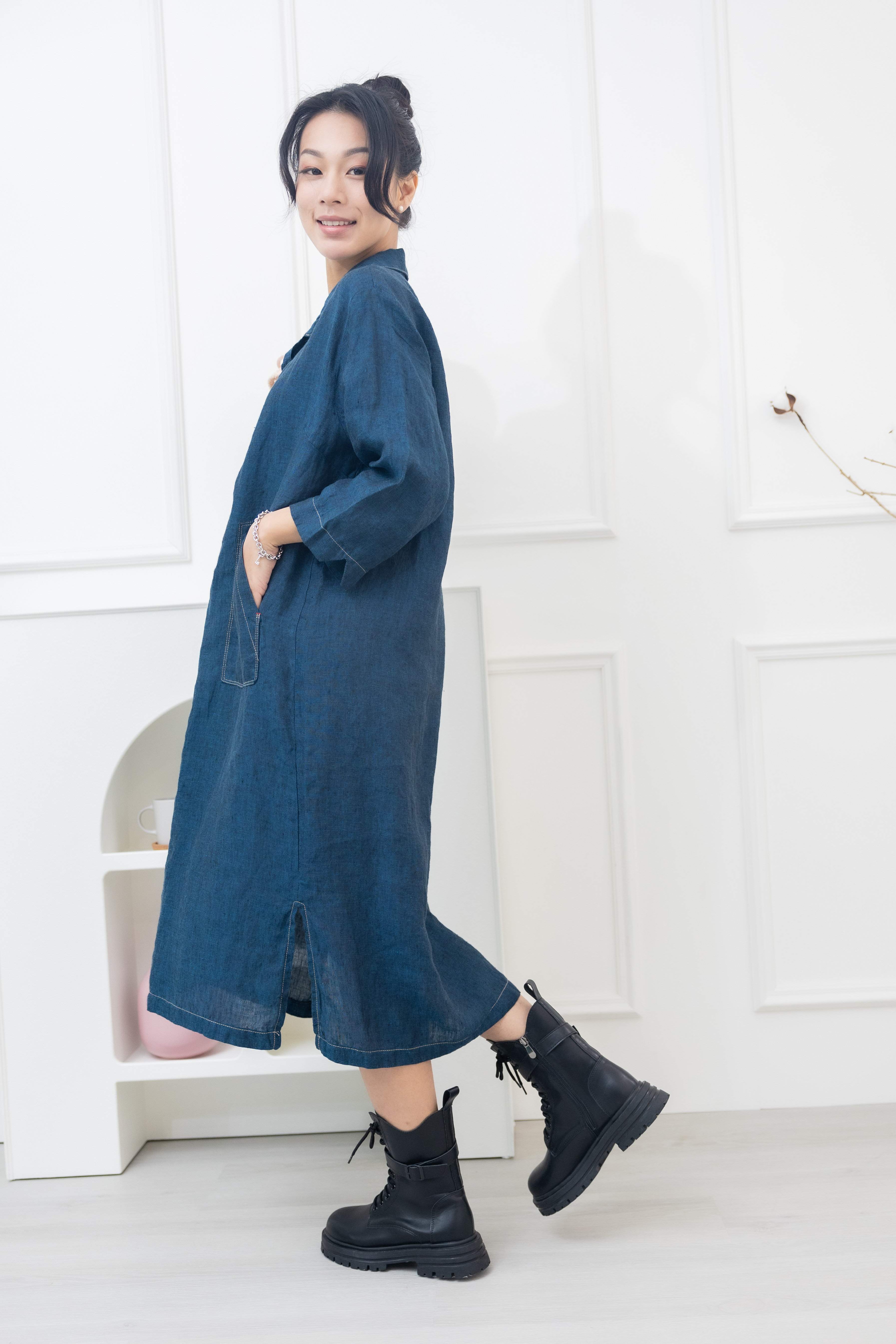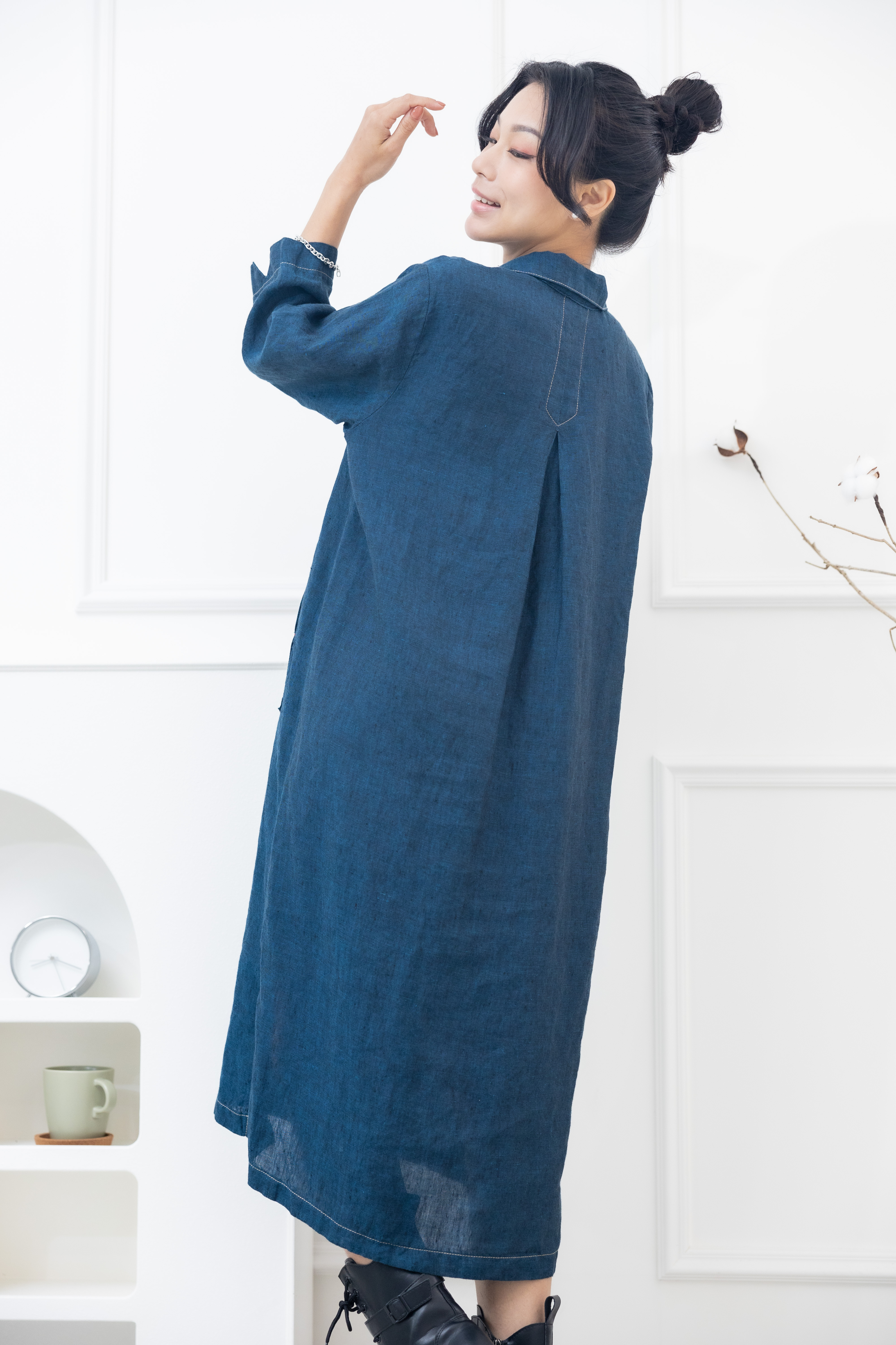 원피스 襯衫領大口袋棉麻洋裝 / 深藍色