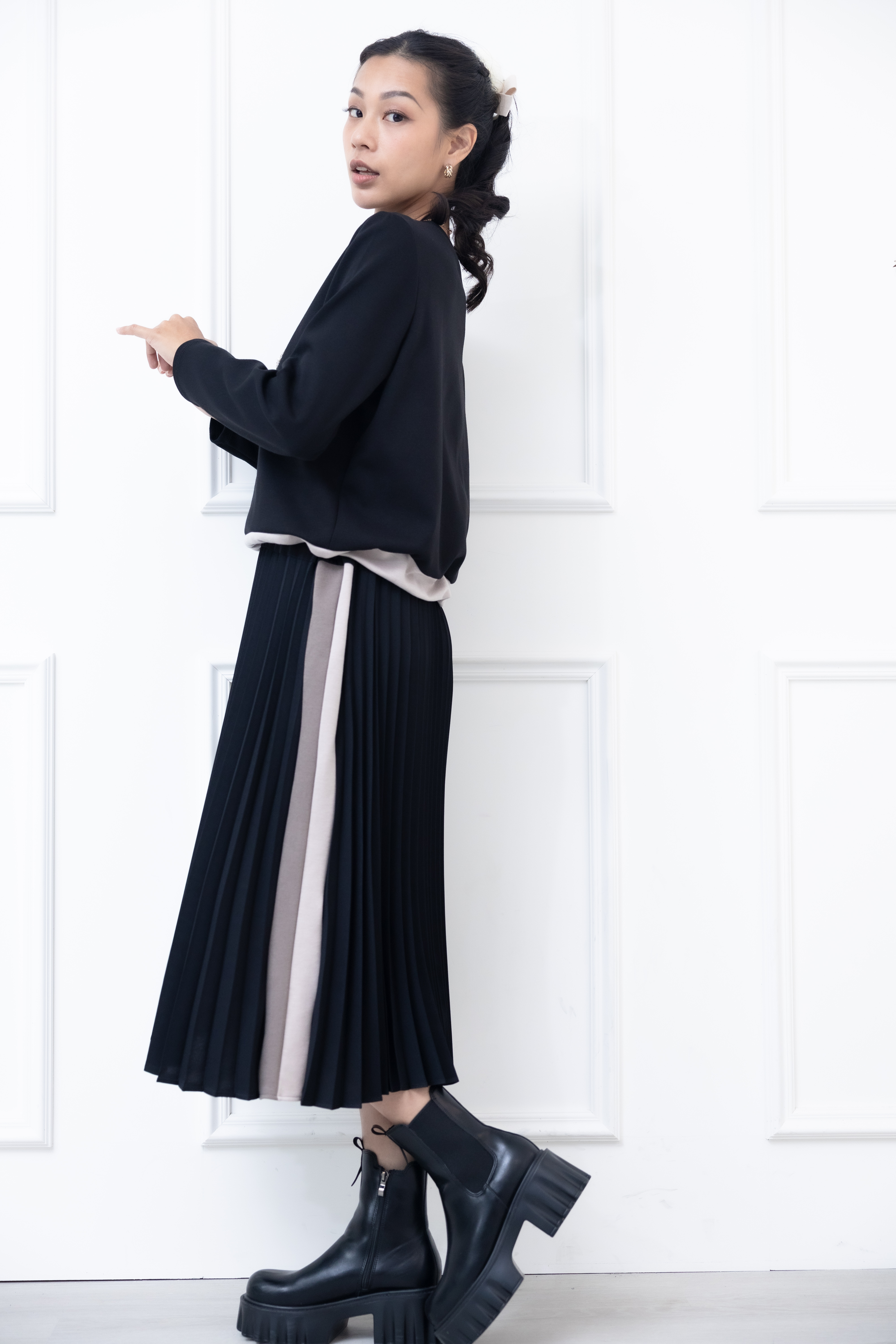 원피스 黑上衣杏下擺黑色百褶裙假二件長洋裝