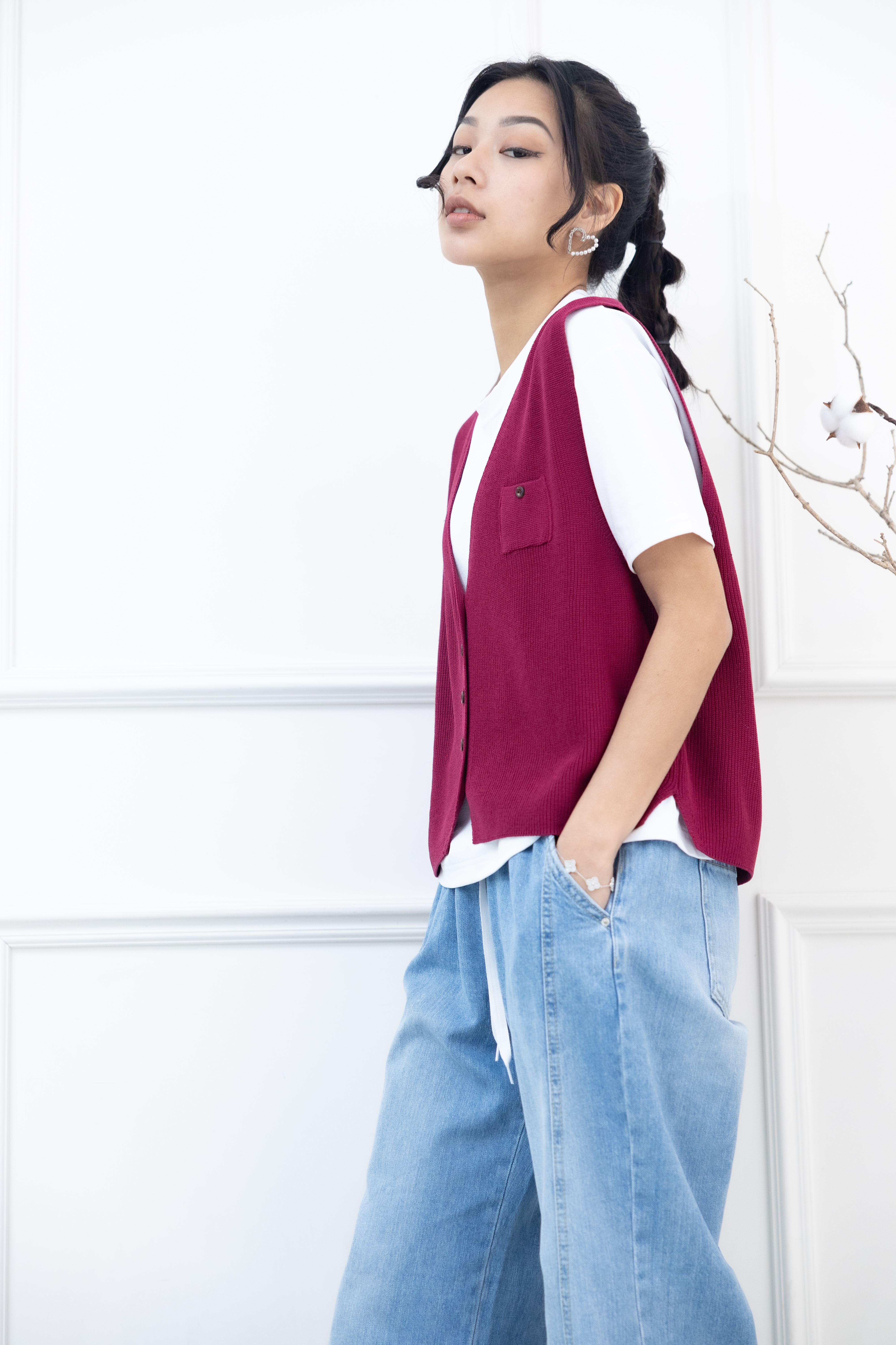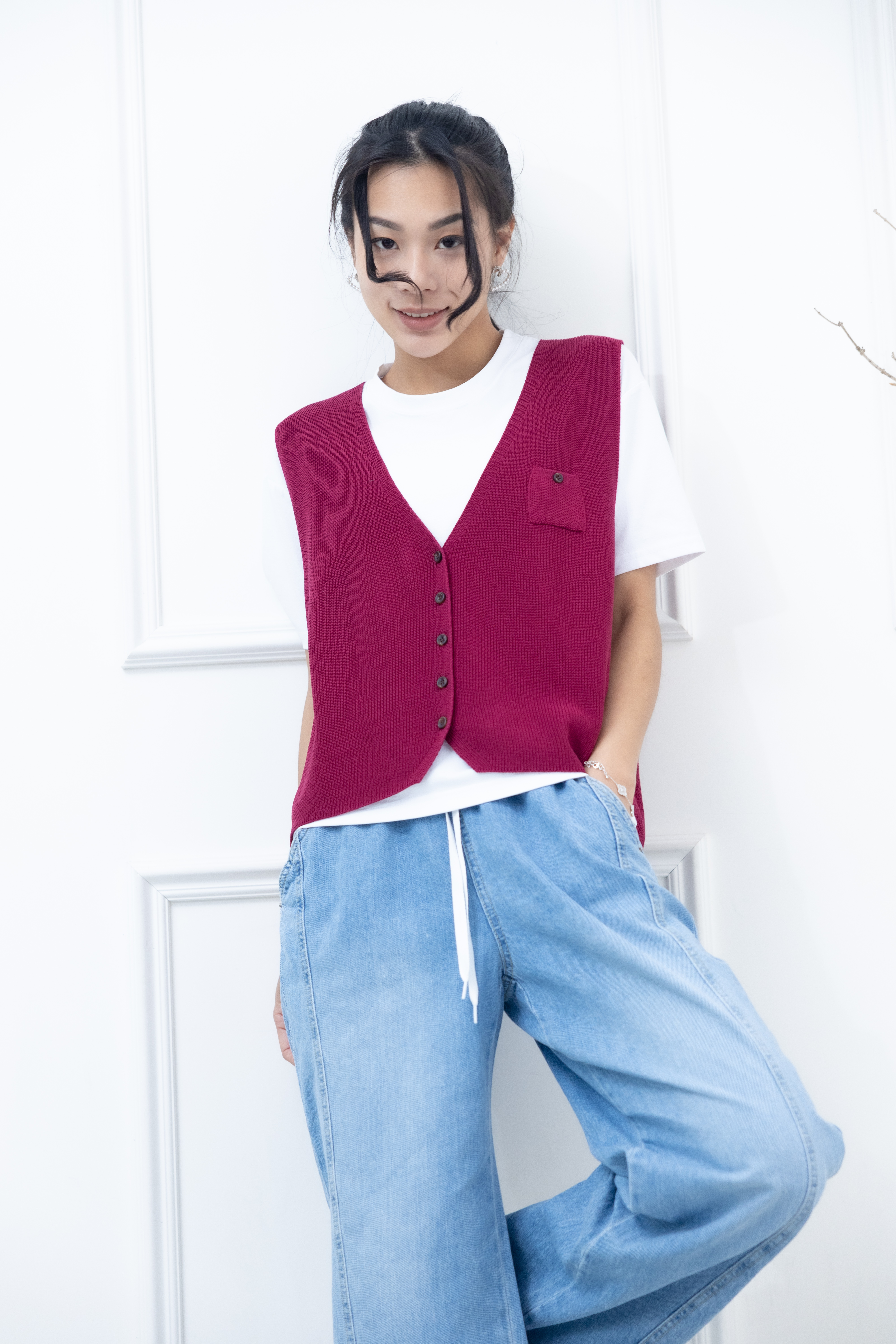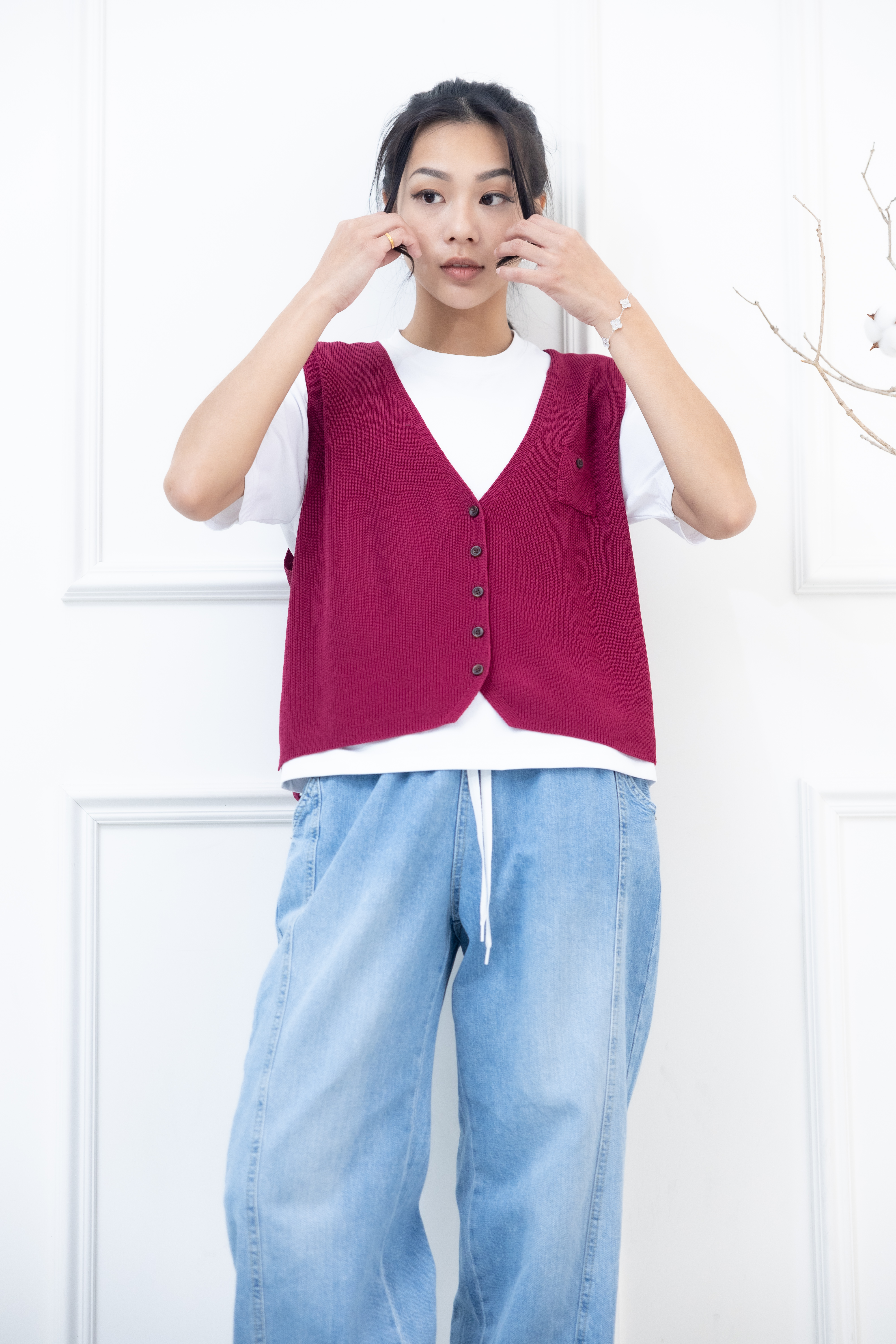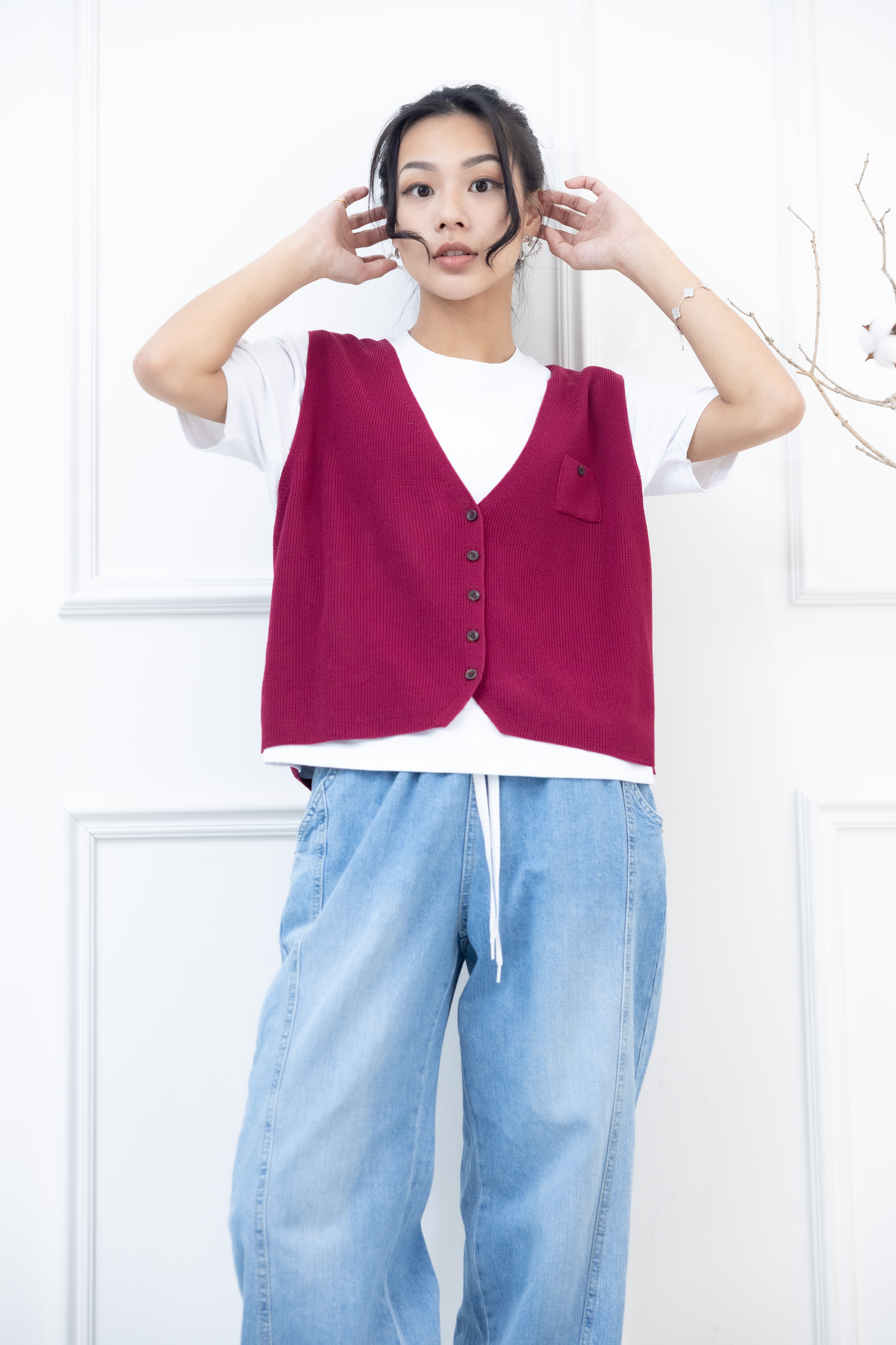 조끼 小口袋全開襟針織背心 / 暗粉色