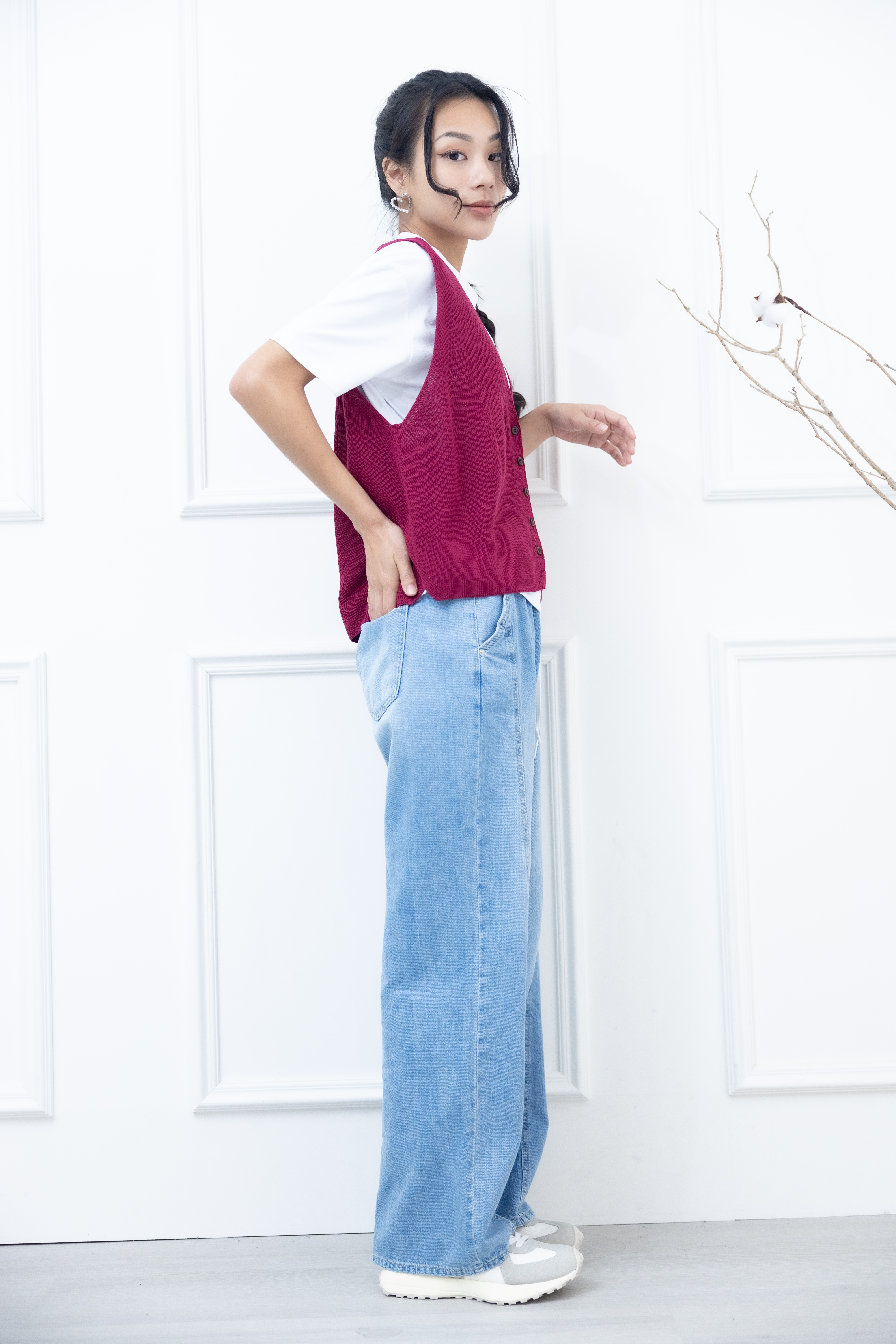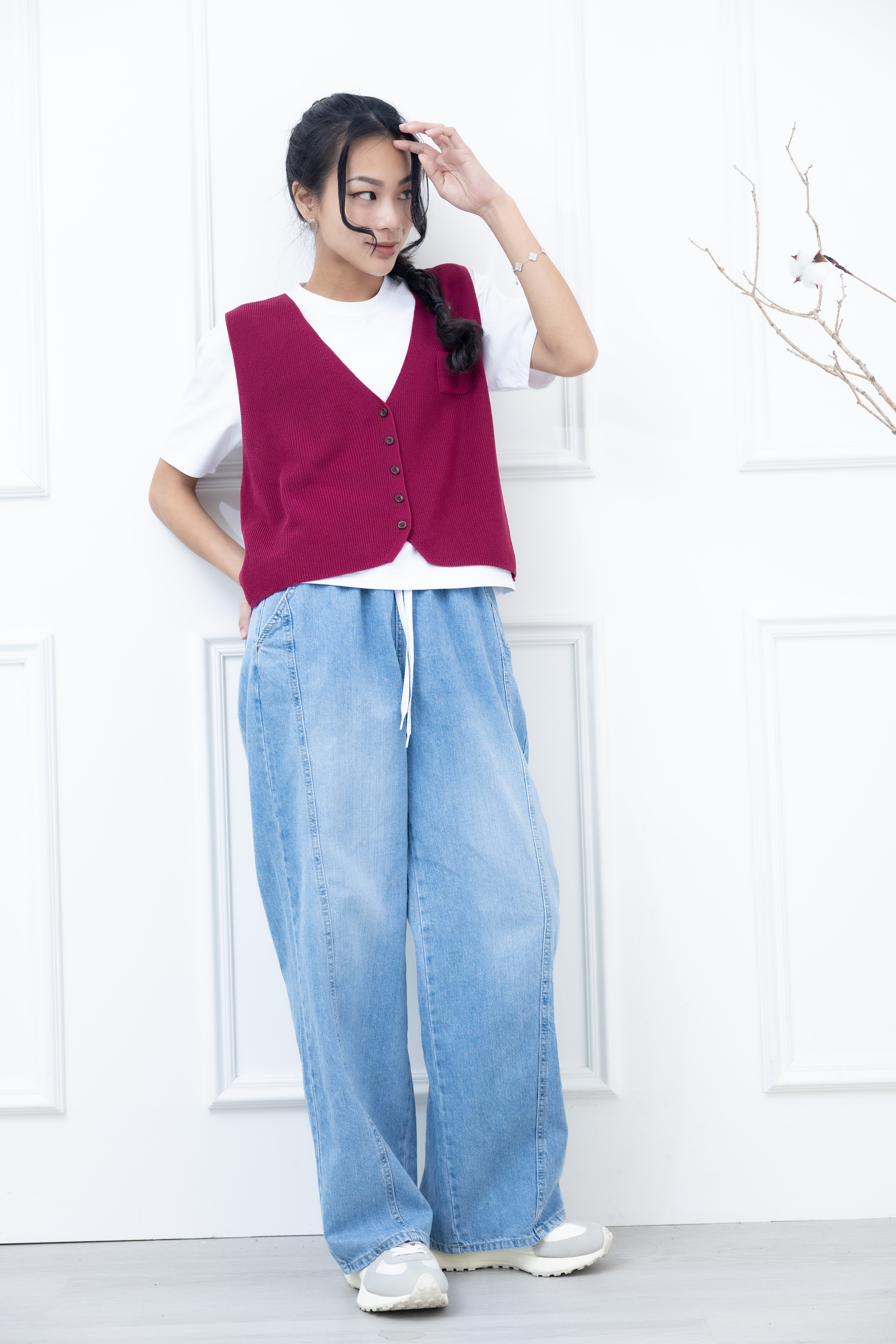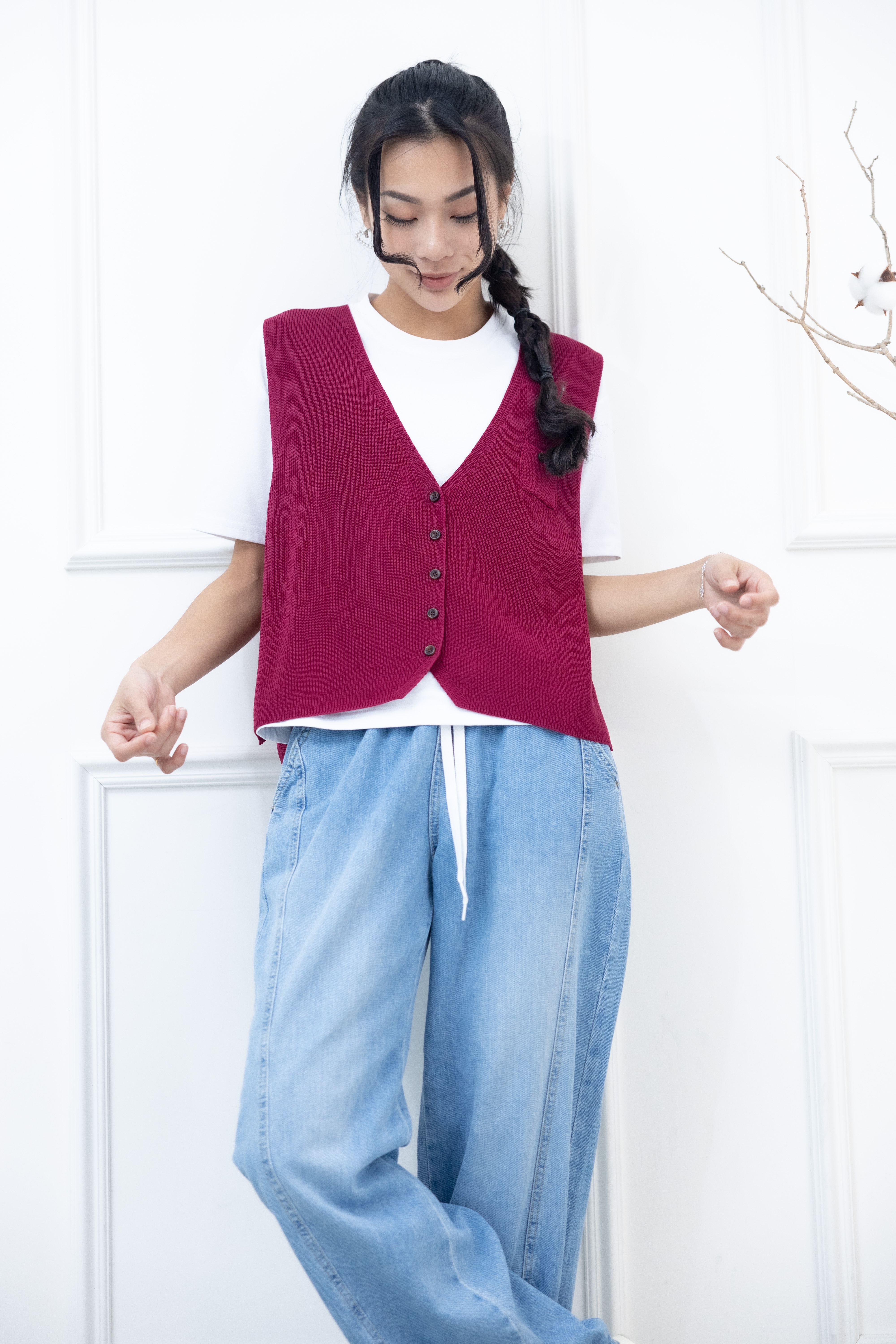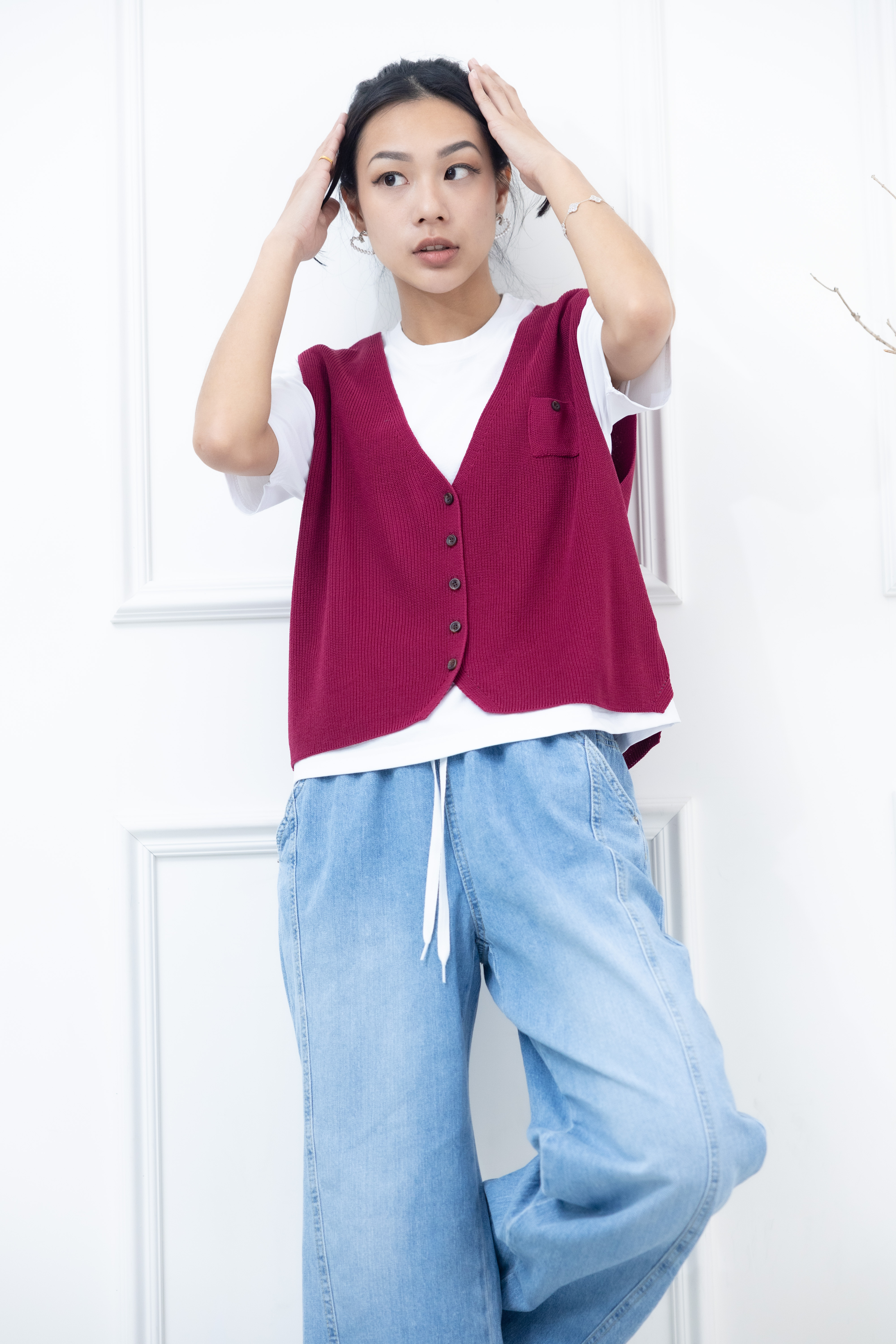 조끼 小口袋全開襟針織背心 / 暗粉色