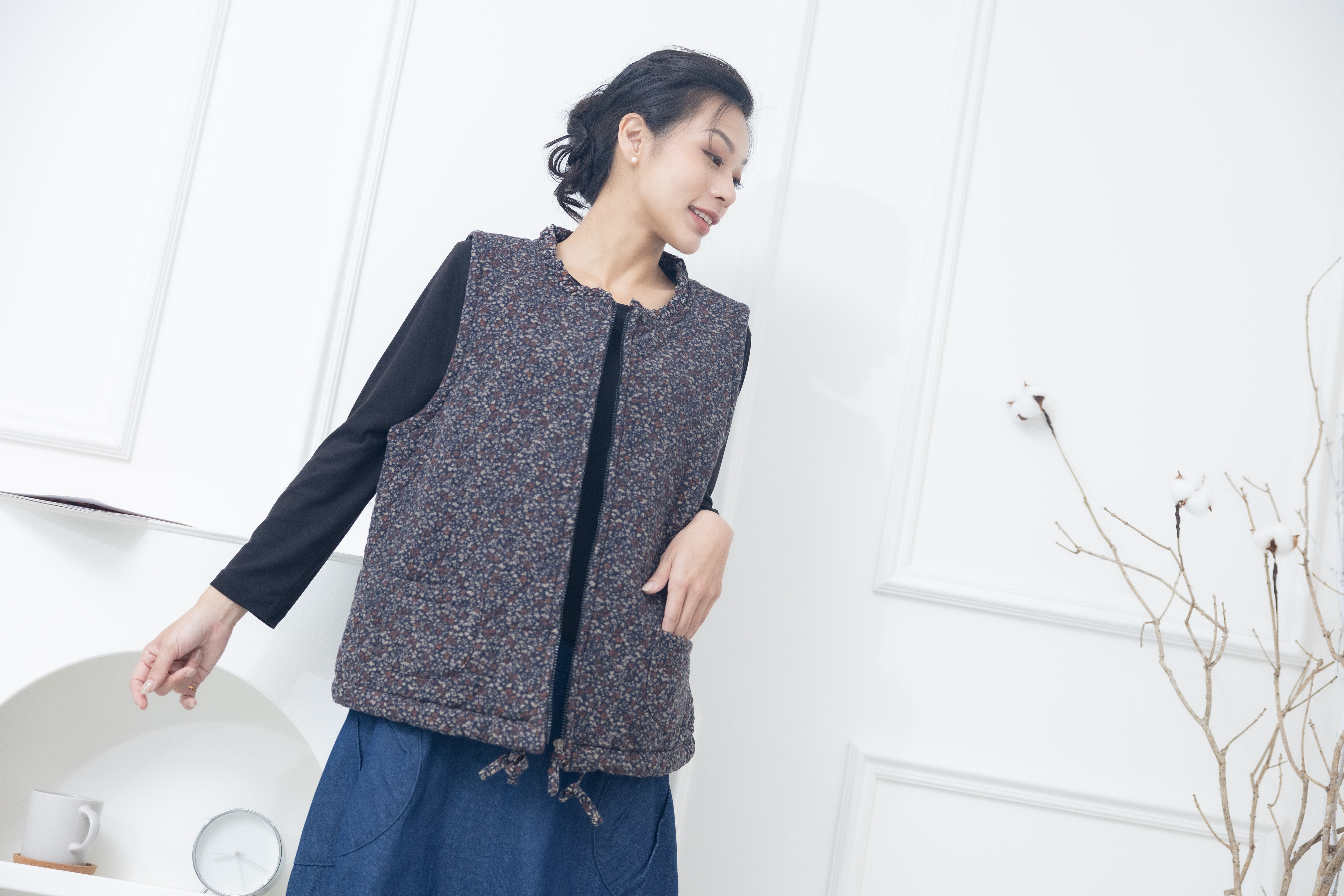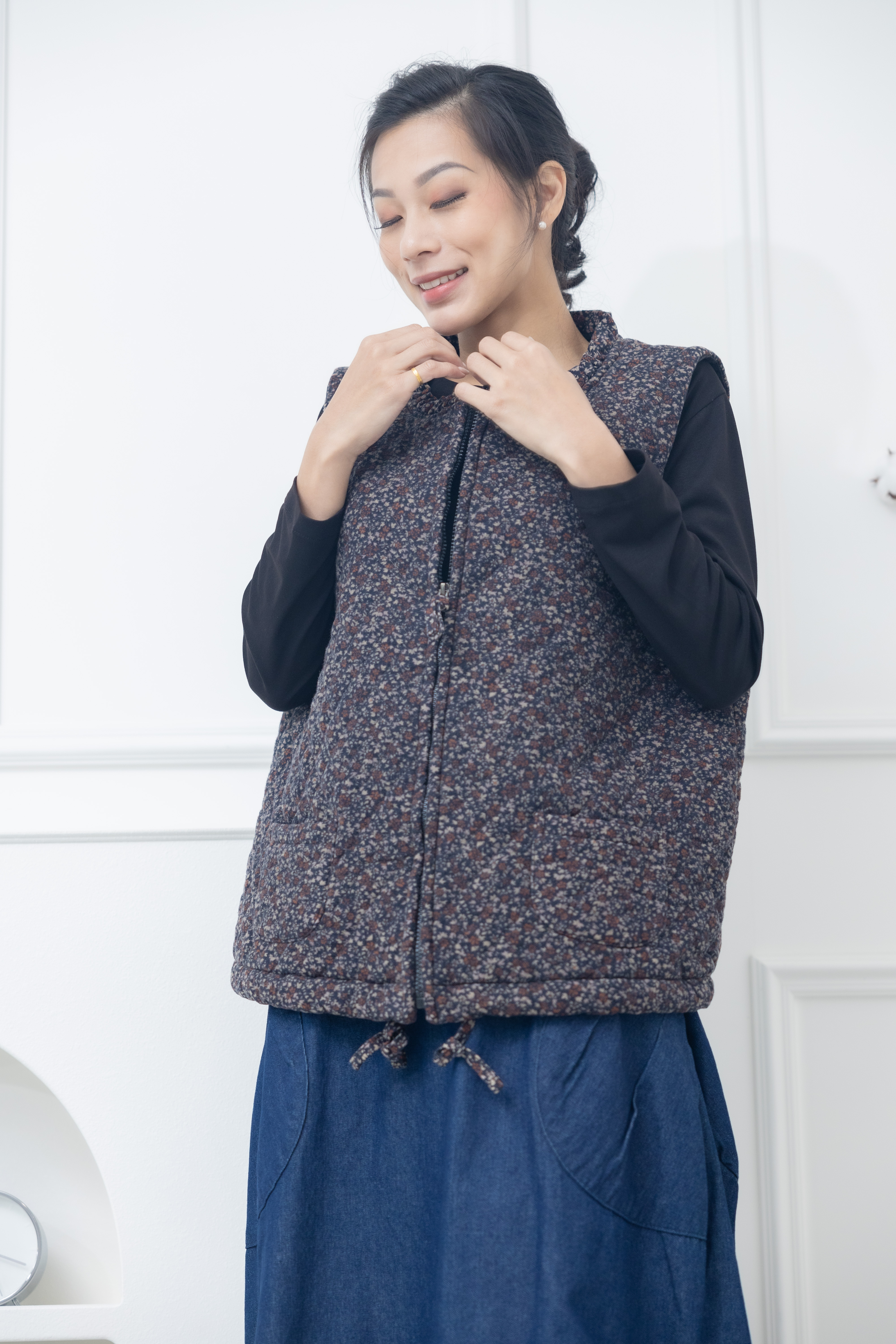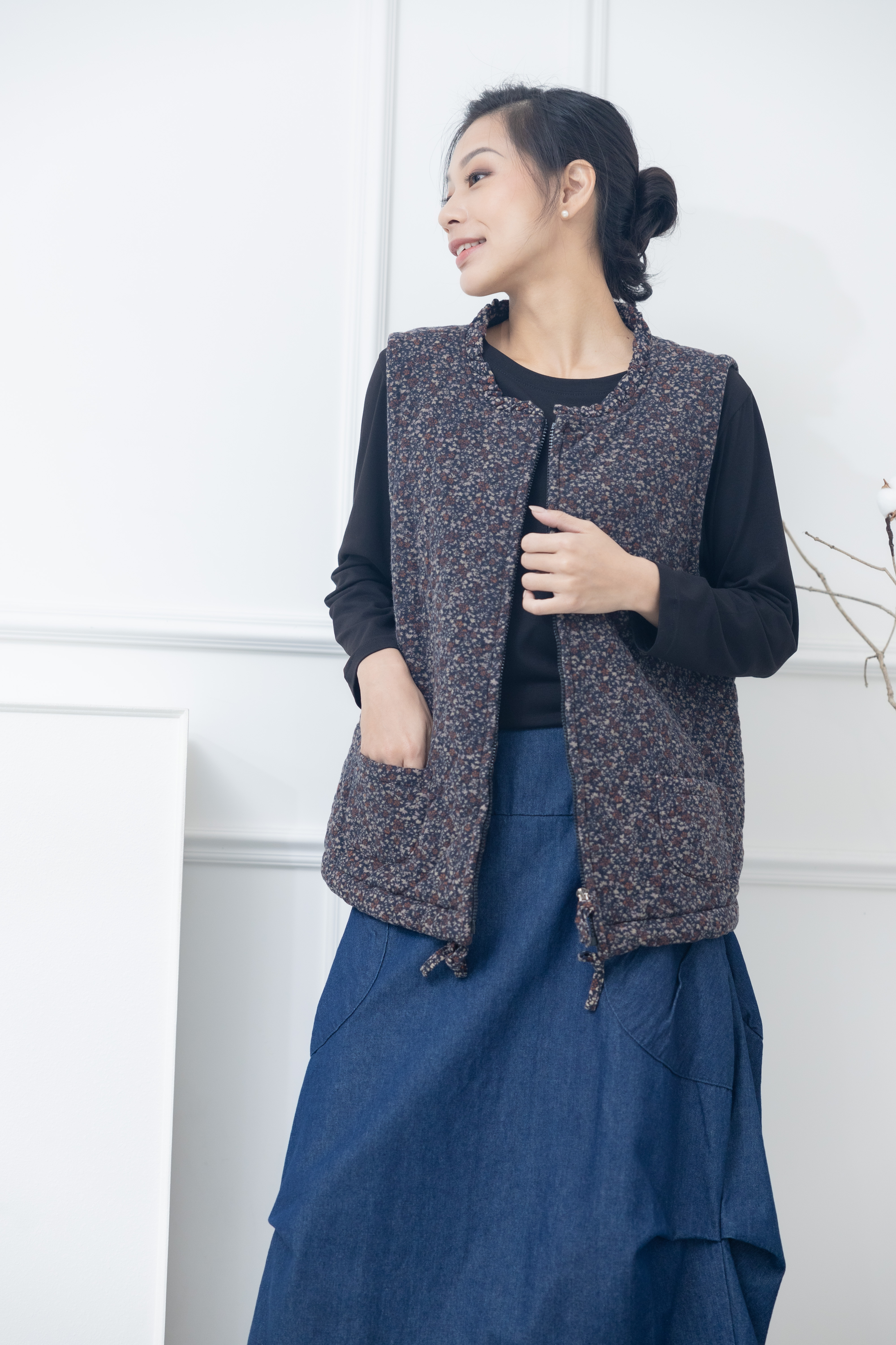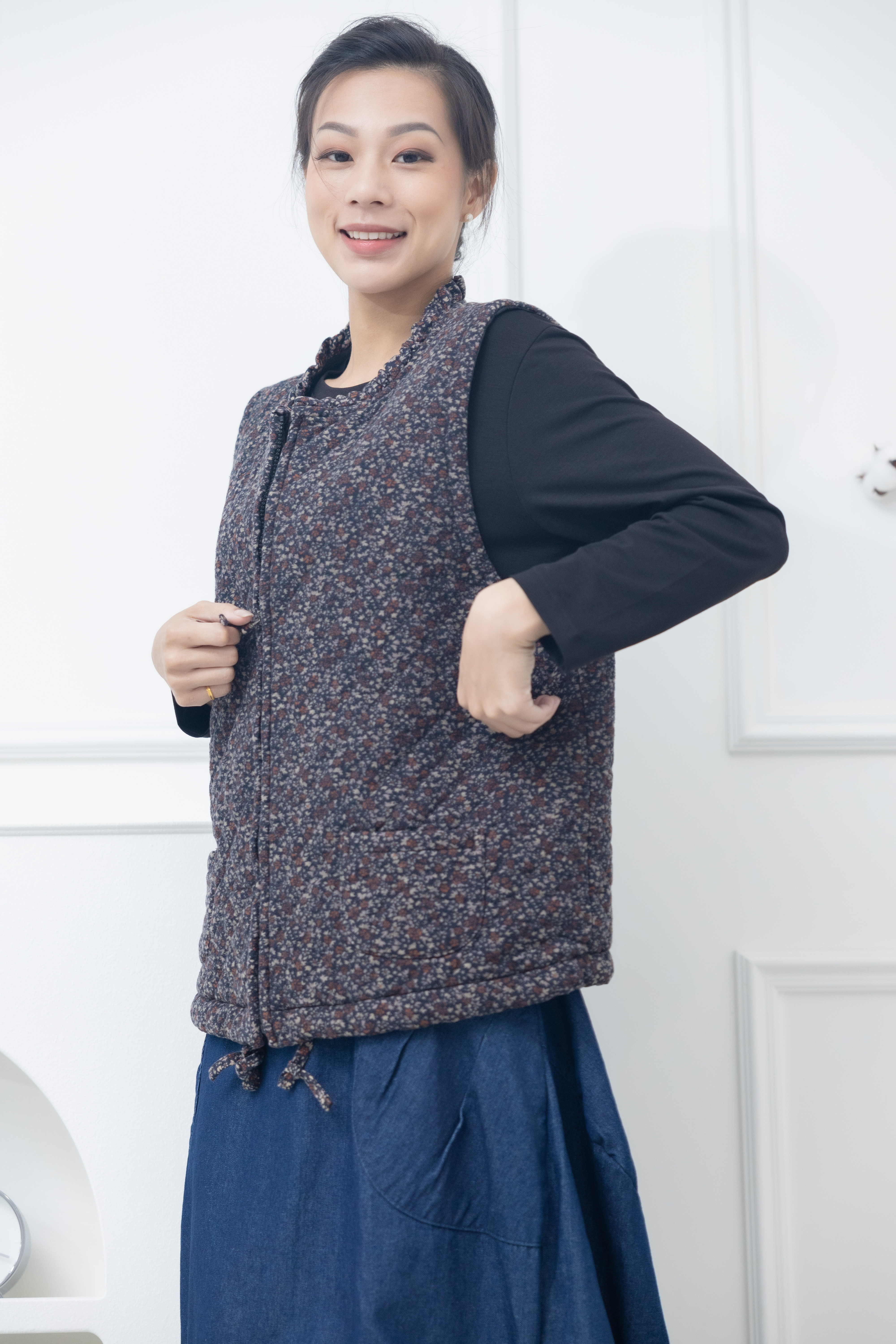 조끼 紅色小花下擺抽繩背心 / 藍色