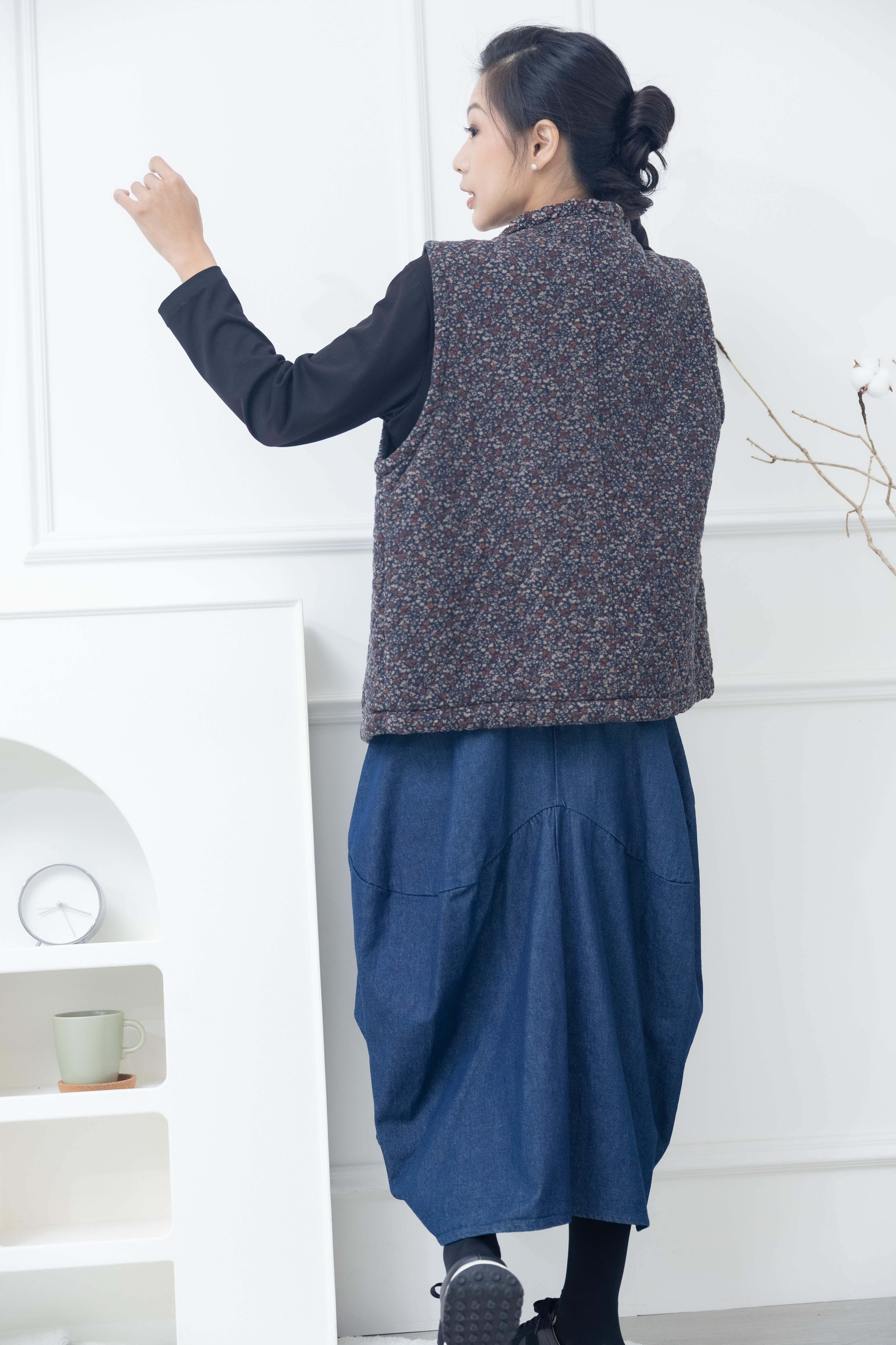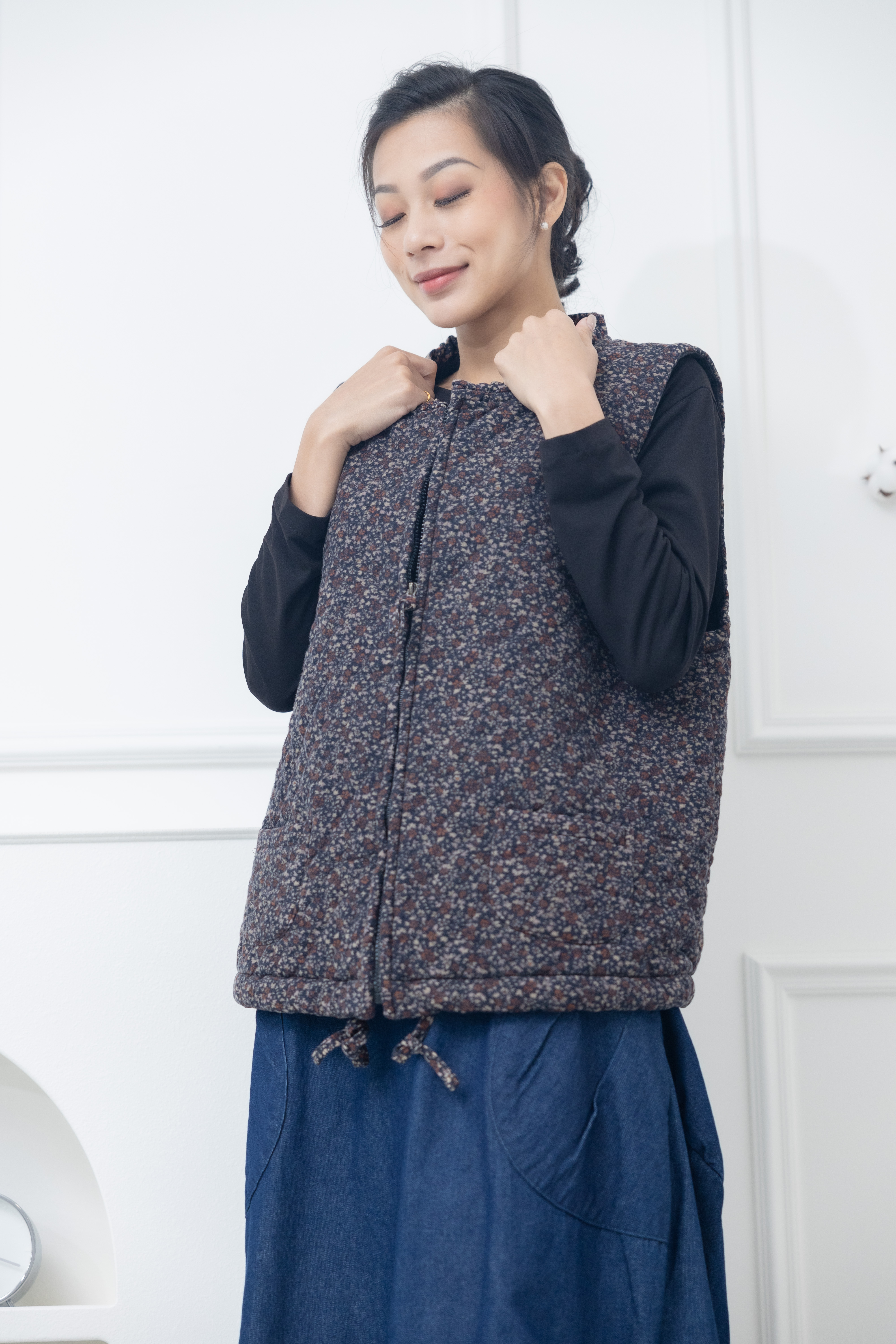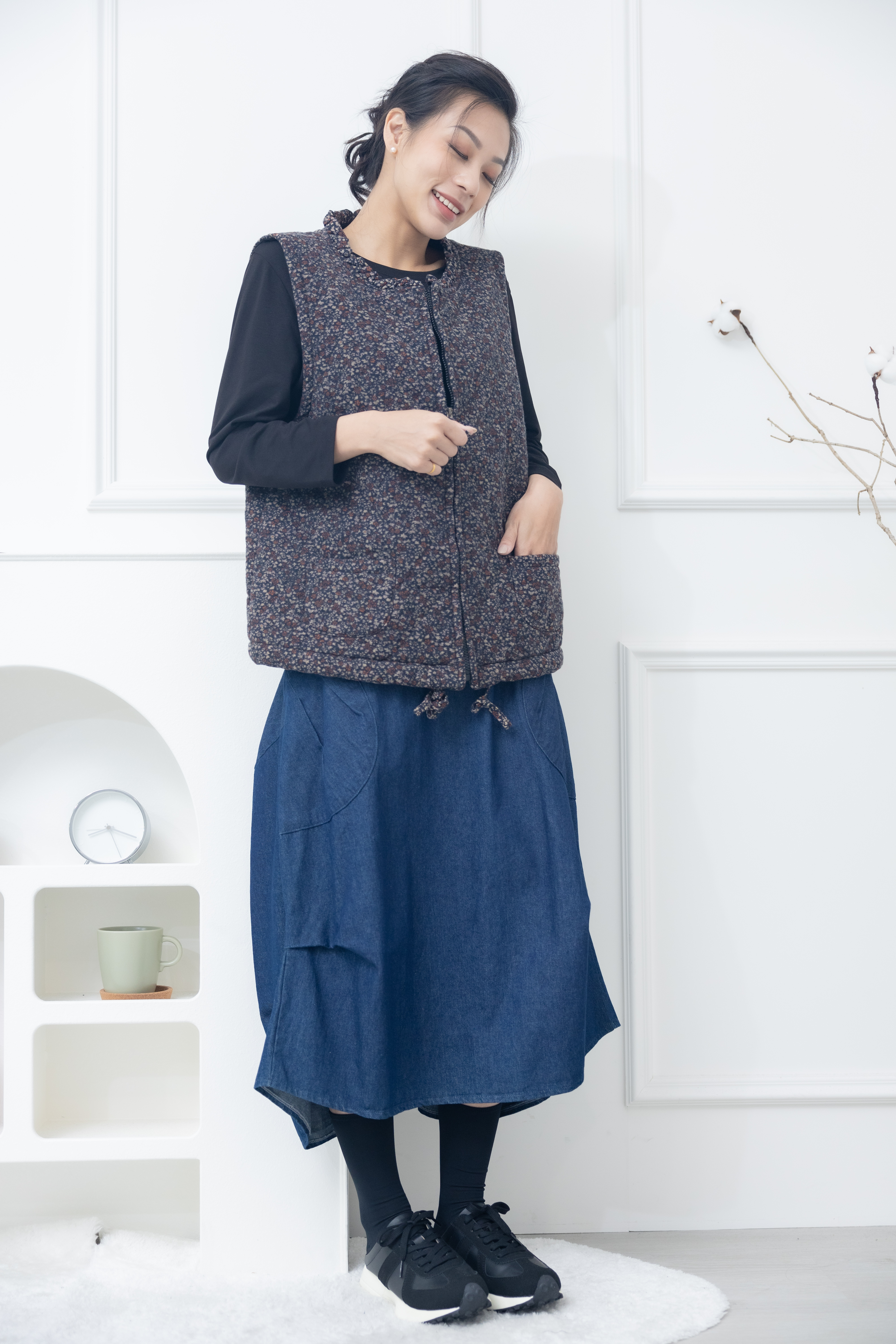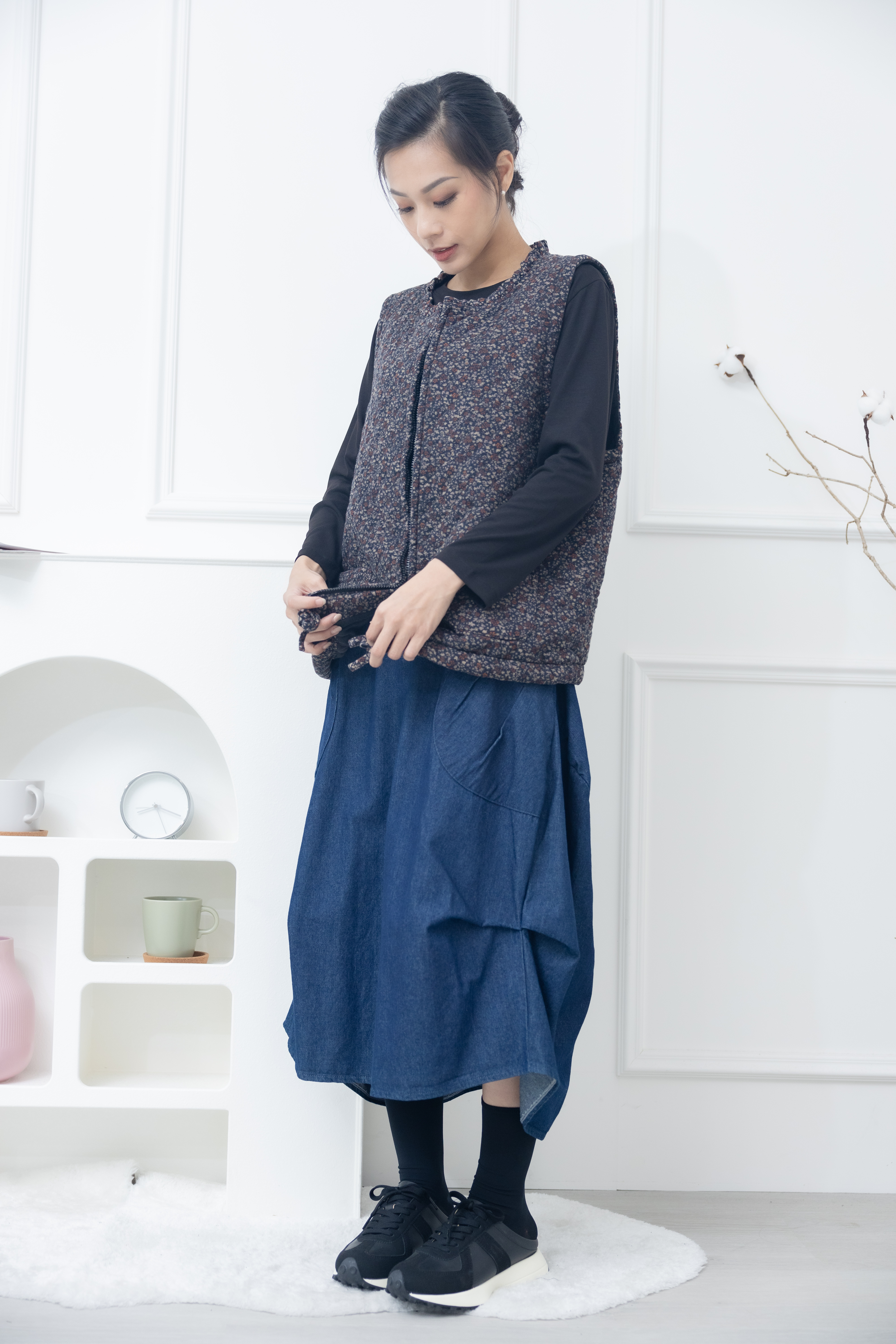 조끼 紅色小花下擺抽繩背心 / 藍色
