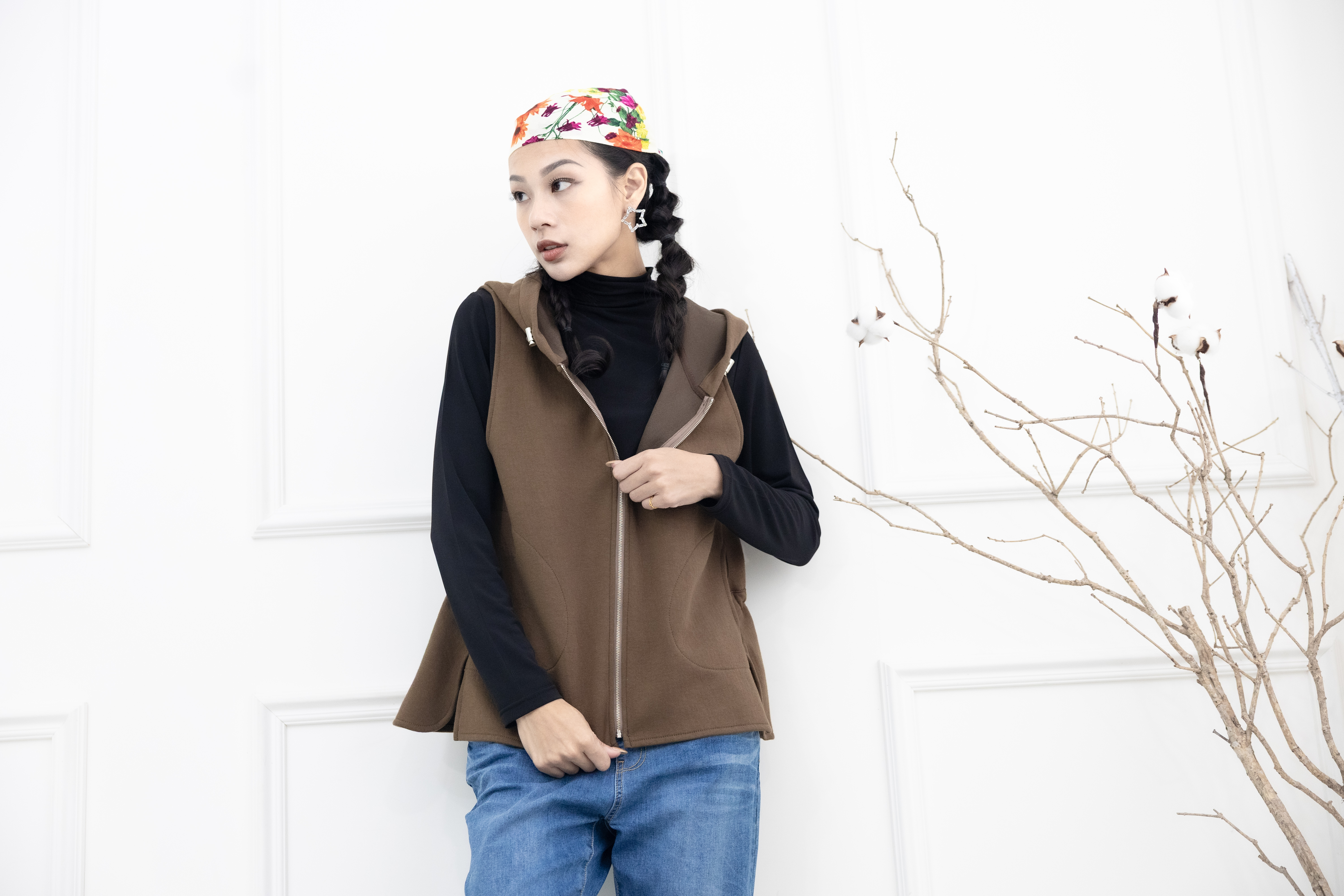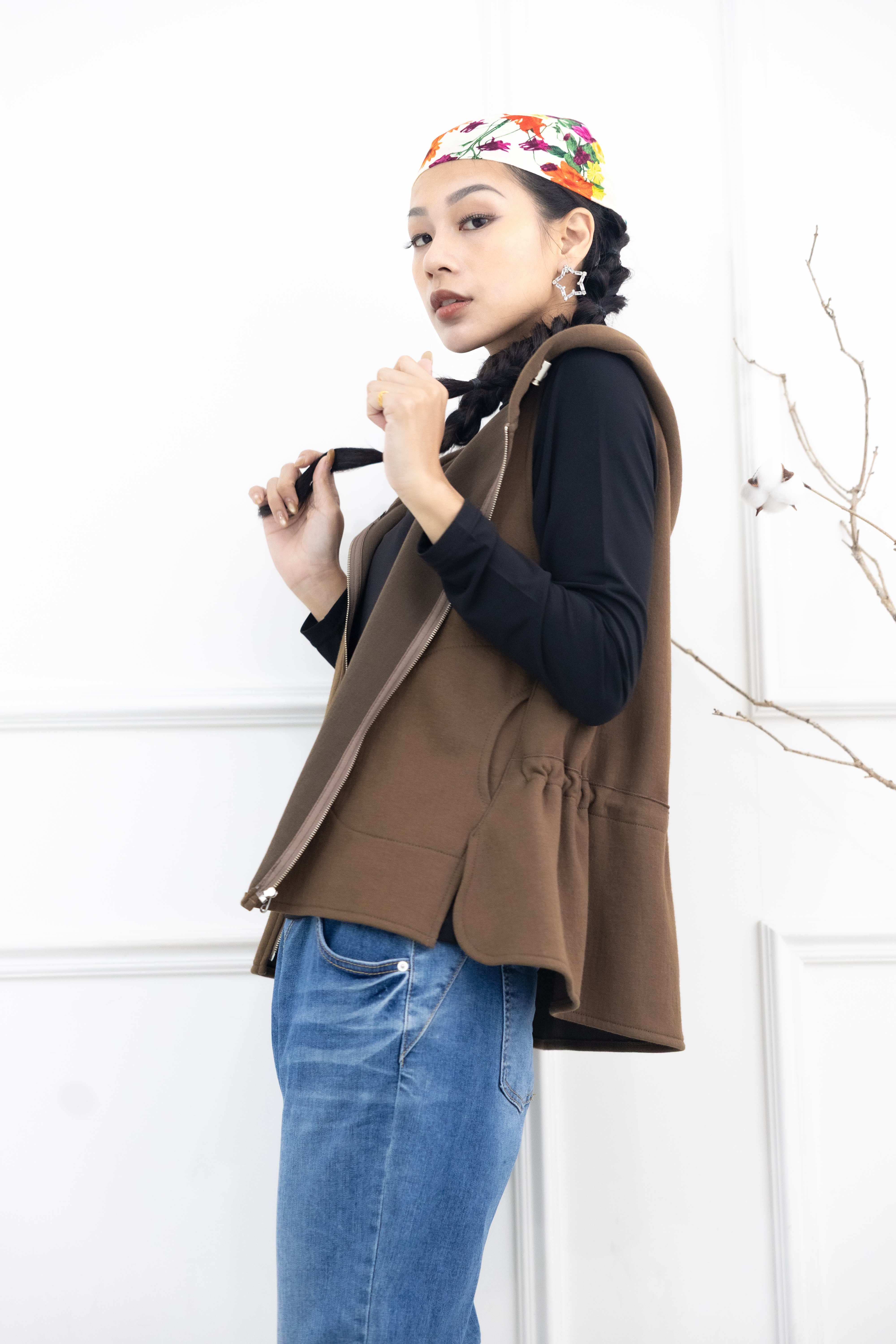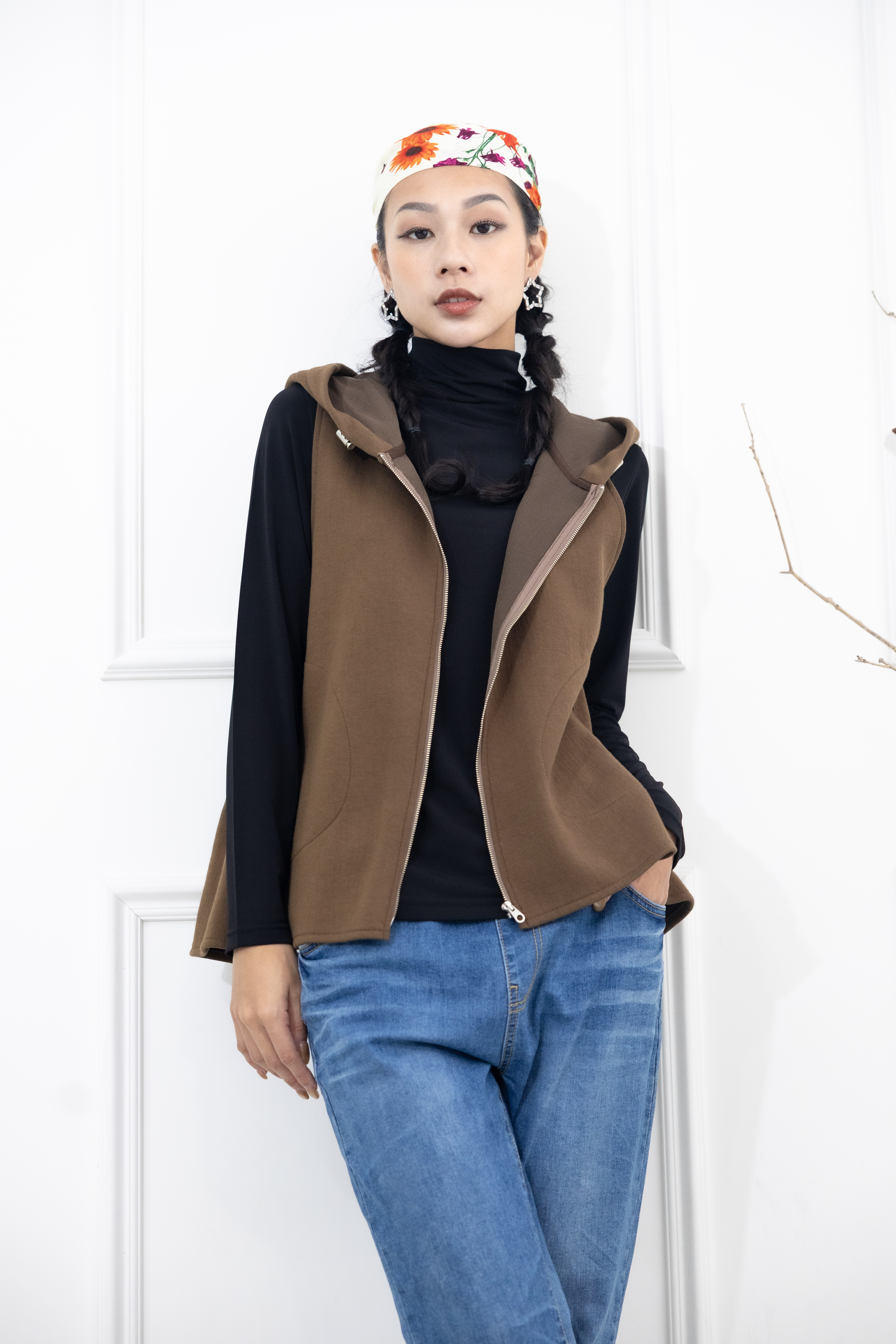 조끼 素面下擺開衩連帽背心 / 咖啡色