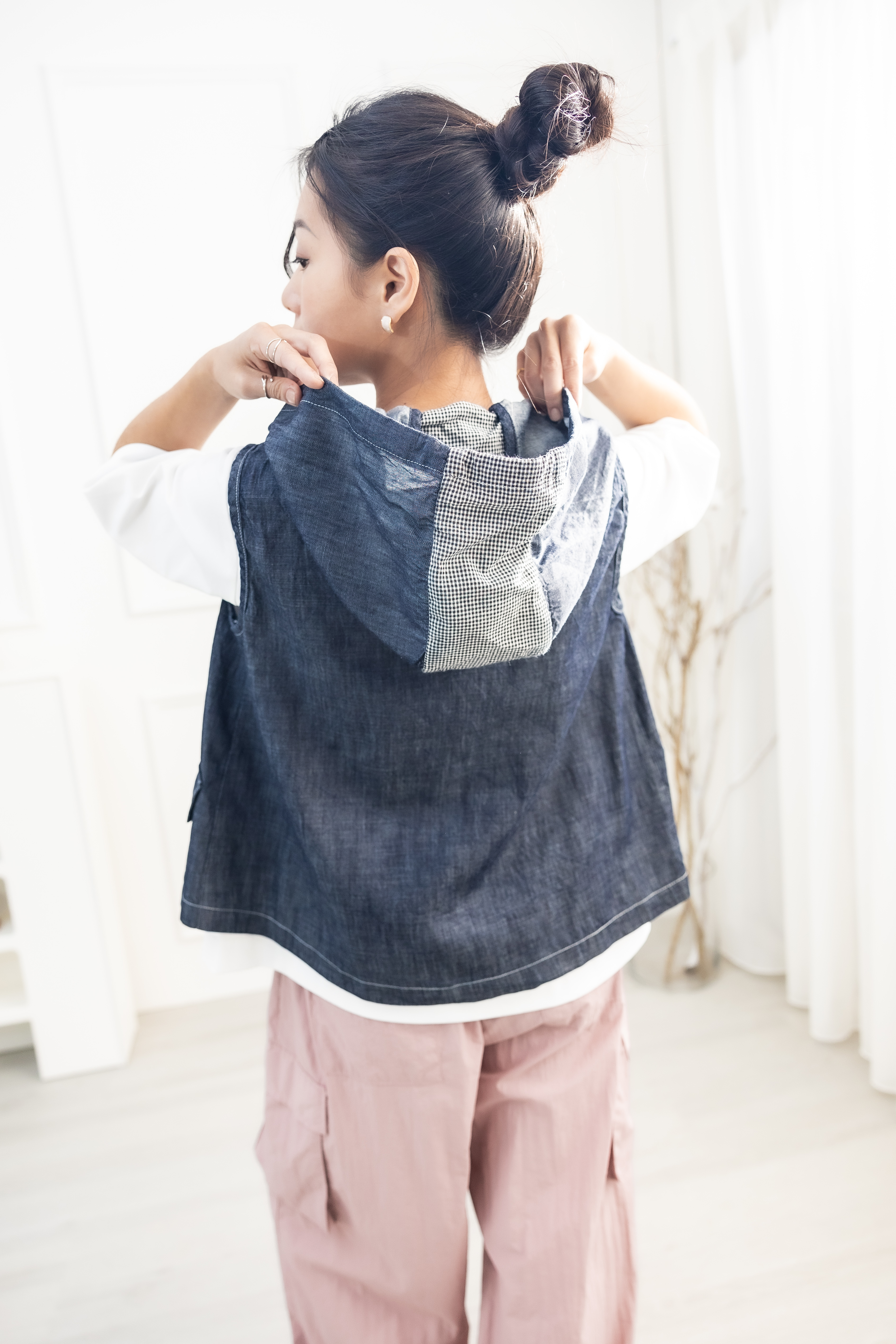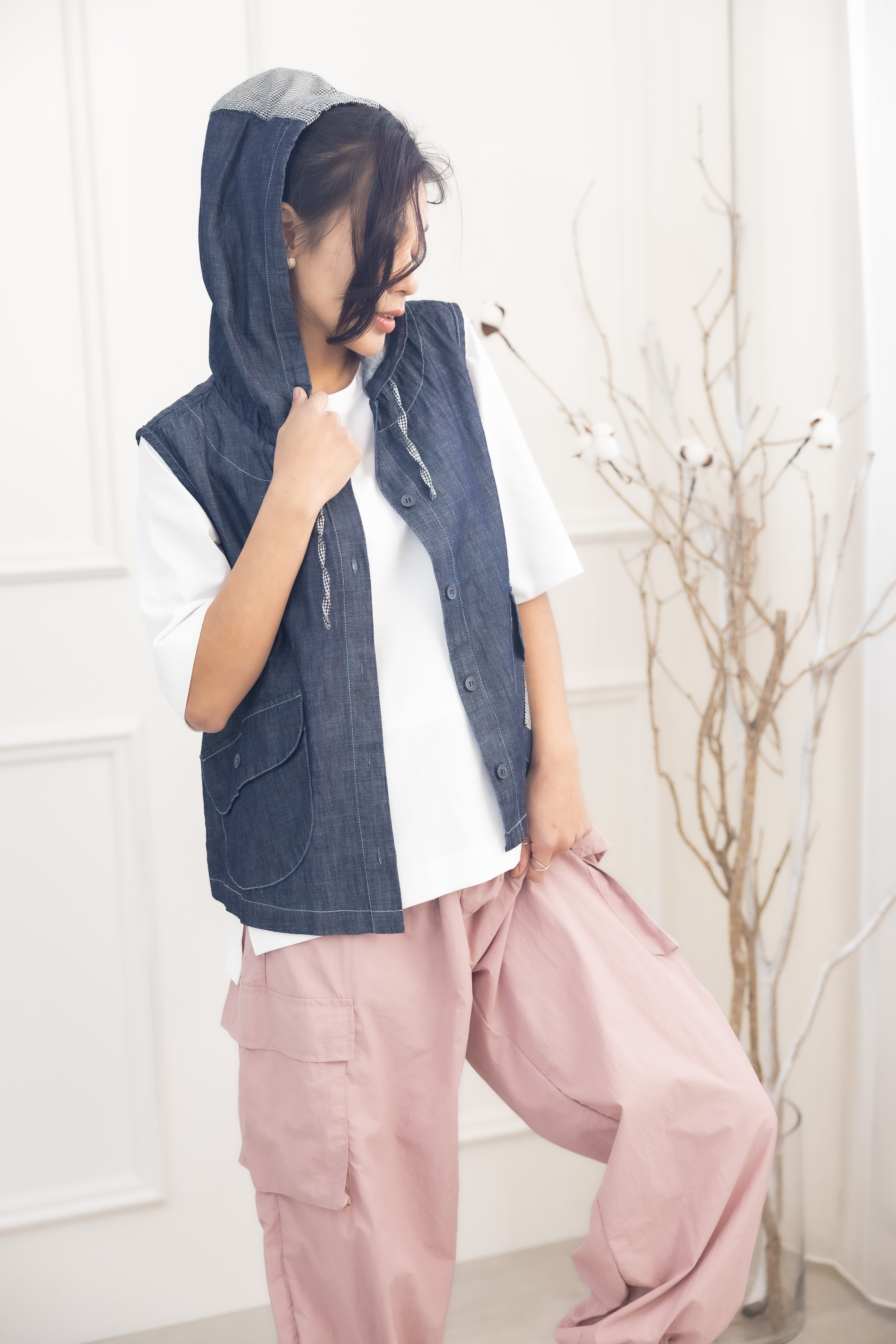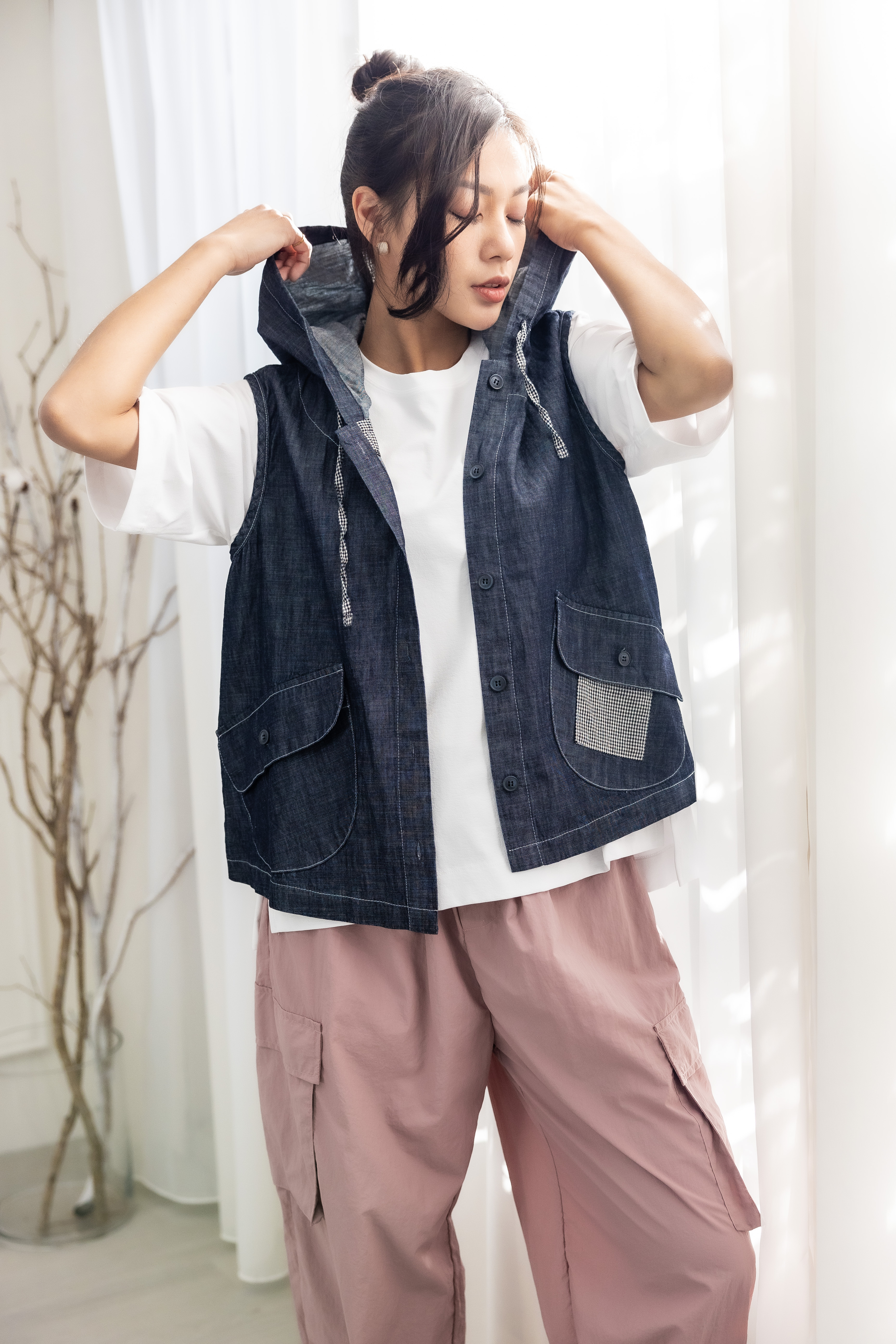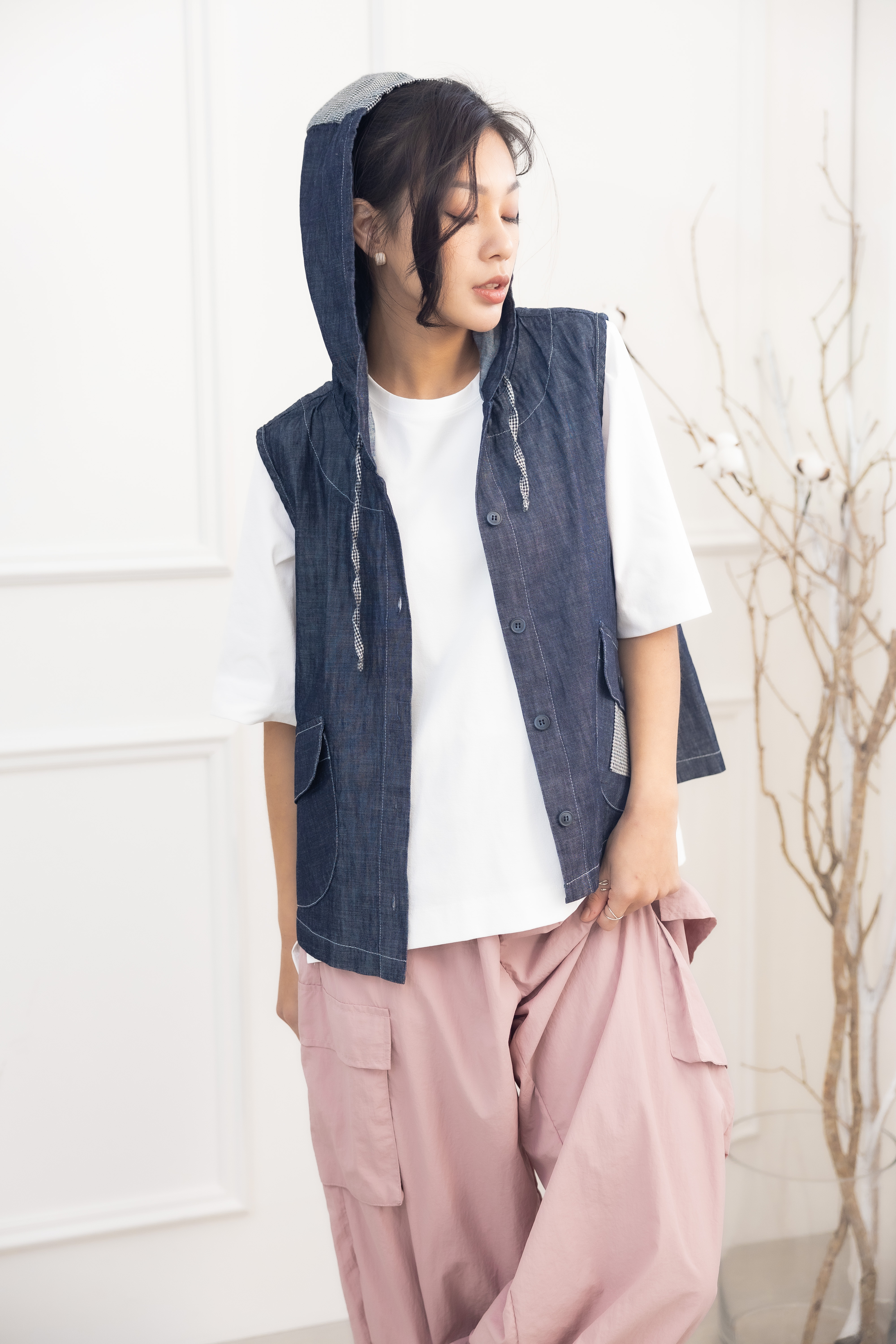 조끼 連帽造型口袋牛仔背心 / 深藍色