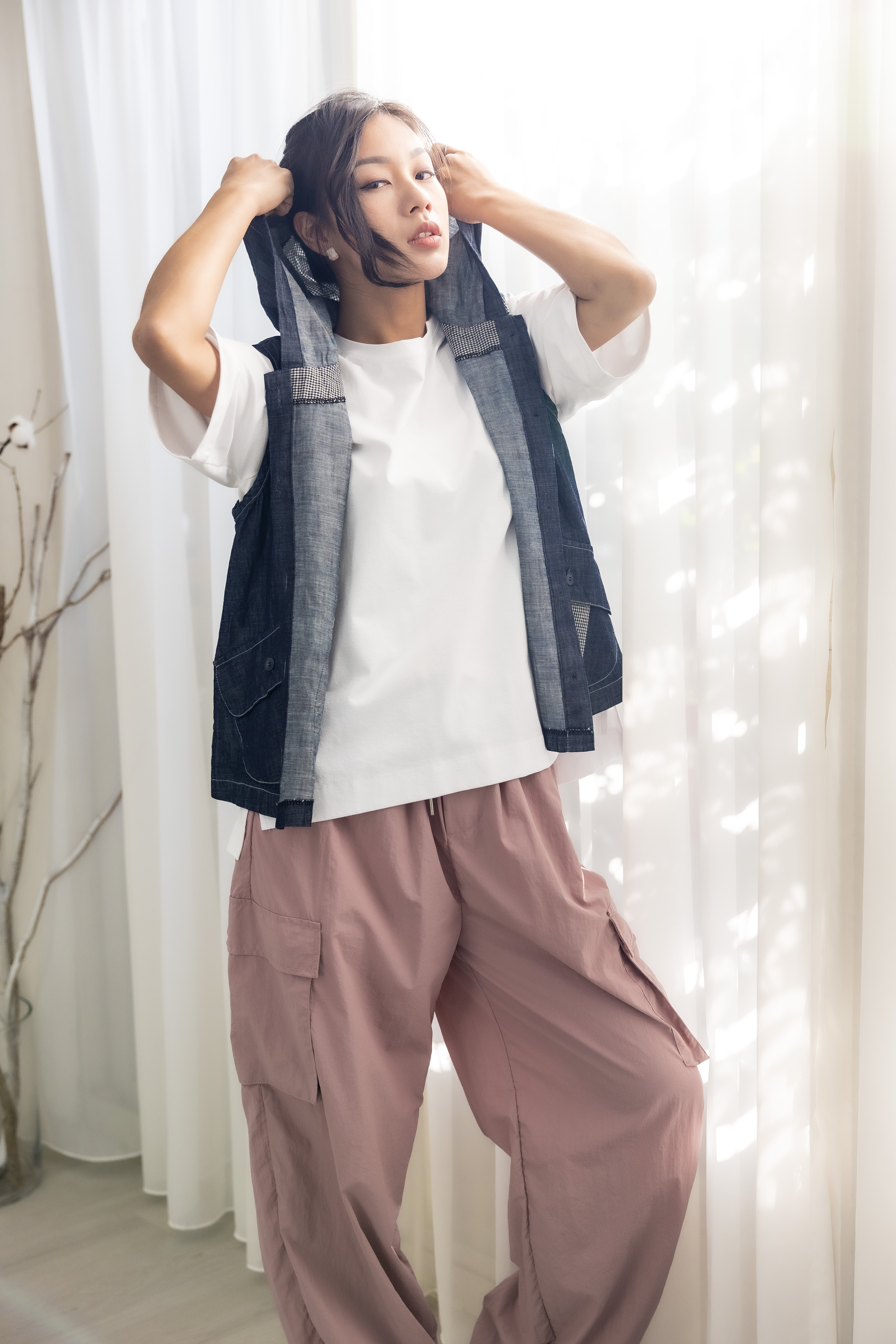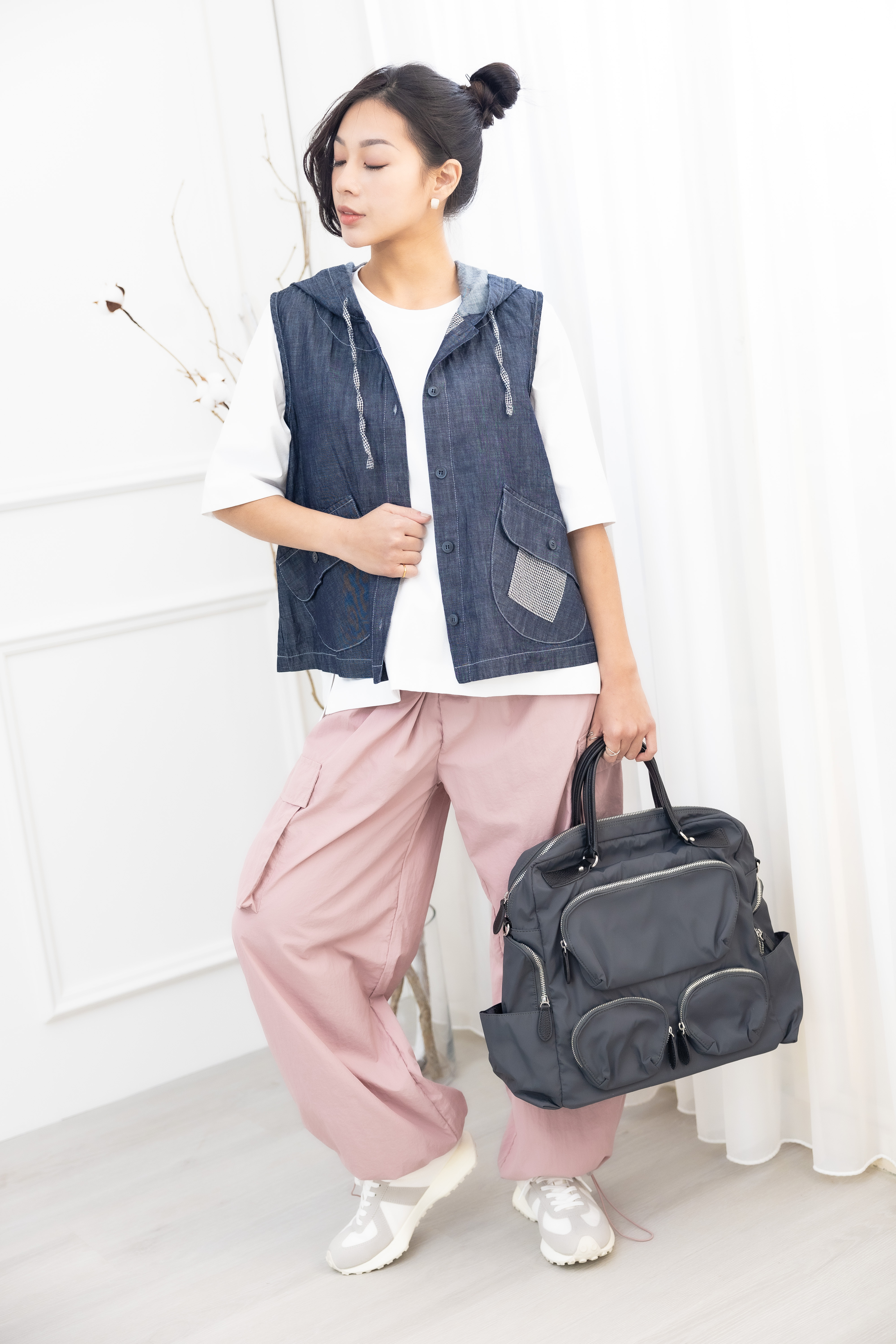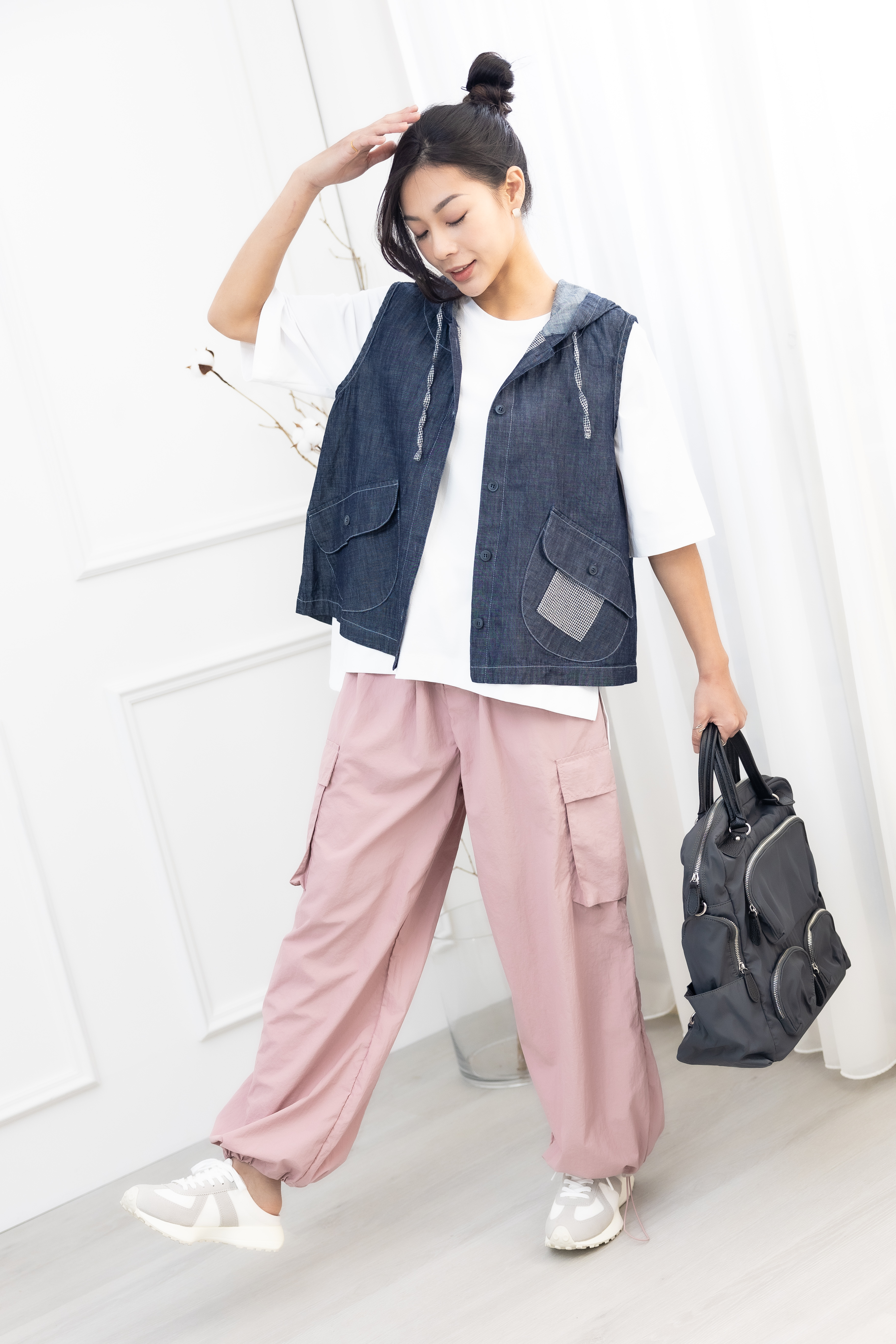 조끼 連帽造型口袋牛仔背心 / 深藍色