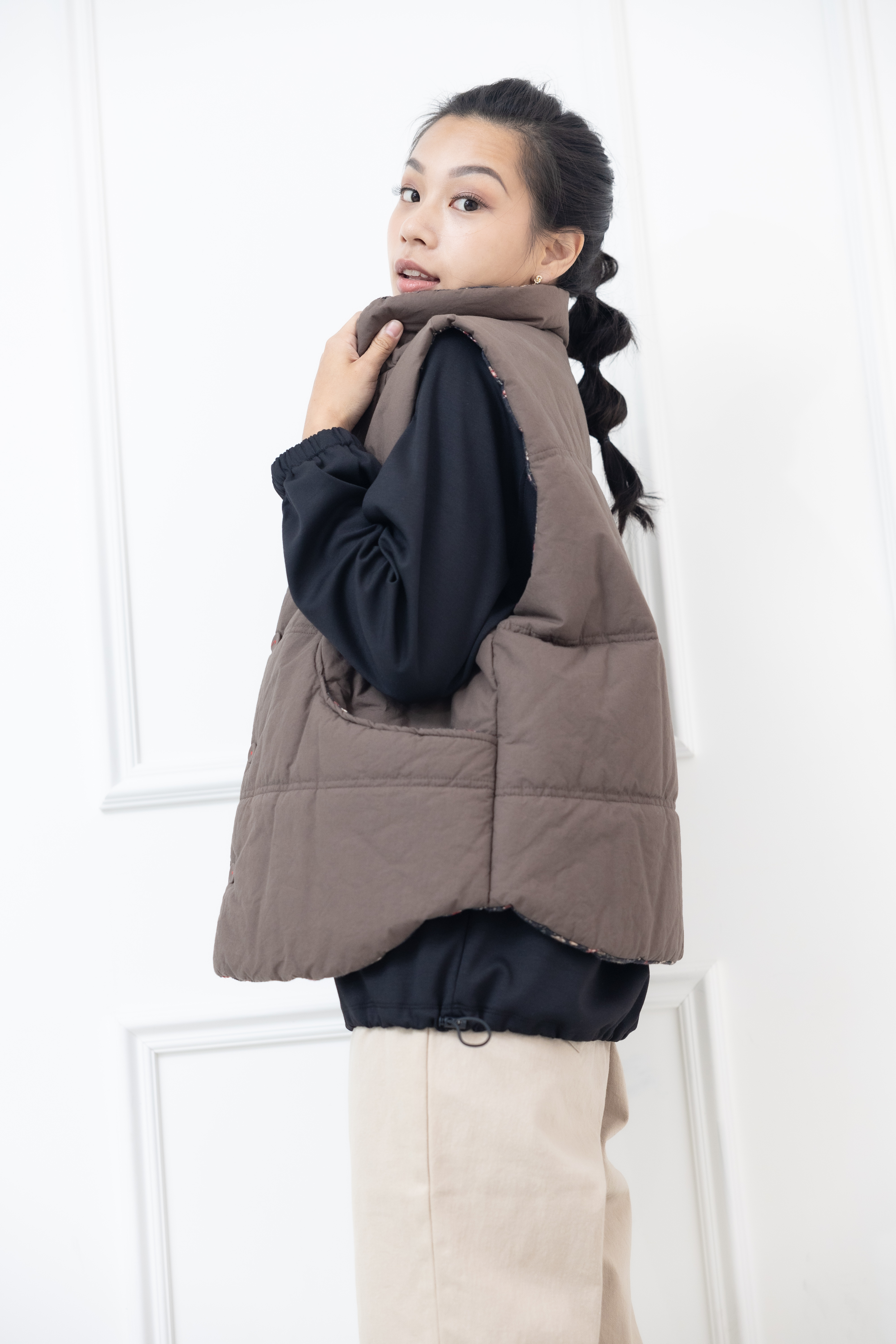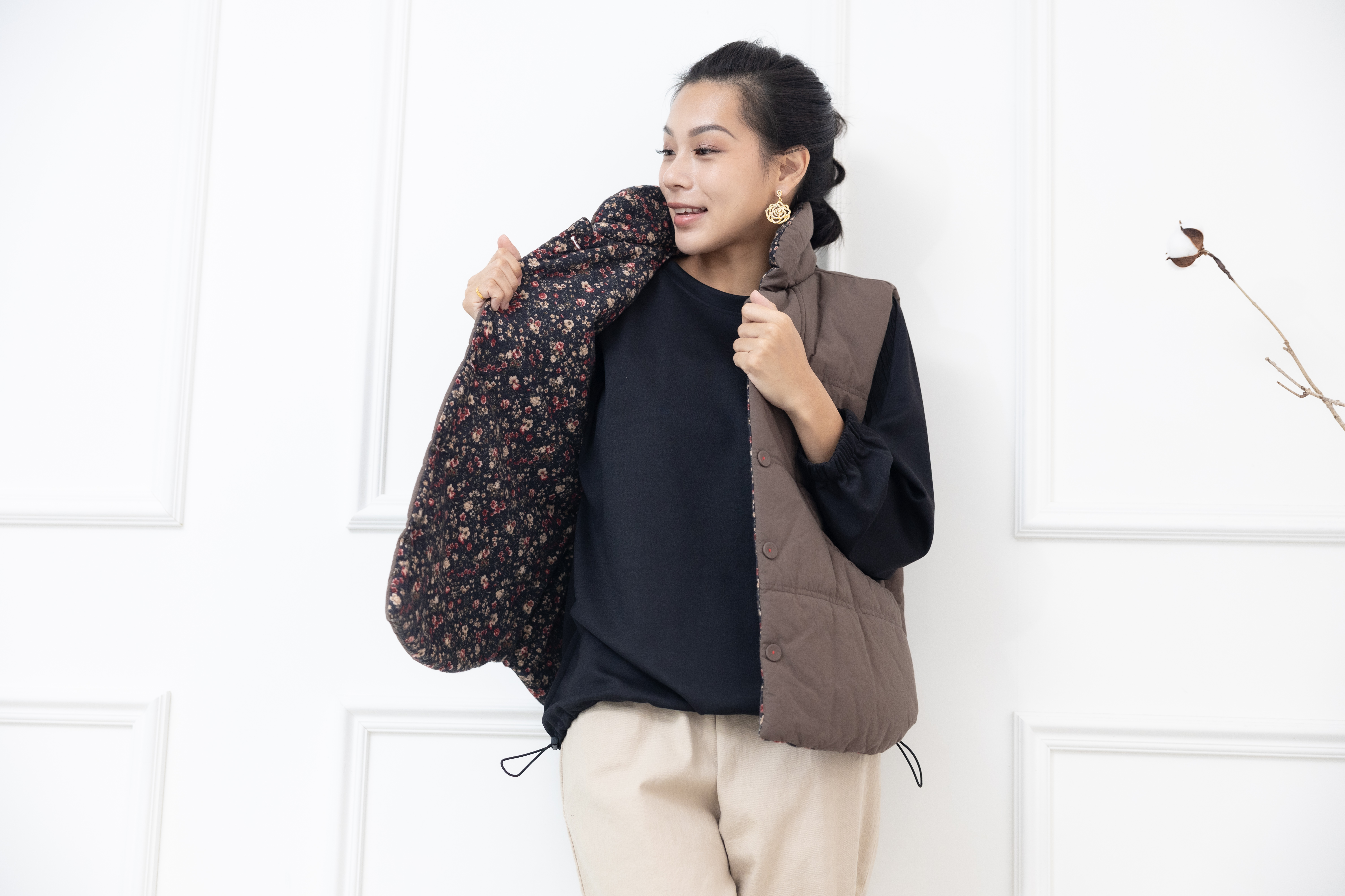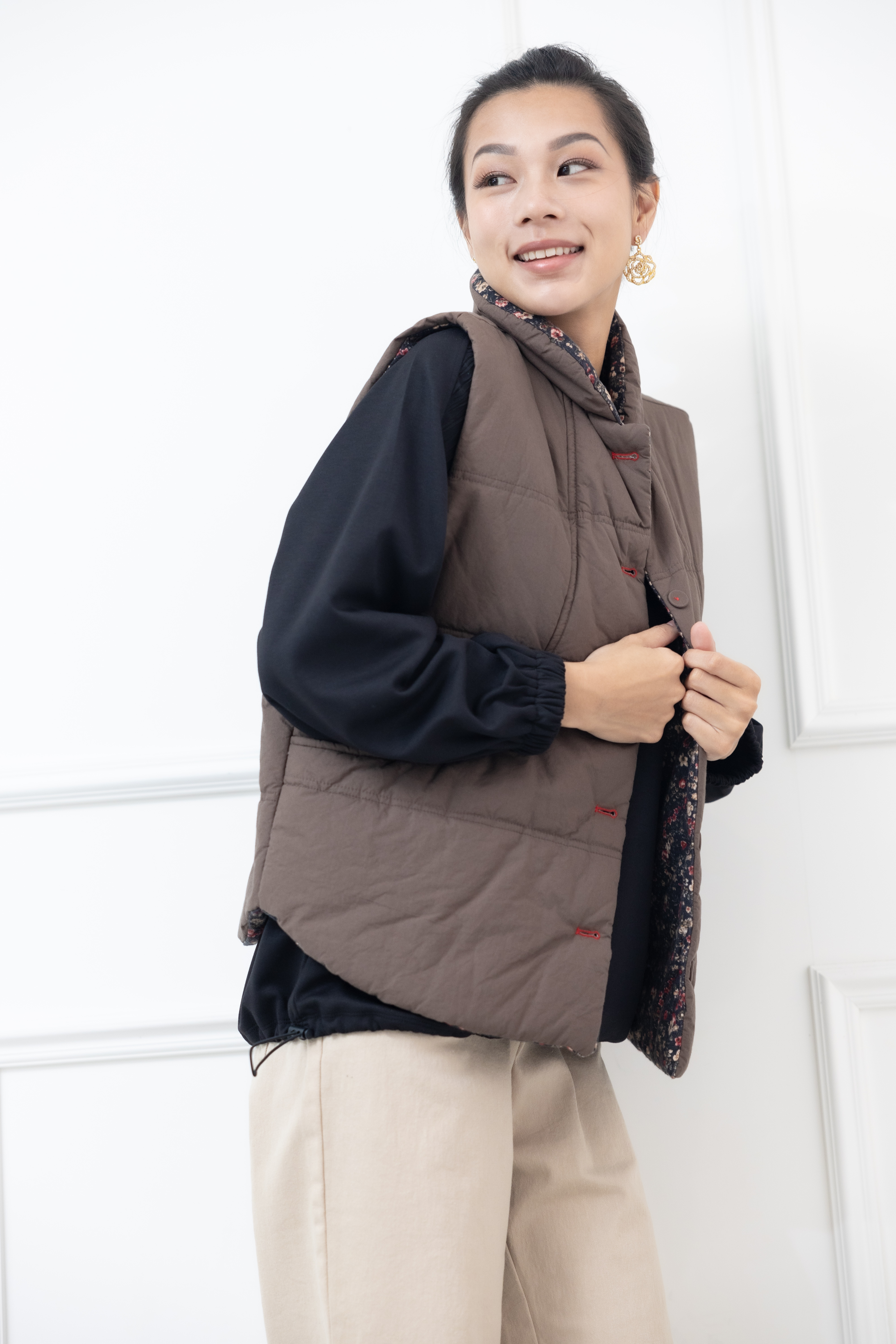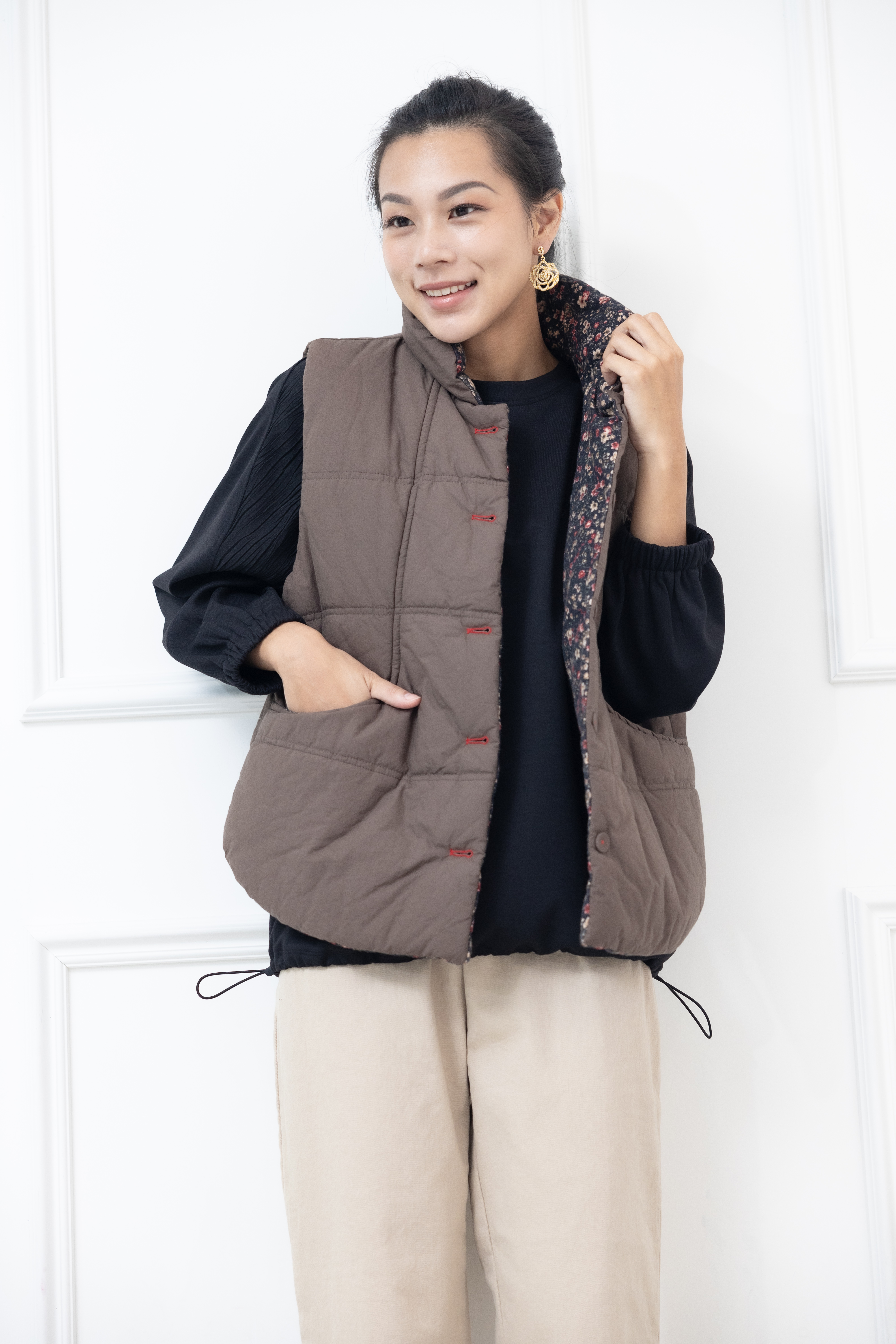조끼 高領鈕扣式內裡小碎花背心 / 灰卡其色
