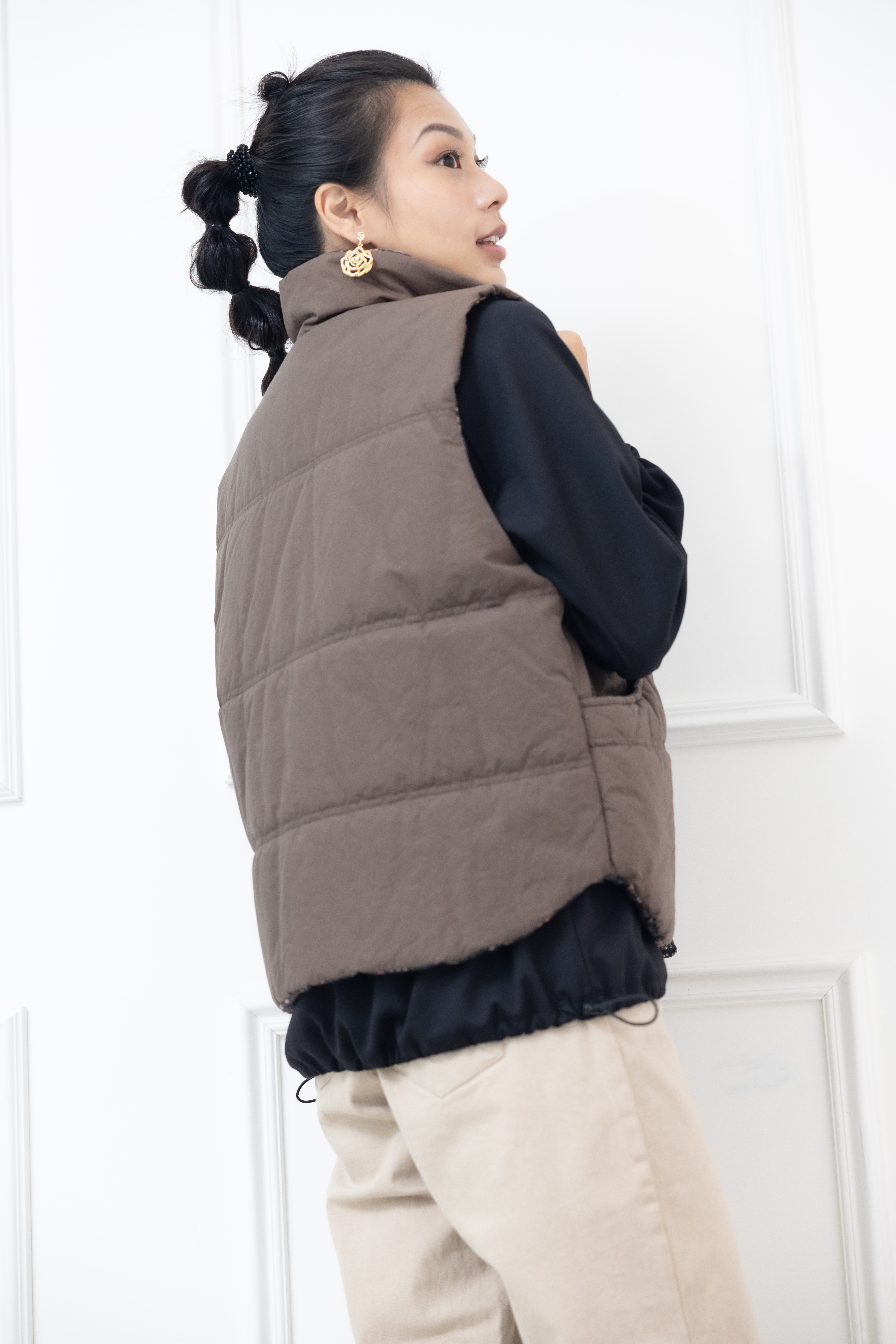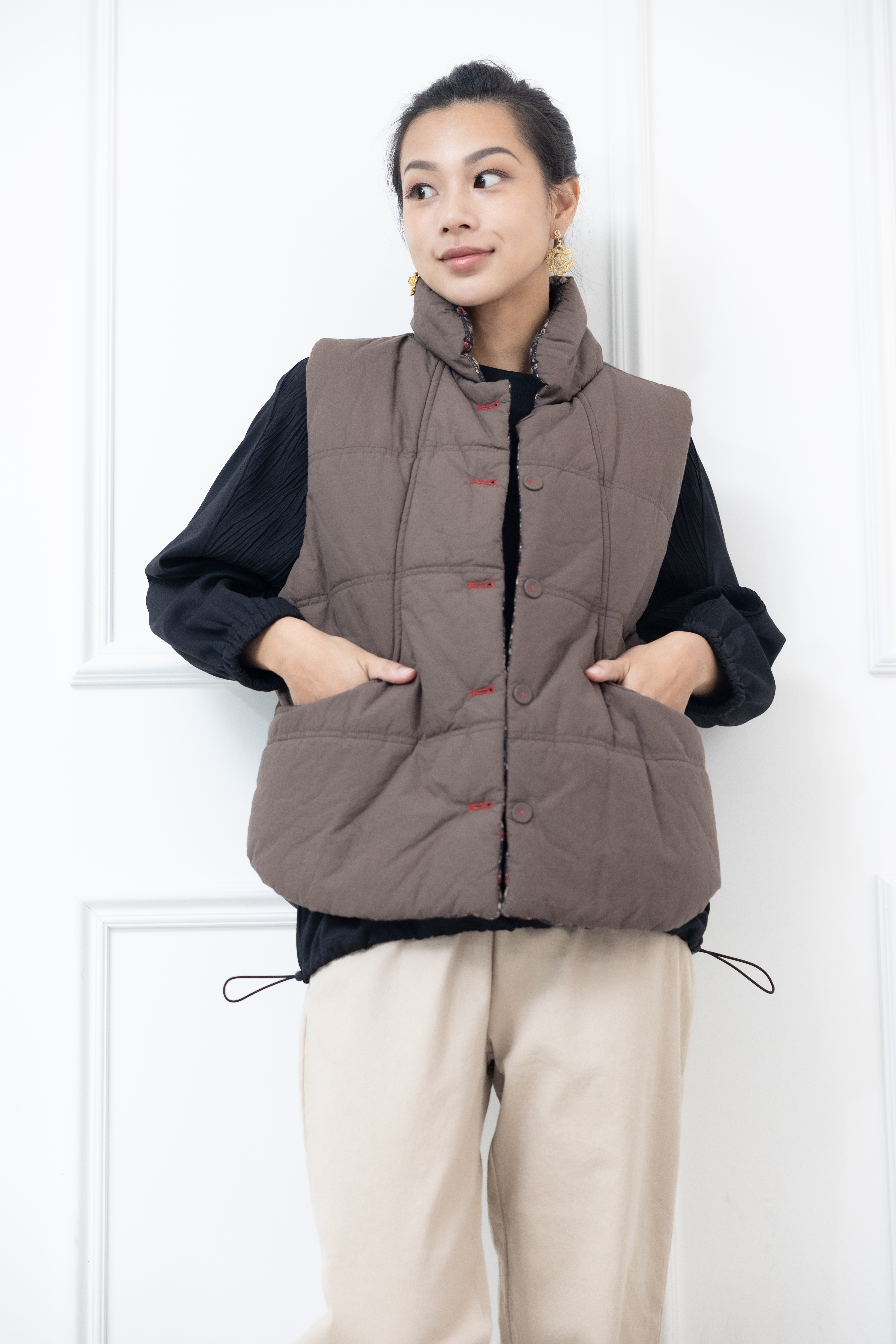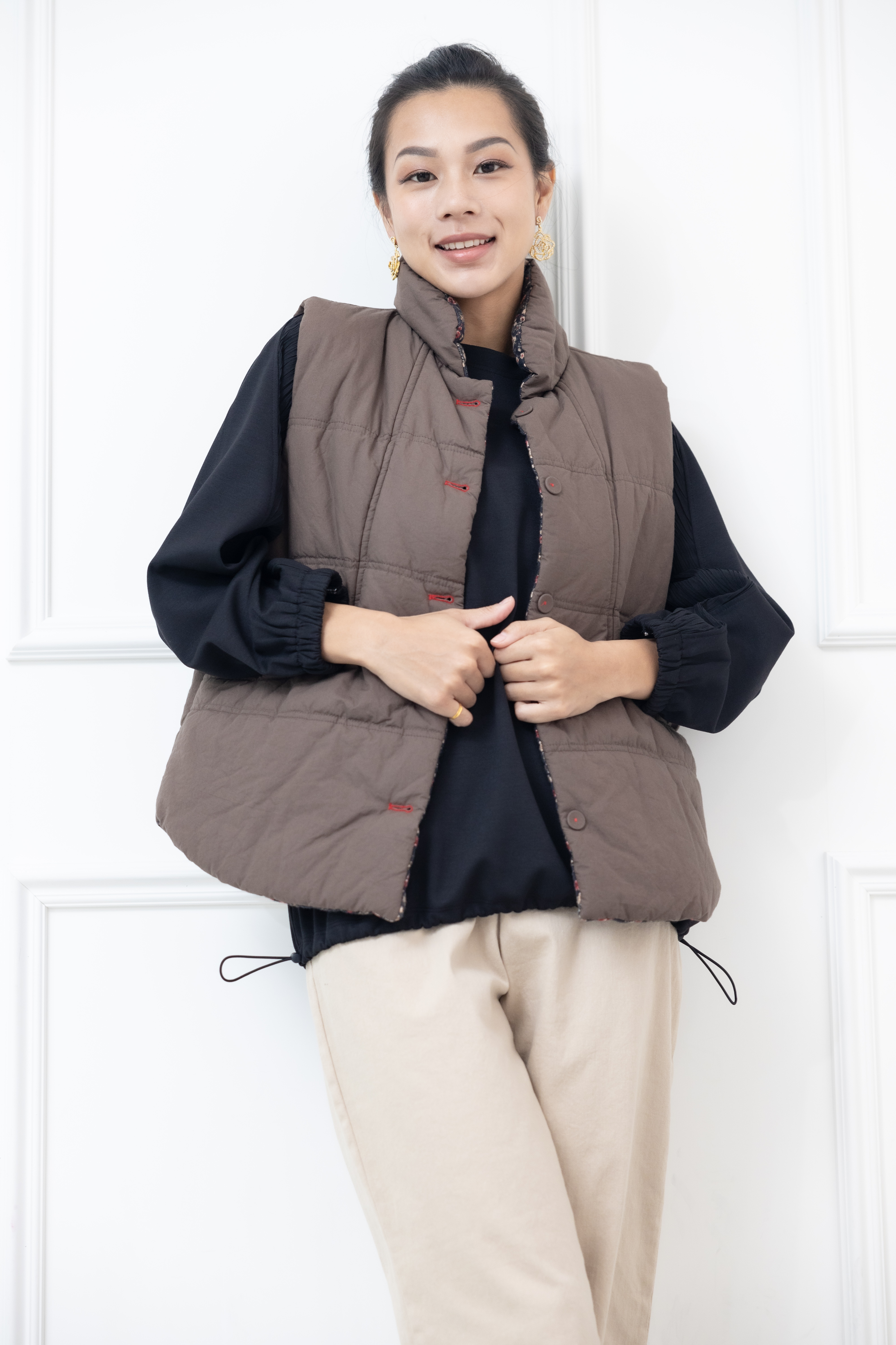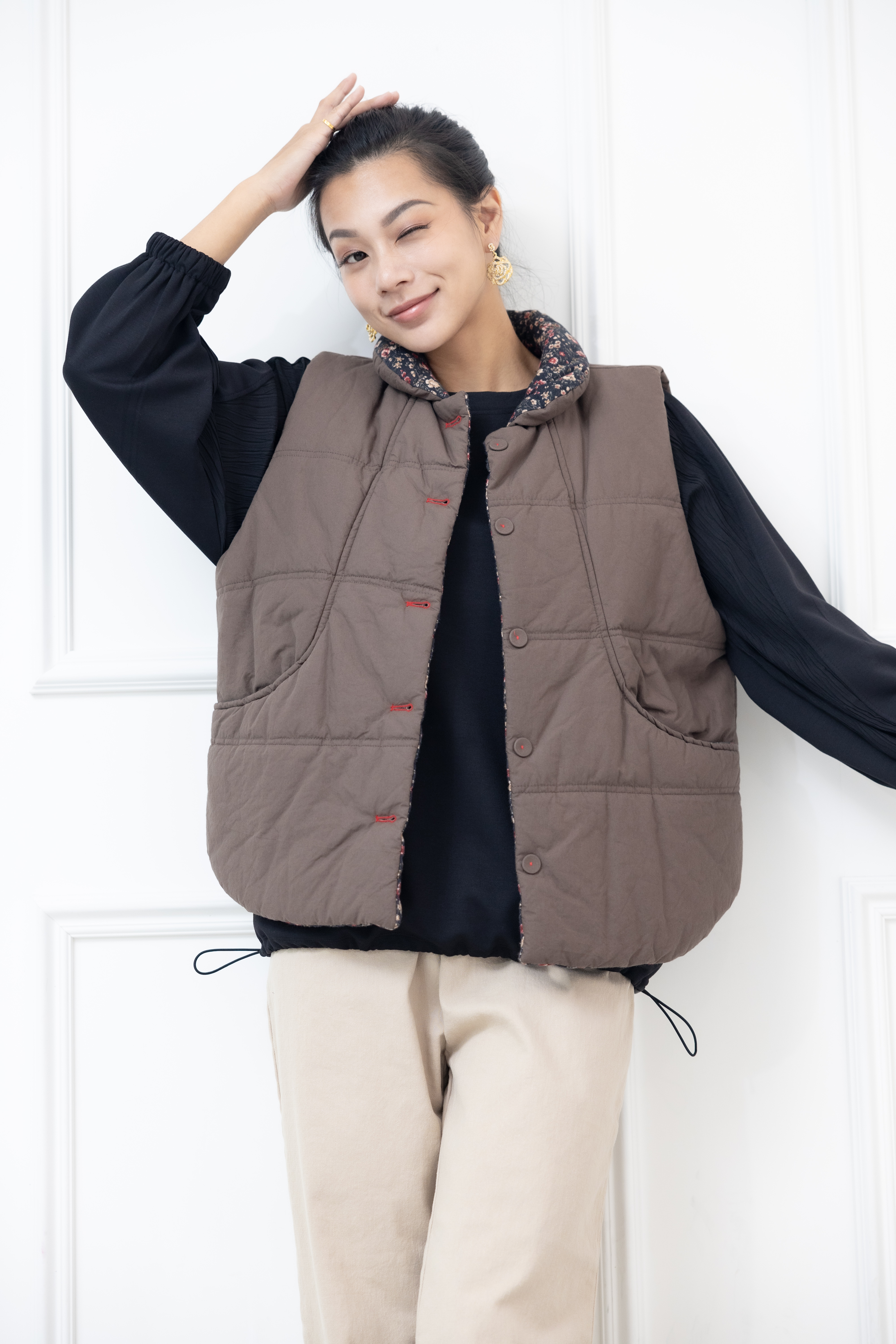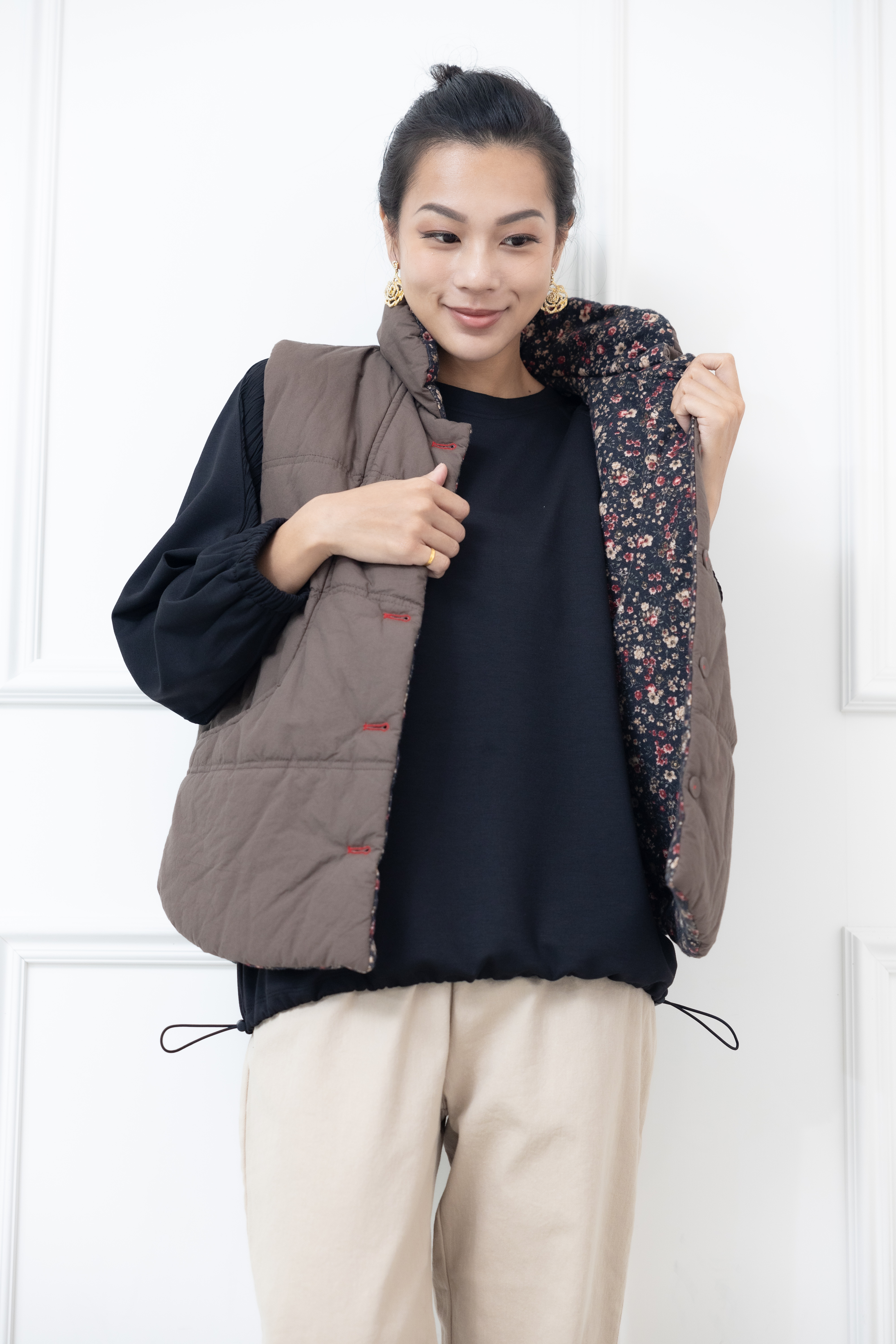 조끼 高領鈕扣式內裡小碎花背心 / 灰卡其色