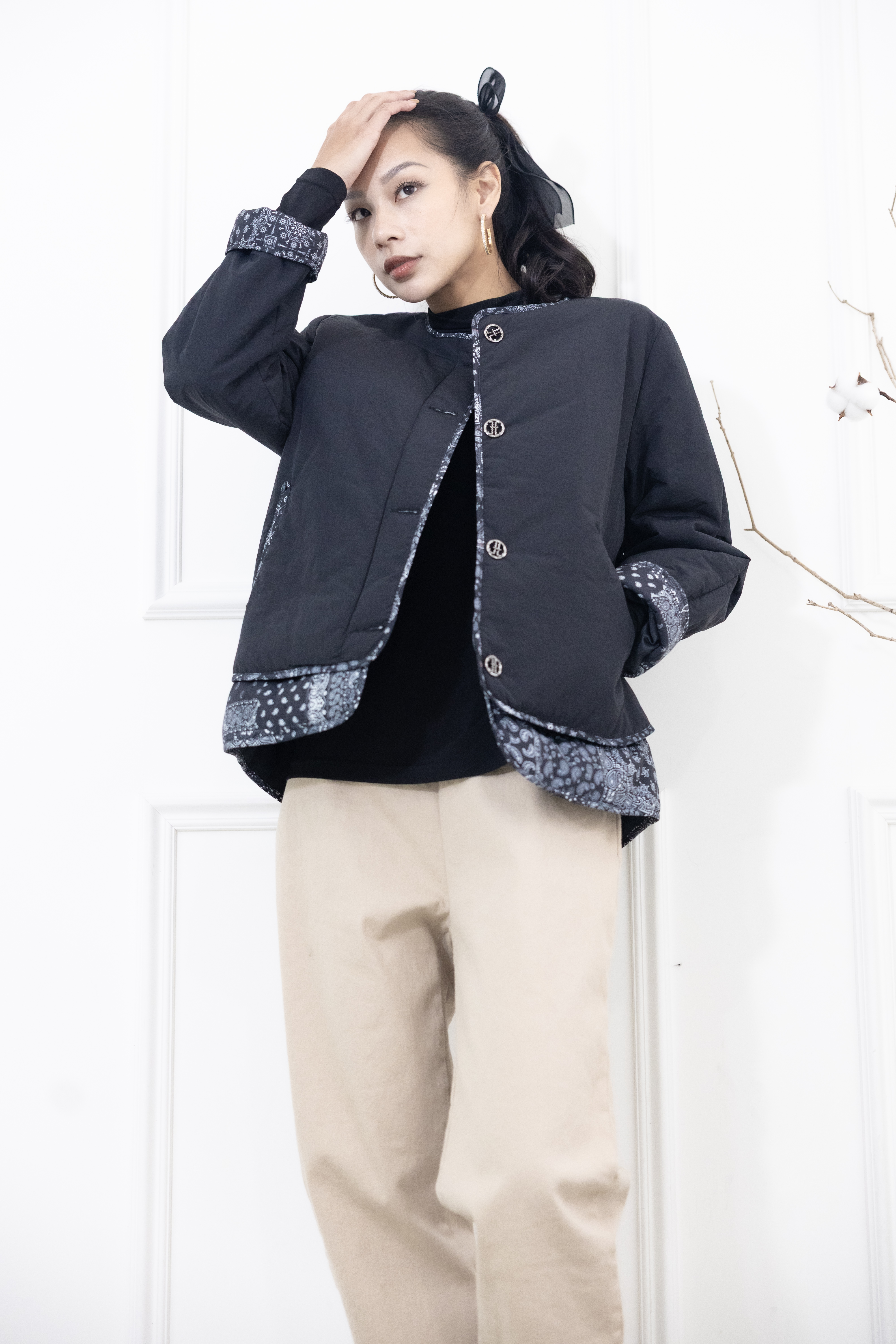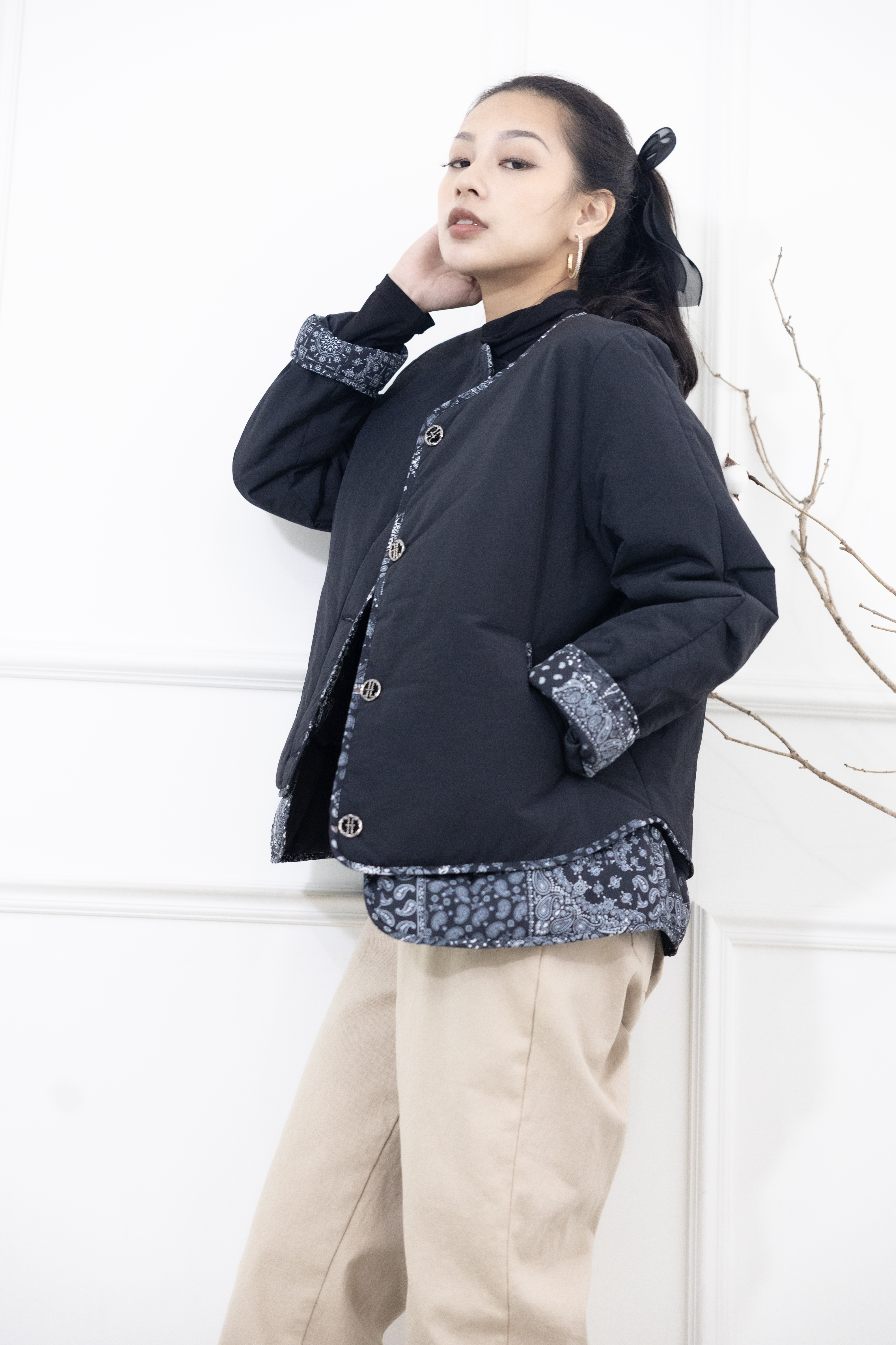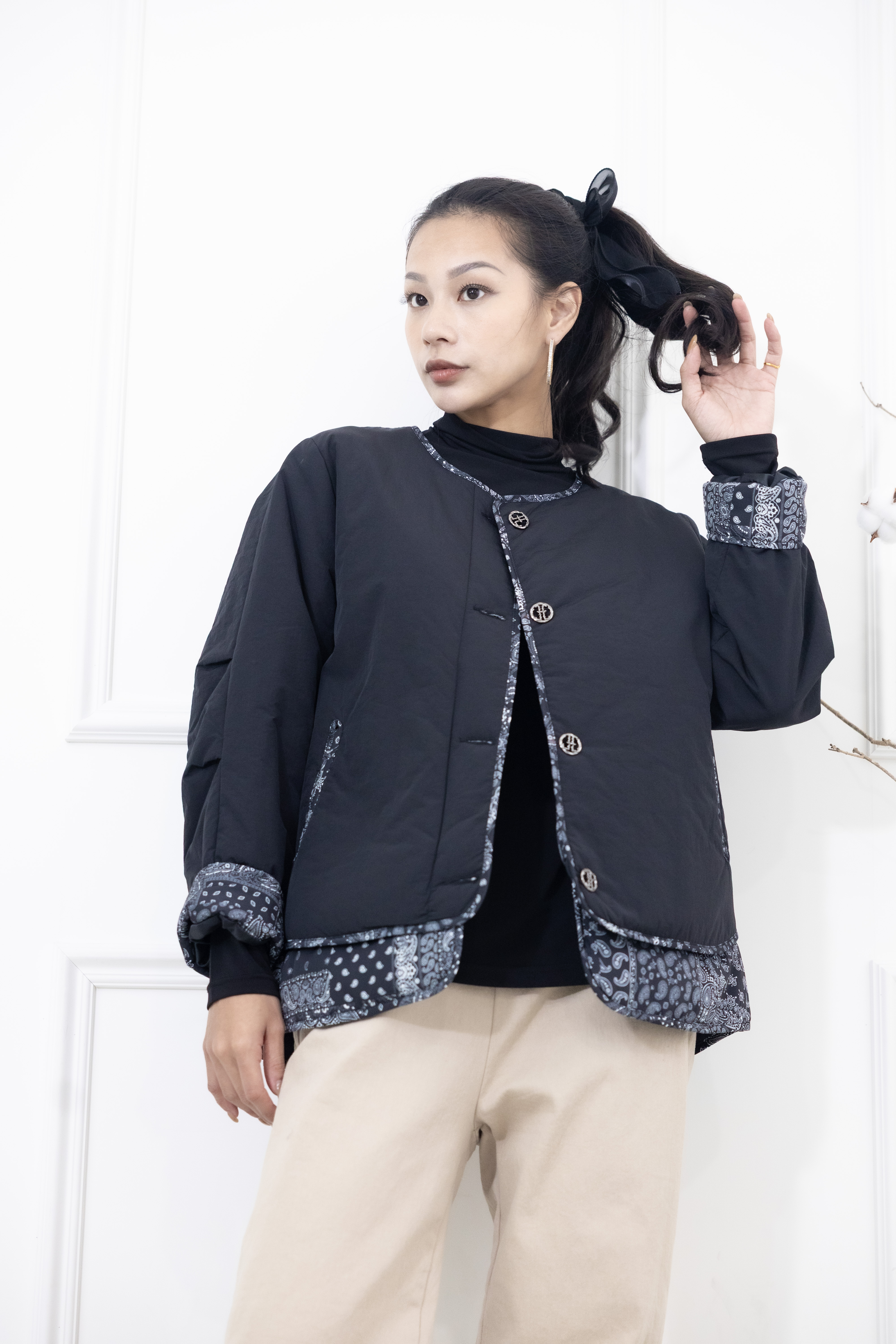 코트 下擺.袖子拼接變形蟲花紋防風鋪棉外套 / 黑色