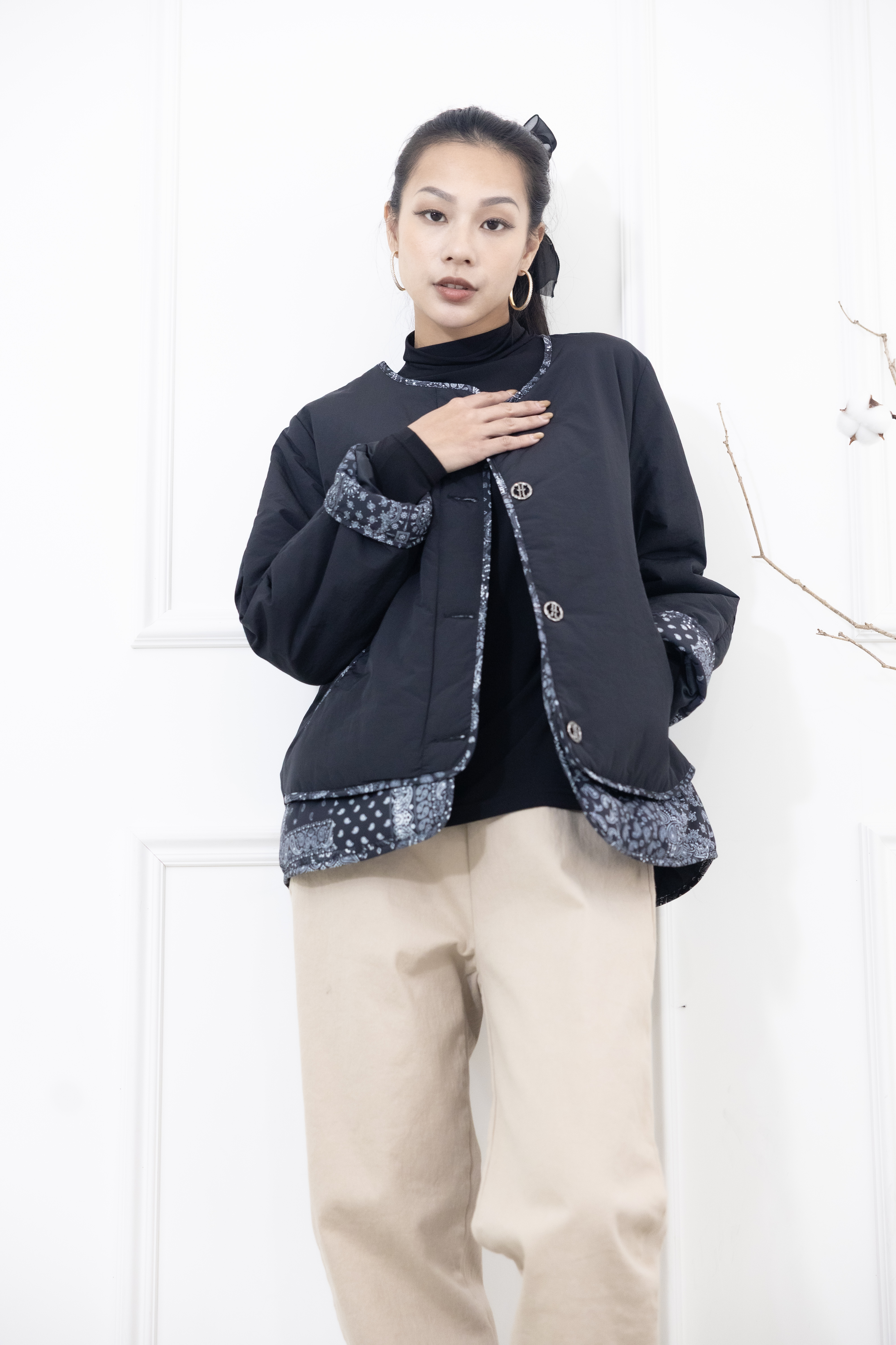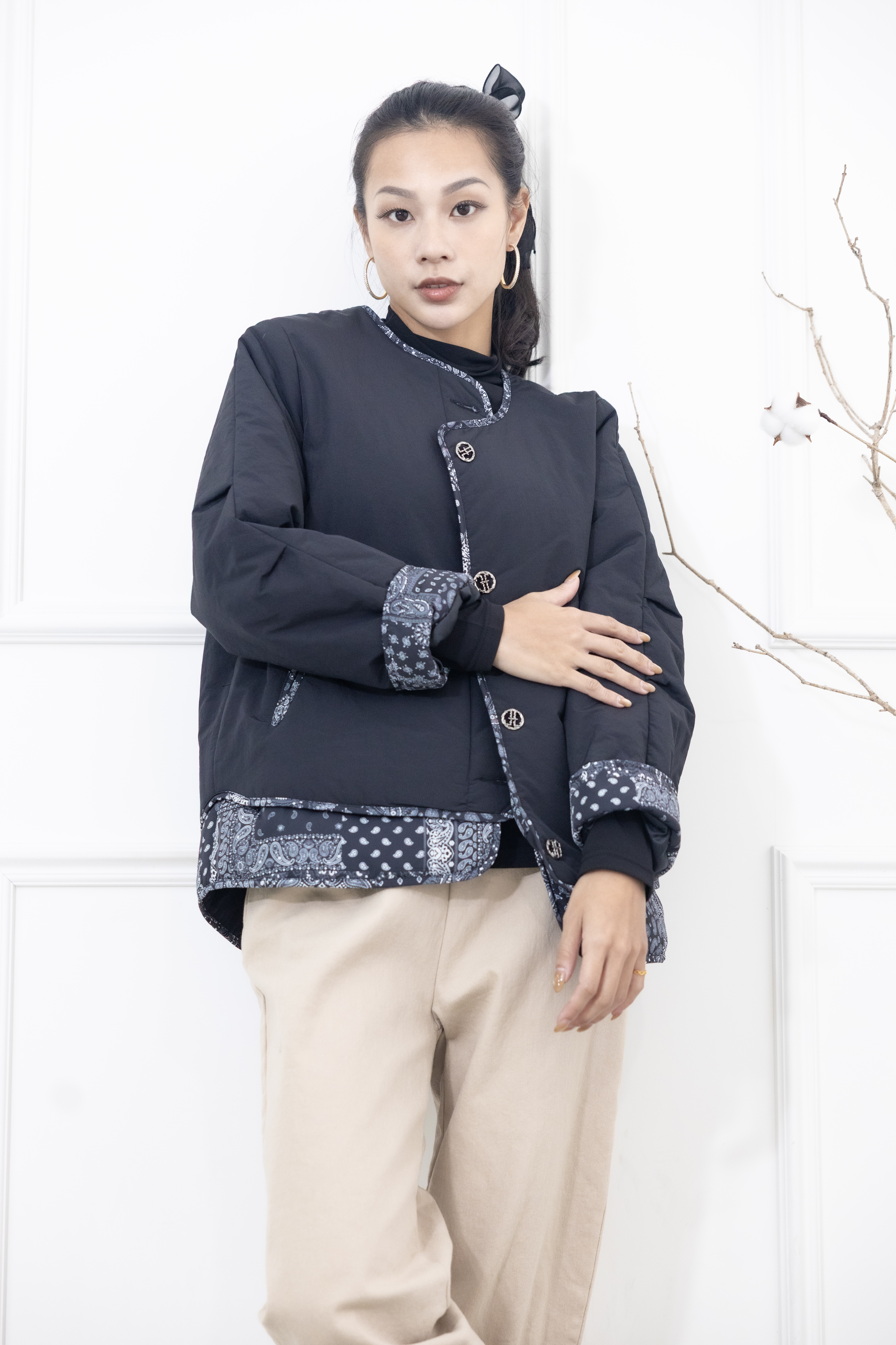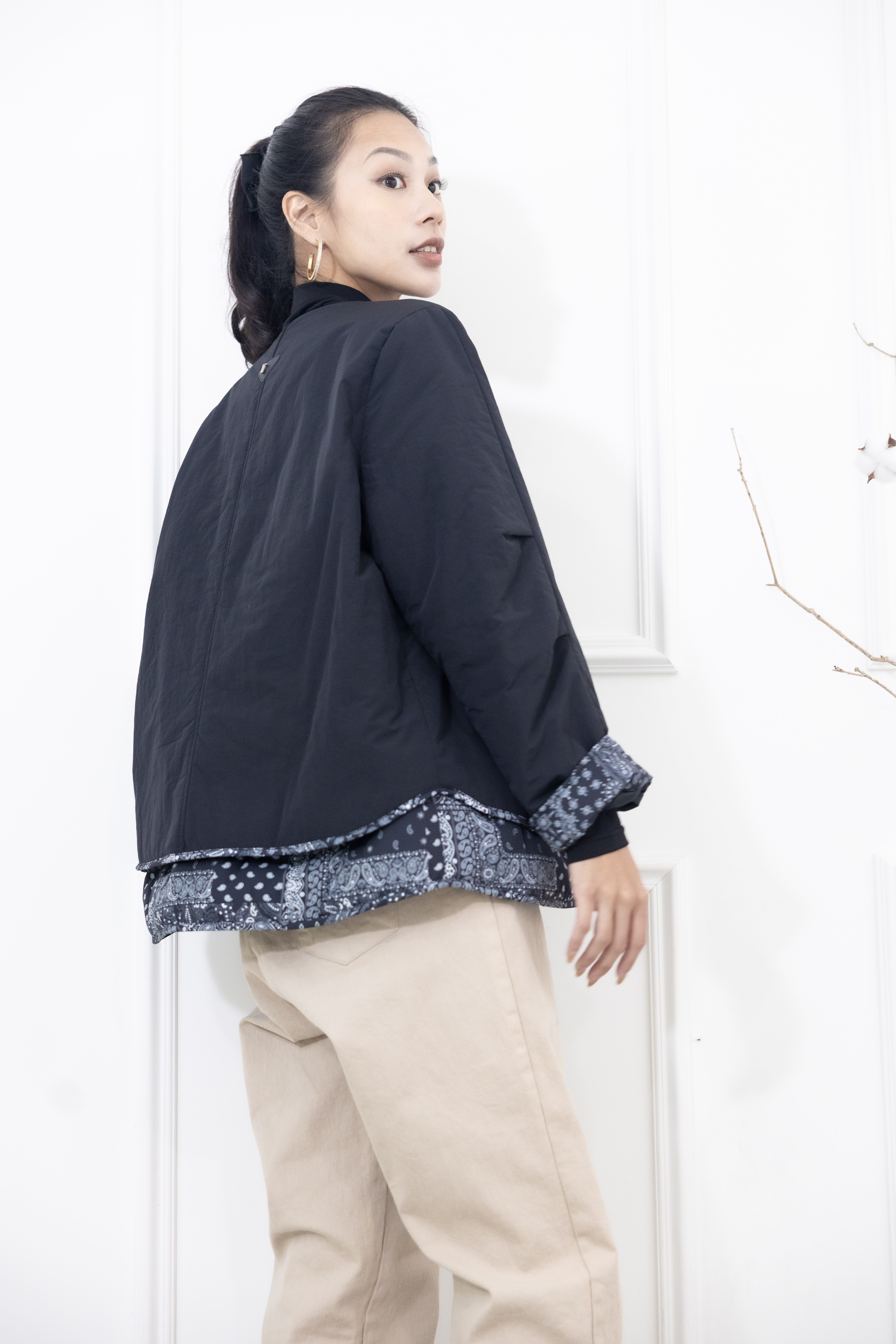 코트 下擺.袖子拼接變形蟲花紋防風鋪棉外套  / 黑色