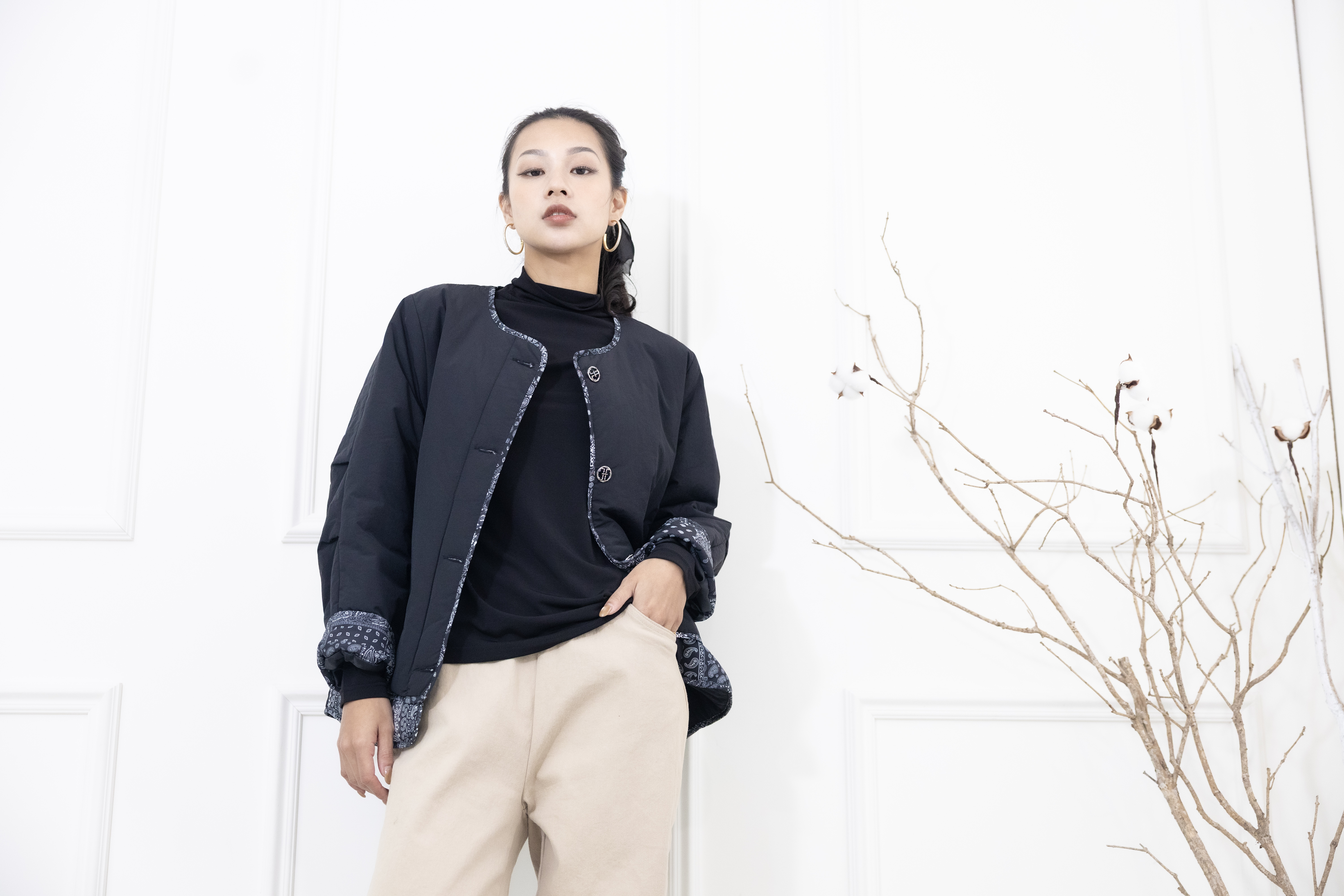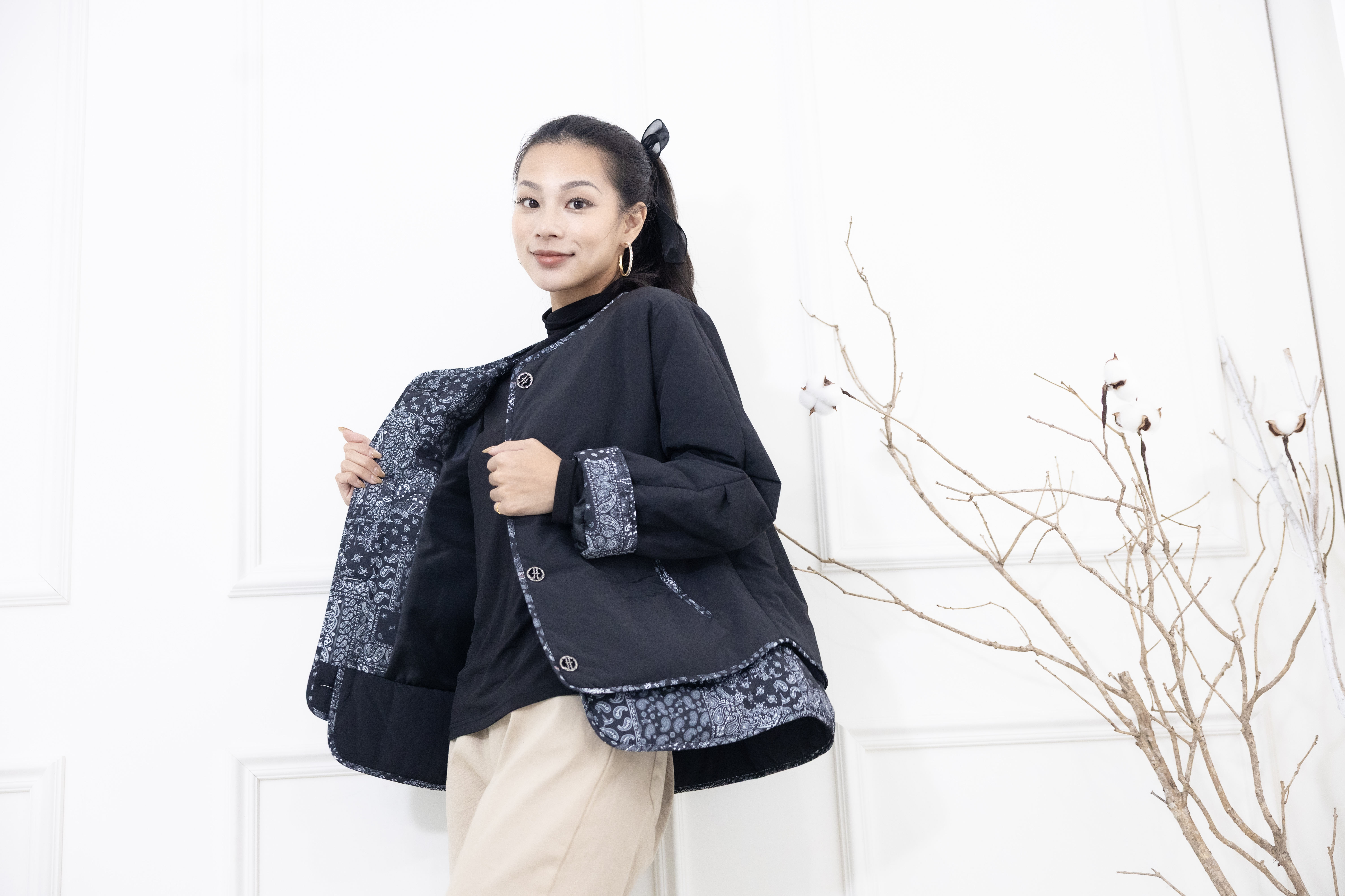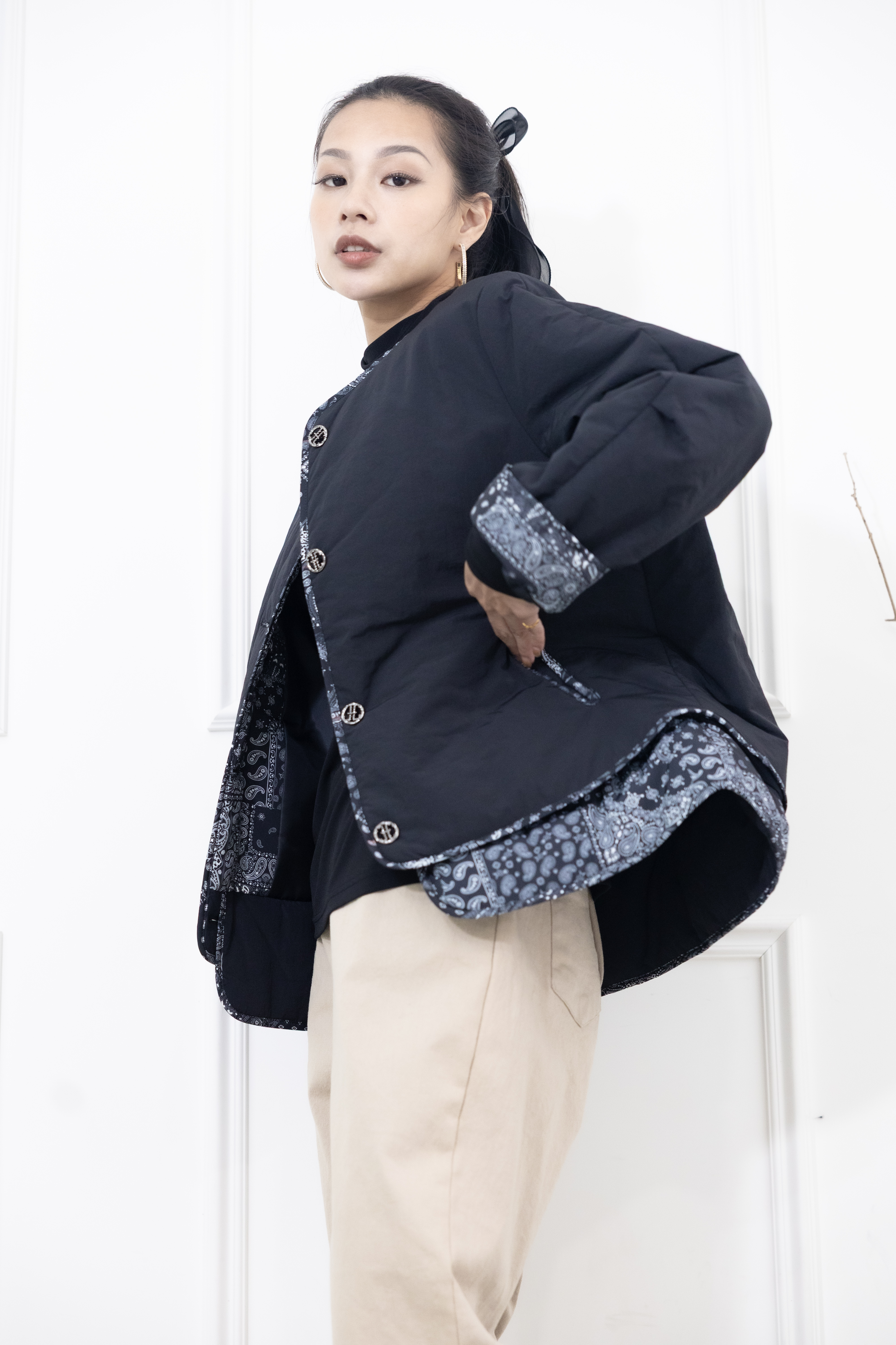 코트 下擺.袖子拼接變形蟲花紋防風鋪棉外套  / 黑色