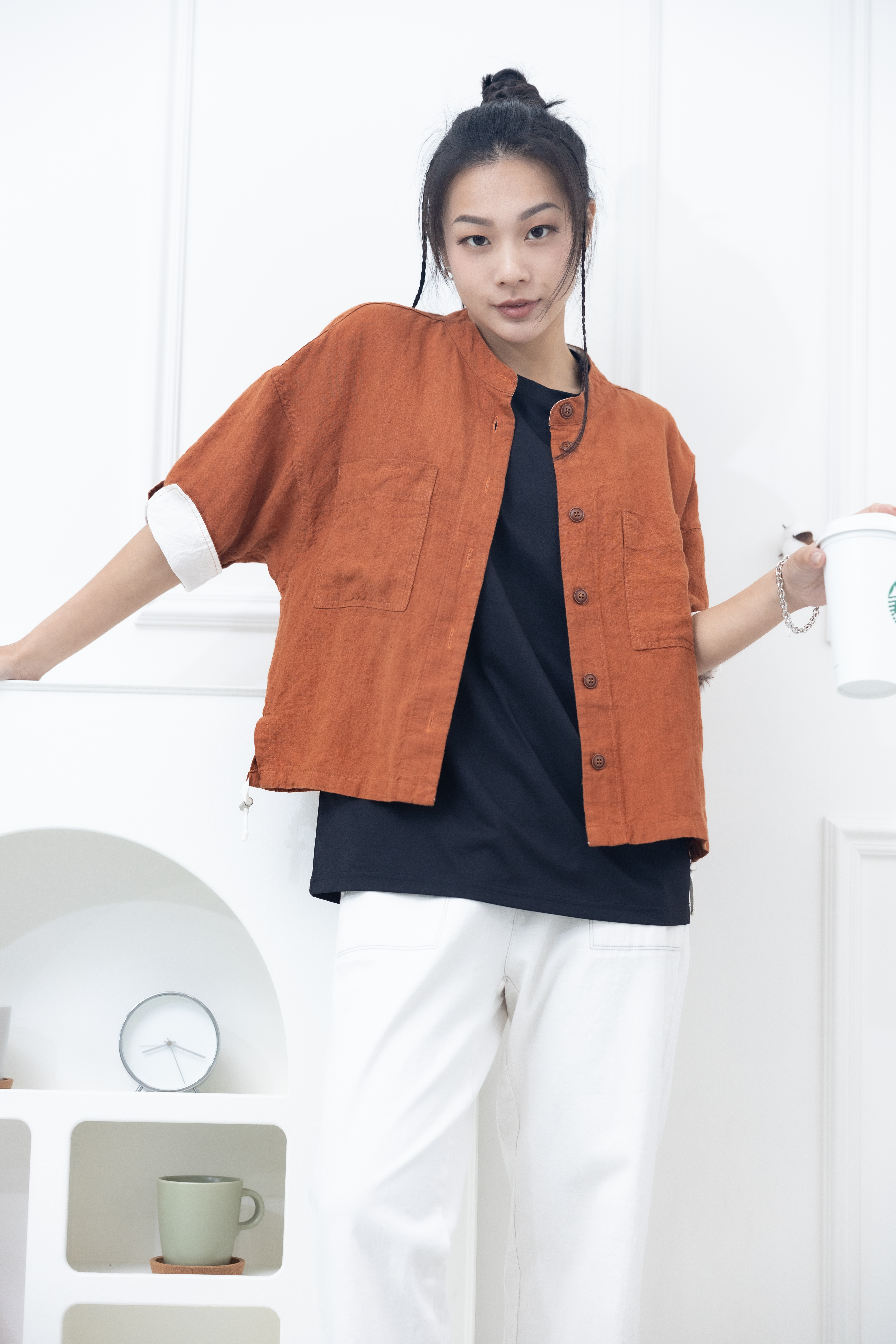 코트 圓下領大鈕扣胸前兩口袋外套 / 橘紅色