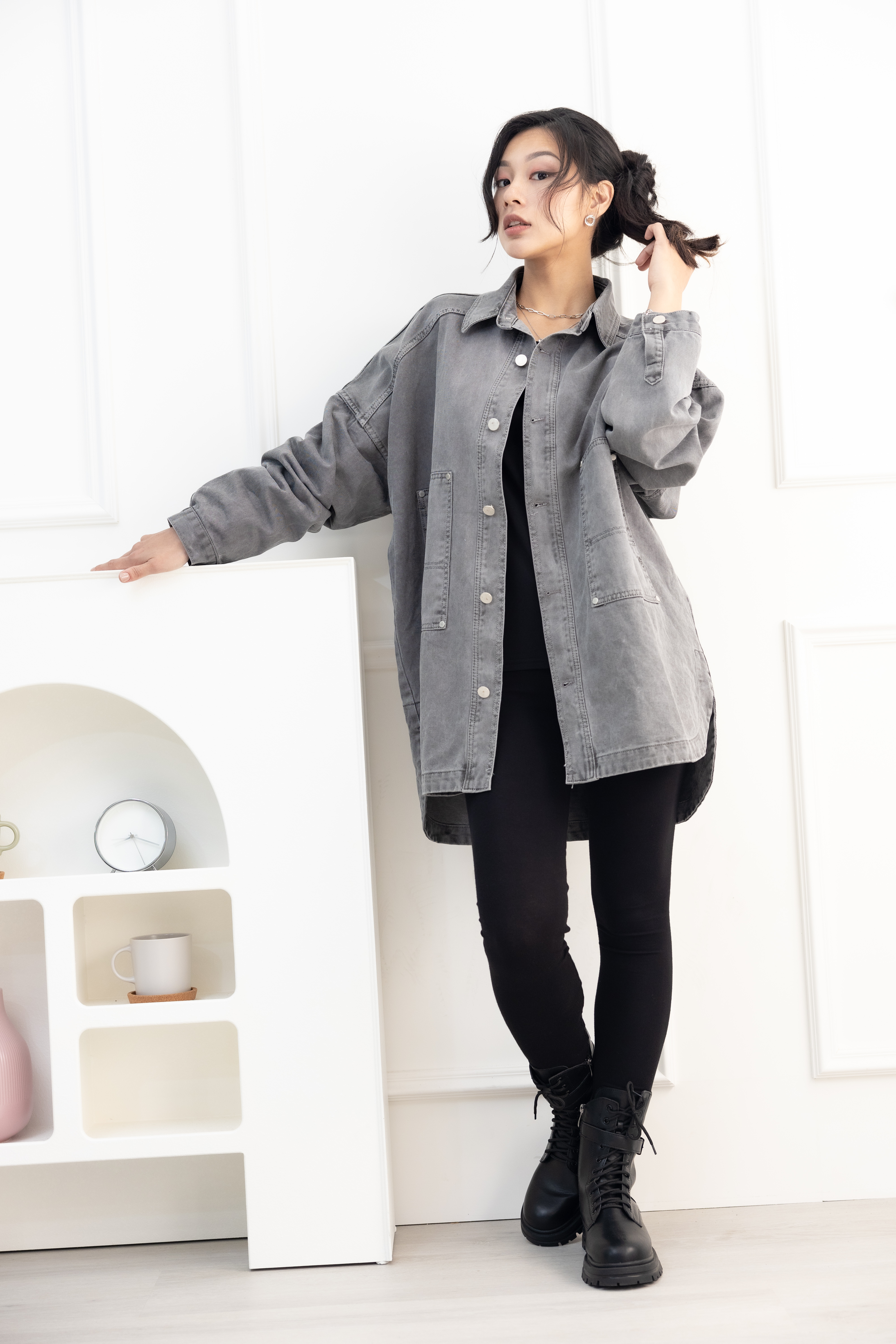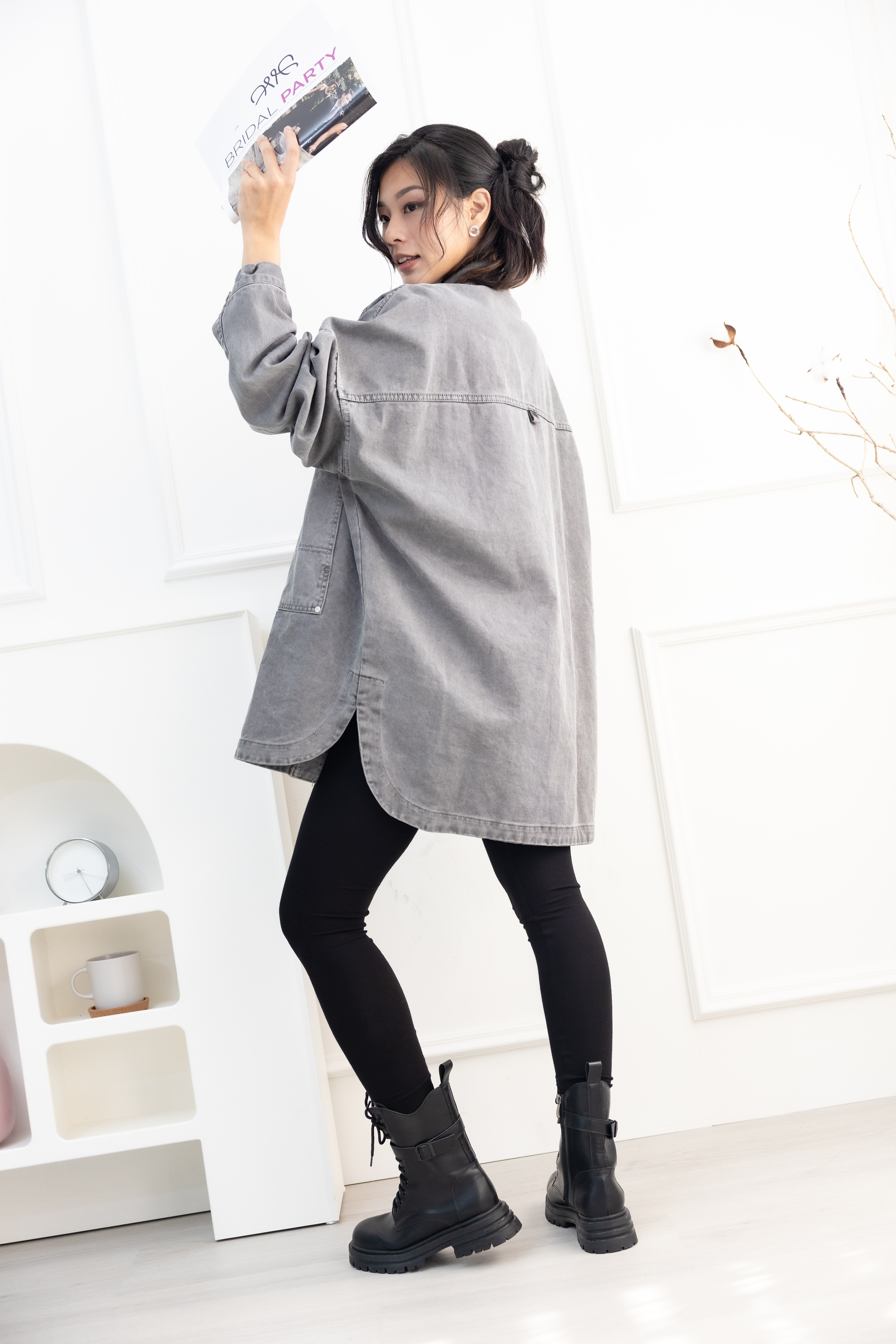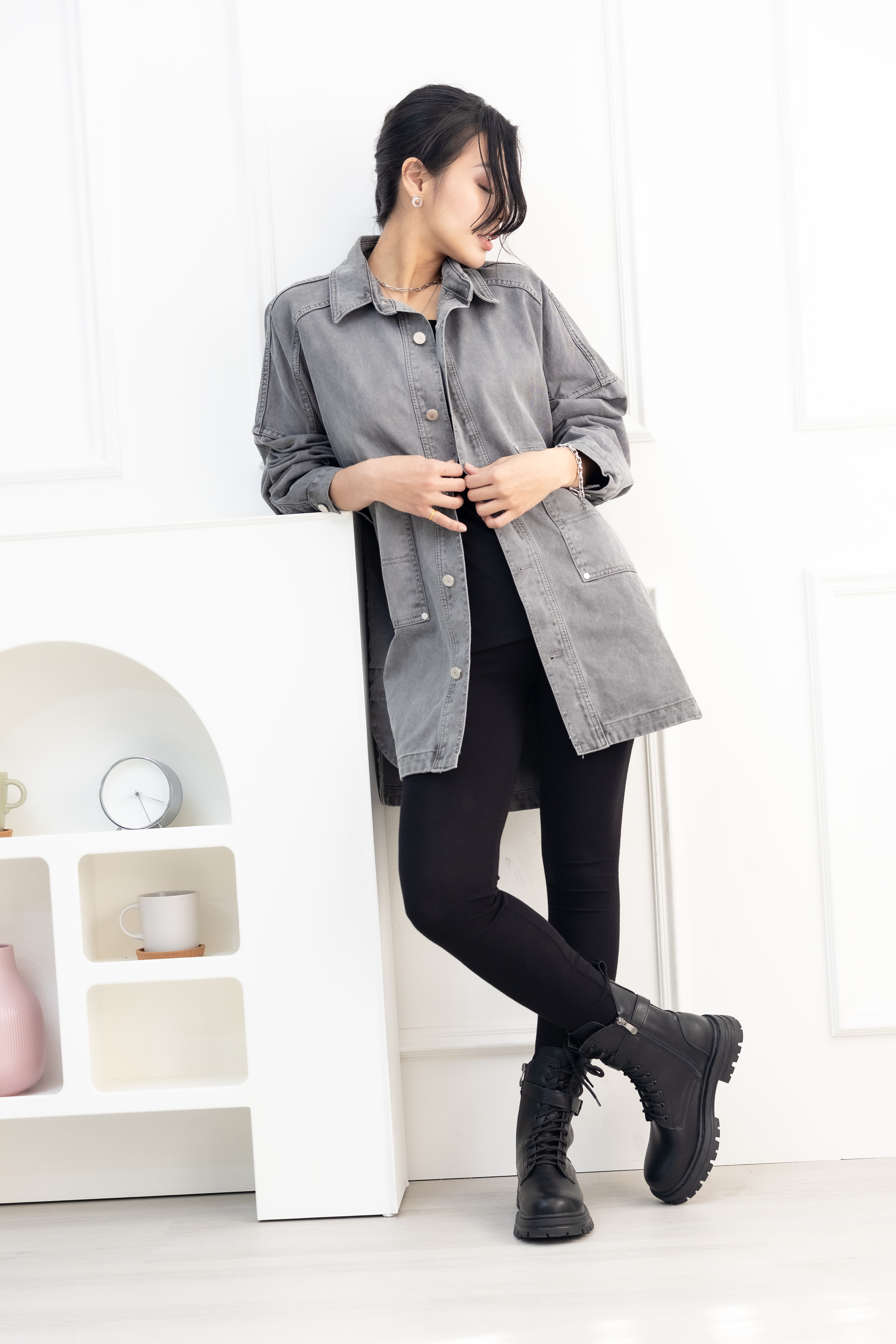 코트 圓弧下擺牛仔長袖外套/淺灰色
