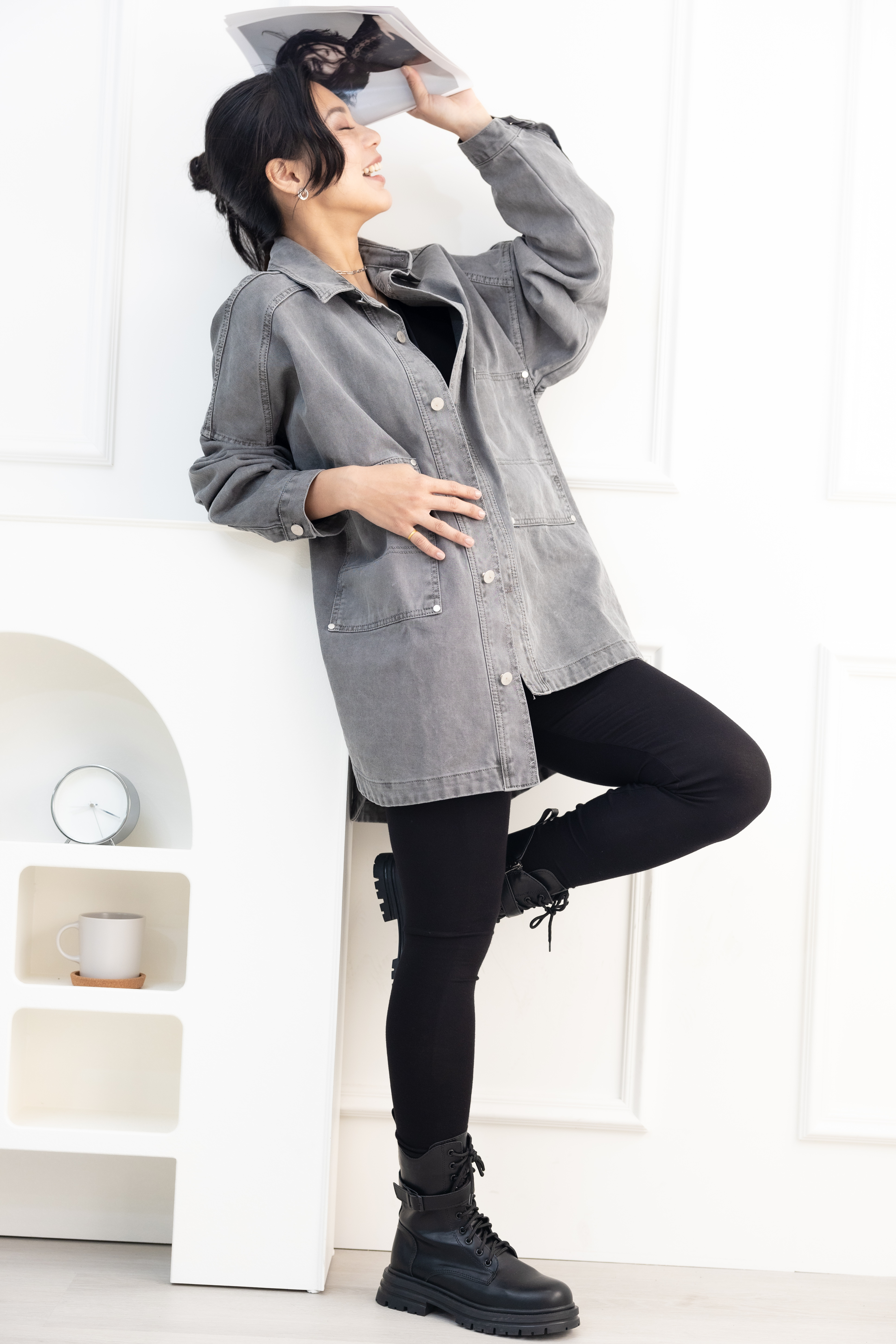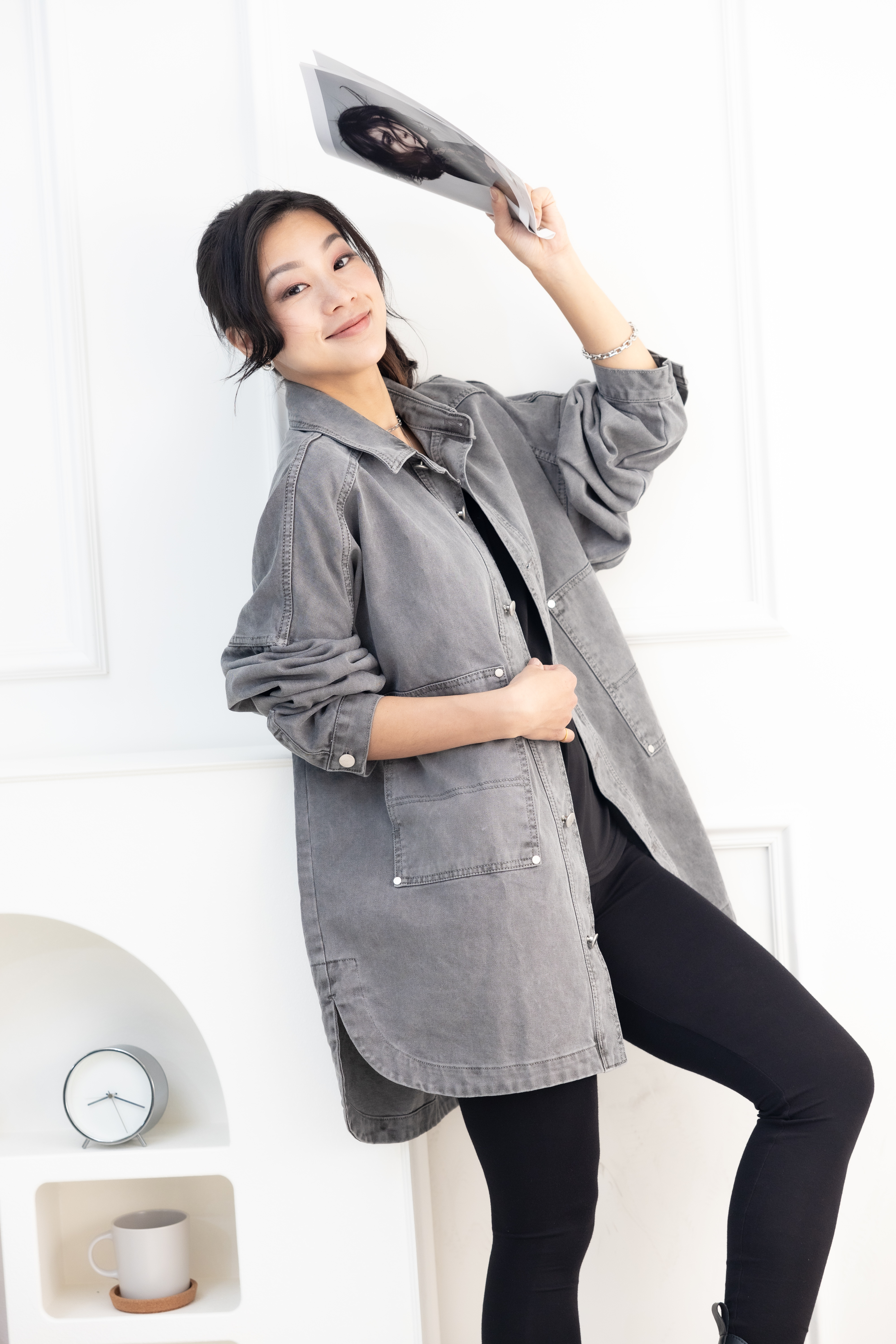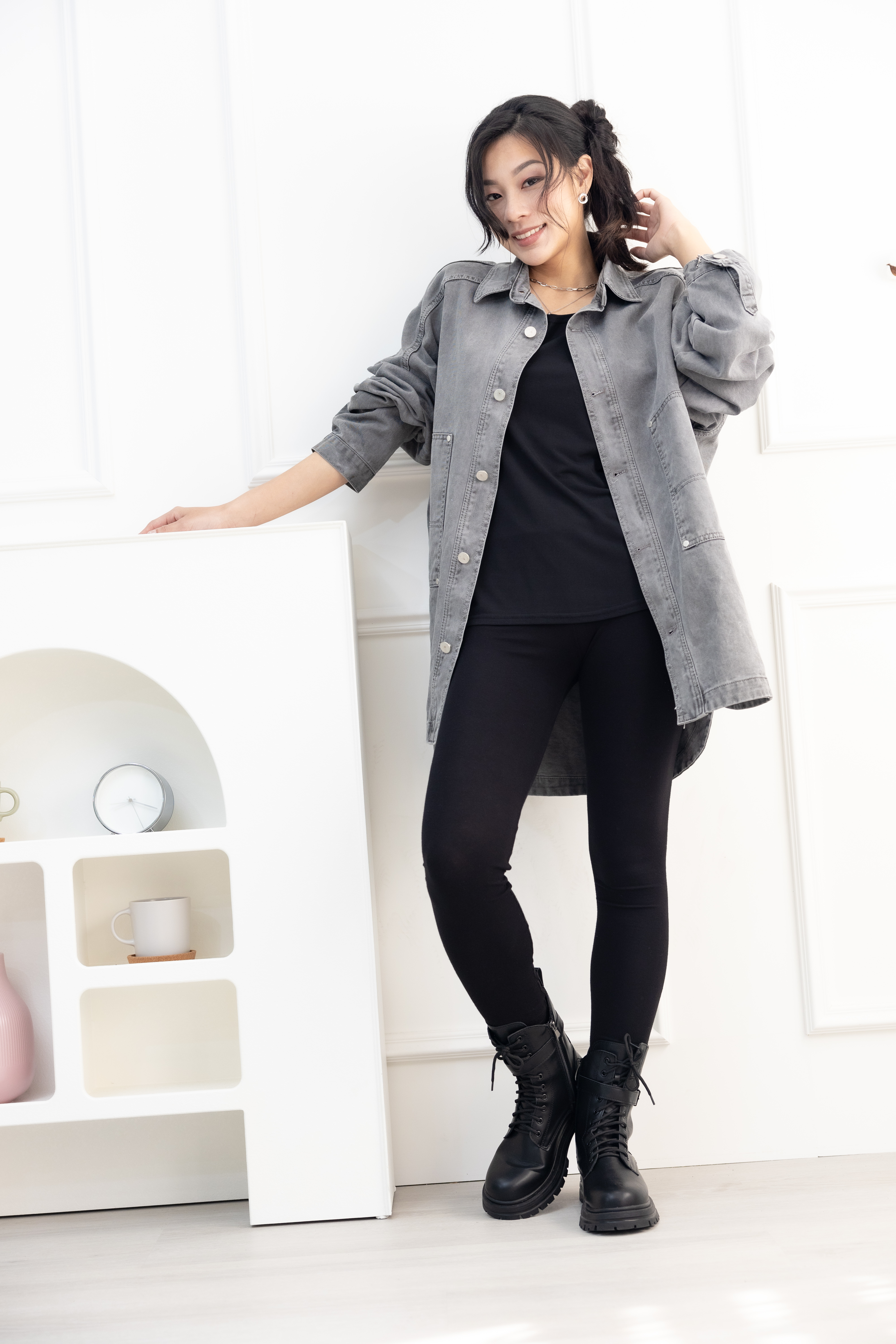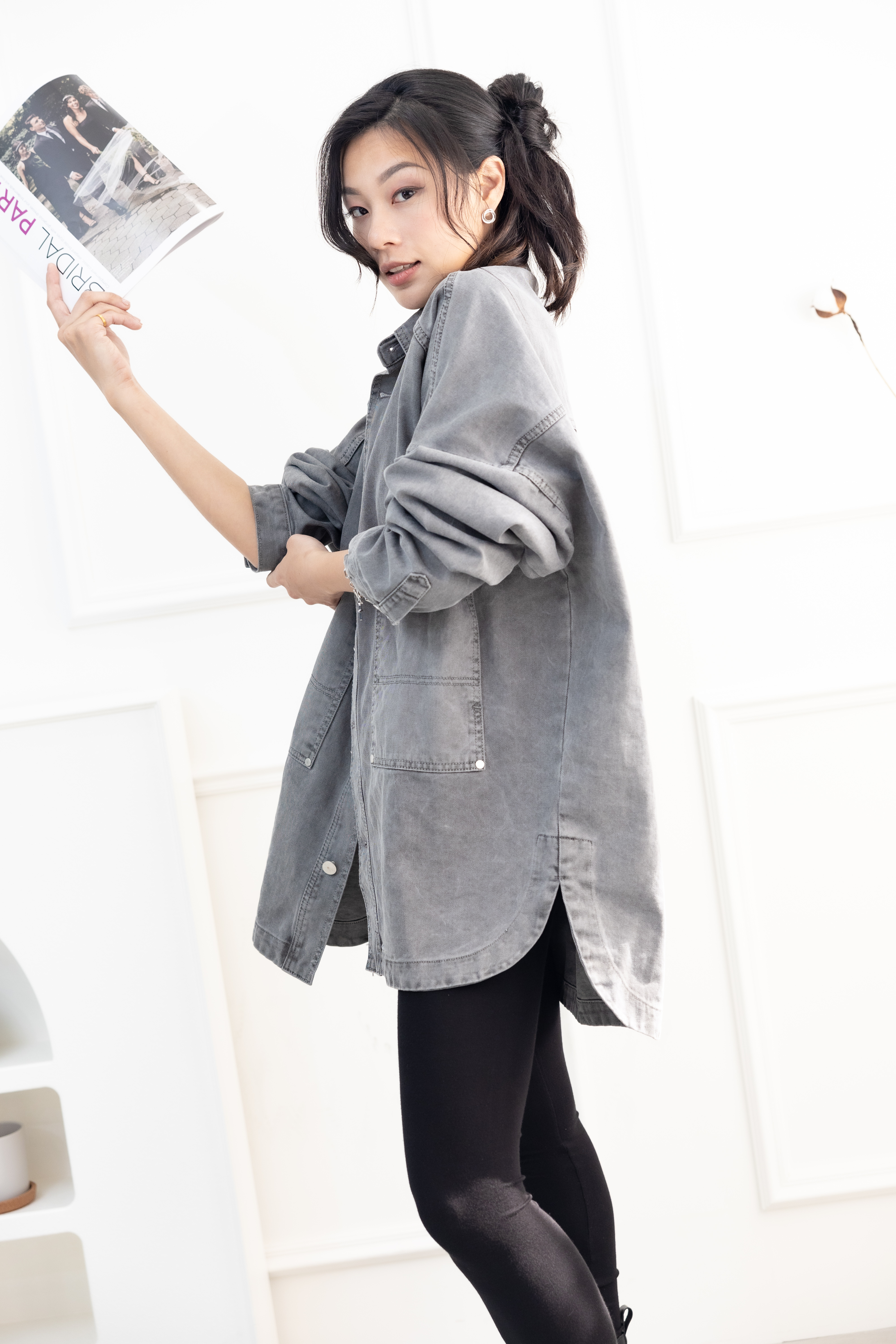 코트 圓弧下擺牛仔長袖外套/淺灰色