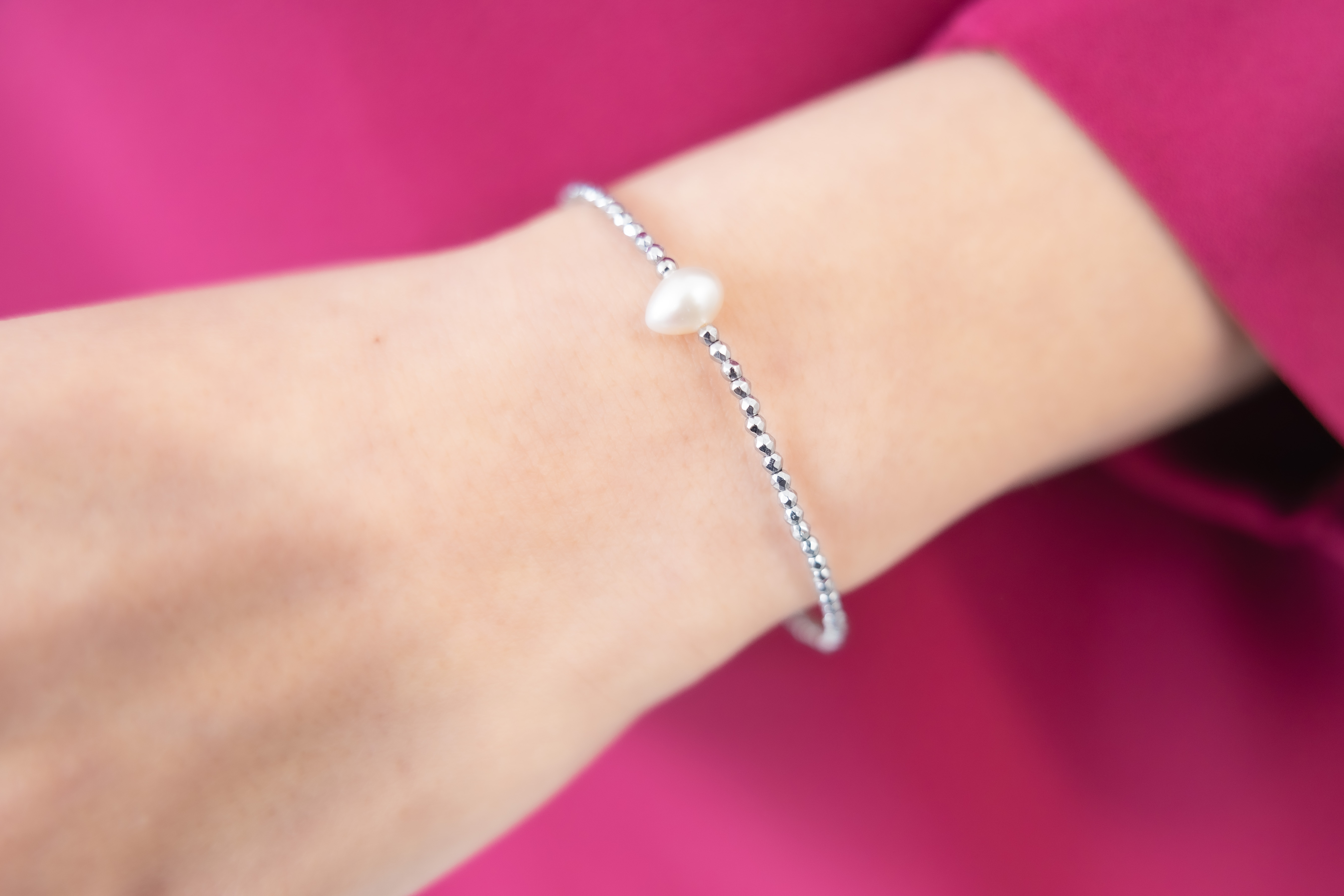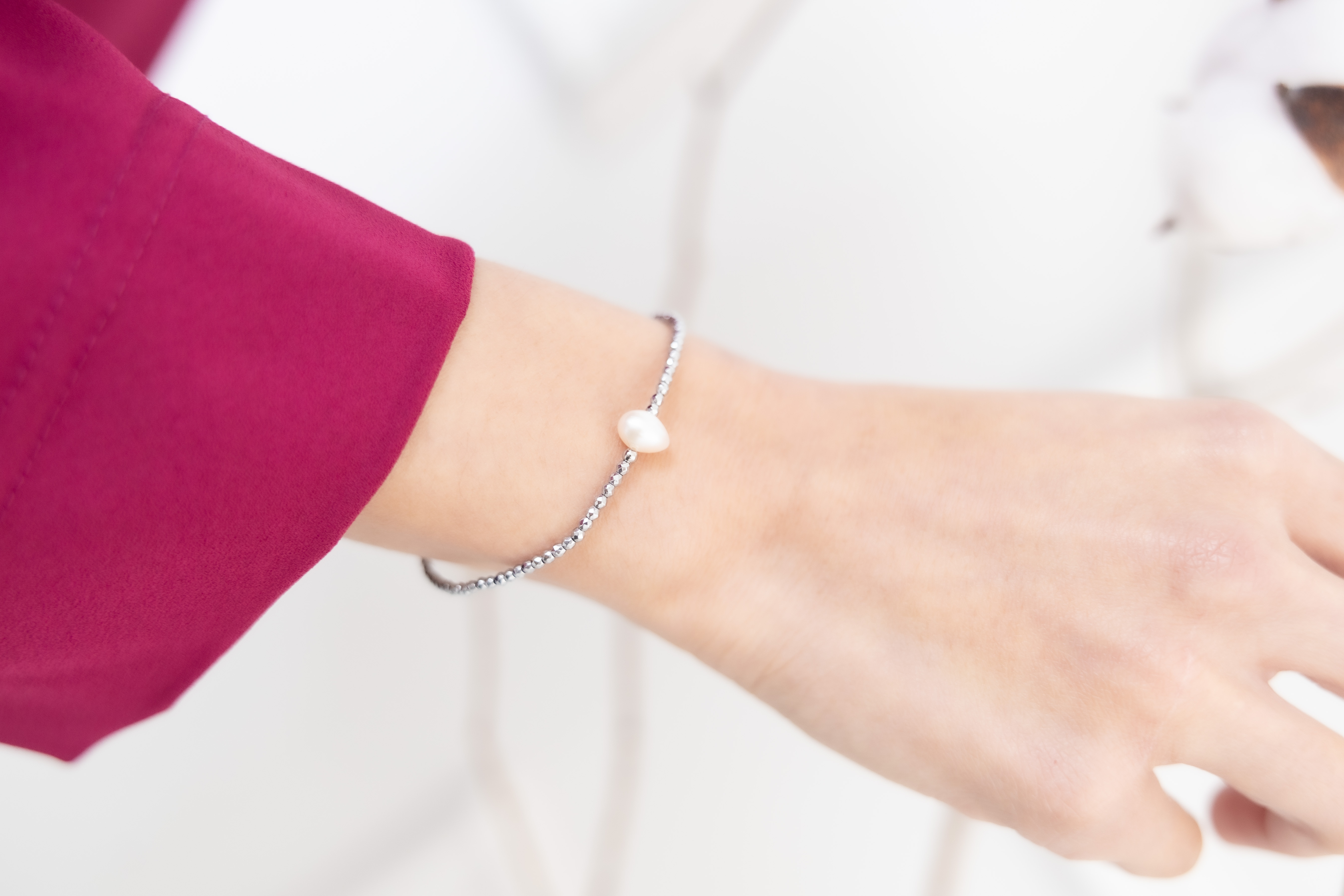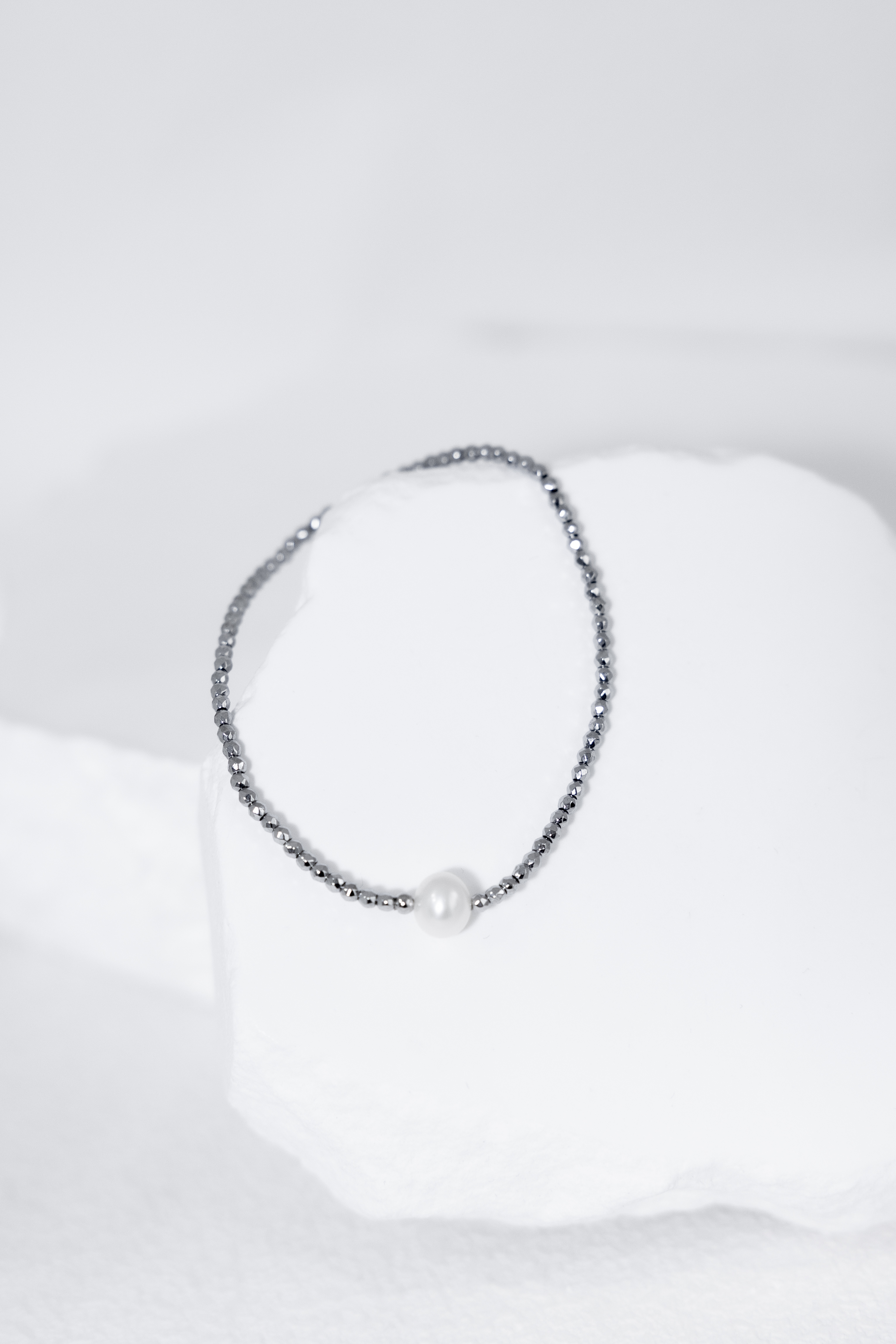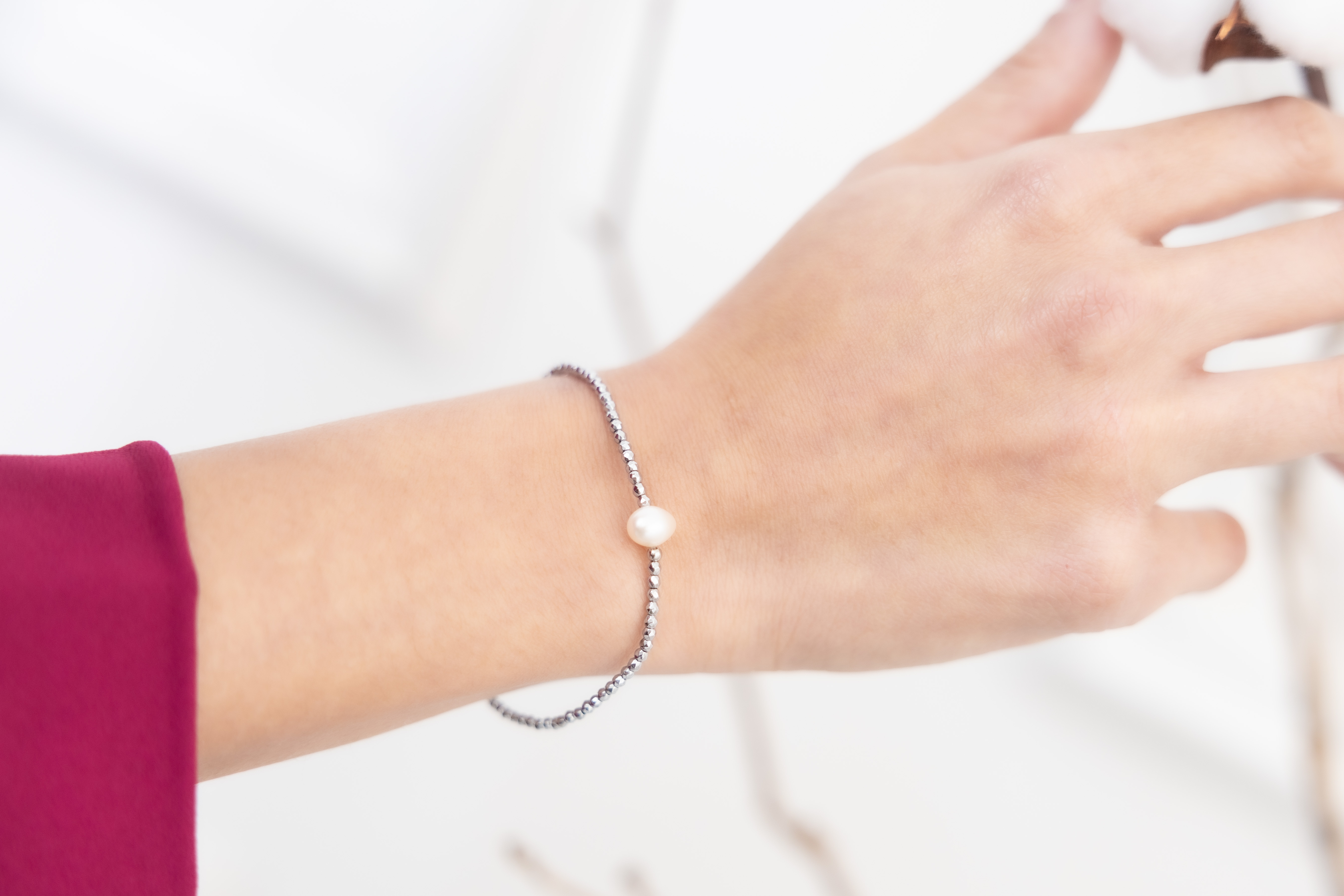 팔찌 不規則圓珠單顆珍珠彈性繩手鍊 / 銀色