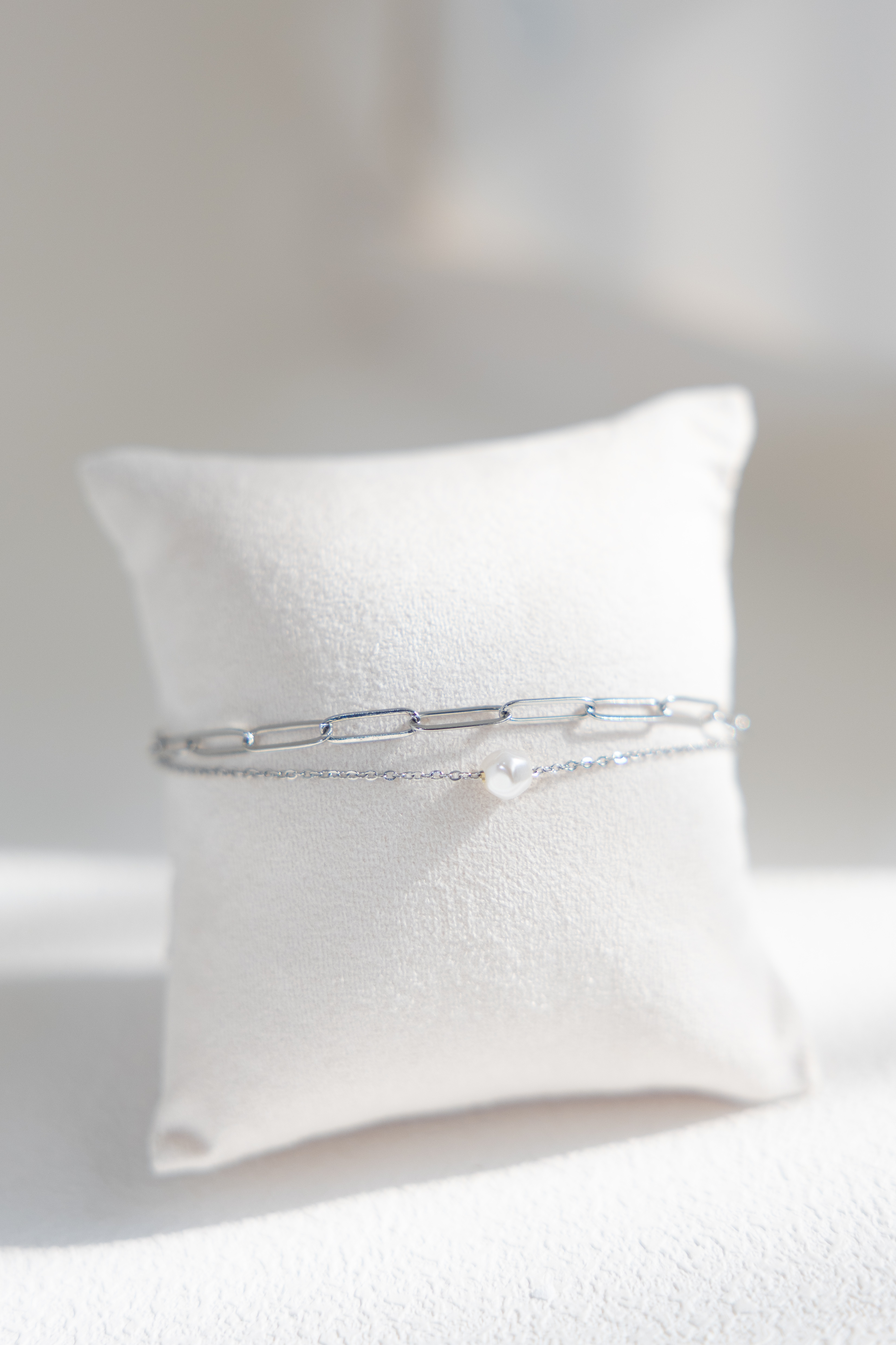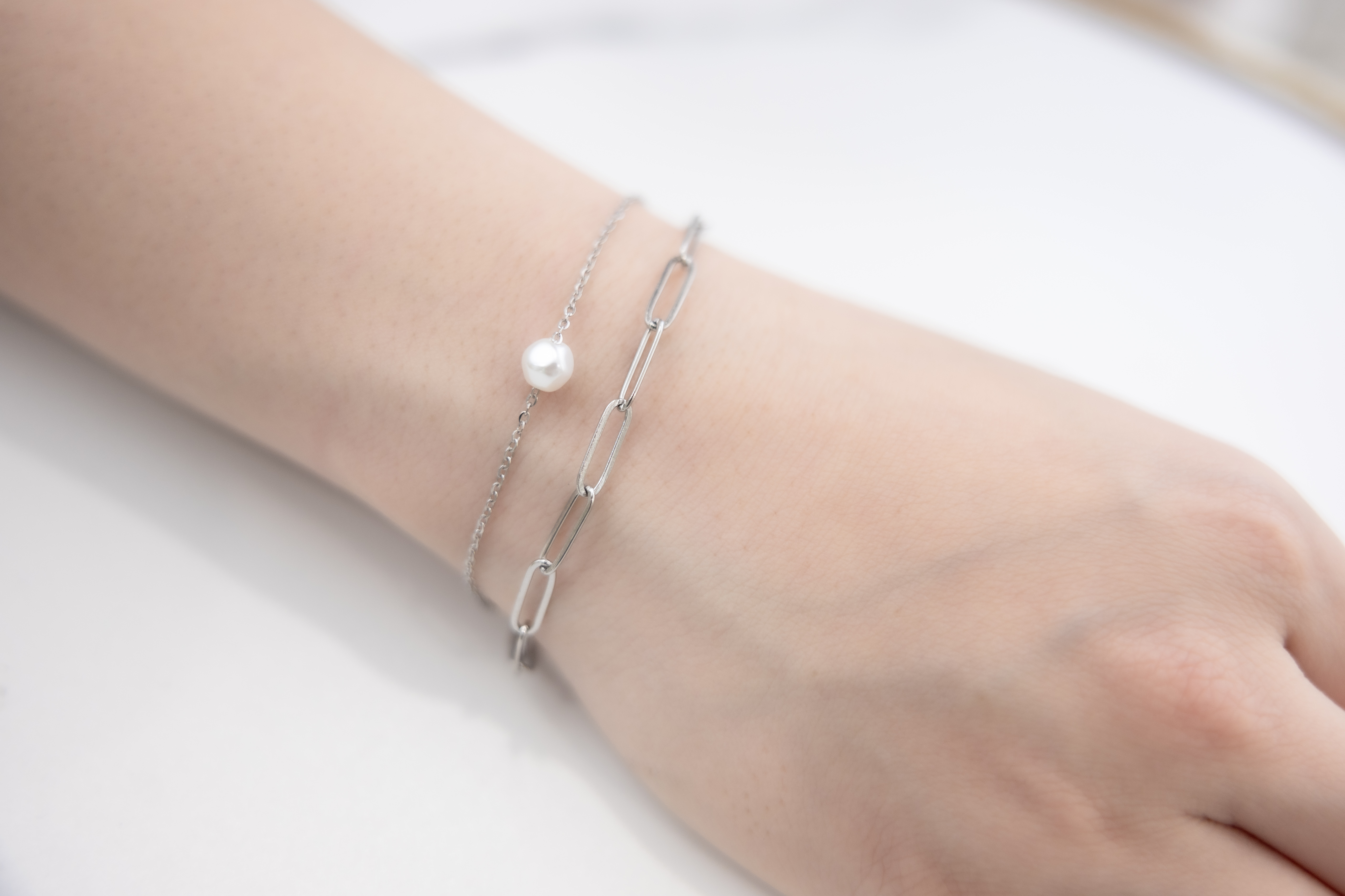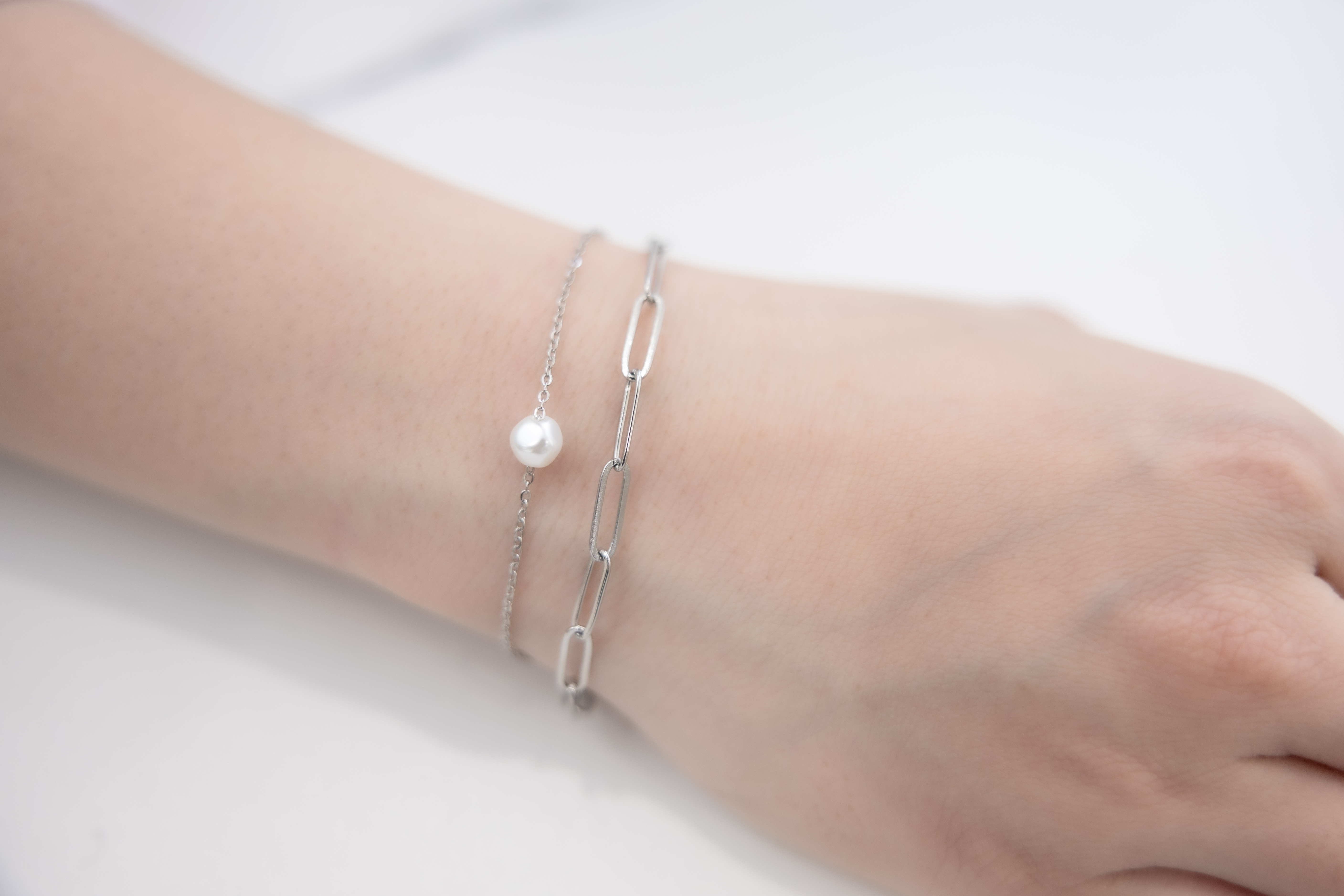 팔찌 單顆珍珠橢圓鍊雙層鍊 / 銀色