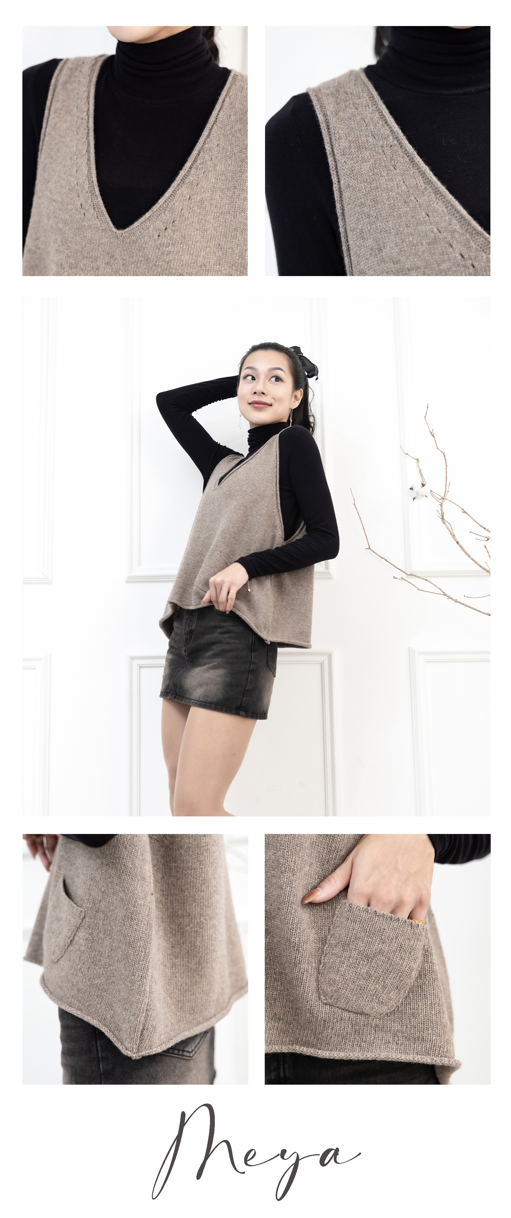 반팔 v領背心 領口下擺捲邊設計 / 卡其棕色