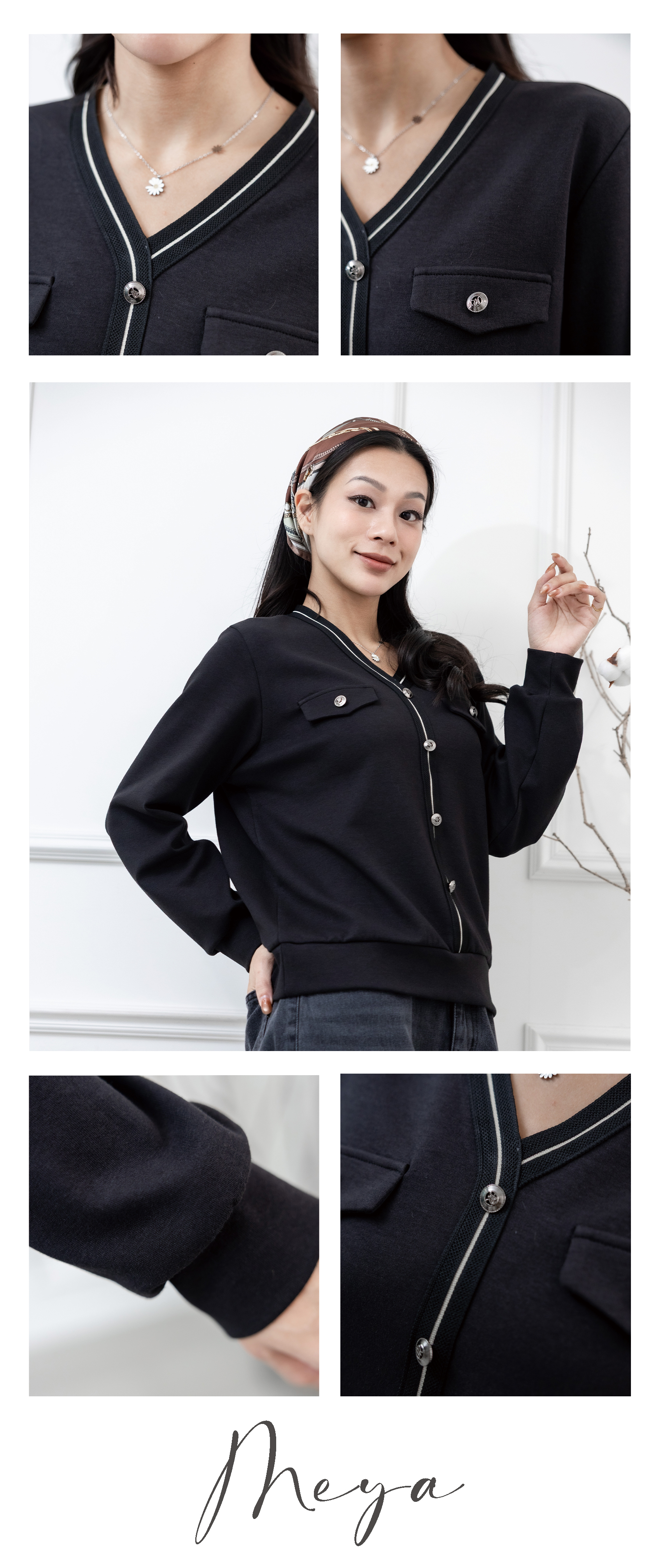 假排釦裝飾長袖上衣 / 黑色